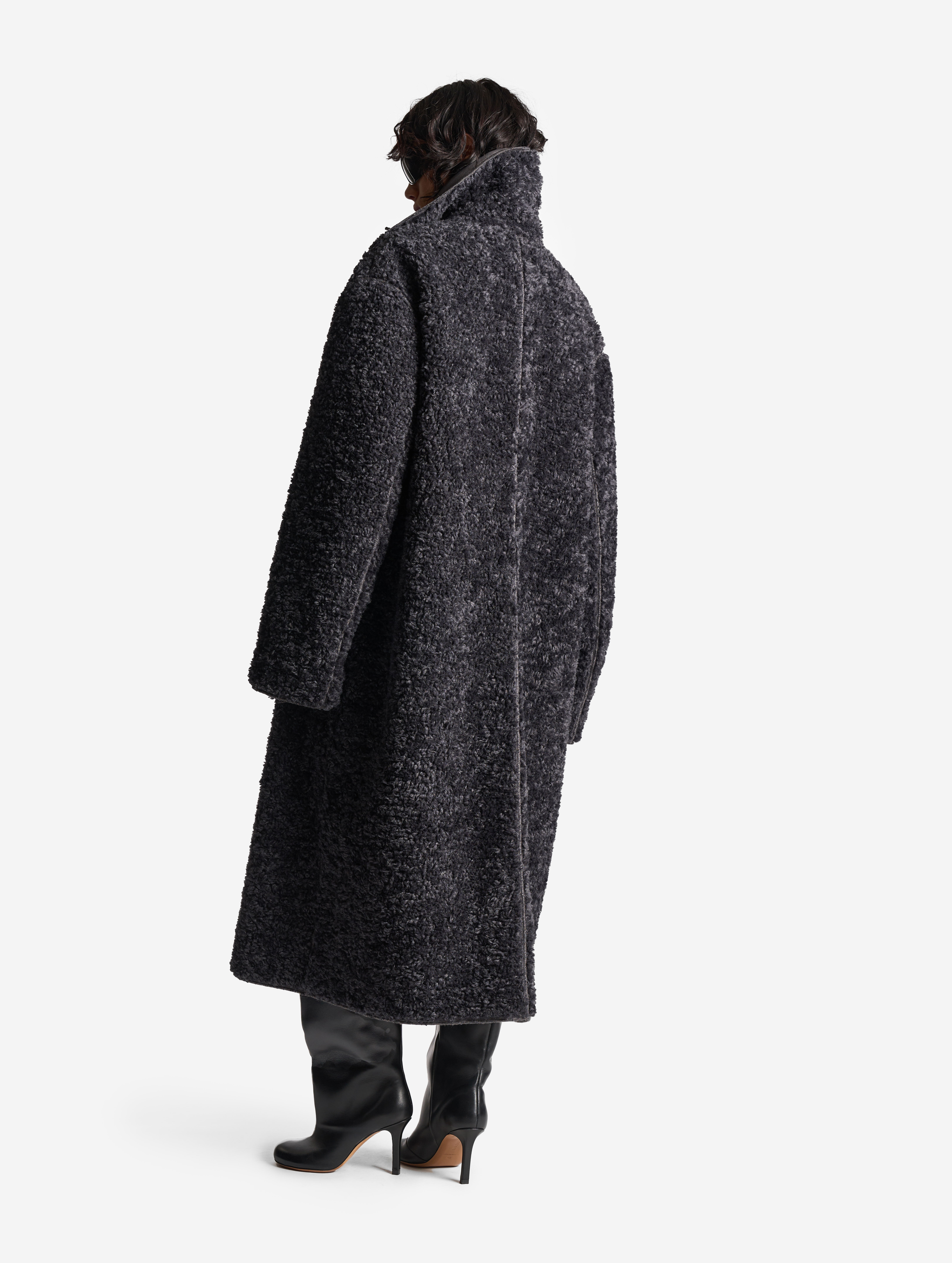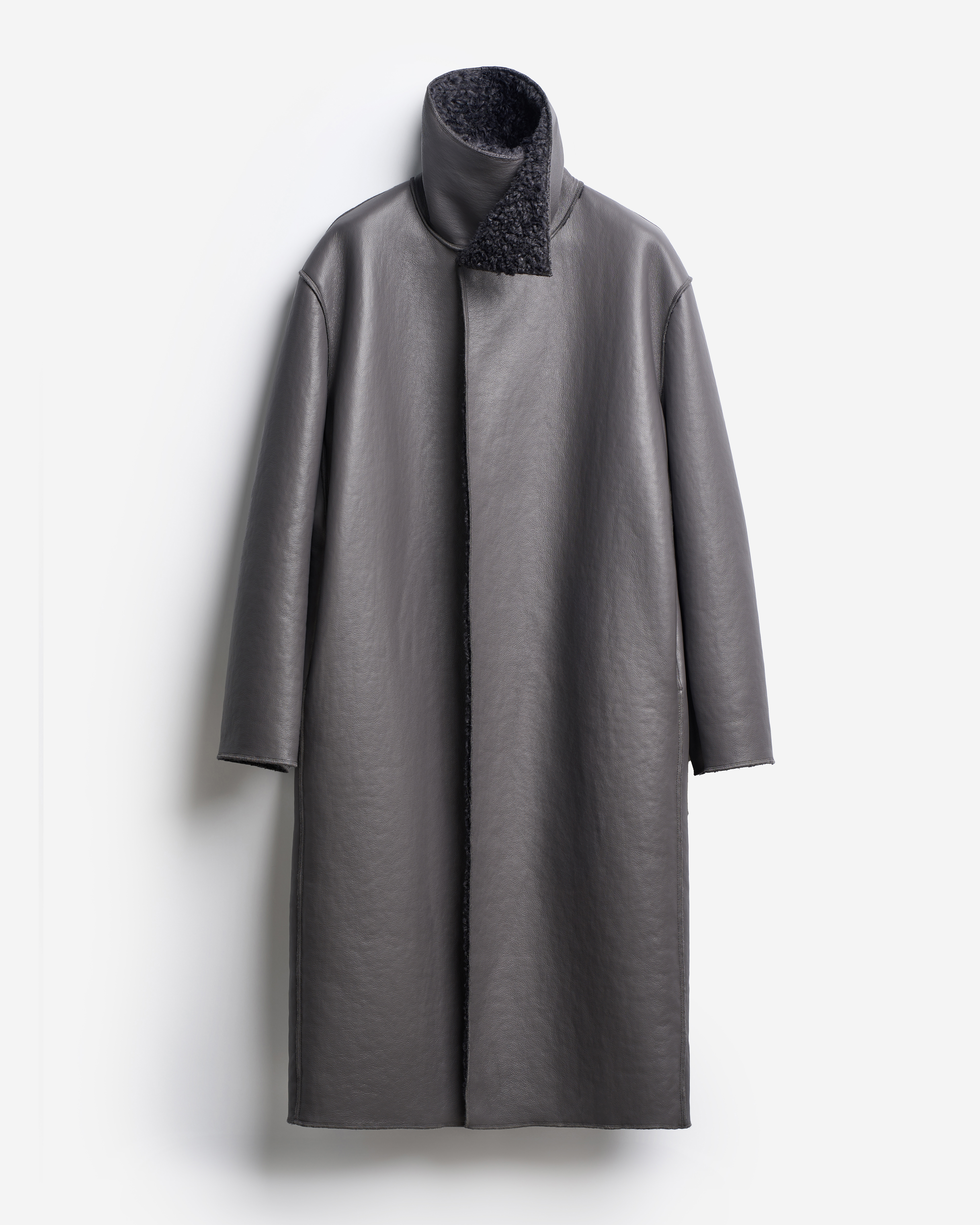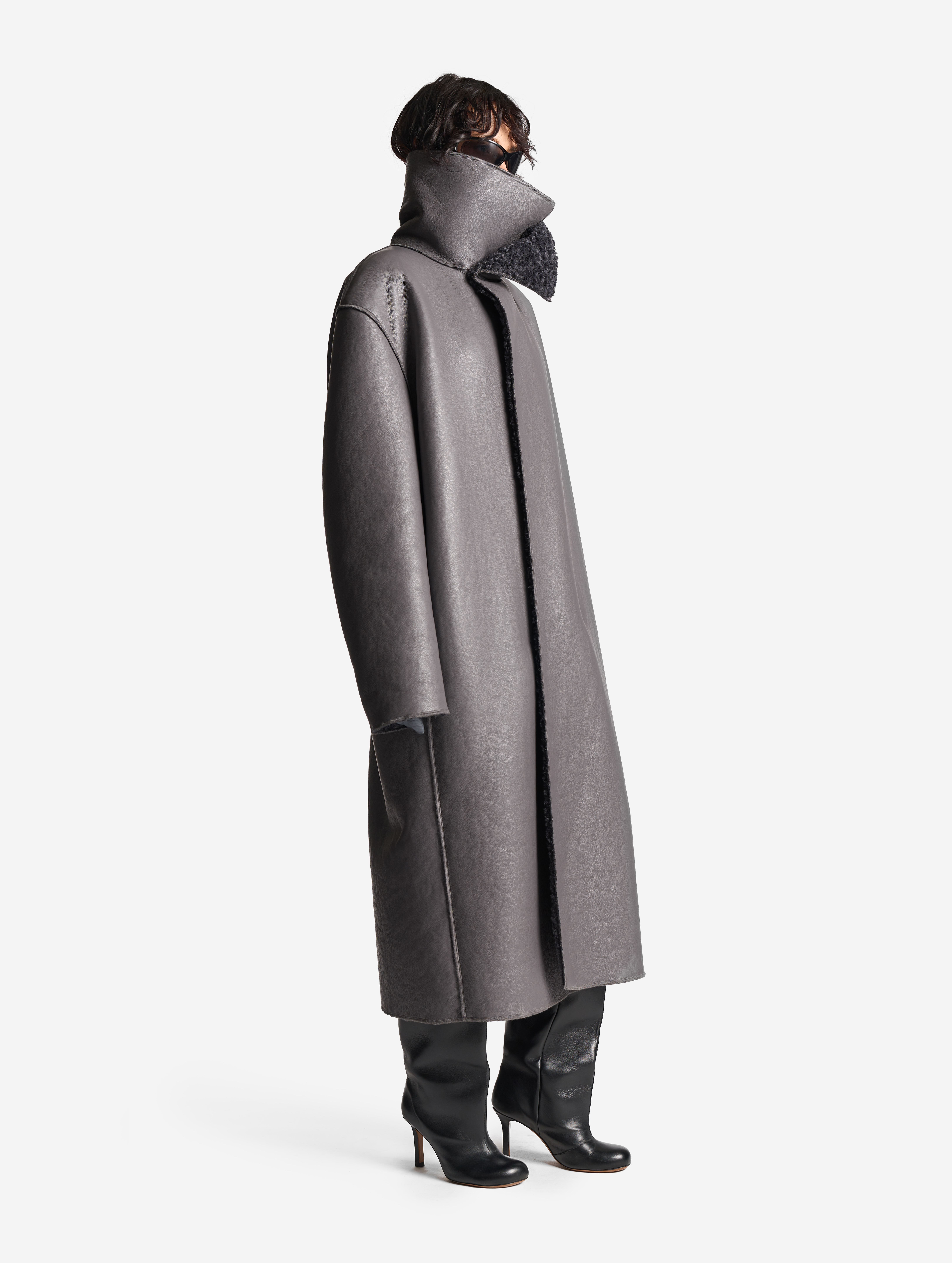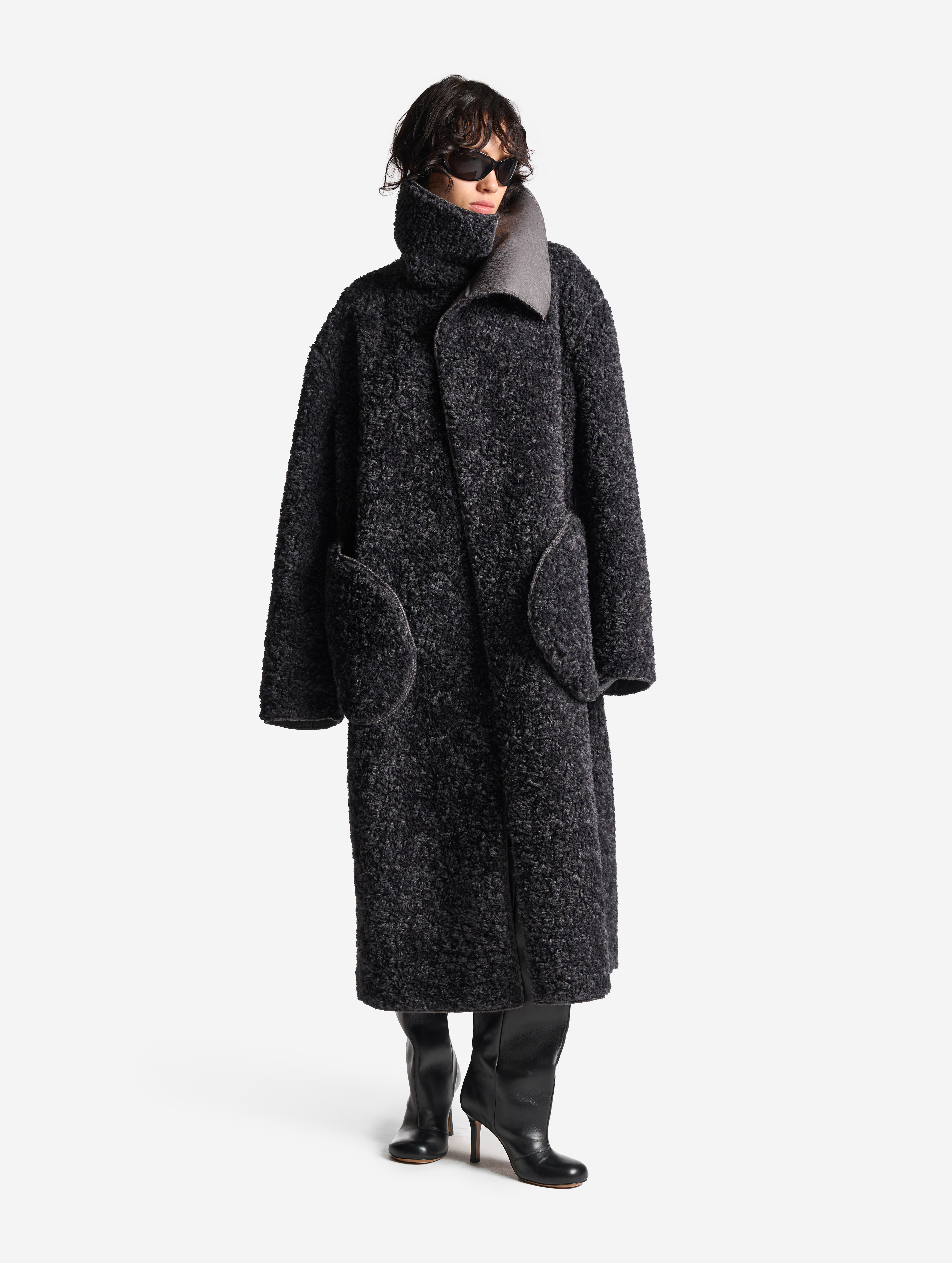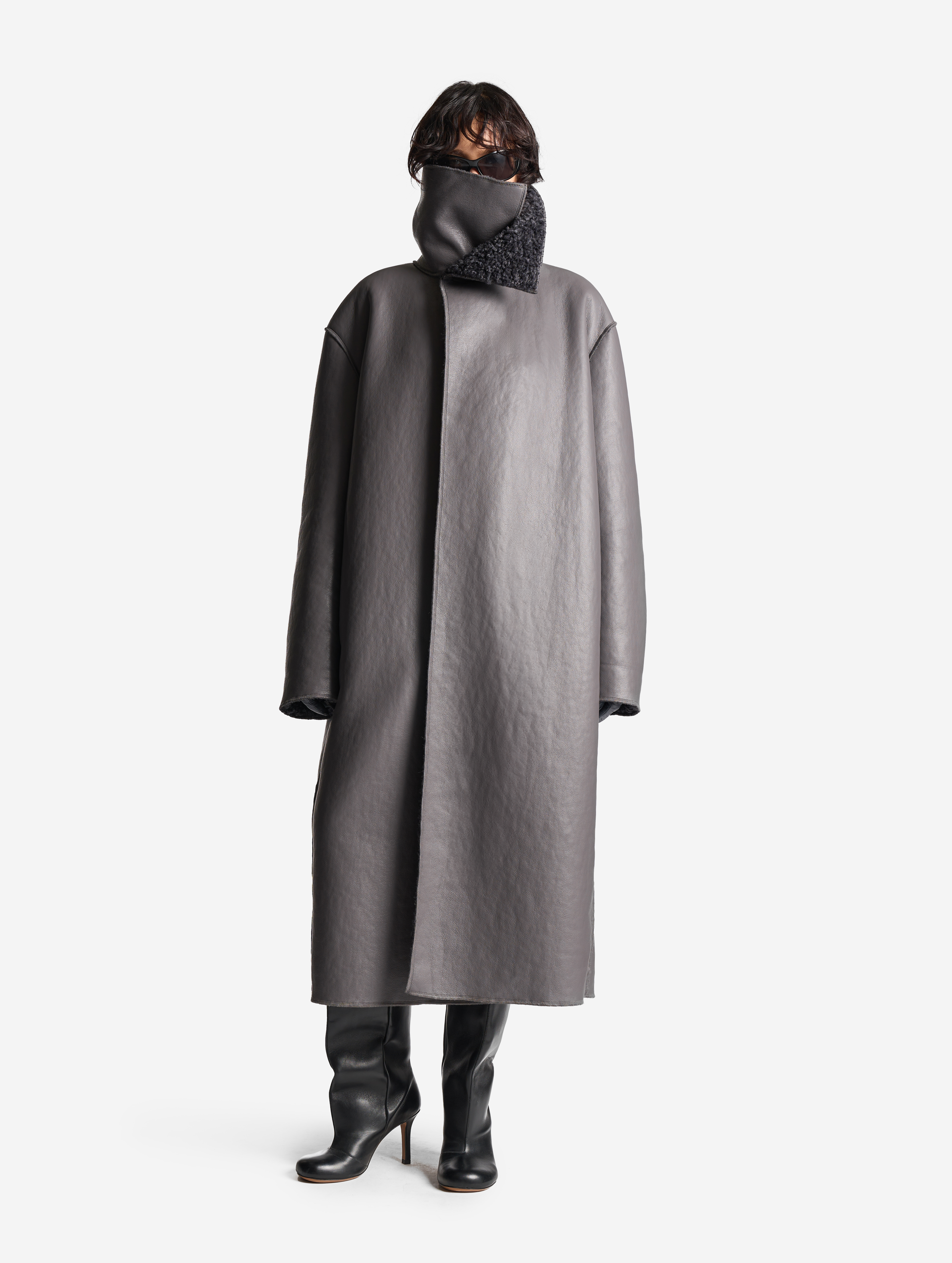 У дубленки расслабленная посадка и умеренный оверсайз-силуэт. Одна из ключевых особенностей этого изделия — мягкое, скатное плечо. В терминологии Ushatava оно называется humble shoulder, что в переводе с английского означает «скромный, смиренный, спокойный». Воротник апаш в поднятом виде надежно закрывает горло и шею, исключая необходимость в шарфе. Для сохранения минималистичного облика изделия мы использовали одну застежку на пуговицу, обтянутую экокожей. Есть два боковых кармана, которые сохраняют свою функциональность независимо от того, какой стороной надета дубленка.