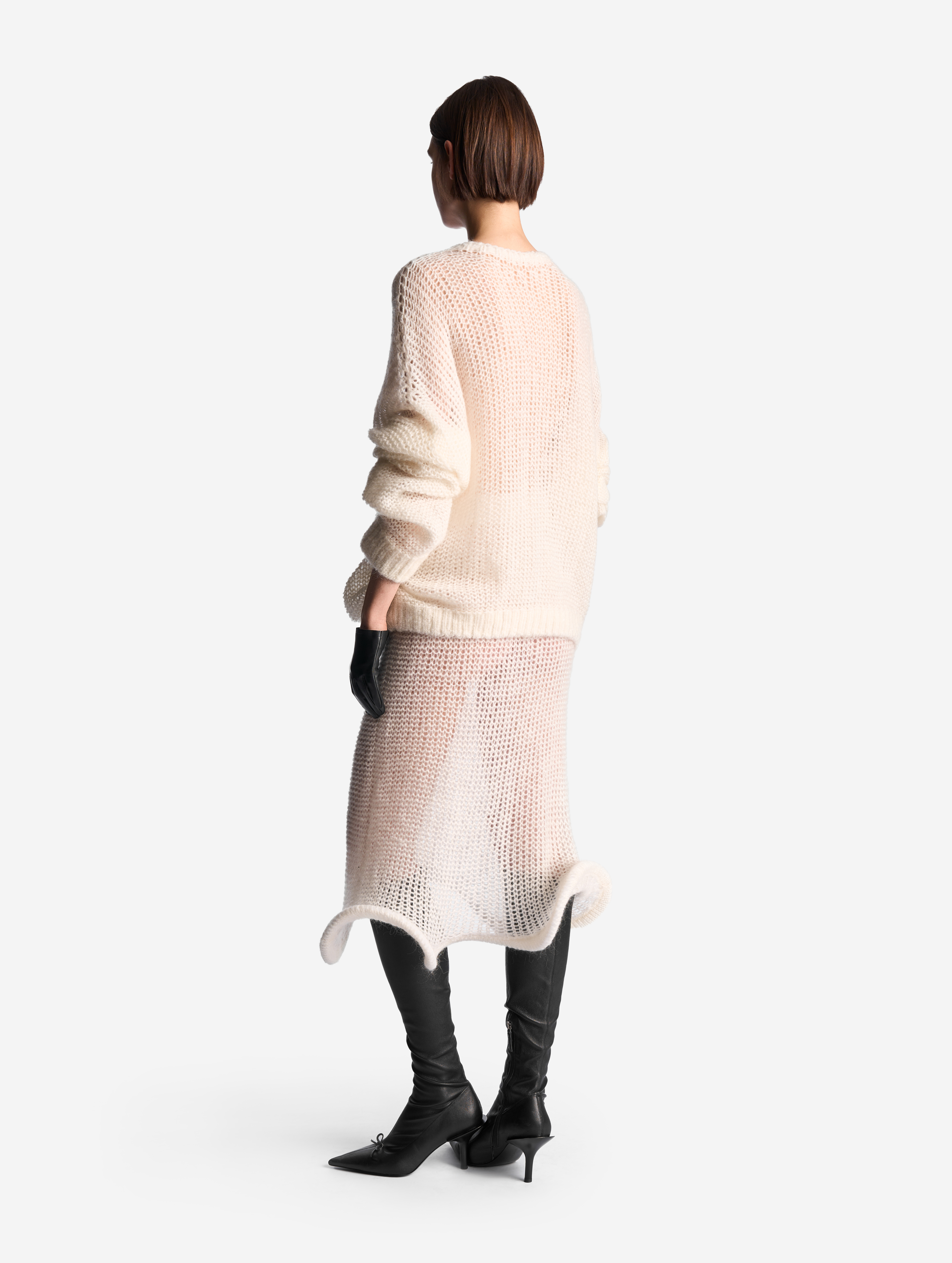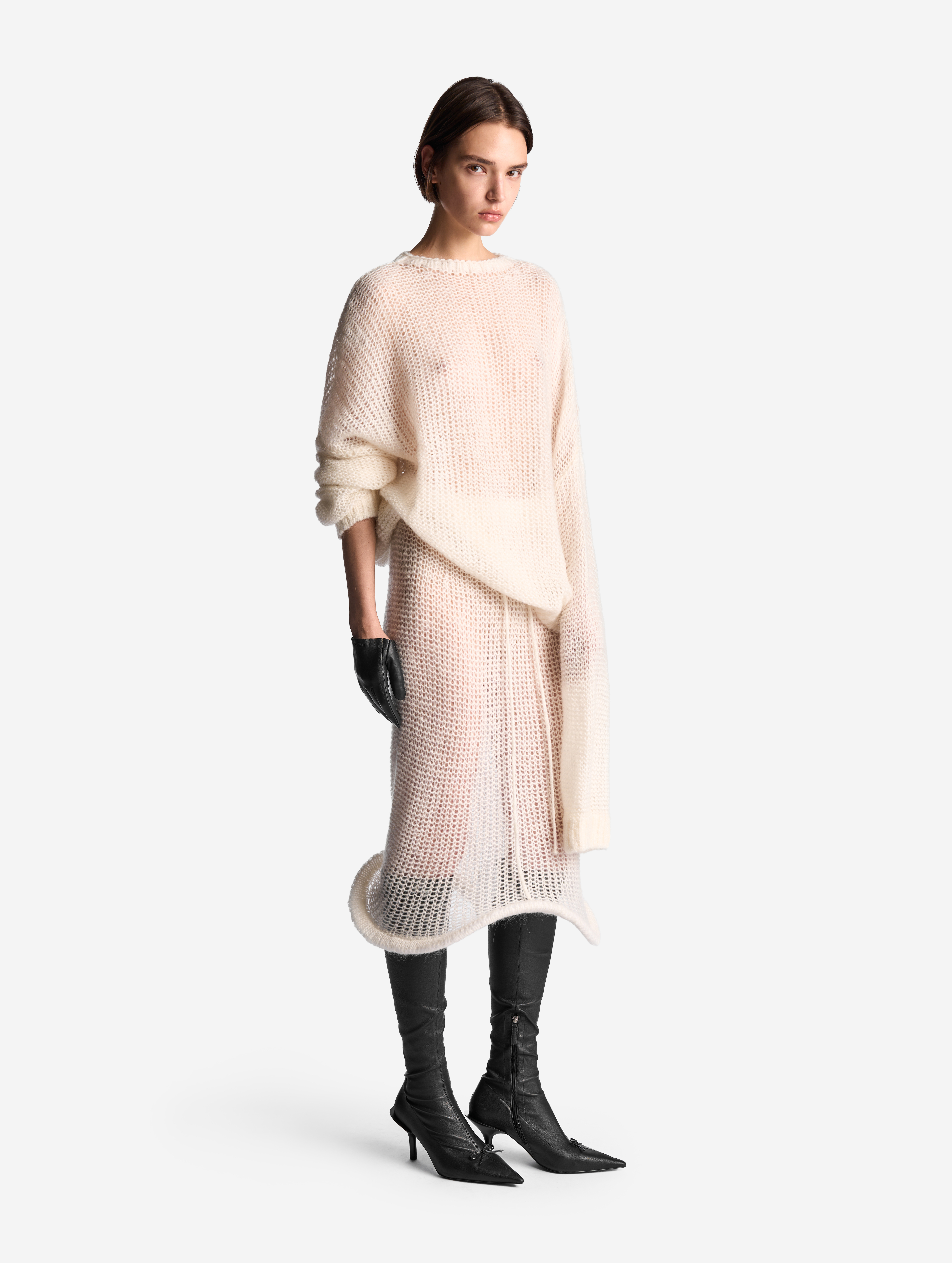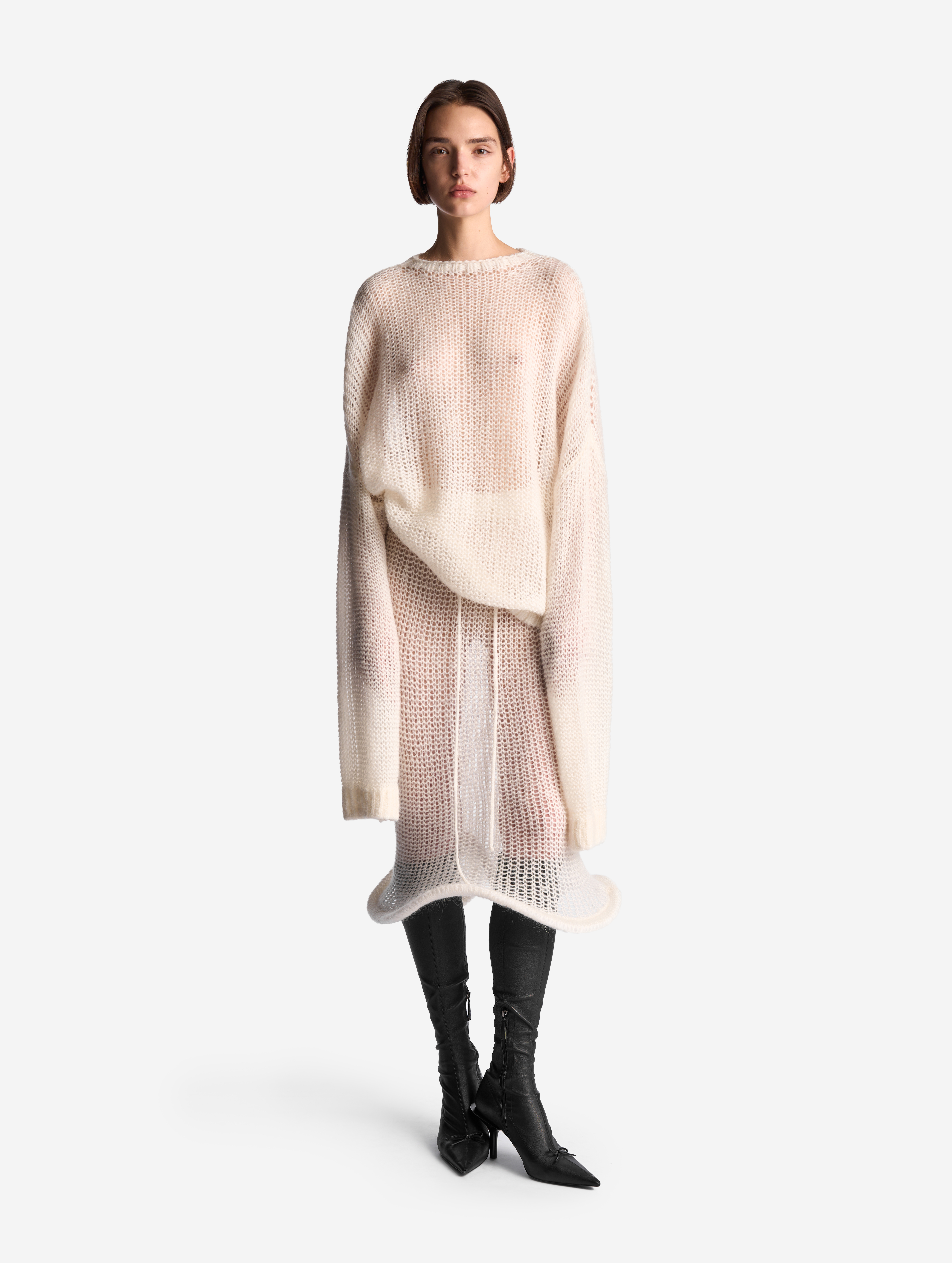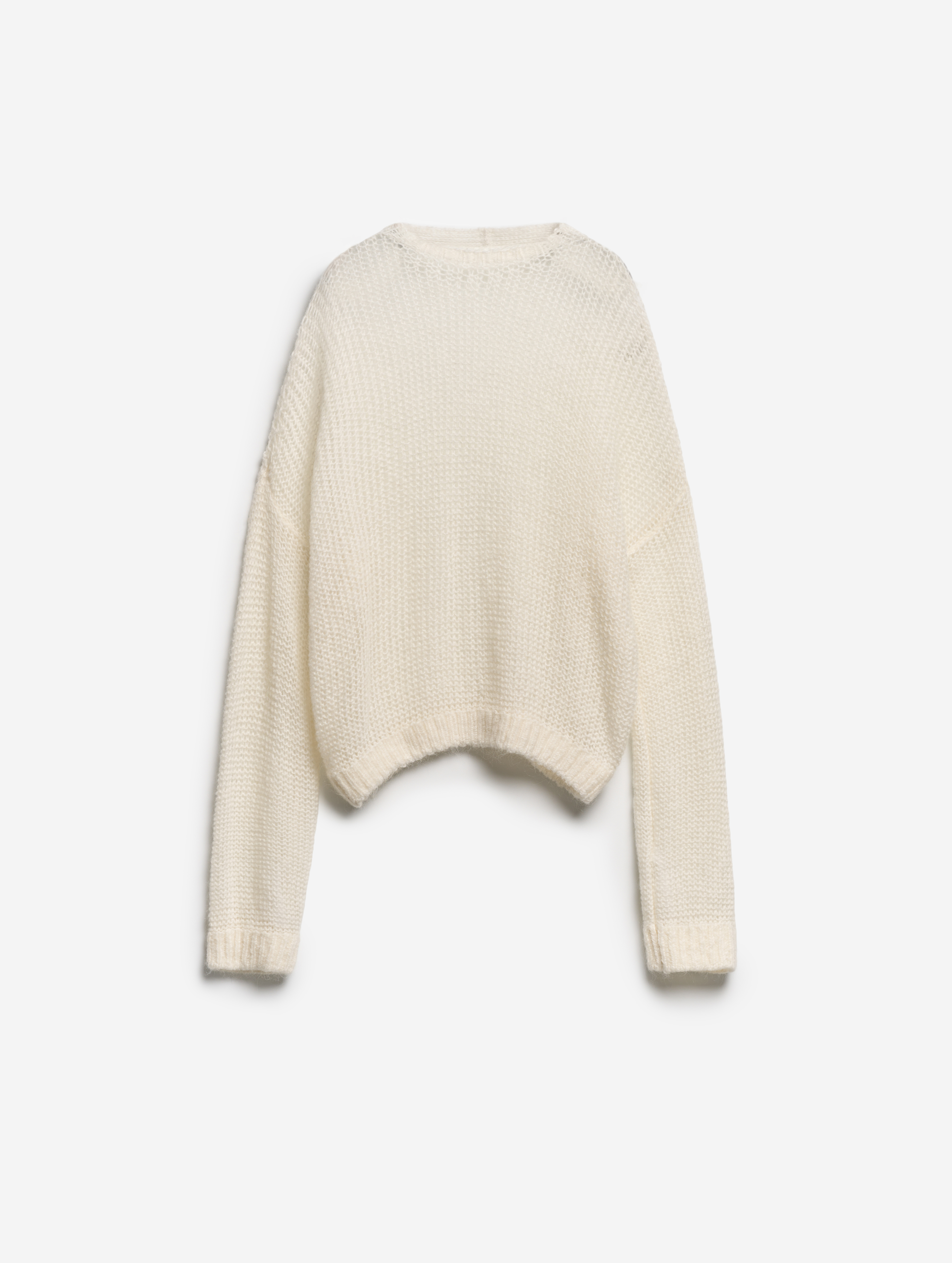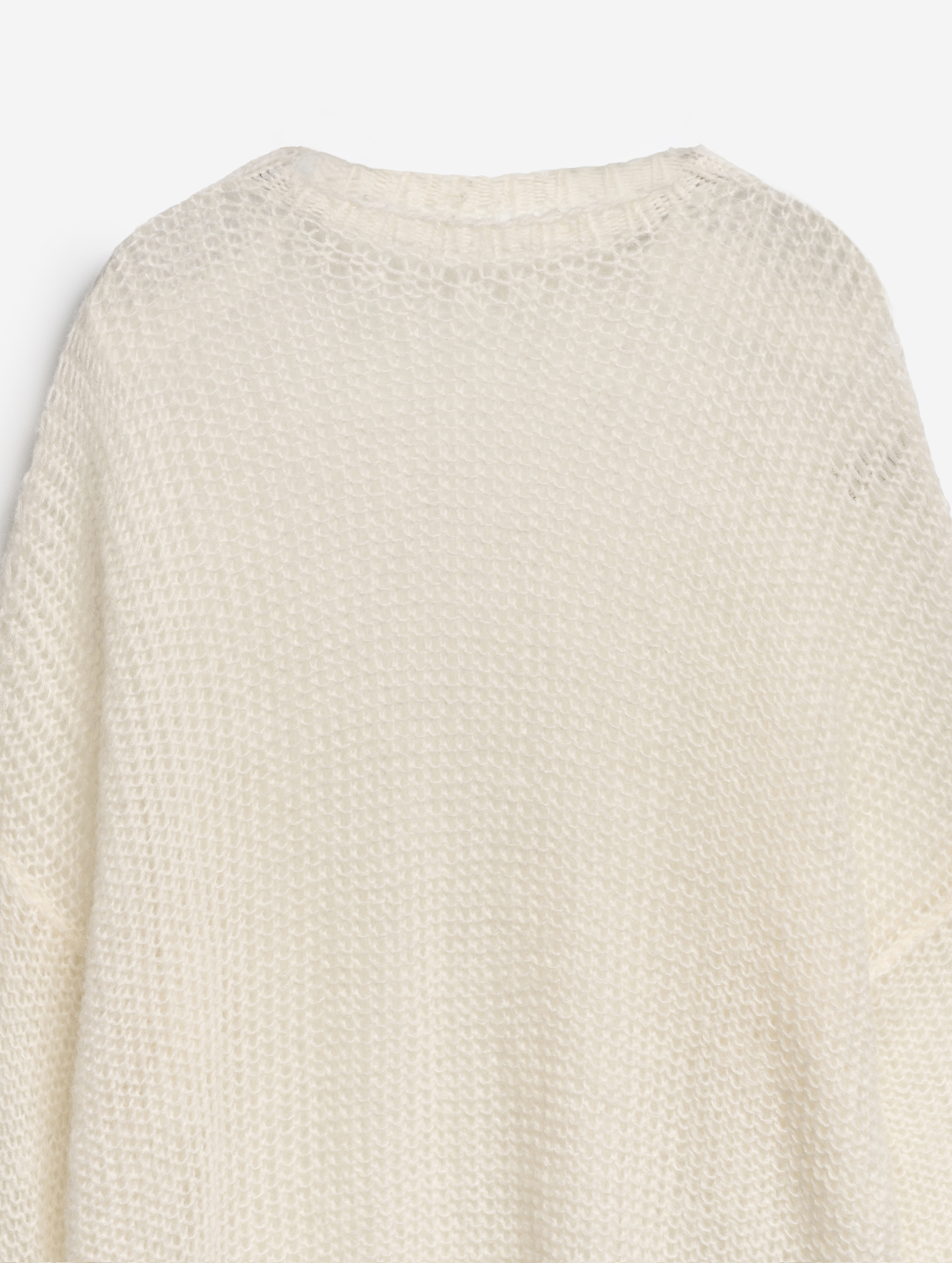 У этого джемпера свободная посадка и оверсайз-силуэт. Спущенную линию плеча продолжают экстрадлинные рукава — внутри спрятаны штрипки из резинки, они помогают зафиксировать рукав в присборенном виде, уменьшив его длину. В составе пряжи есть большой процент кид мохера, который делает нить мягкой и приятной к телу, а само изделие — практически невесомым. Благодаря крупной вязке джемпер получился воздушным, с полупрозрачной фактурой.