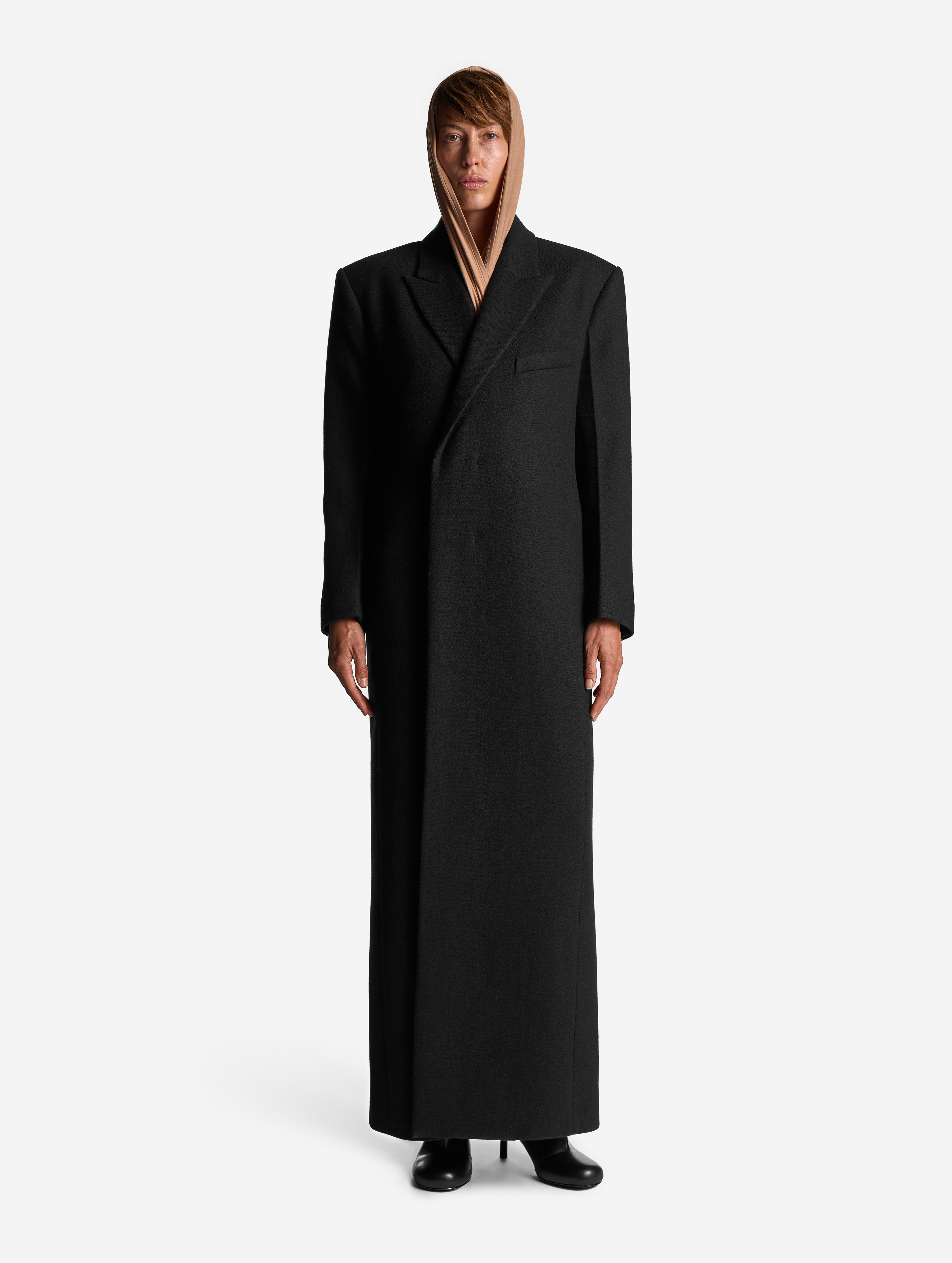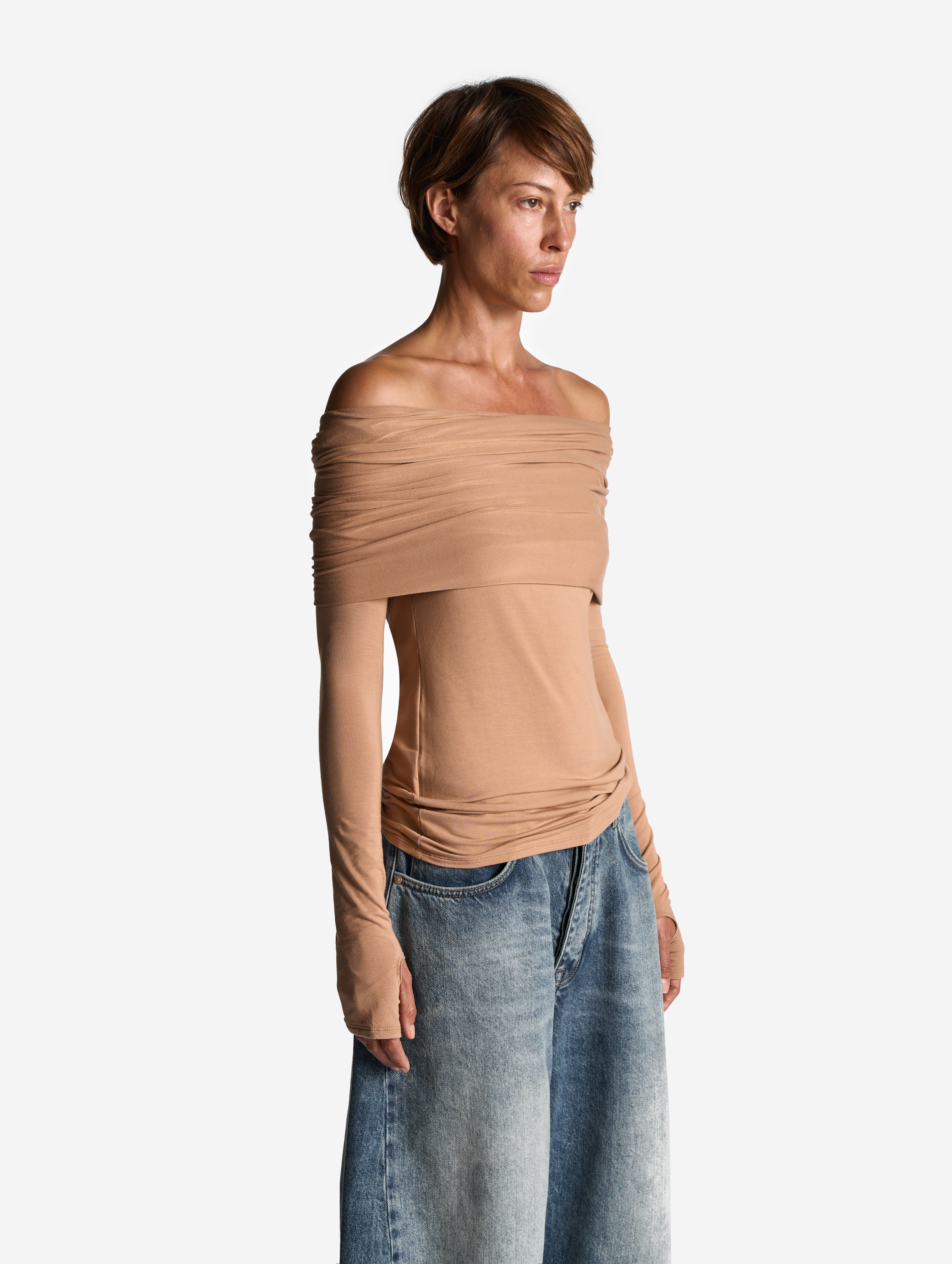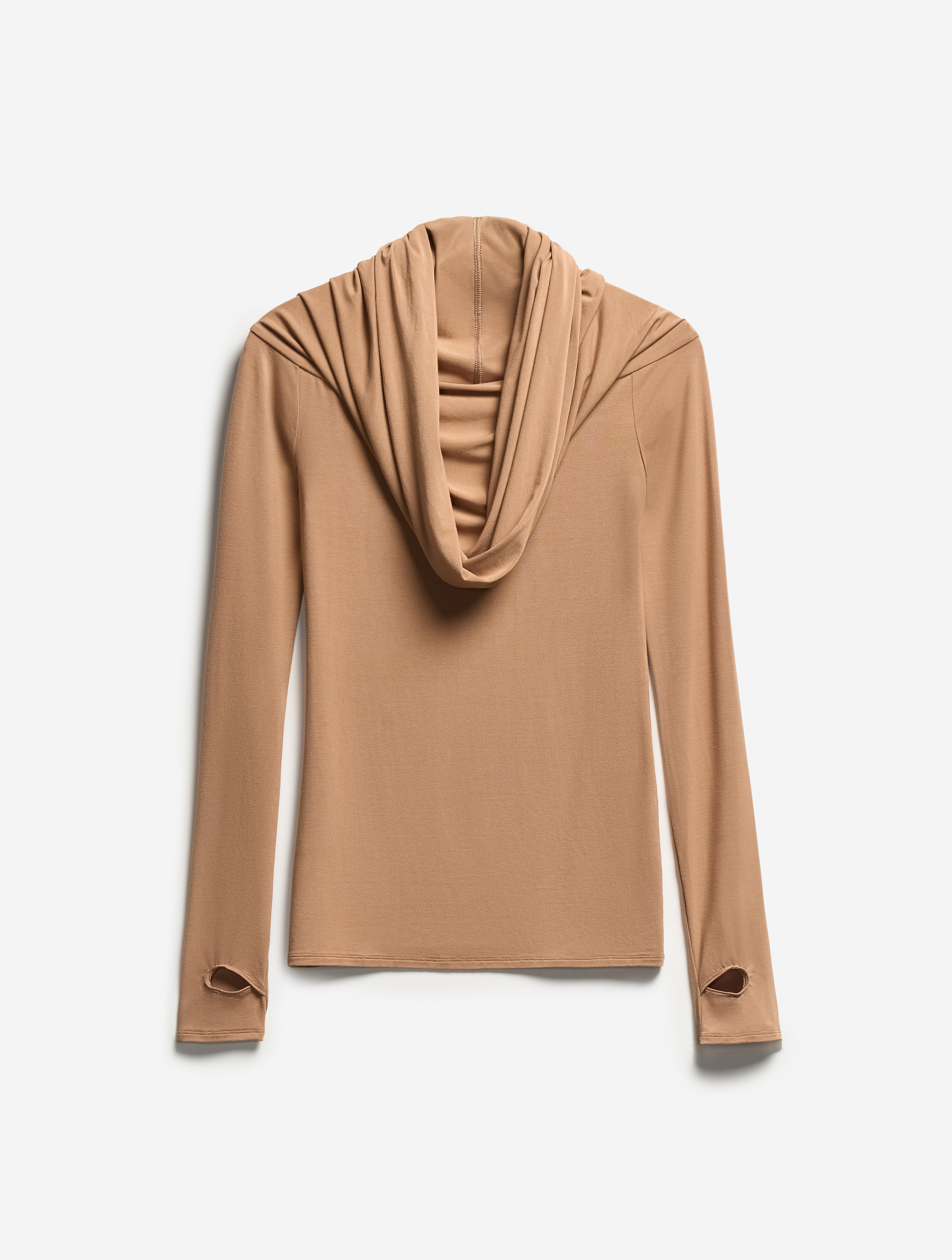 Баланс открытого и закрытого — ключевая дизайн-формула этого изделия. Объемная пелерина образует широкий воротник, положение которого легко варьируется. Его можно отогнуть, полностью обнажив плечи, или поднять, чтобы образовался капюшон. У джемпера прилегающая посадка, удлиненный силуэт и рукава с прорезями для больших пальцев. Изделие выполнено из вискозного трикотажа: он мягкий, гладкий, приятен для тела, хорошо тянется и не мнется. Благодаря этим свойствам ткань можно расправить по фигуре или позволить ей собраться в хаотичные мягкие складки.