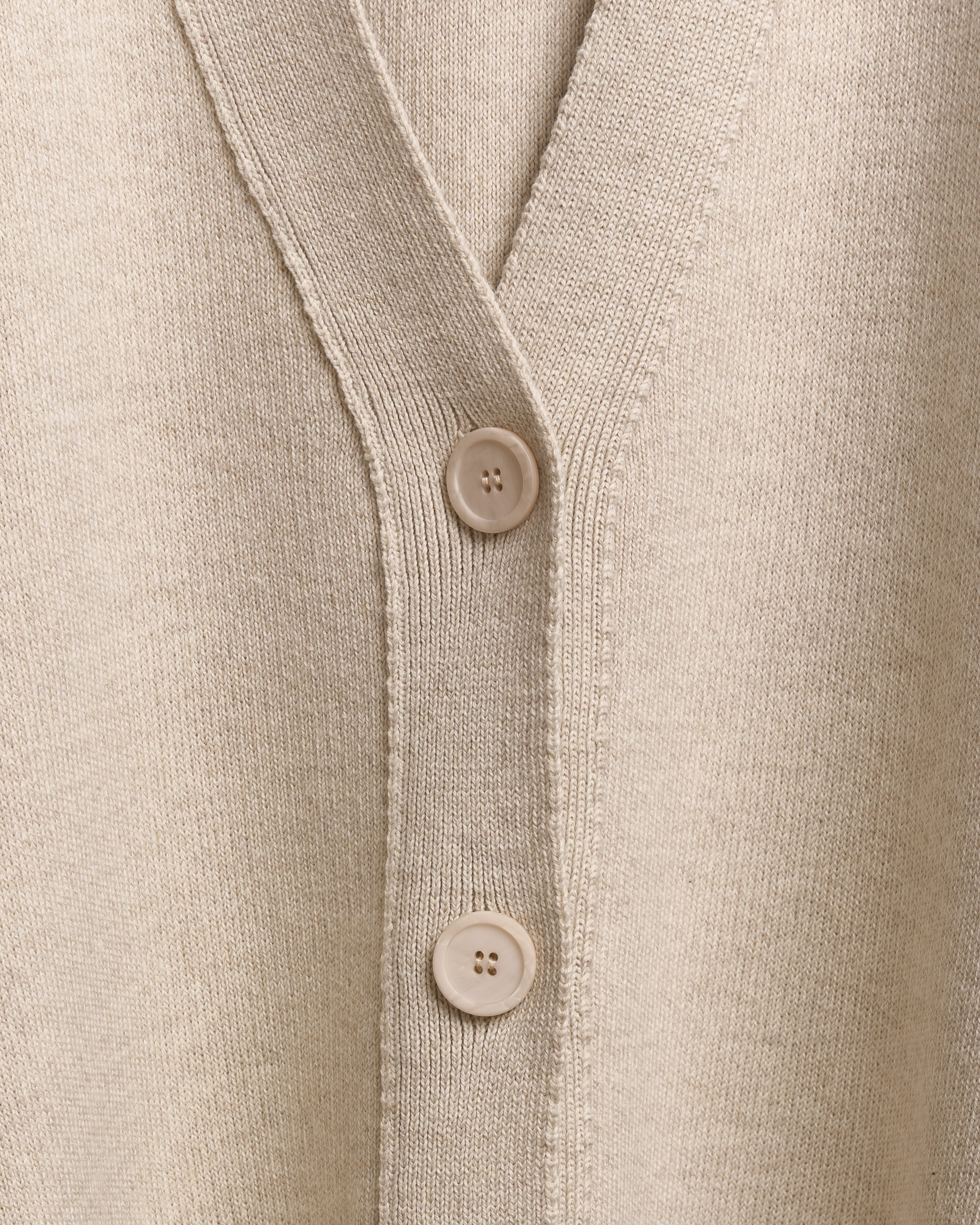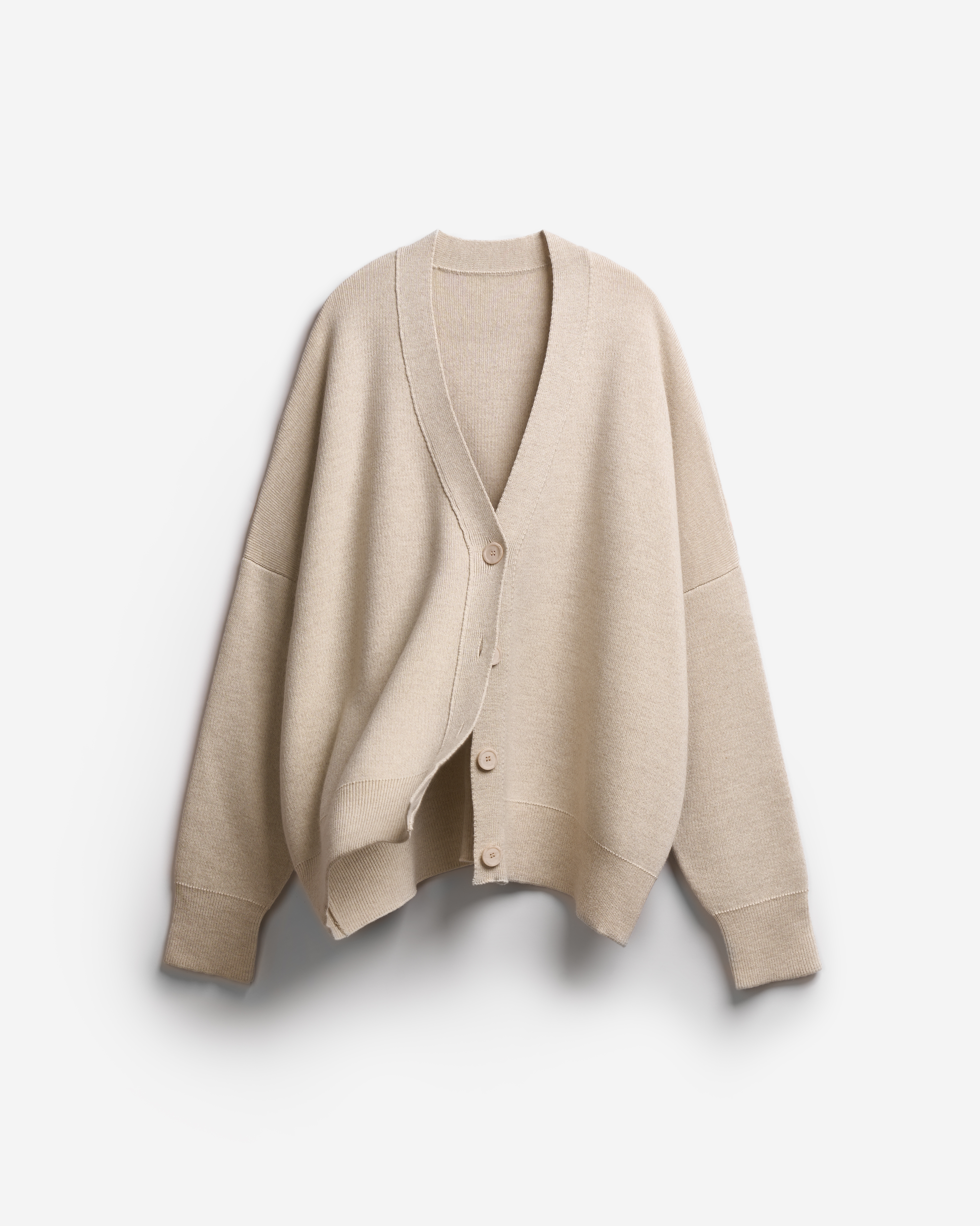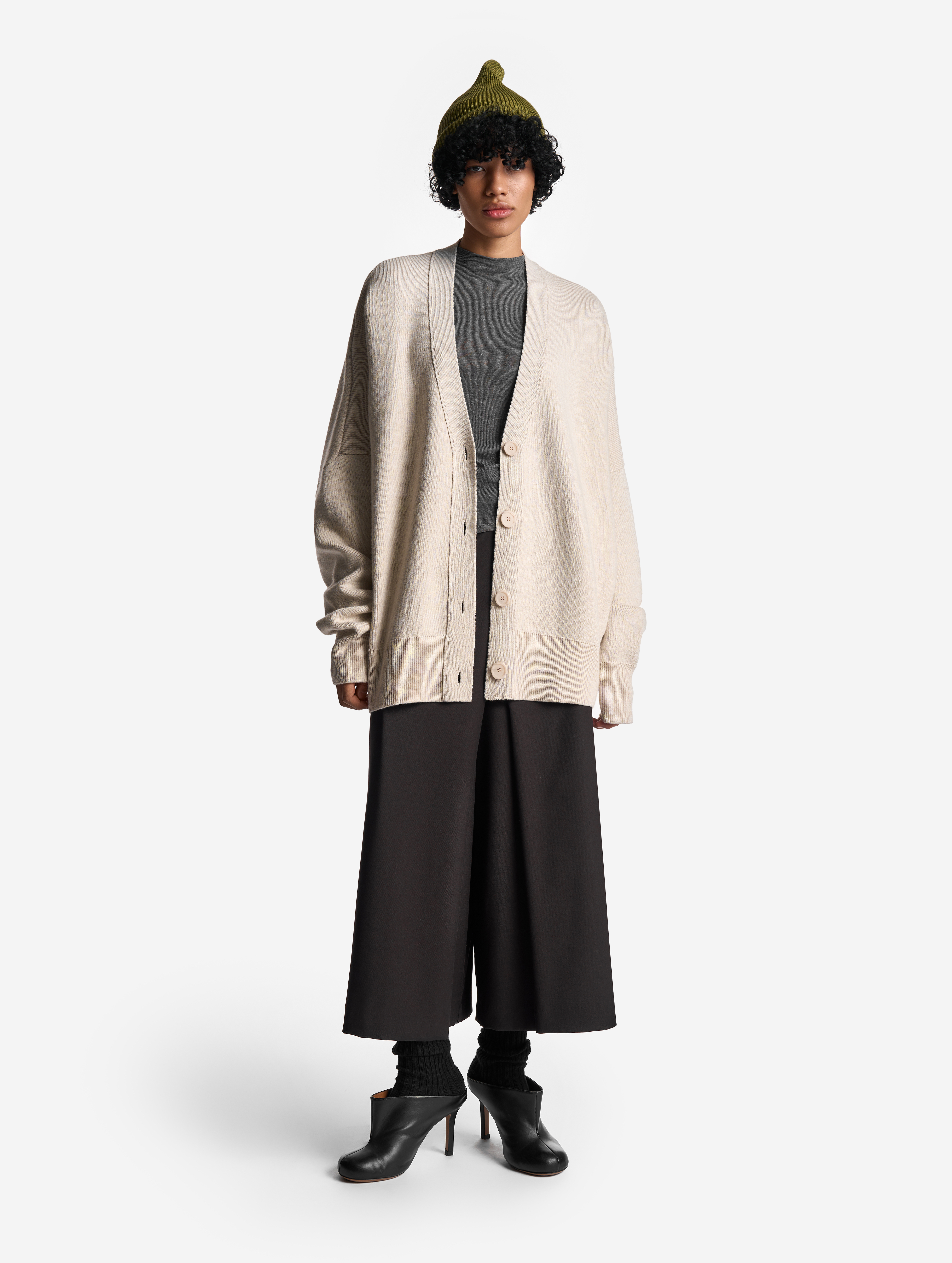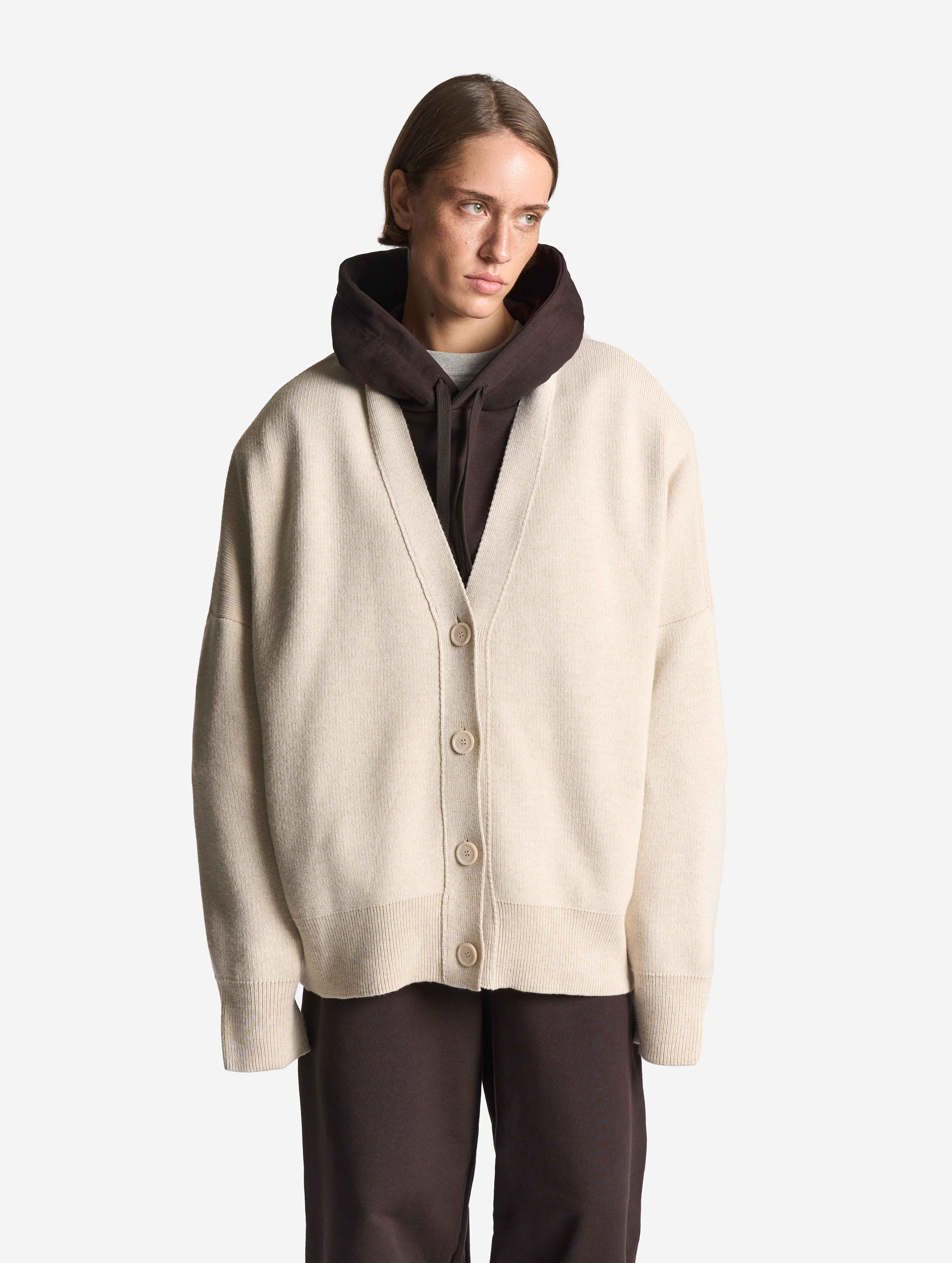 Вязаный кардиган удлиненного оверсайз-силуэта. Одинаково хорошо сидит на мужской и женской фигуре. Застегивается на роговые брендированные пуговицы. Благодаря наличию в составе акрила кардиган не пиллингуется и не деформируется со временем.