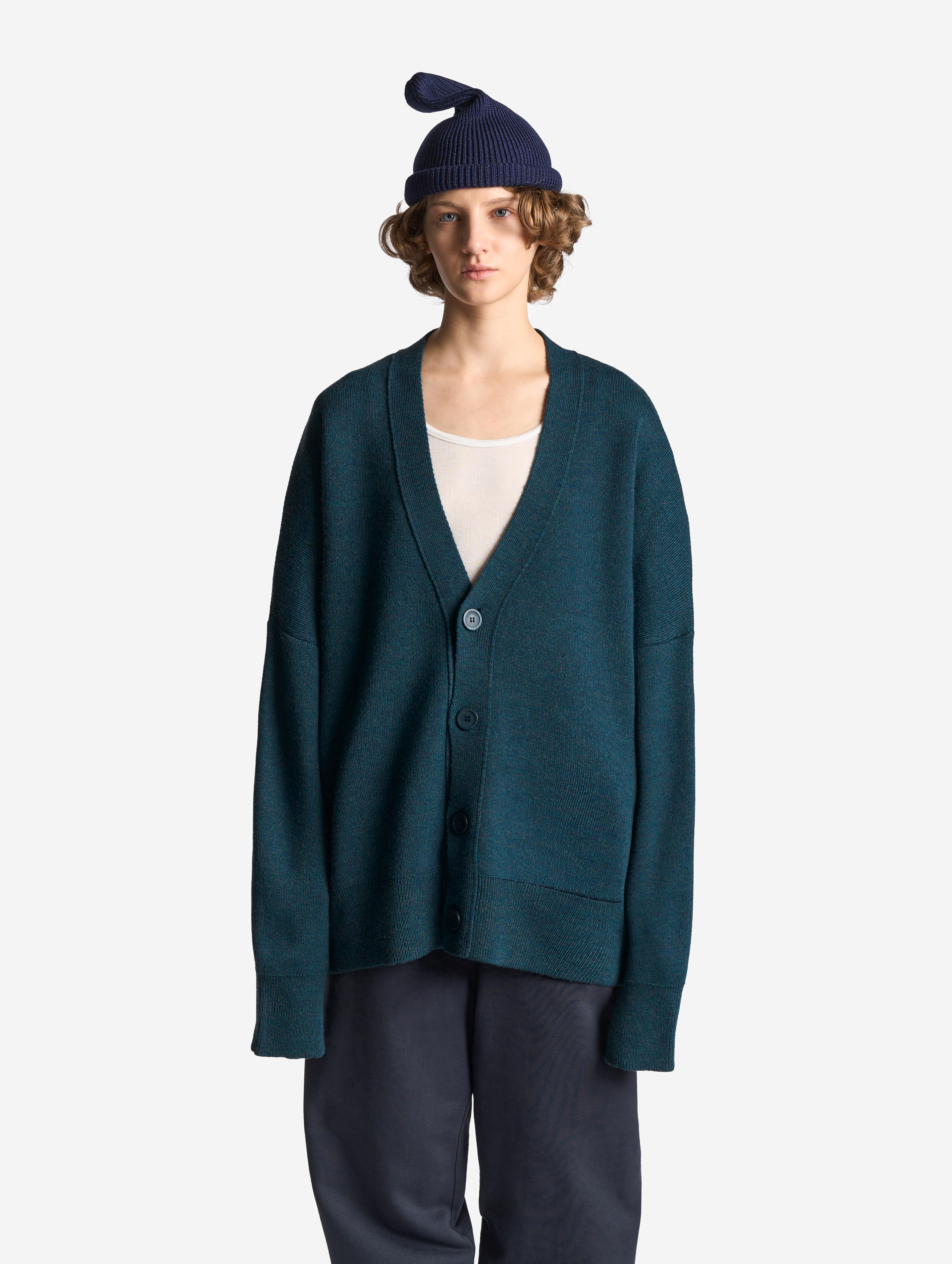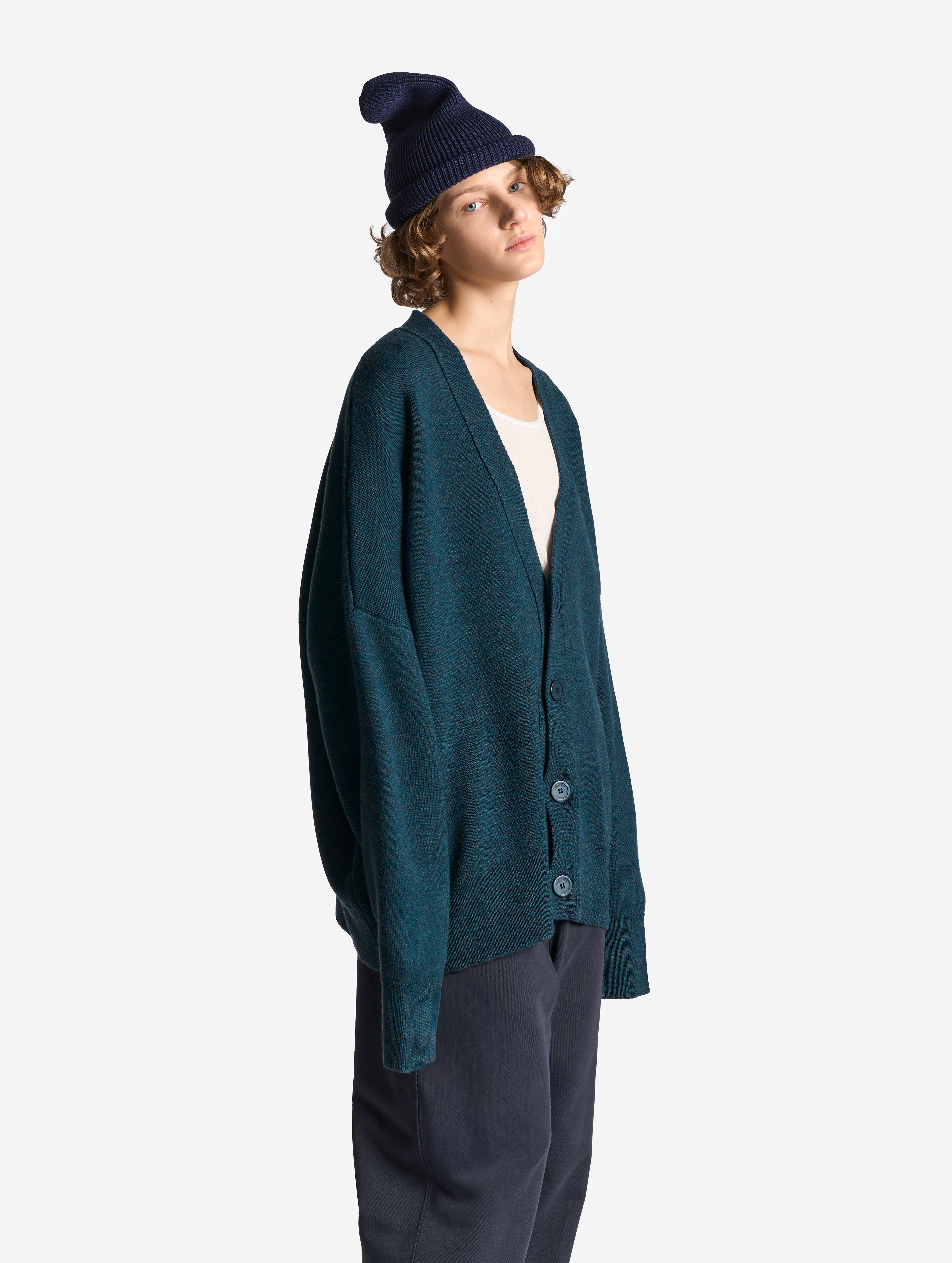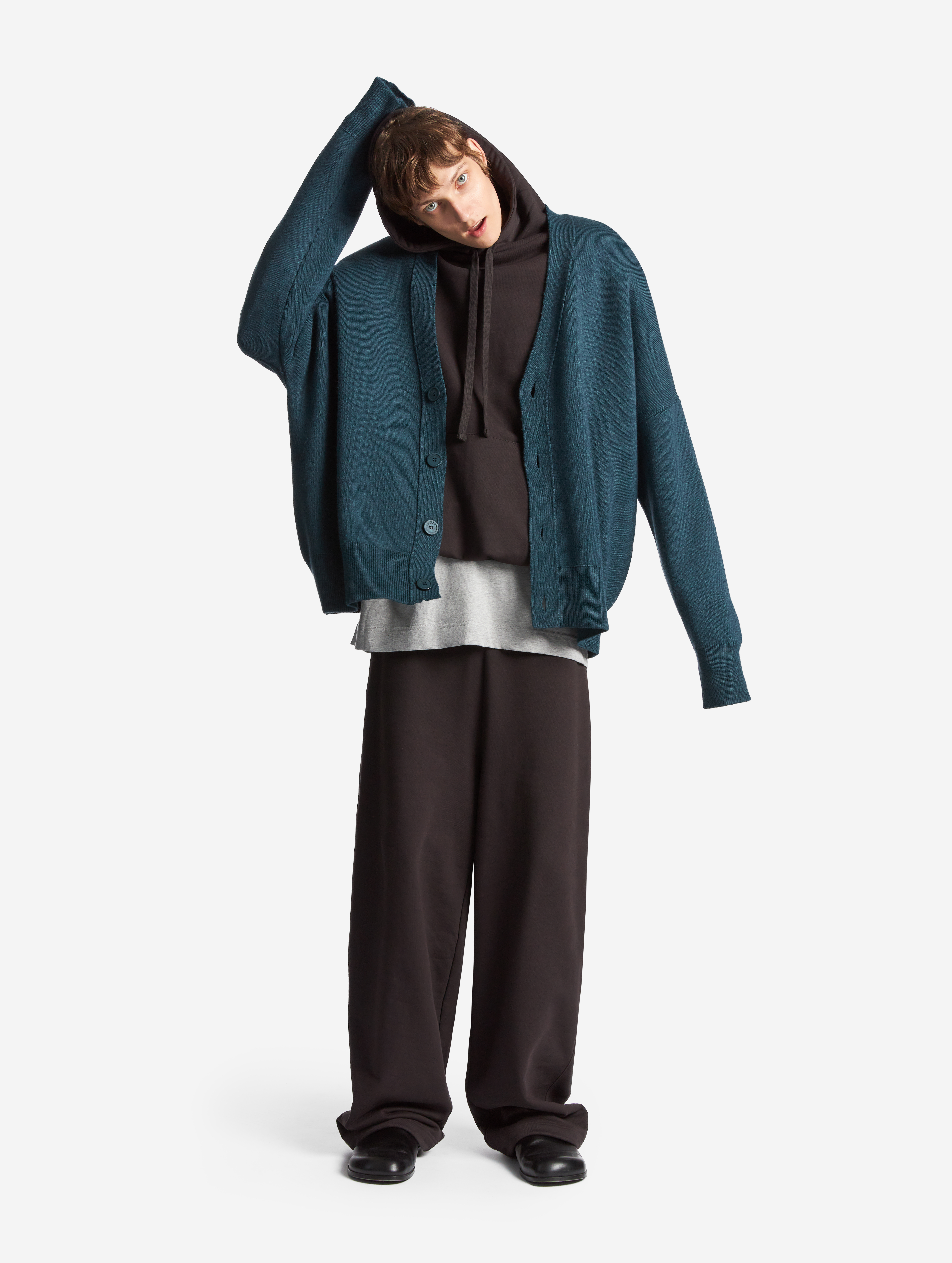 Вязаный кардиган удлиненного оверсайз-силуэта. Одинаково хорошо сидит на мужской и женской фигуре. Застегивается на роговые брендированные пуговицы. Благодаря наличию в составе акрила кардиган не пиллингуется и не деформируется со временем.