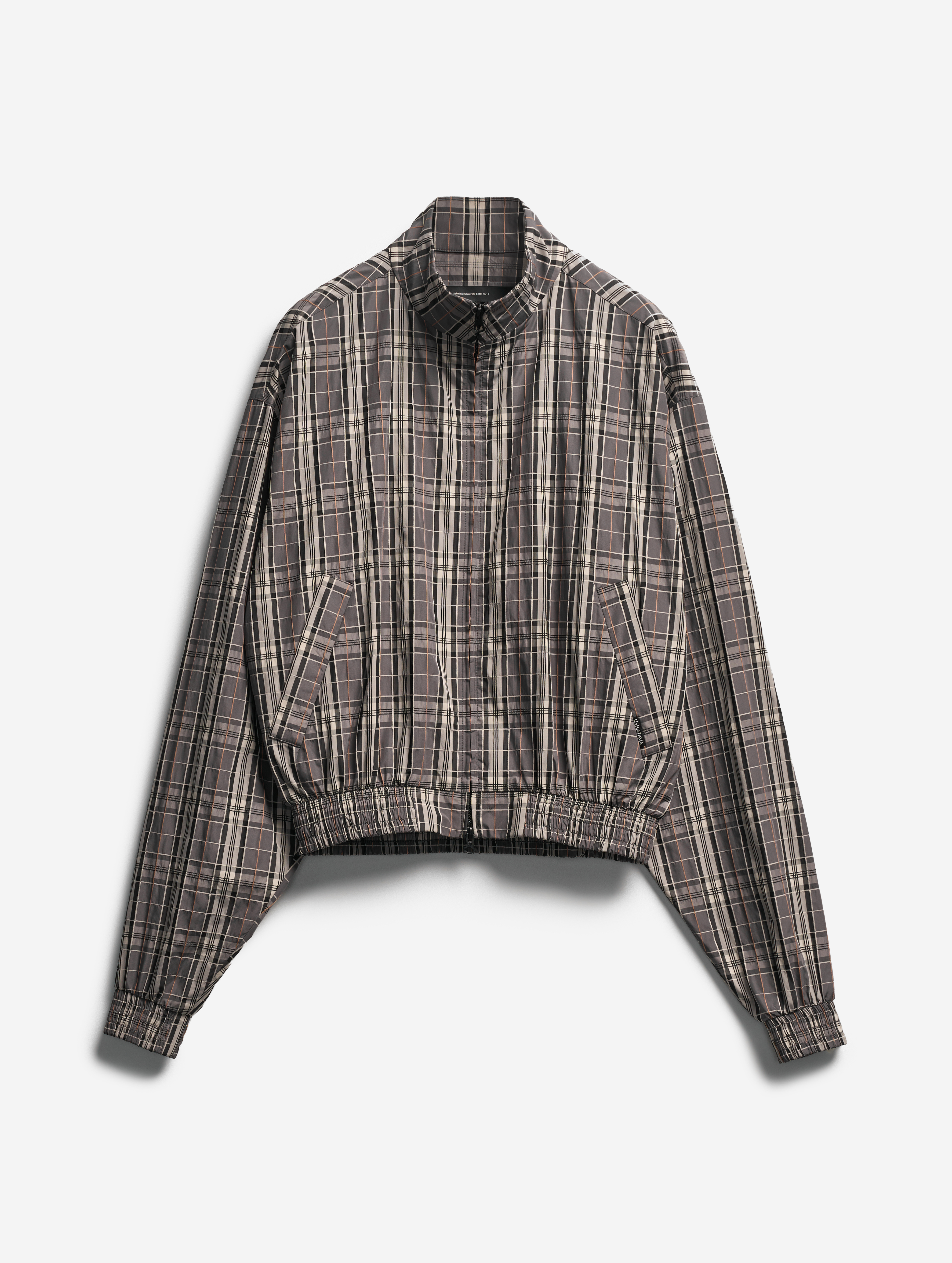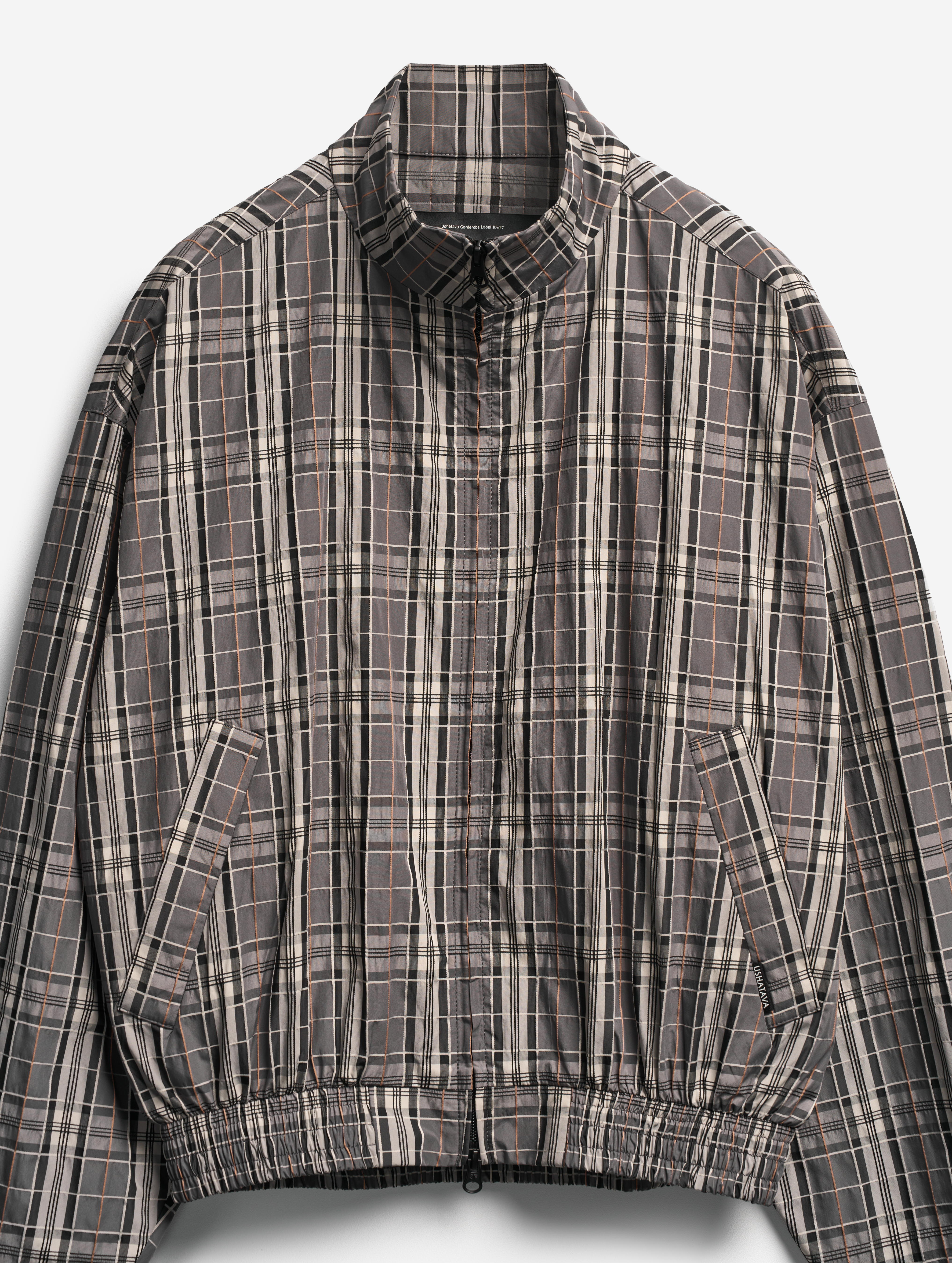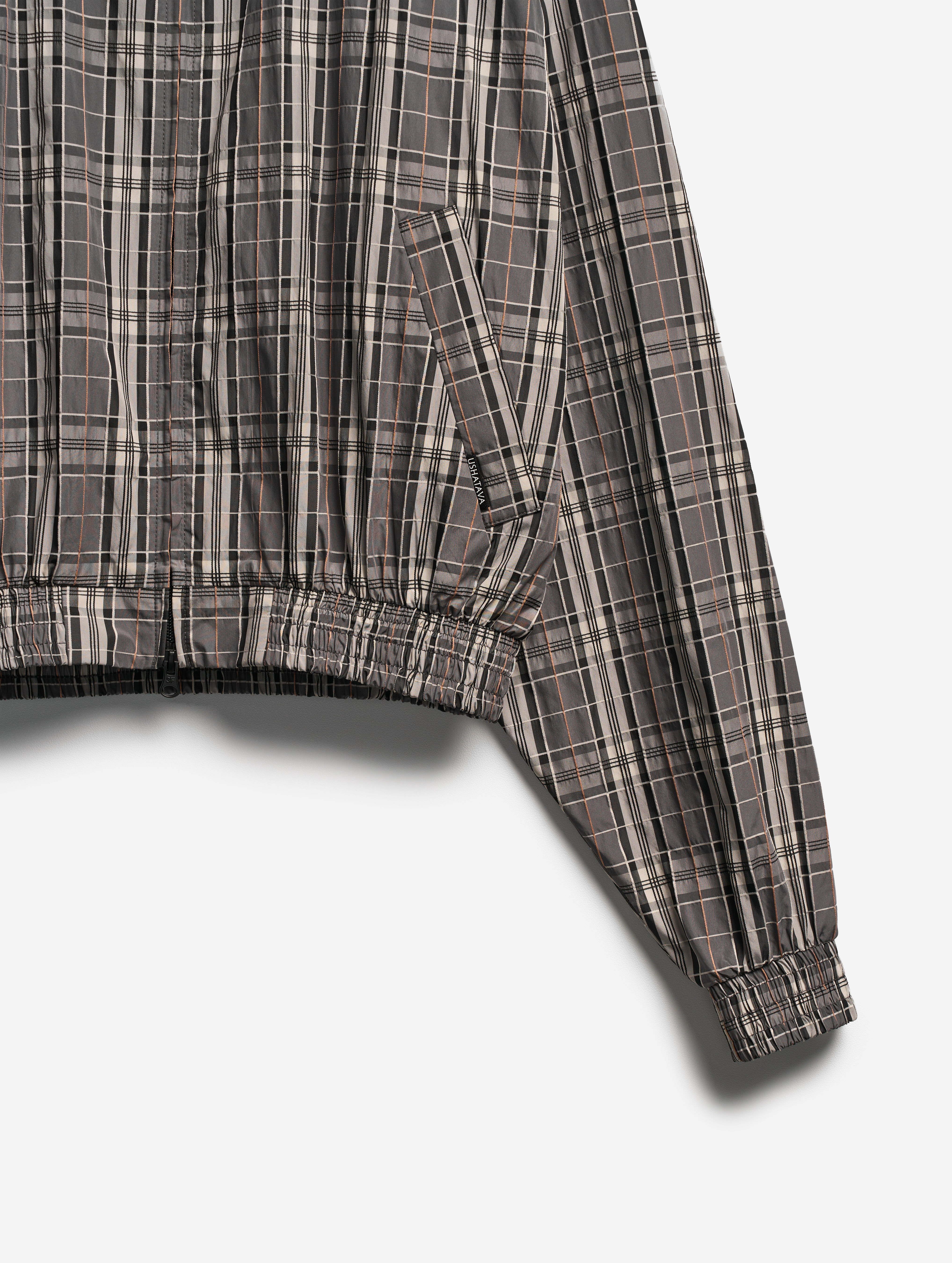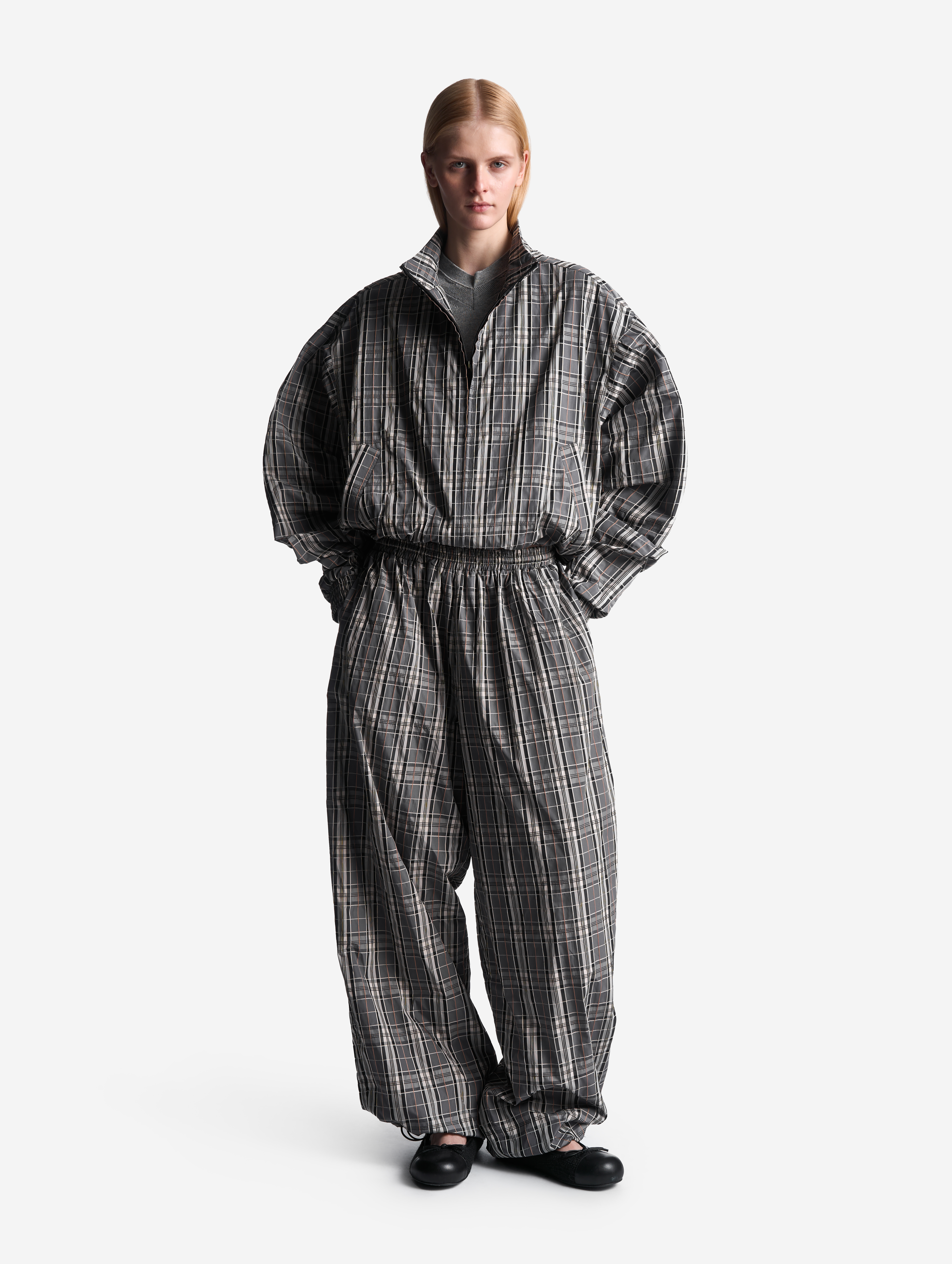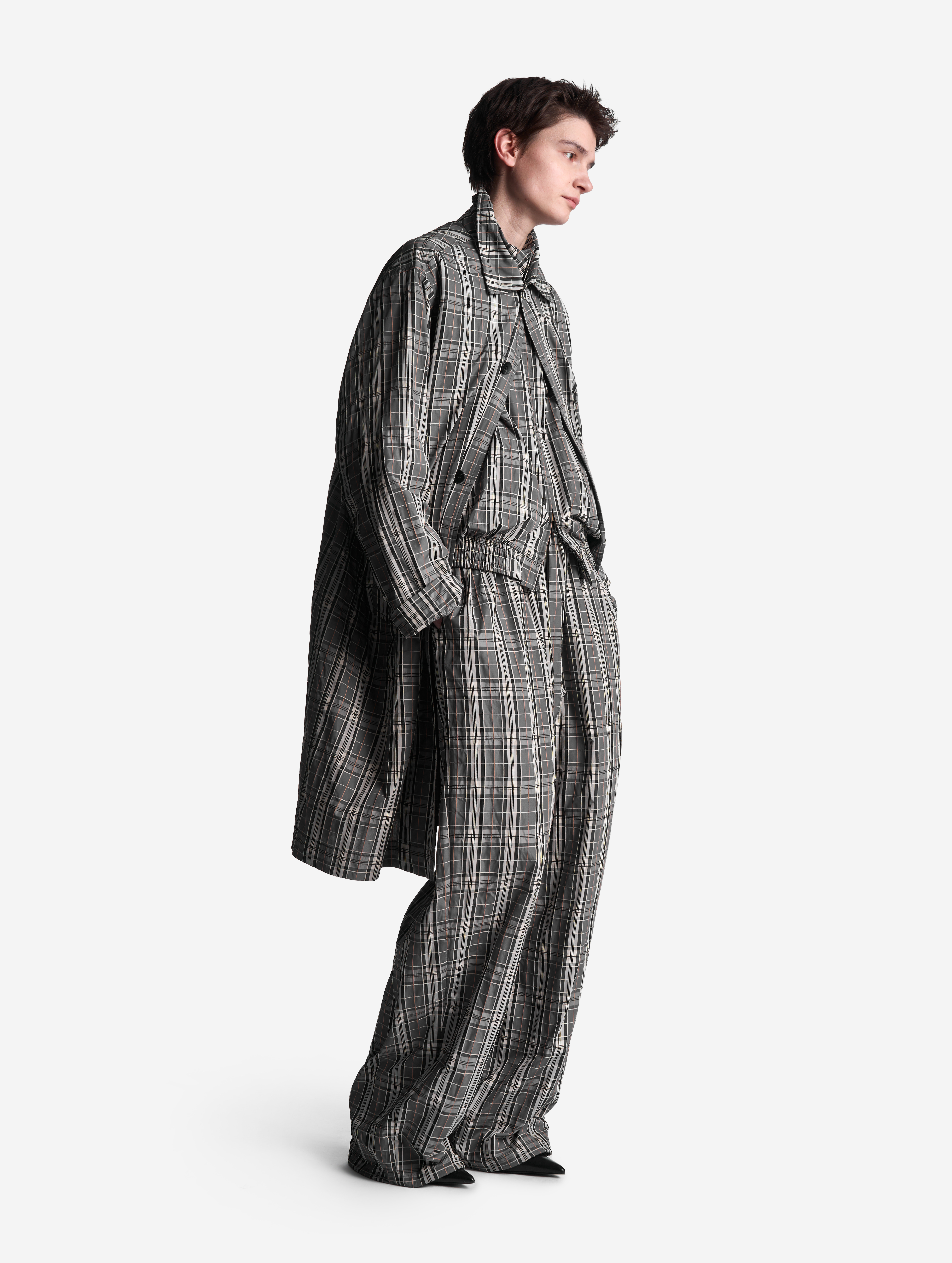 Как в шотландский тартан закладывали сведения о местности его создания и клане владельца, так и мы зашифровали в клетчатый принт ткани информацию о Garderobe SS26. Клетчатый рисунок образован из линий разной толщины в характерных цветах коллекции: сером, черном, белом и бежевом. Выбранный нами материал представляет собой мягкую японскую плащевку с водоотталкивающей поверхностью.