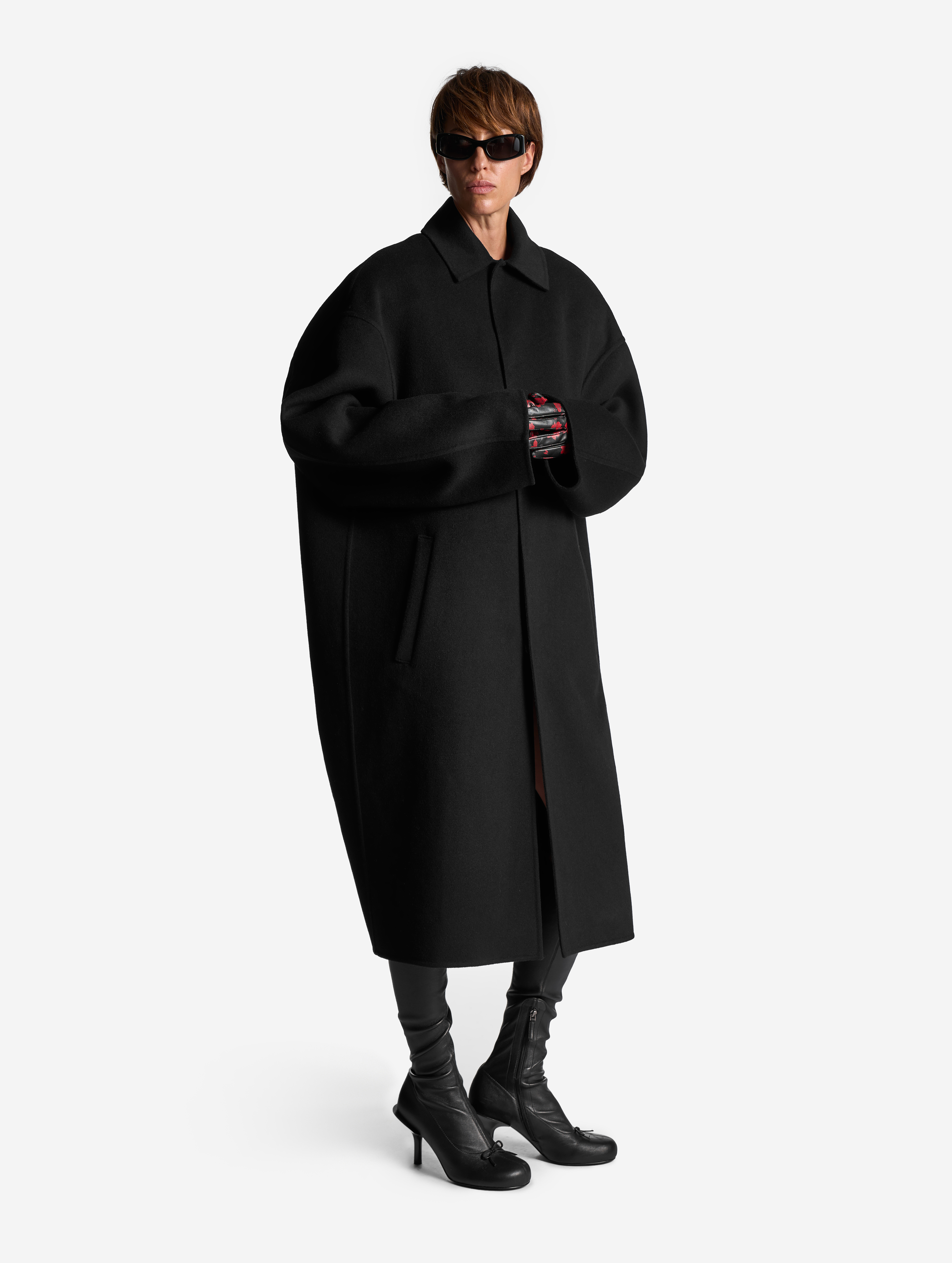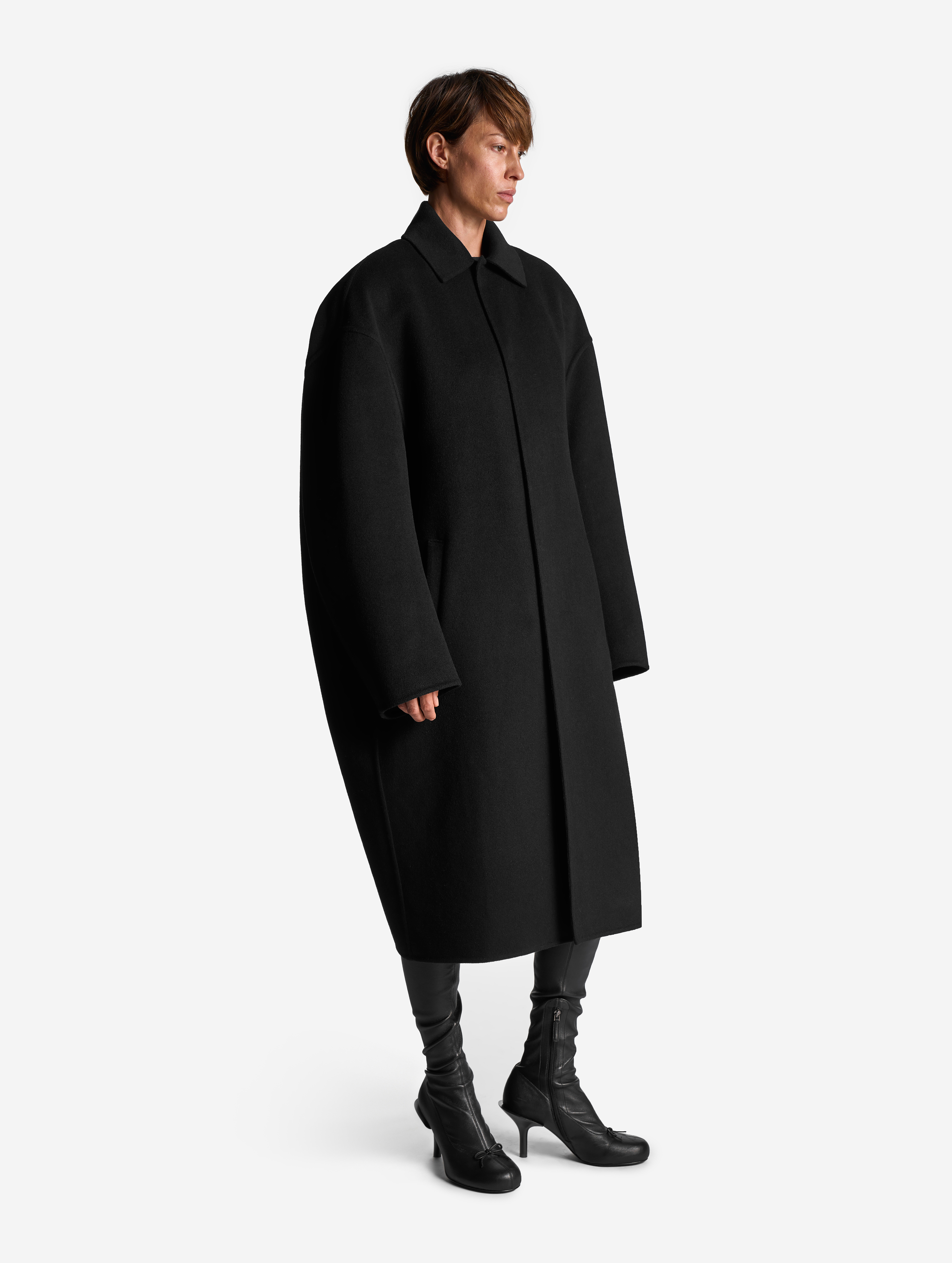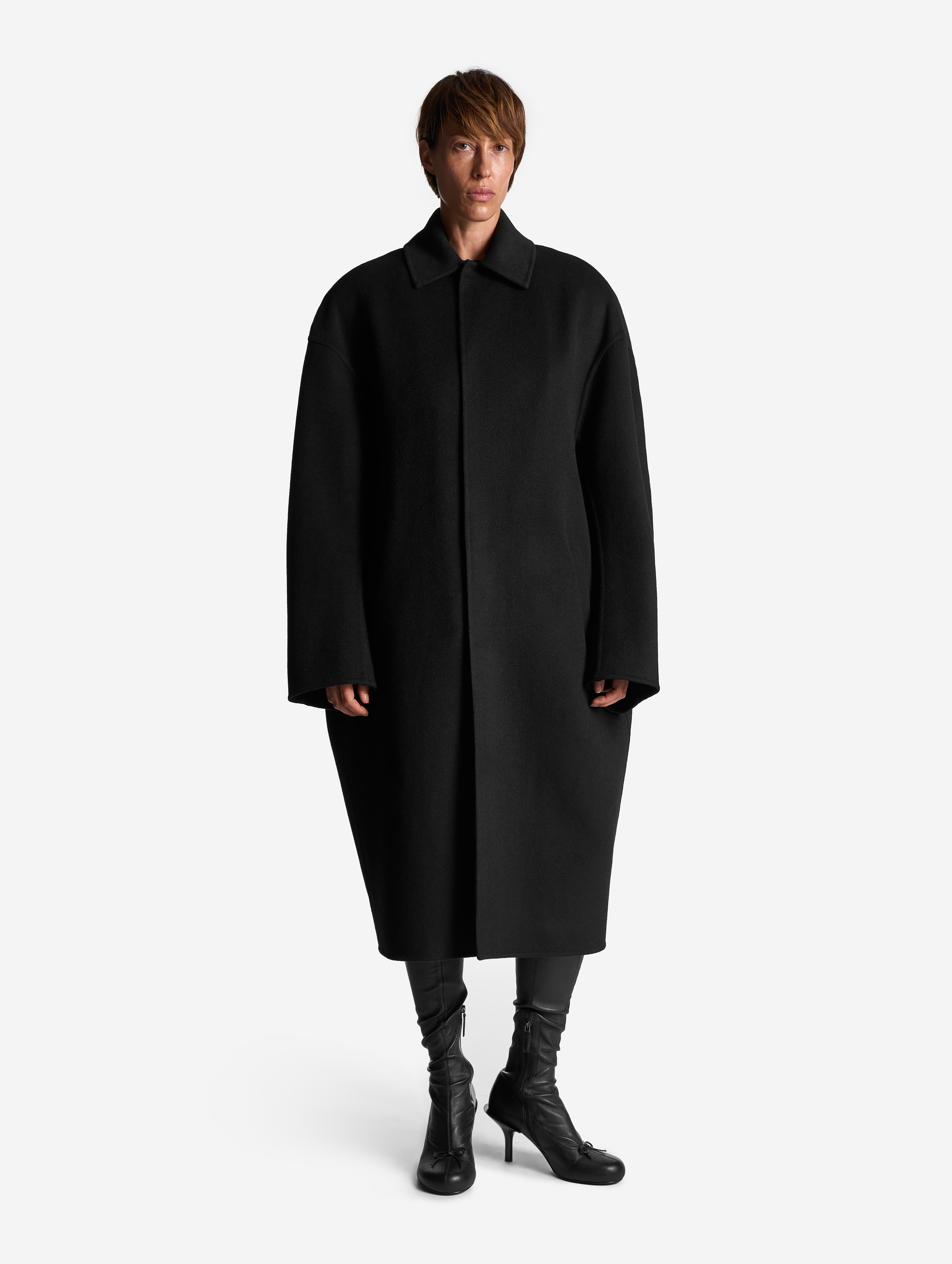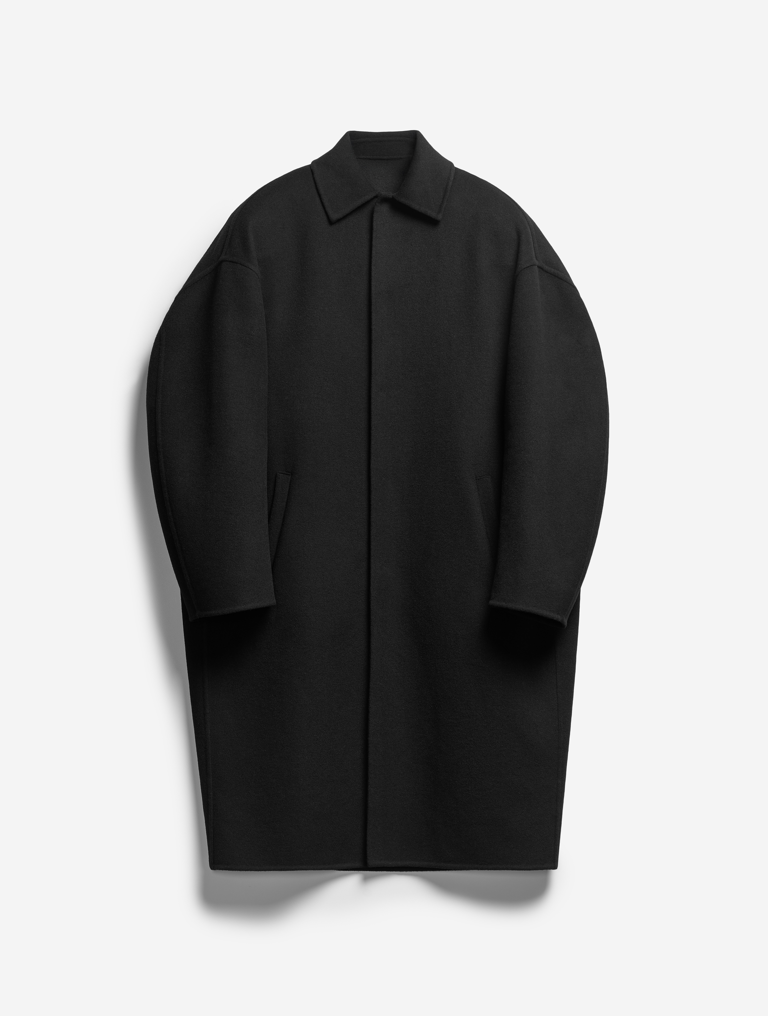 У силуэтов Ushatava есть имена. Так мы объединяем модели по схожим характерным чертам. «О» — иконическая форма, которая впервые появляется в дизайне пальто Garderobe FW25/26. Конструкция изделия напоминает овал: его форма заужена в плечах и голенях, но расширяется в районе бедер. Есть и другие особенности кроя — например, воротник фиксируется в положении стойки при помощи тяжелых пришивных уголков, а к изнанке можно пристегнуть съемные подплечники — чтобы усилить покатую структуру плеч. У пальто есть два кармана. В качестве застежки — четыре кнопки.