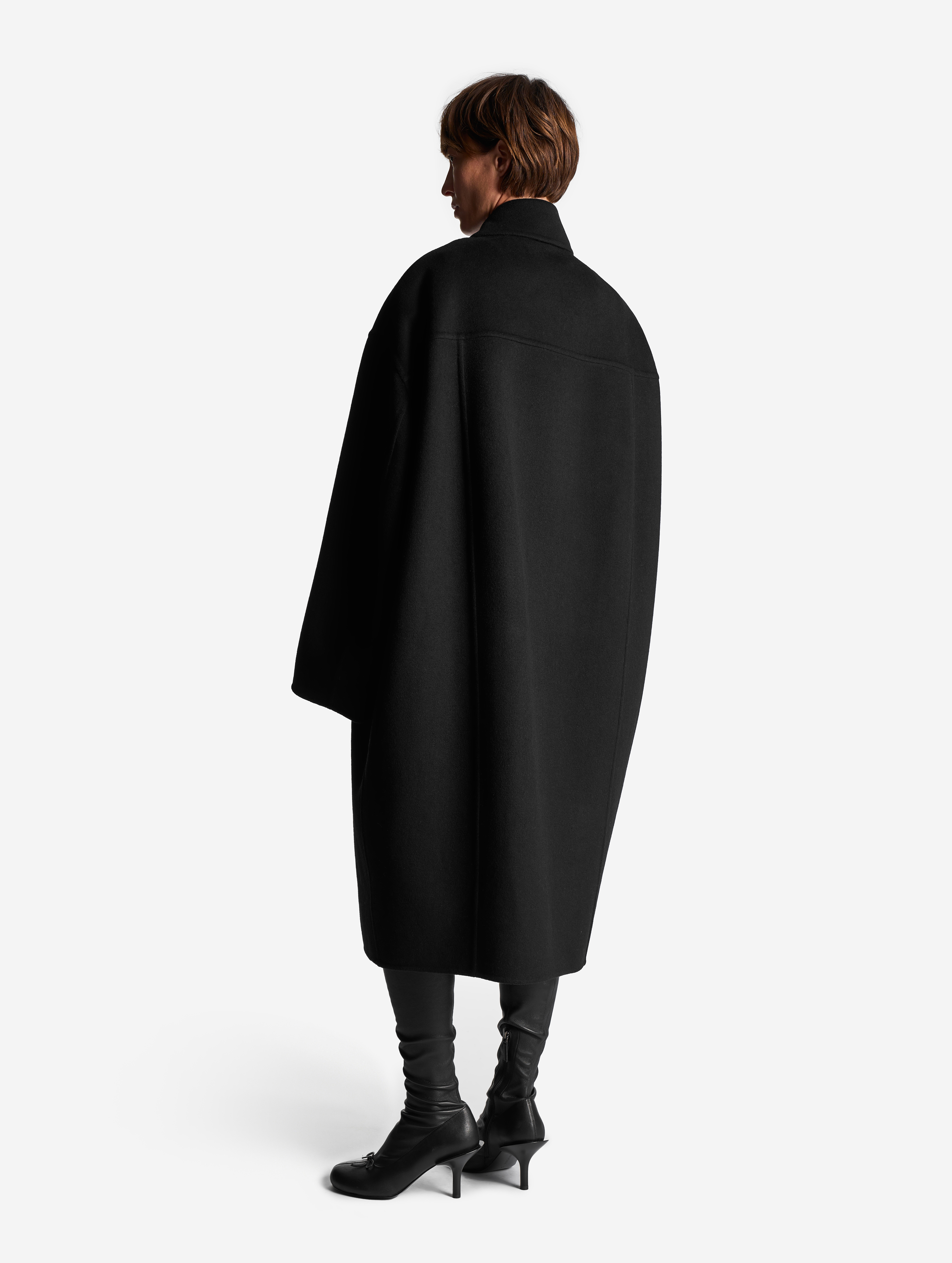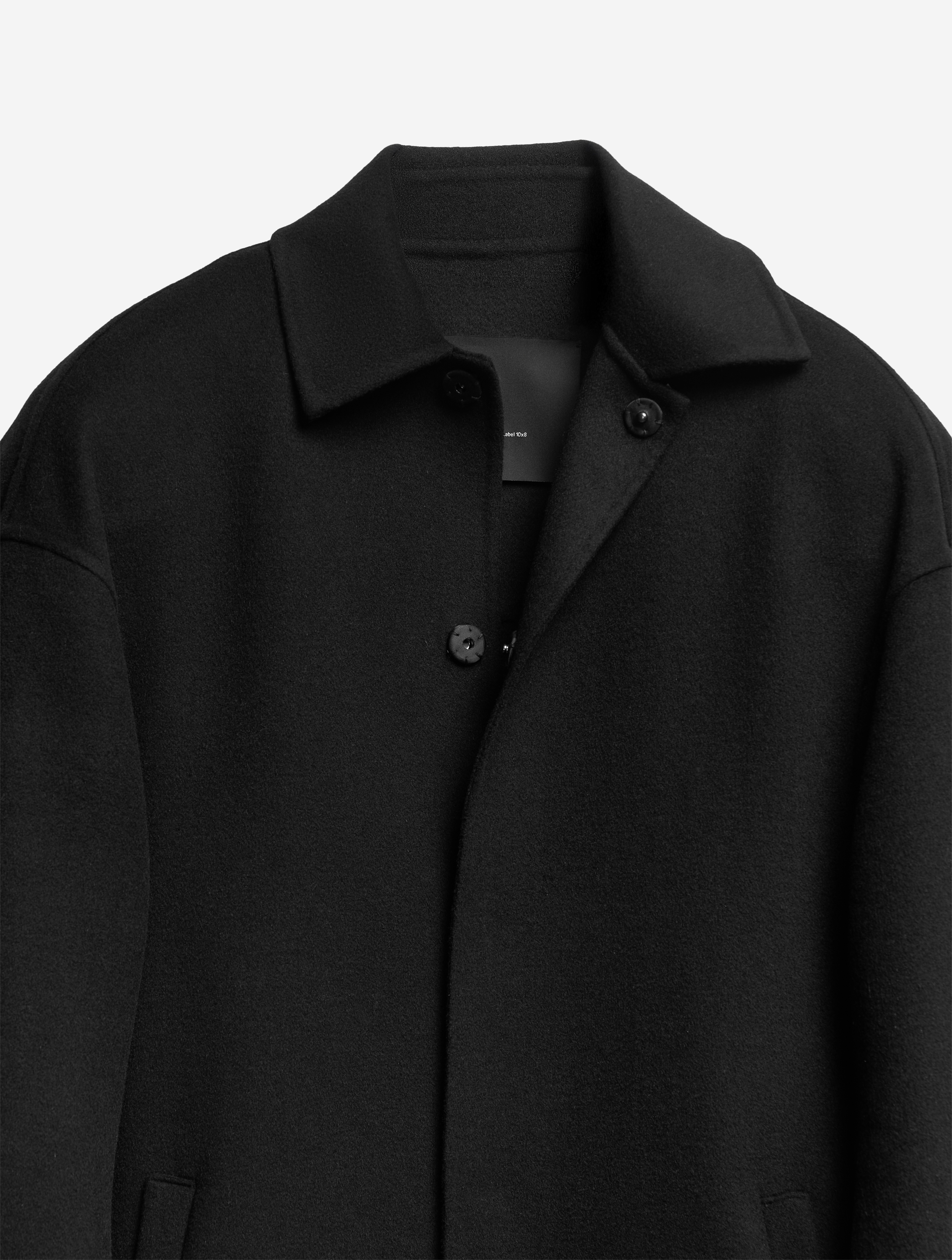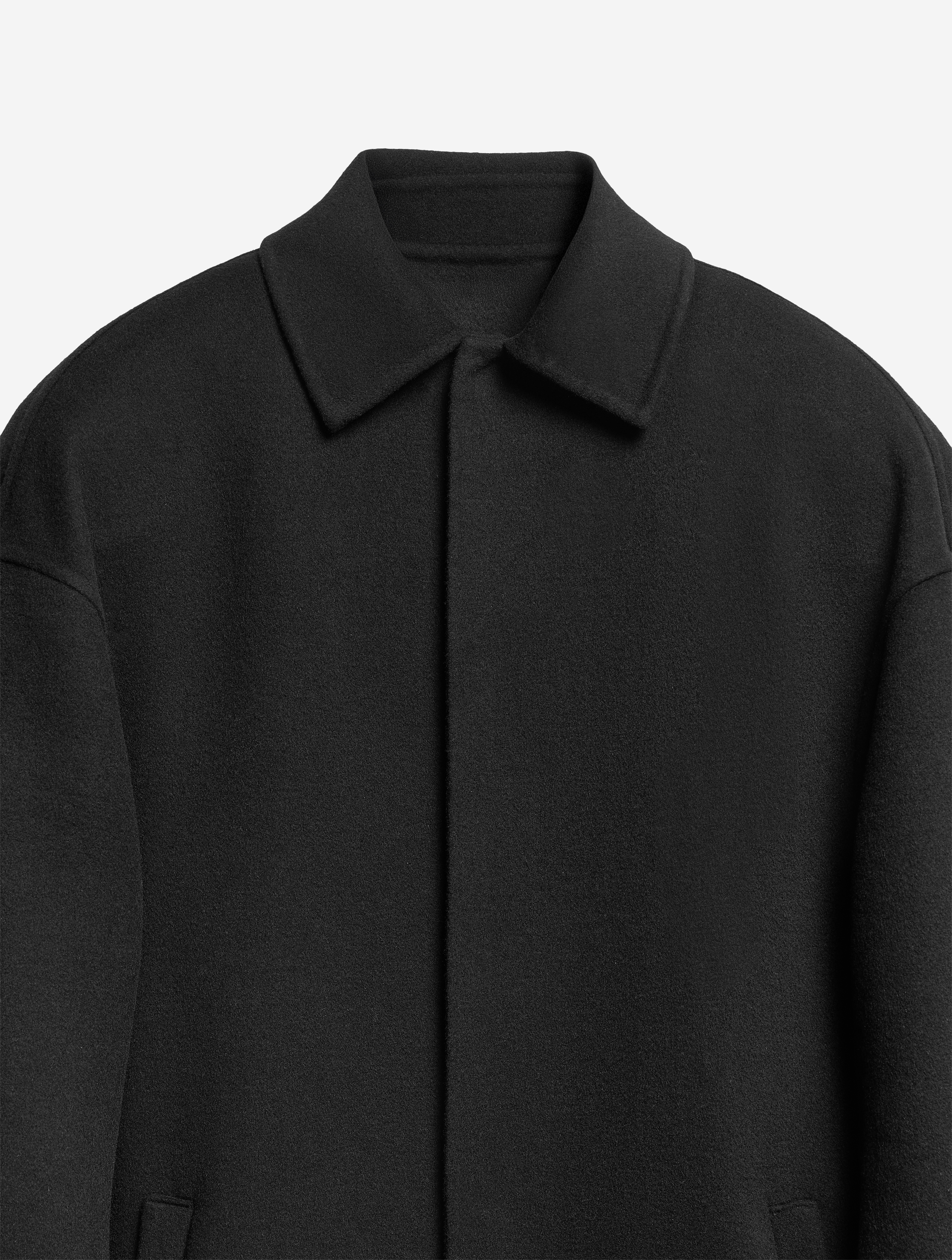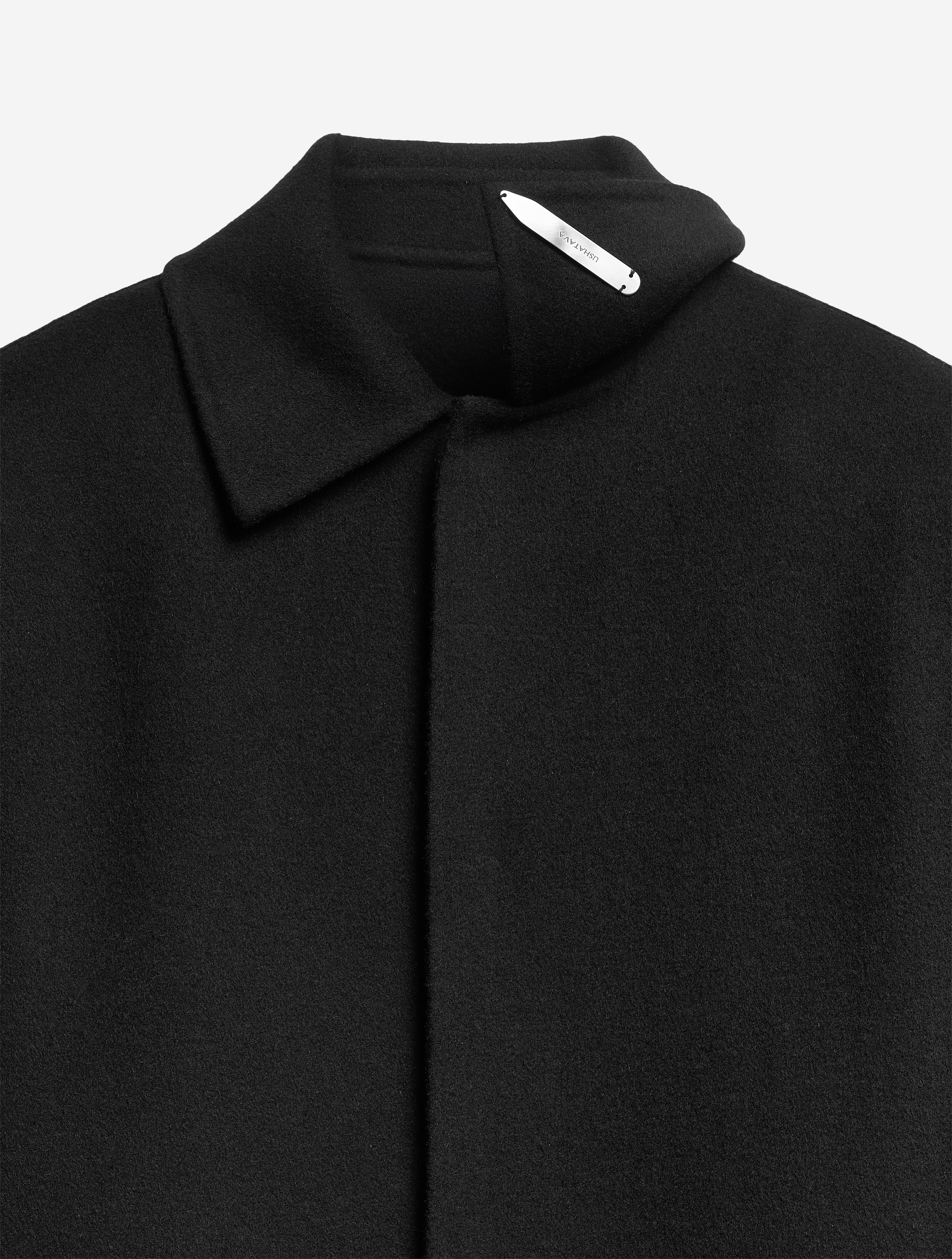 У силуэтов Ushatava есть имена. Так мы объединяем модели по схожим характерным чертам. «О» — иконическая форма, которая впервые появляется в дизайне пальто Garderobe FW25/26. Конструкция изделия напоминает овал: его форма заужена в плечах и голенях, но расширяется в районе бедер. Есть и другие особенности кроя — например, воротник фиксируется в положении стойки при помощи тяжелых пришивных уголков, а к изнанке можно пристегнуть съемные подплечники — чтобы усилить покатую структуру плеч. У пальто есть два кармана. В качестве застежки — четыре кнопки.