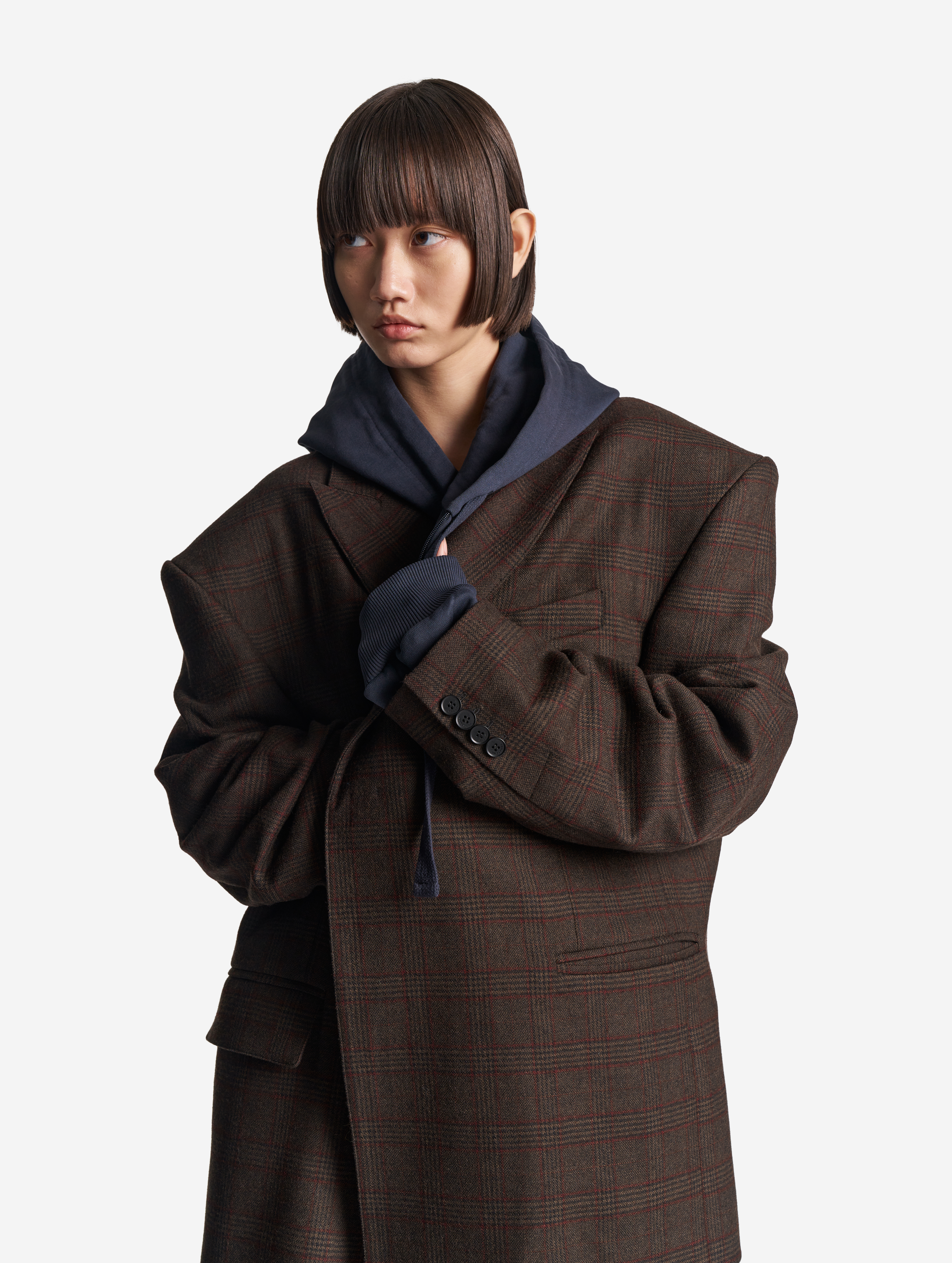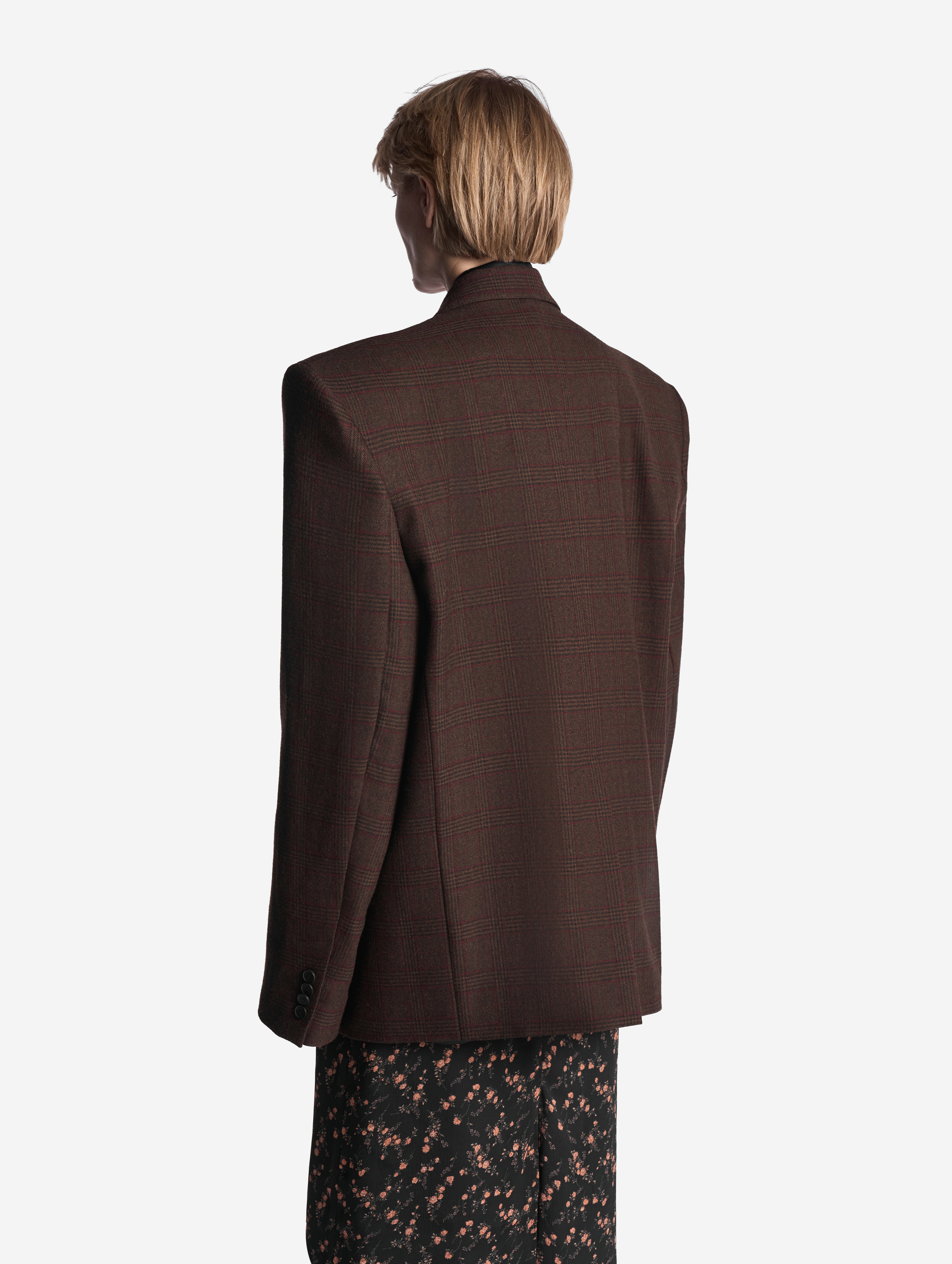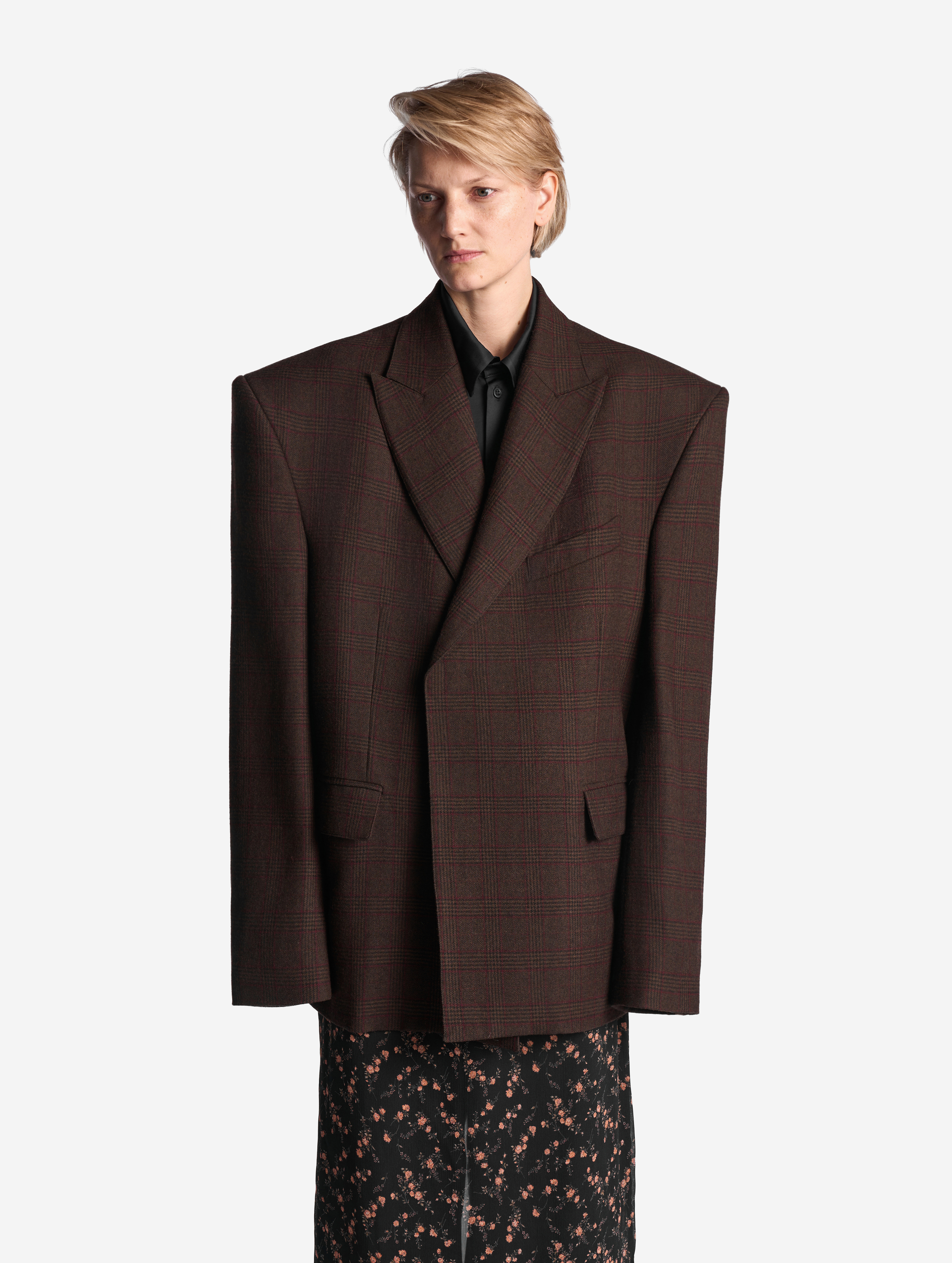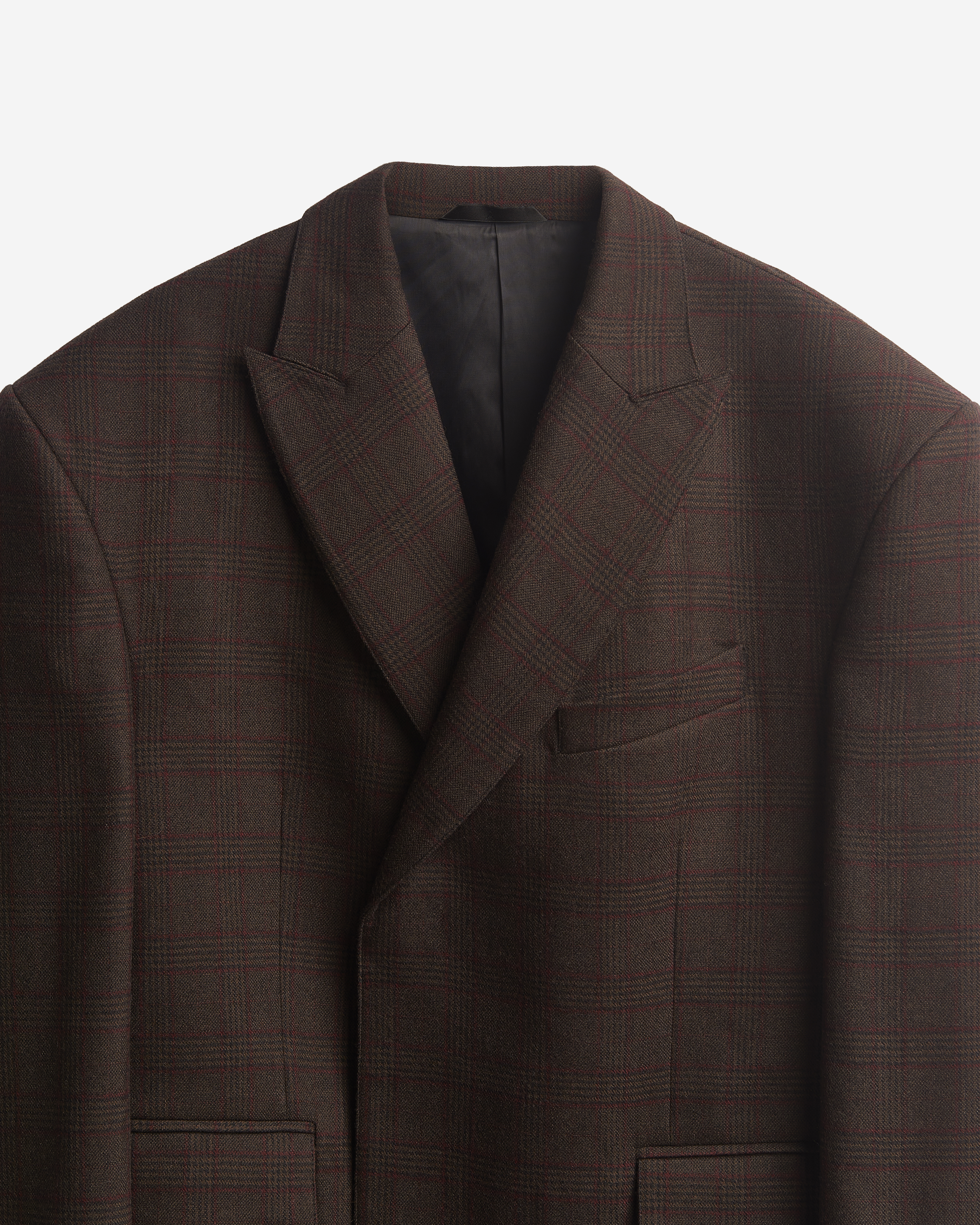 В ходе экспериментов над формой пиджака его плечи были разведены в стороны настолько сильно, что в какой-то момент потеряли привычные очертания. Так появился дизайн-прием Dropped Shoulders: с английского словосочетание переводится как «упавшие плечи». Пиджак застегивается на пуговицы и внутри обработан подкладом. Есть два функциональных боковых кармана и один нагрудный, который по канонам портновского мастерства застрочен.