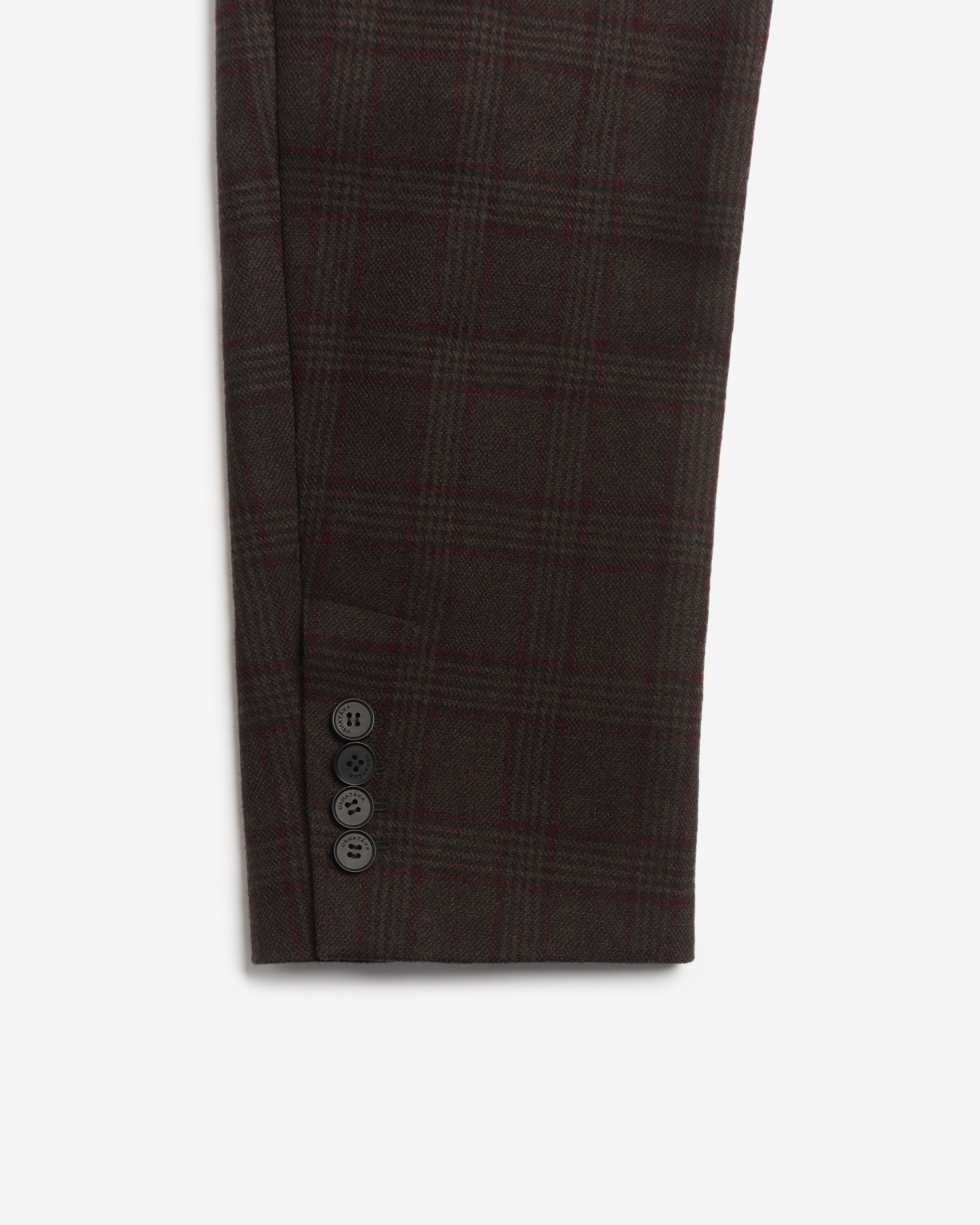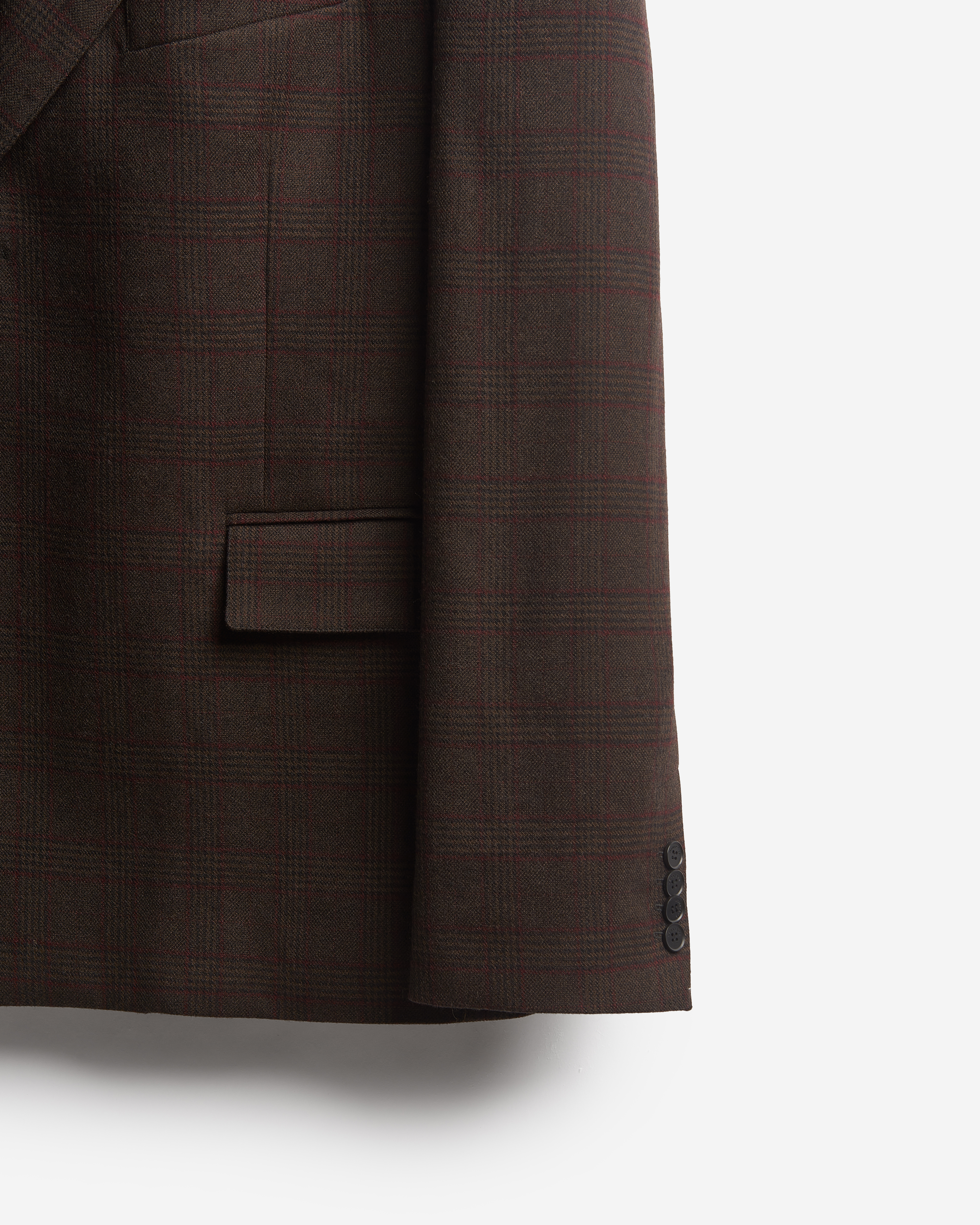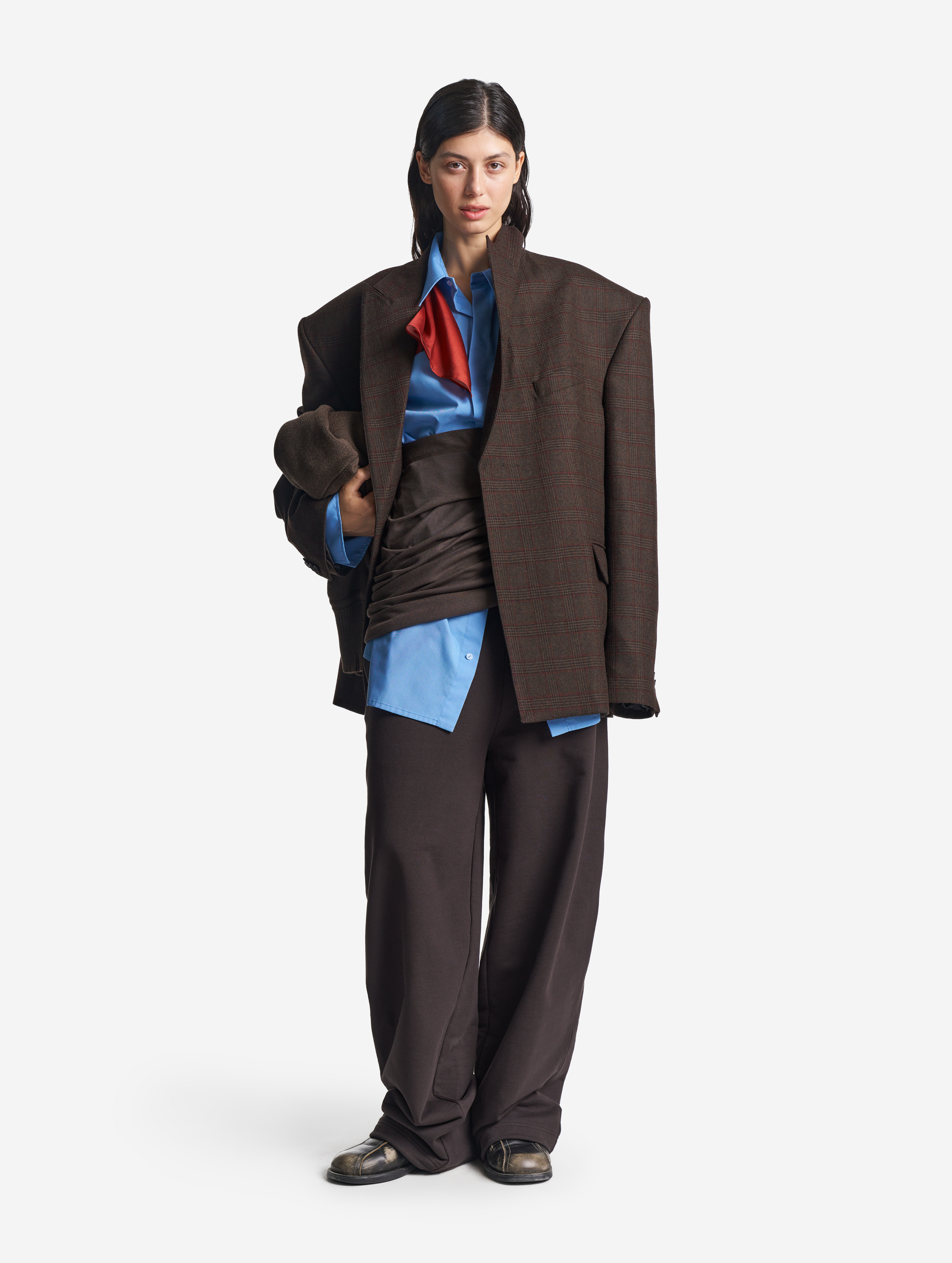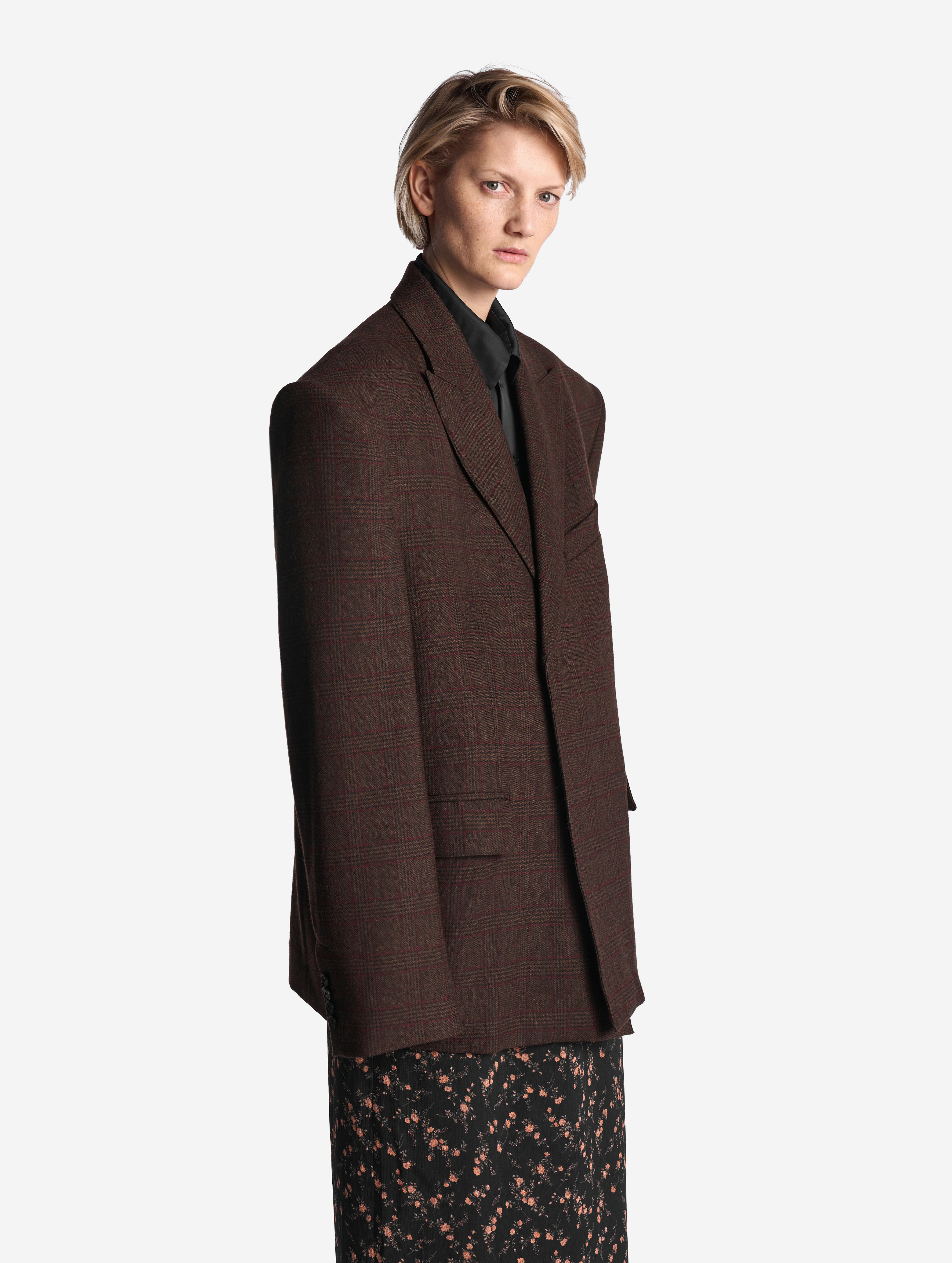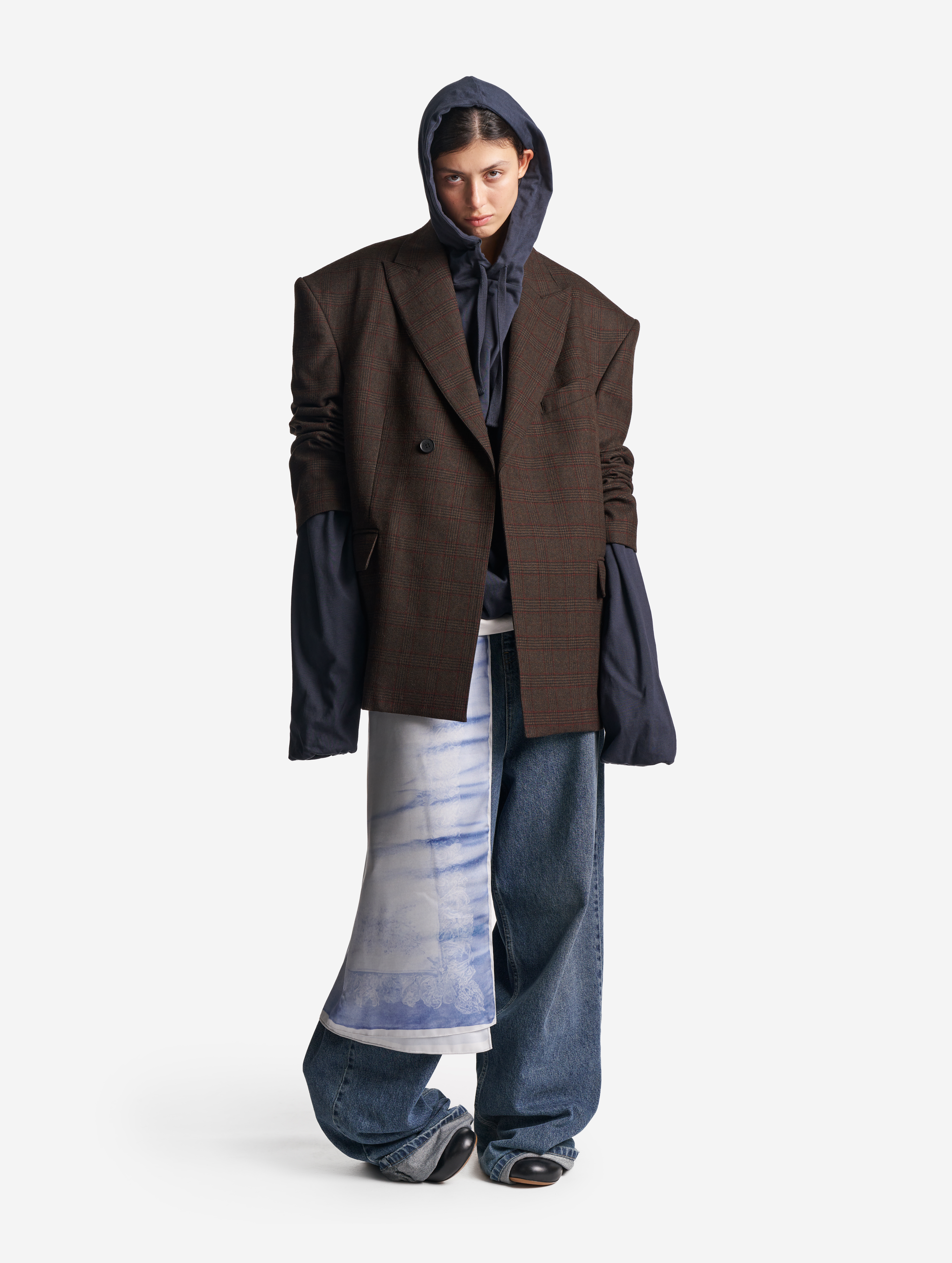 В ходе экспериментов над формой пиджака его плечи были разведены в стороны настолько сильно, что в какой-то момент потеряли привычные очертания. Так появился дизайн-прием Dropped Shoulders: с английского словосочетание переводится как «упавшие плечи». Пиджак застегивается на пуговицы и внутри обработан подкладом. Есть два функциональных боковых кармана и один нагрудный, который по канонам портновского мастерства застрочен.