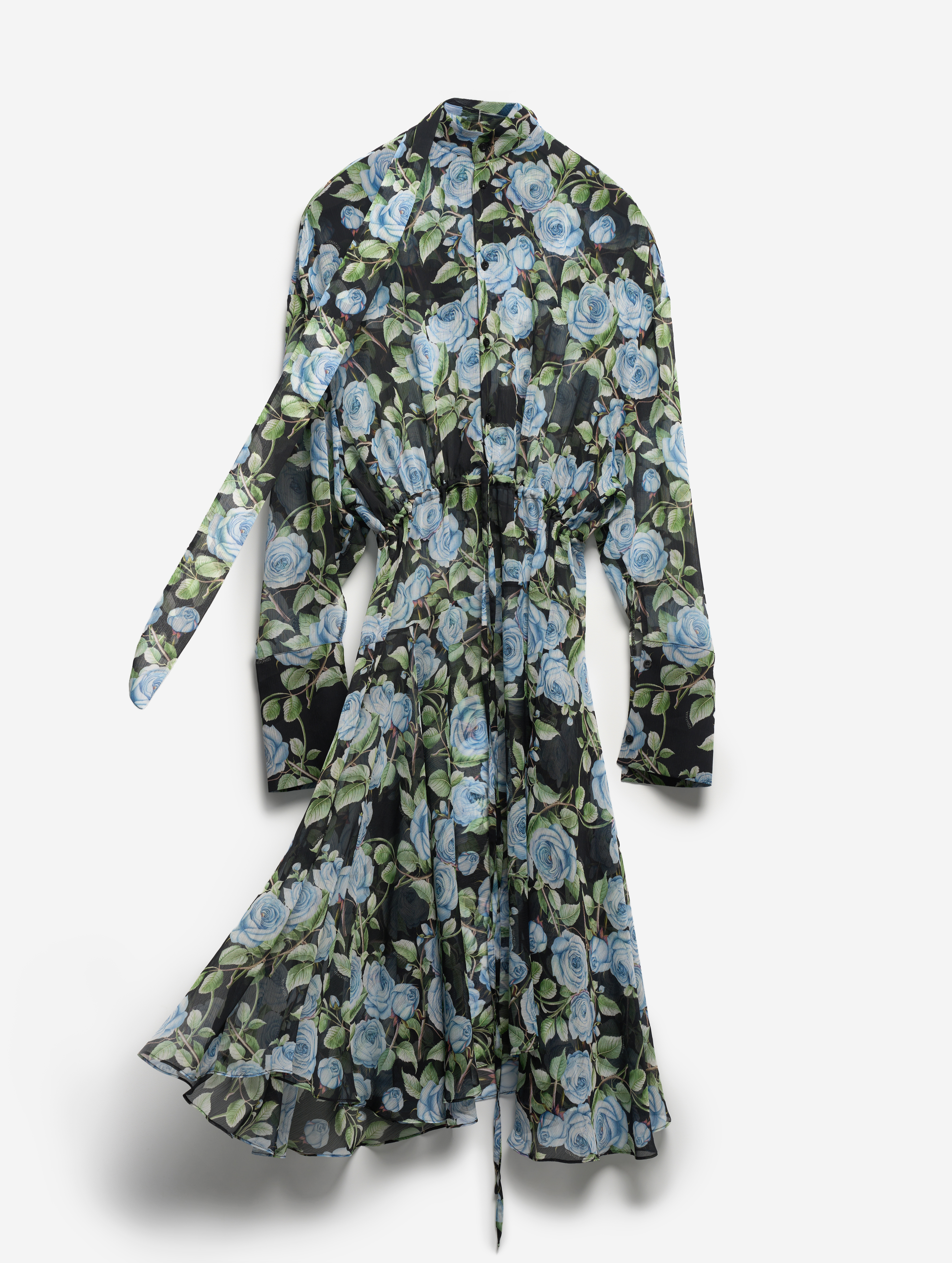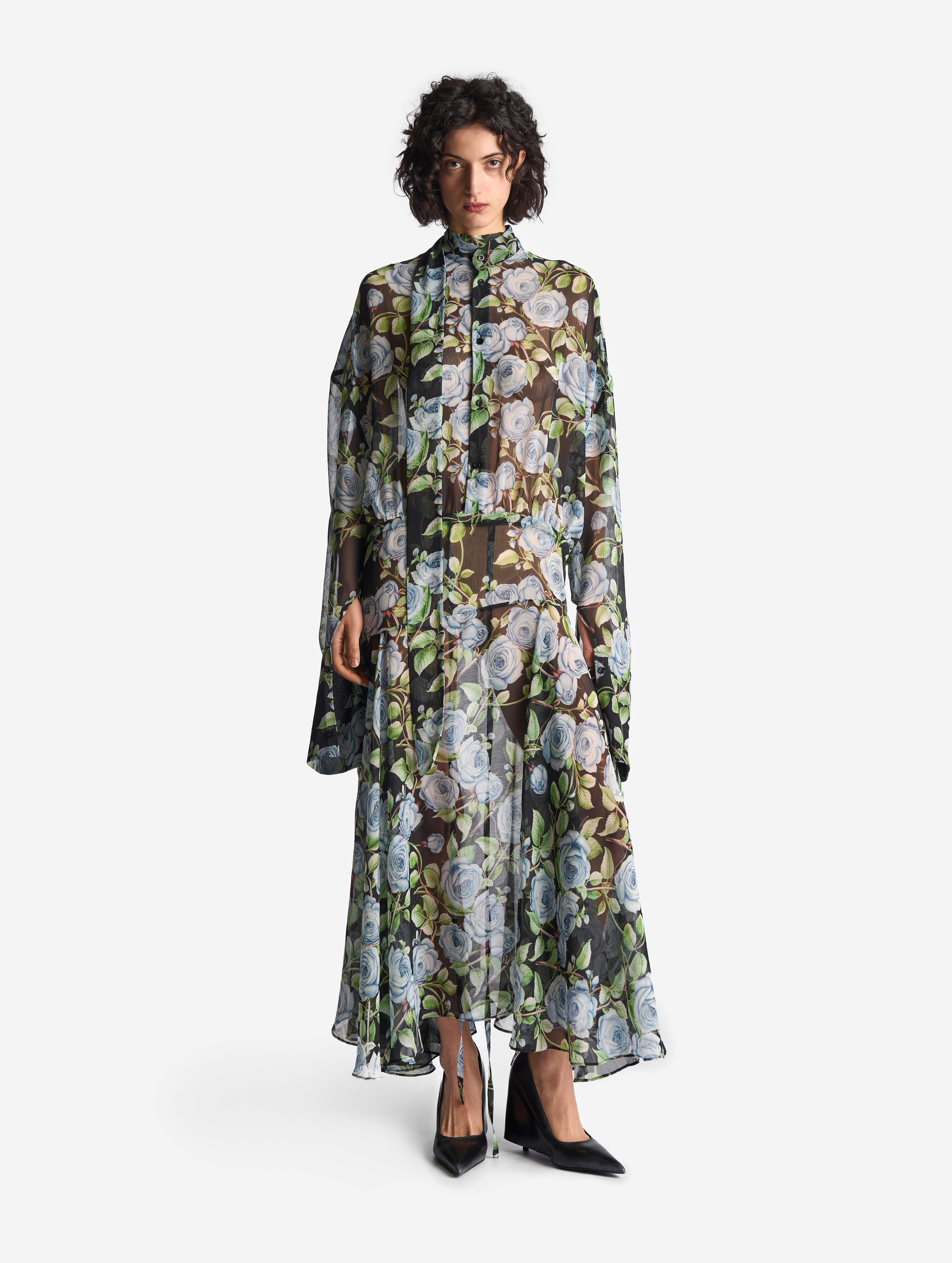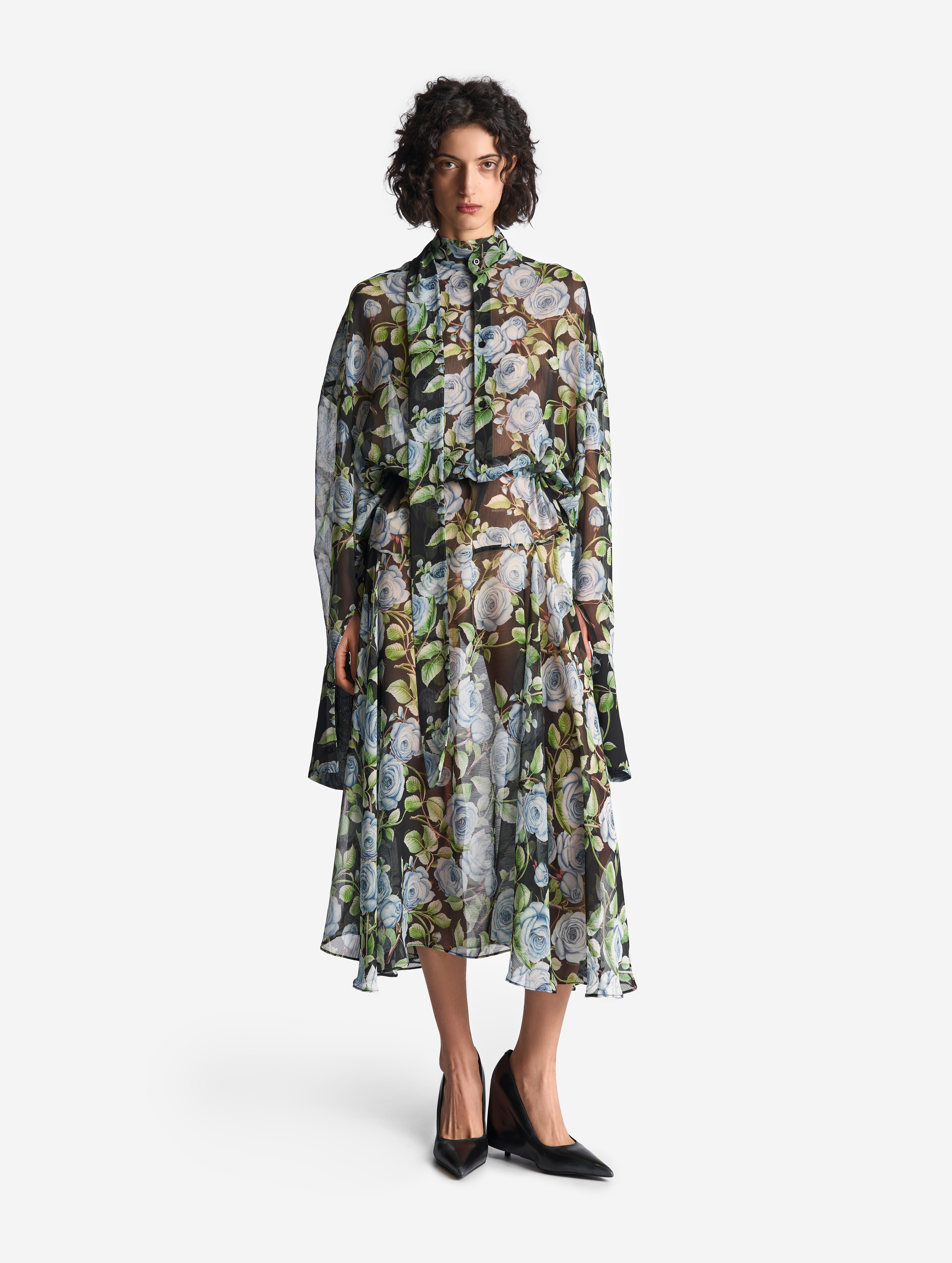 Свободное и струящееся, с воротником-стойкой, длинными широкими рукавами и асимметричной юбкой — это платье сядет на любую фигуру. Мы презентуем эту модель как трансформер: если завязать внутреннюю кулиску на талии или бедрах и скинуть верх платья, оно превратится в сложную юбку. Одна сторона воротника переходит в длинную ленту — ее можно оставить свободно развеваться или продеть сквозь незаметную прорезь, перекинув через плечо (на манер легкого шарфа). Изделие, как и манжеты, застегивается на пуговицы.