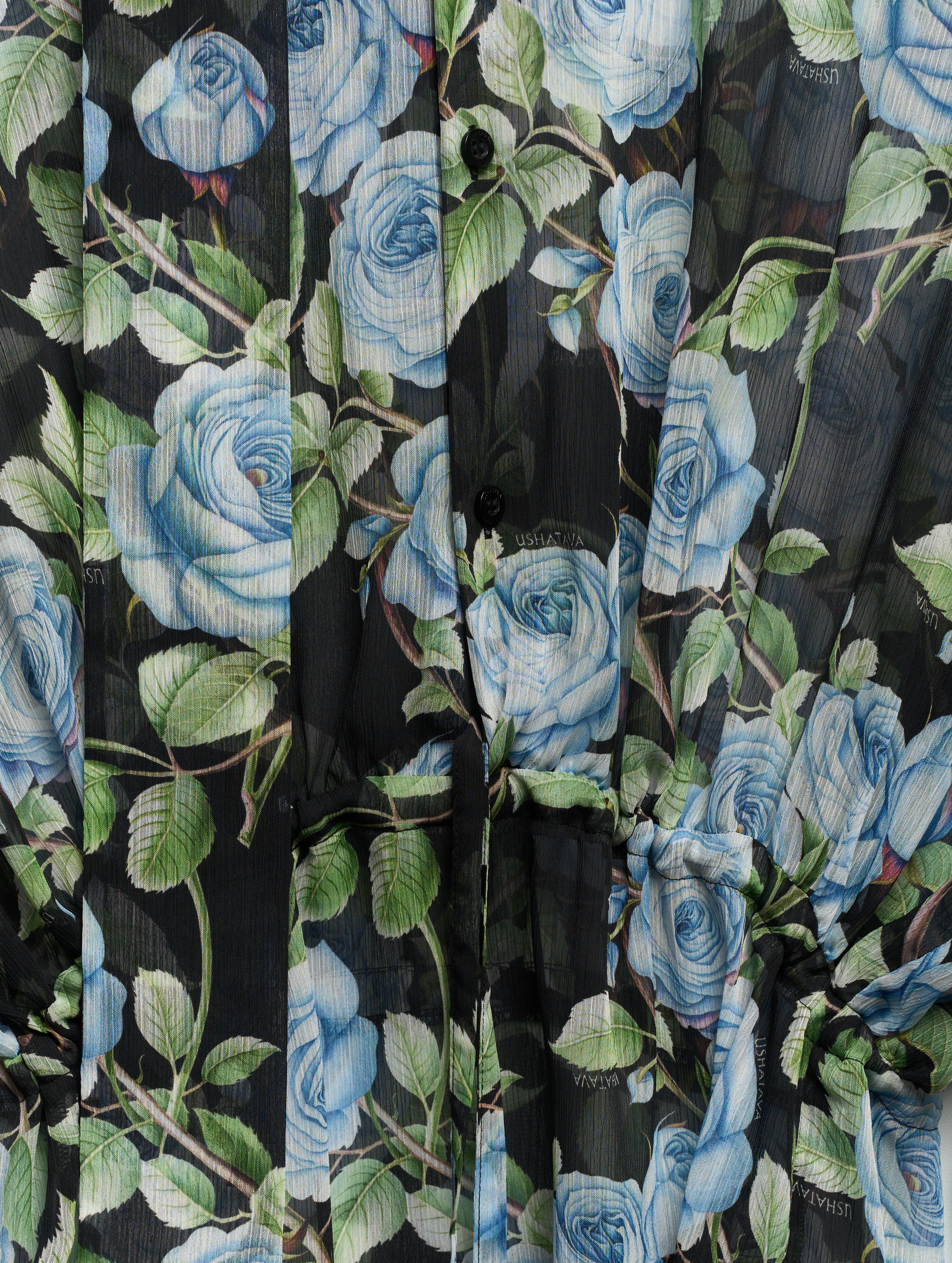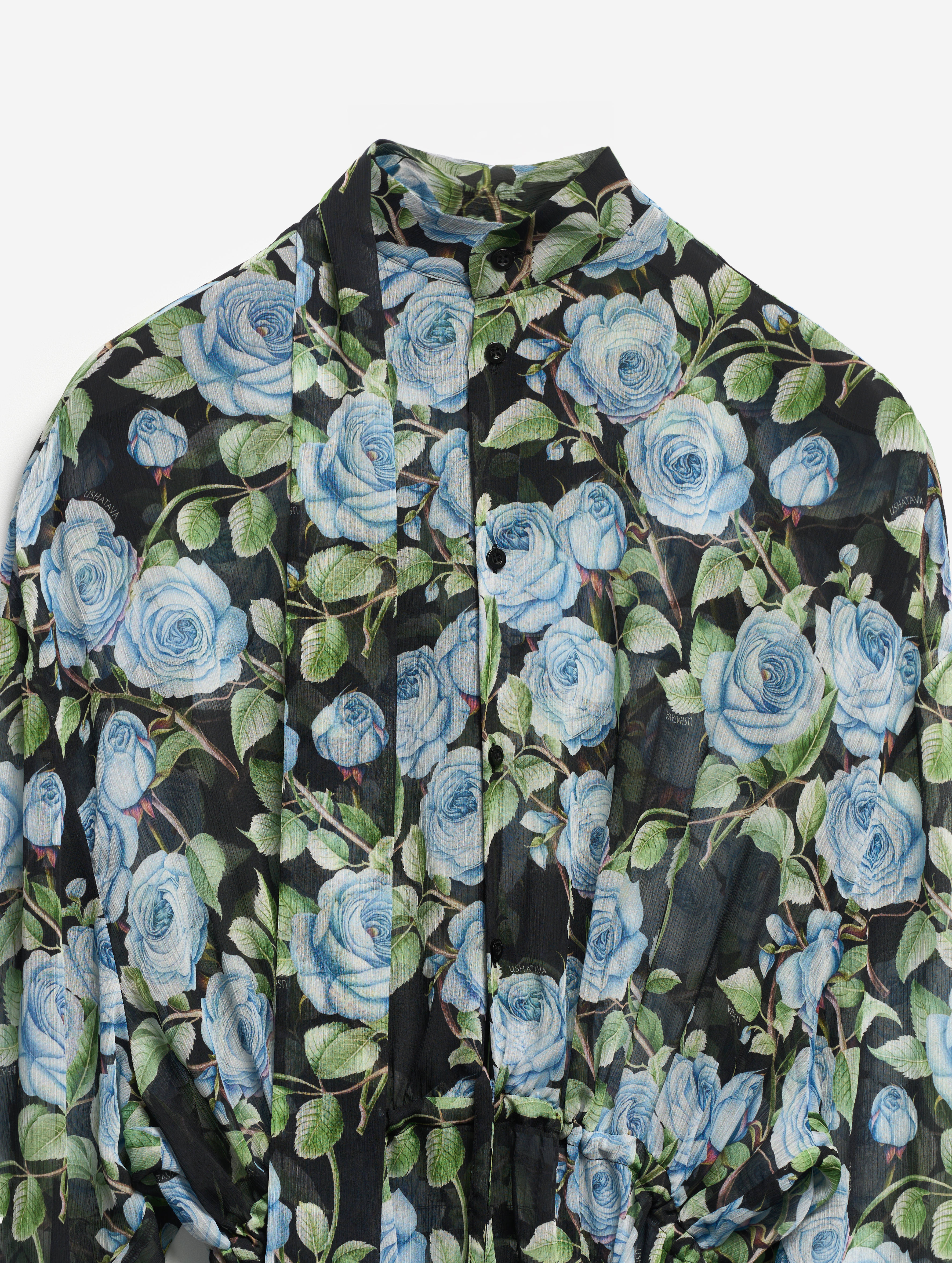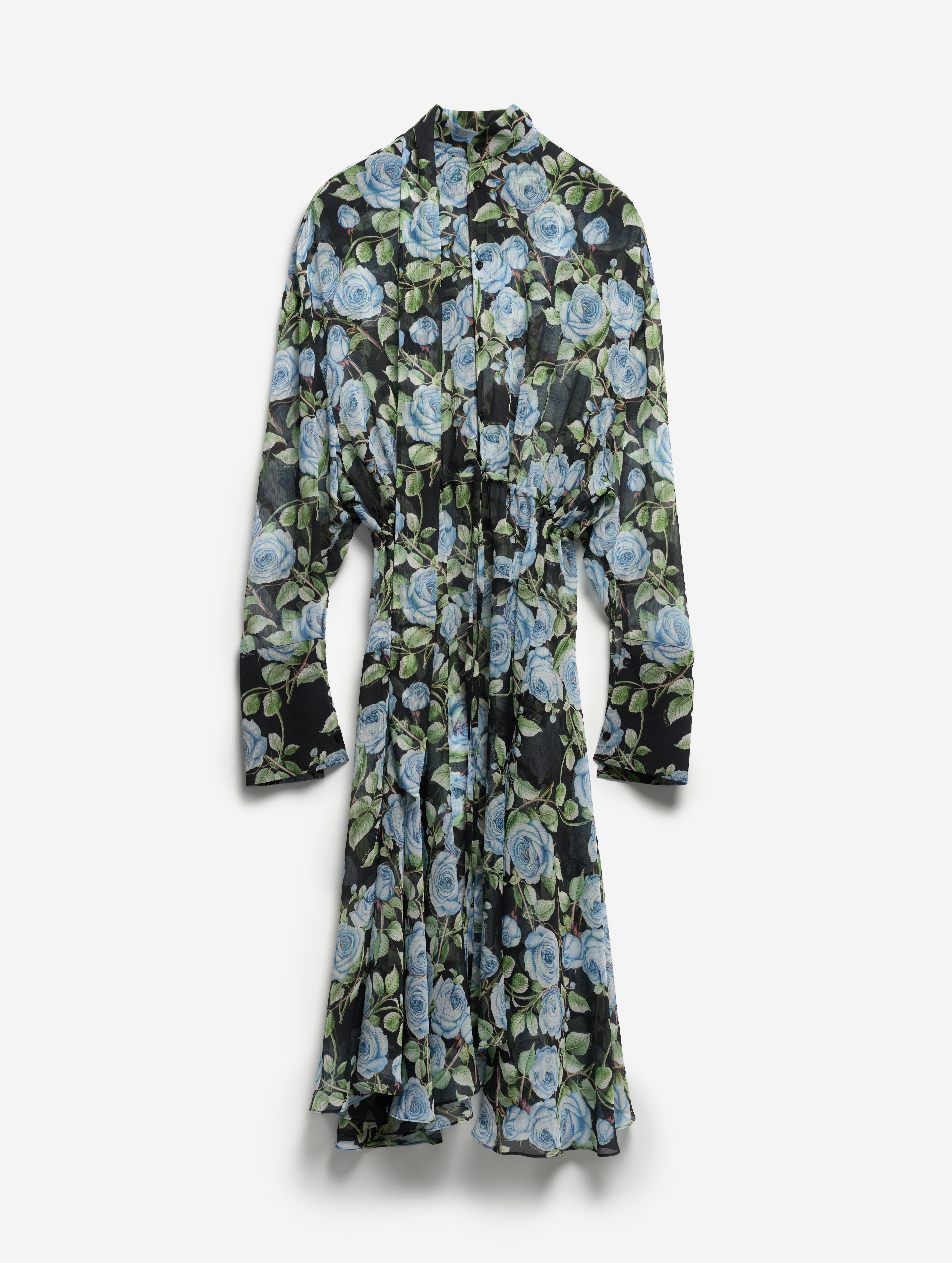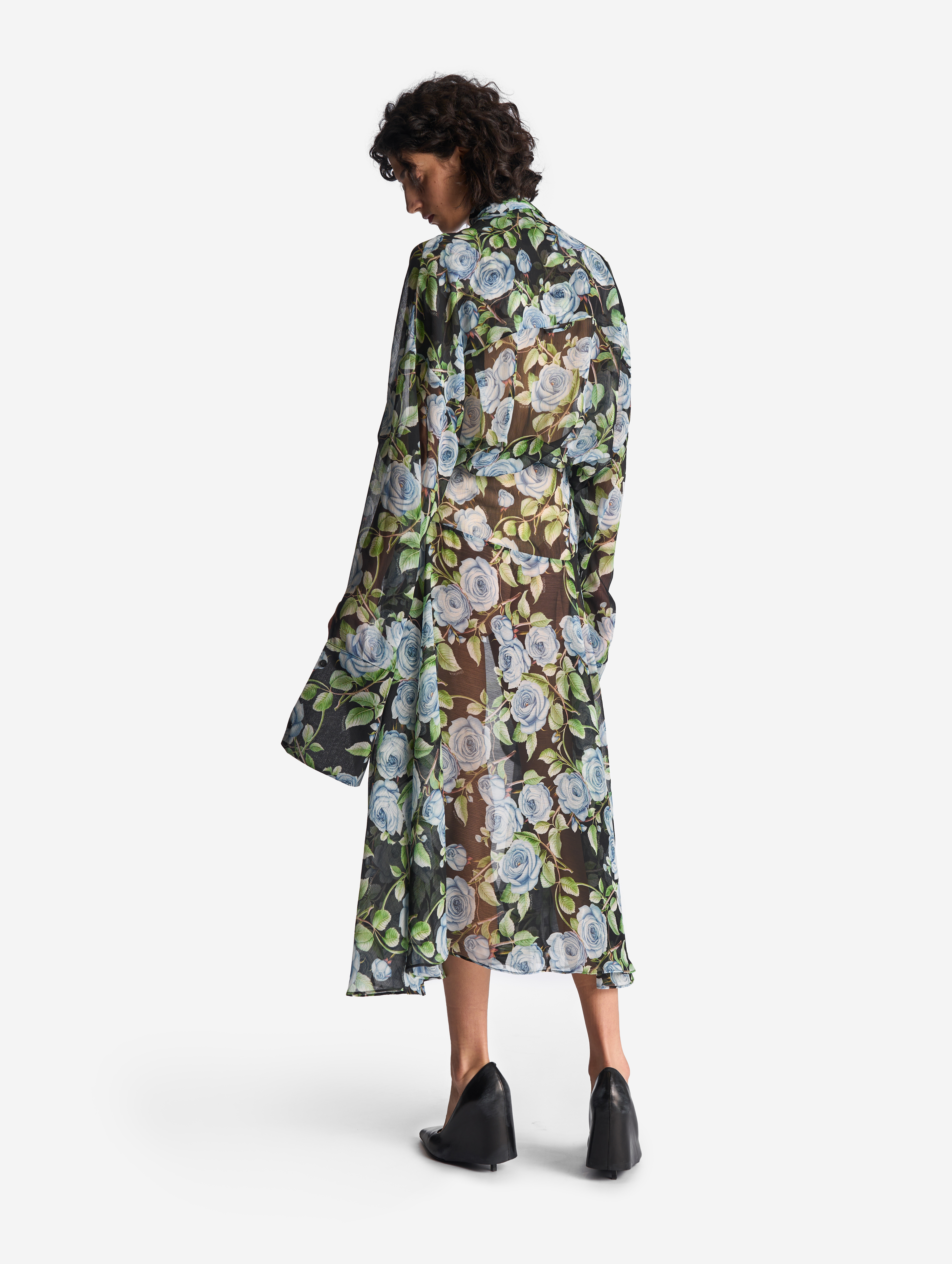 Свободное и струящееся, с воротником-стойкой, длинными широкими рукавами и асимметричной юбкой — это платье сядет на любую фигуру. Мы презентуем эту модель как трансформер: если завязать внутреннюю кулиску на талии или бедрах и скинуть верх платья, оно превратится в сложную юбку. Одна сторона воротника переходит в длинную ленту — ее можно оставить свободно развеваться или продеть сквозь незаметную прорезь, перекинув через плечо (на манер легкого шарфа). Изделие, как и манжеты, застегивается на пуговицы.