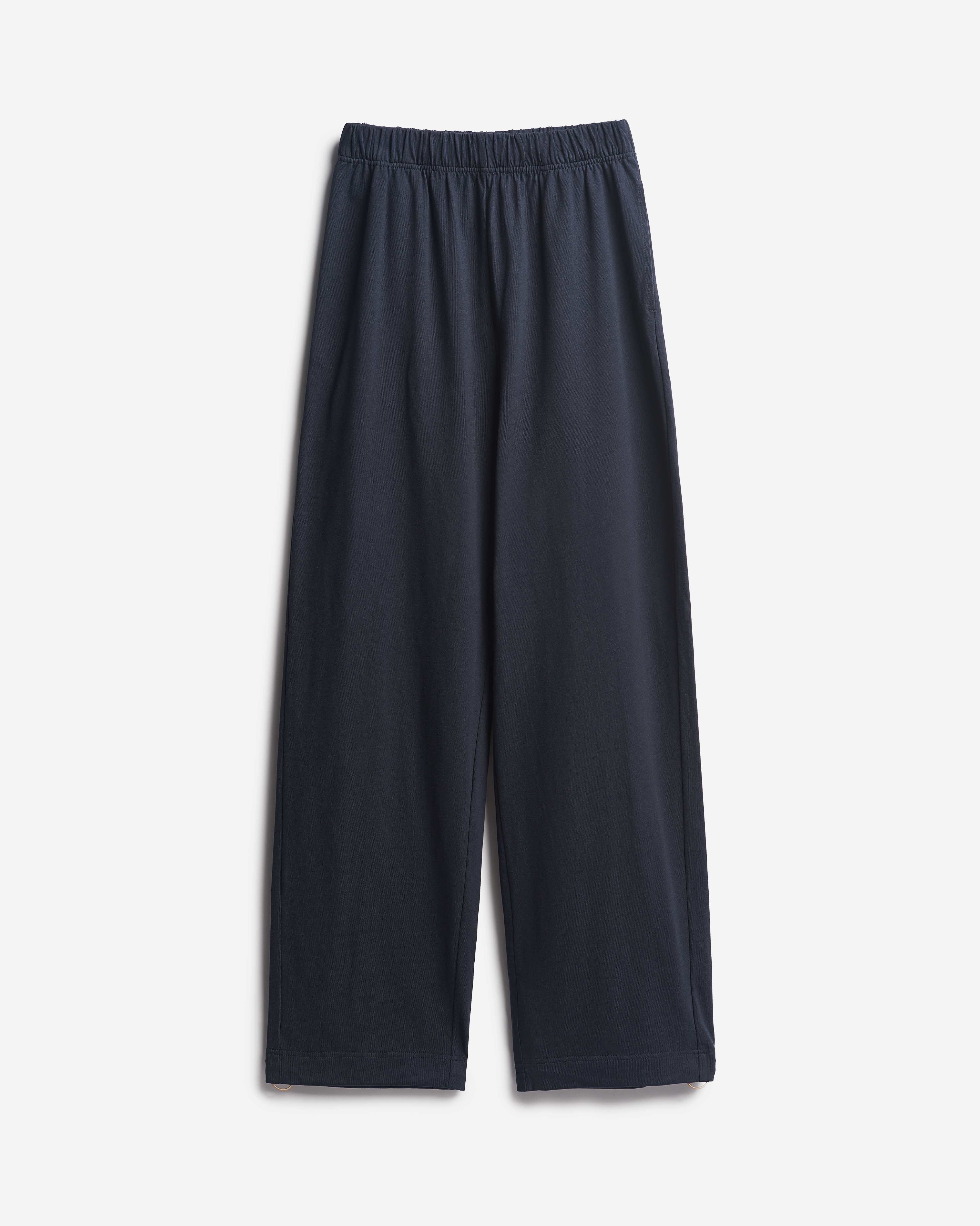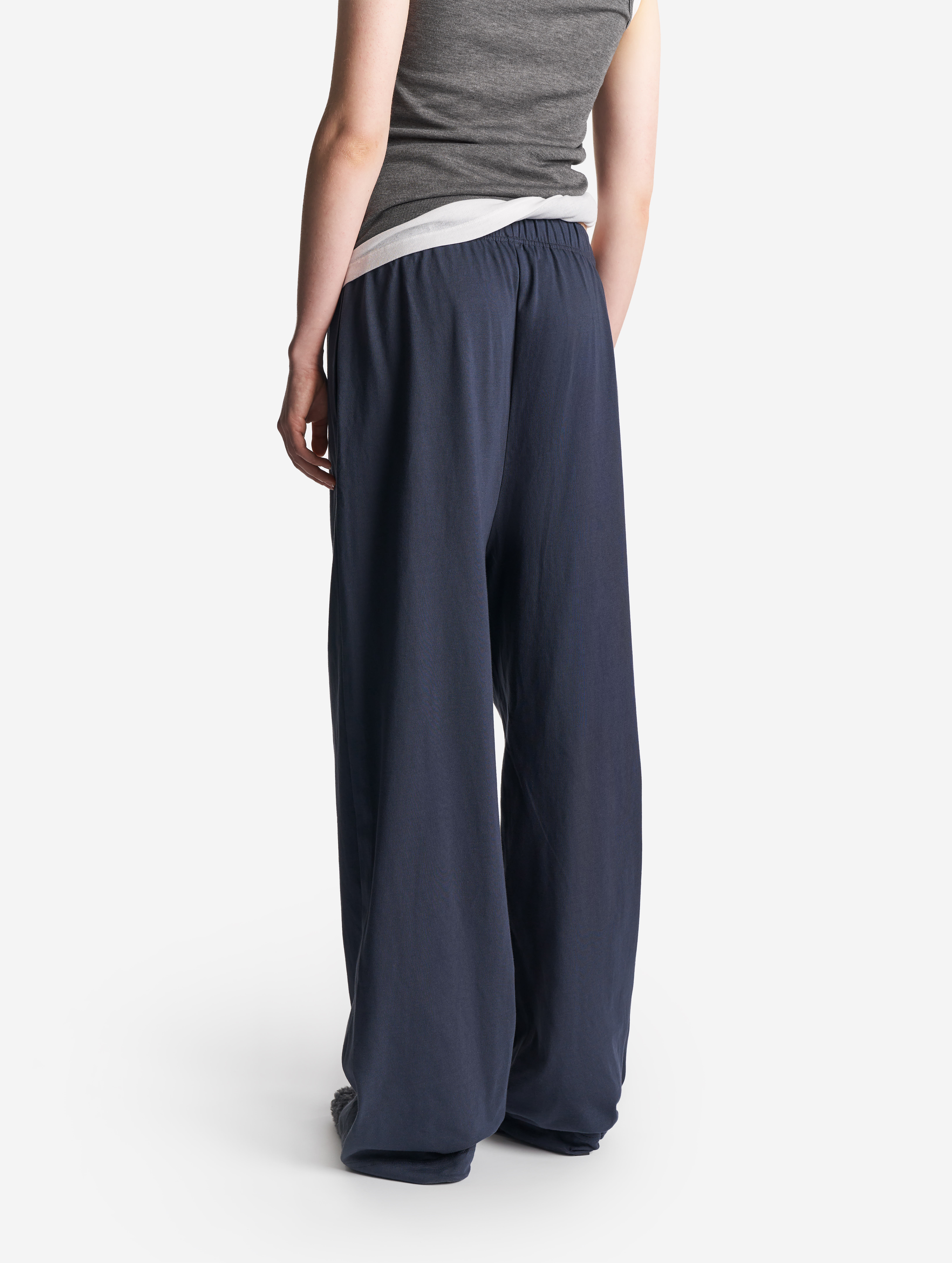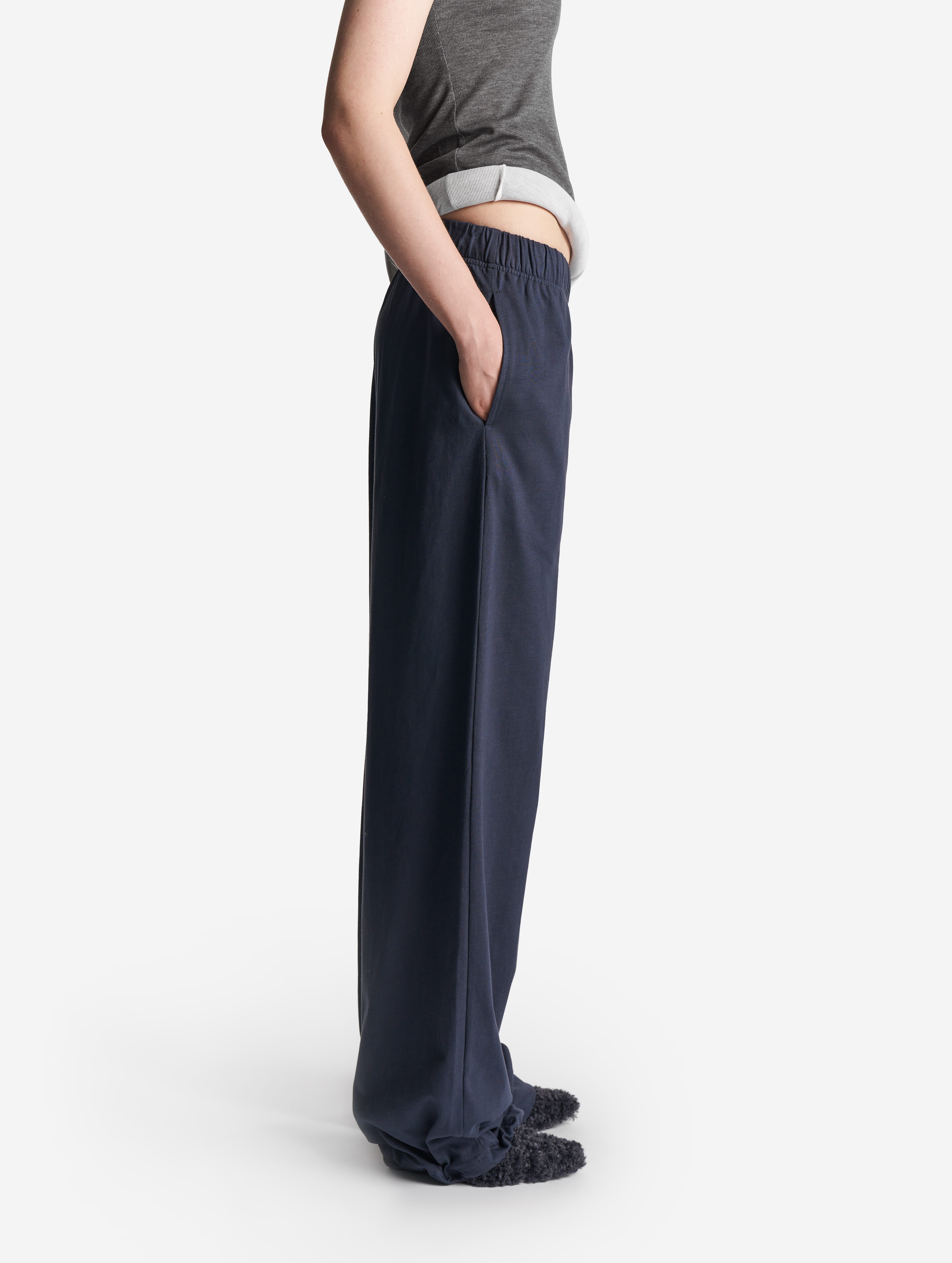 У этих брюк свободная универсальная посадка: они рассчитаны как на женскую, так и на мужскую фигуру. Их длину можно регулировать — для этого низ брючин обработан резинкой со стоппером. Есть два глубоких кармана. Пояс на широкой эластичной резинке, а для дополнительной фиксации посадки предусмотрен шнурок, который завязывается с внутренней стороны.