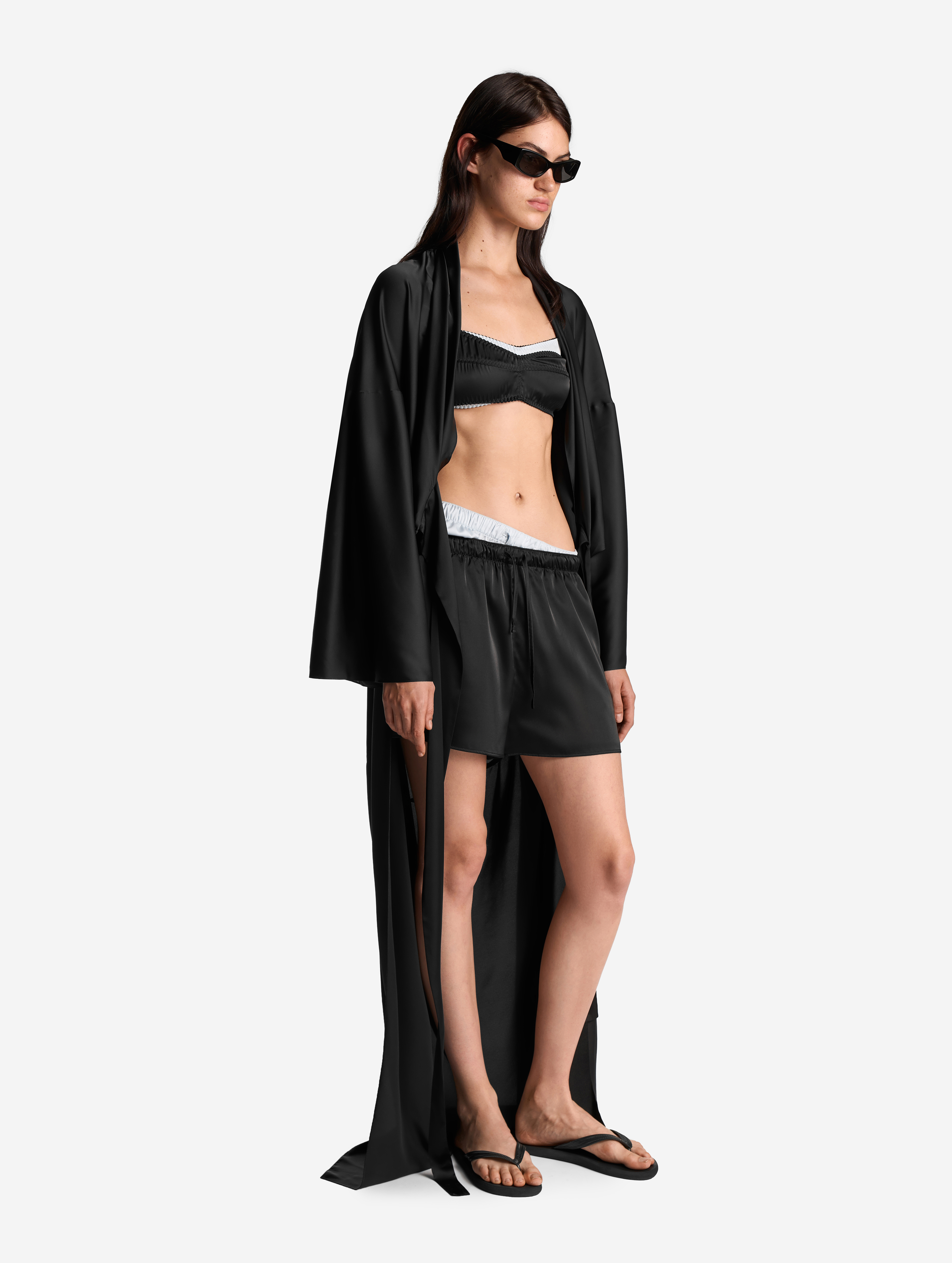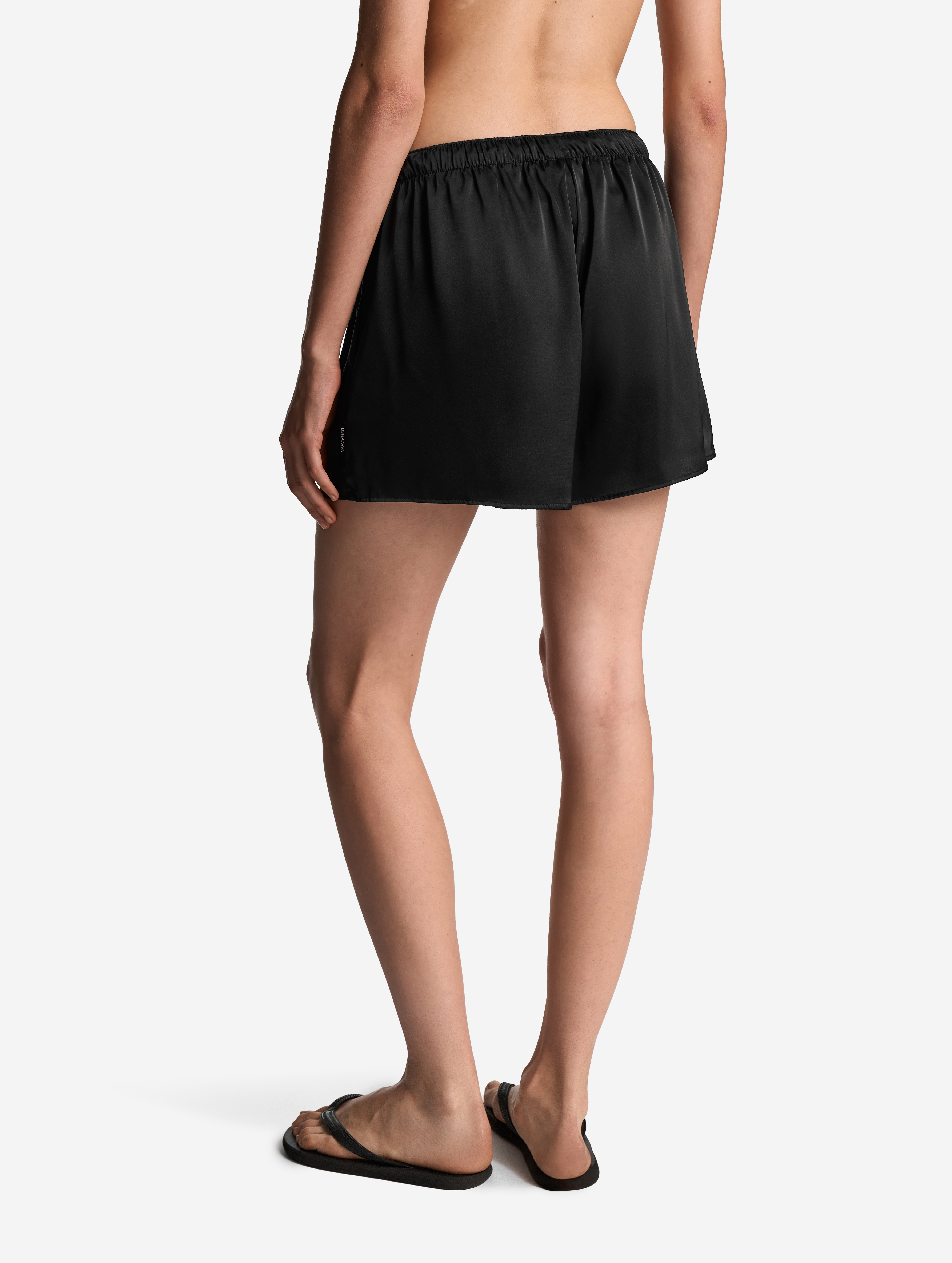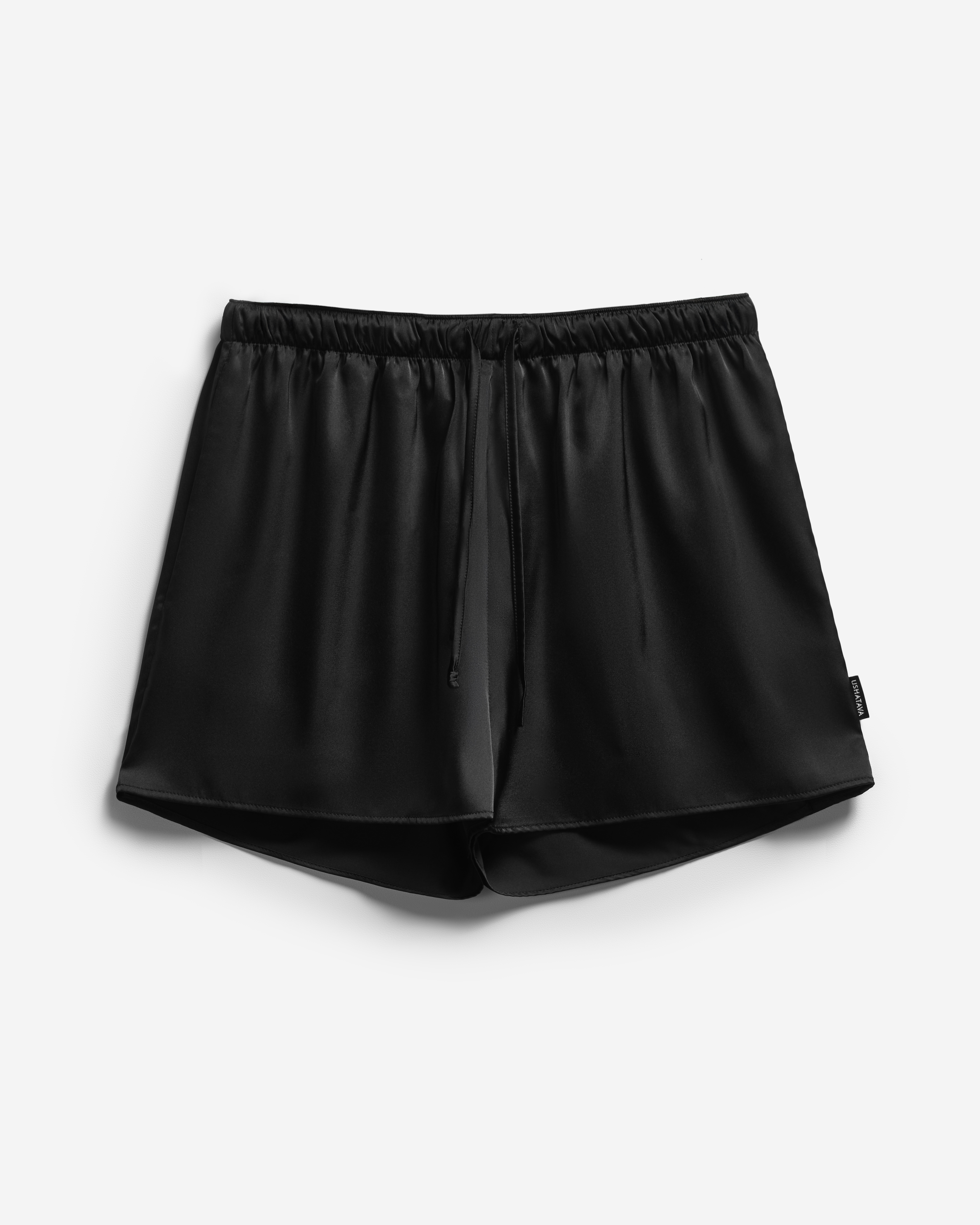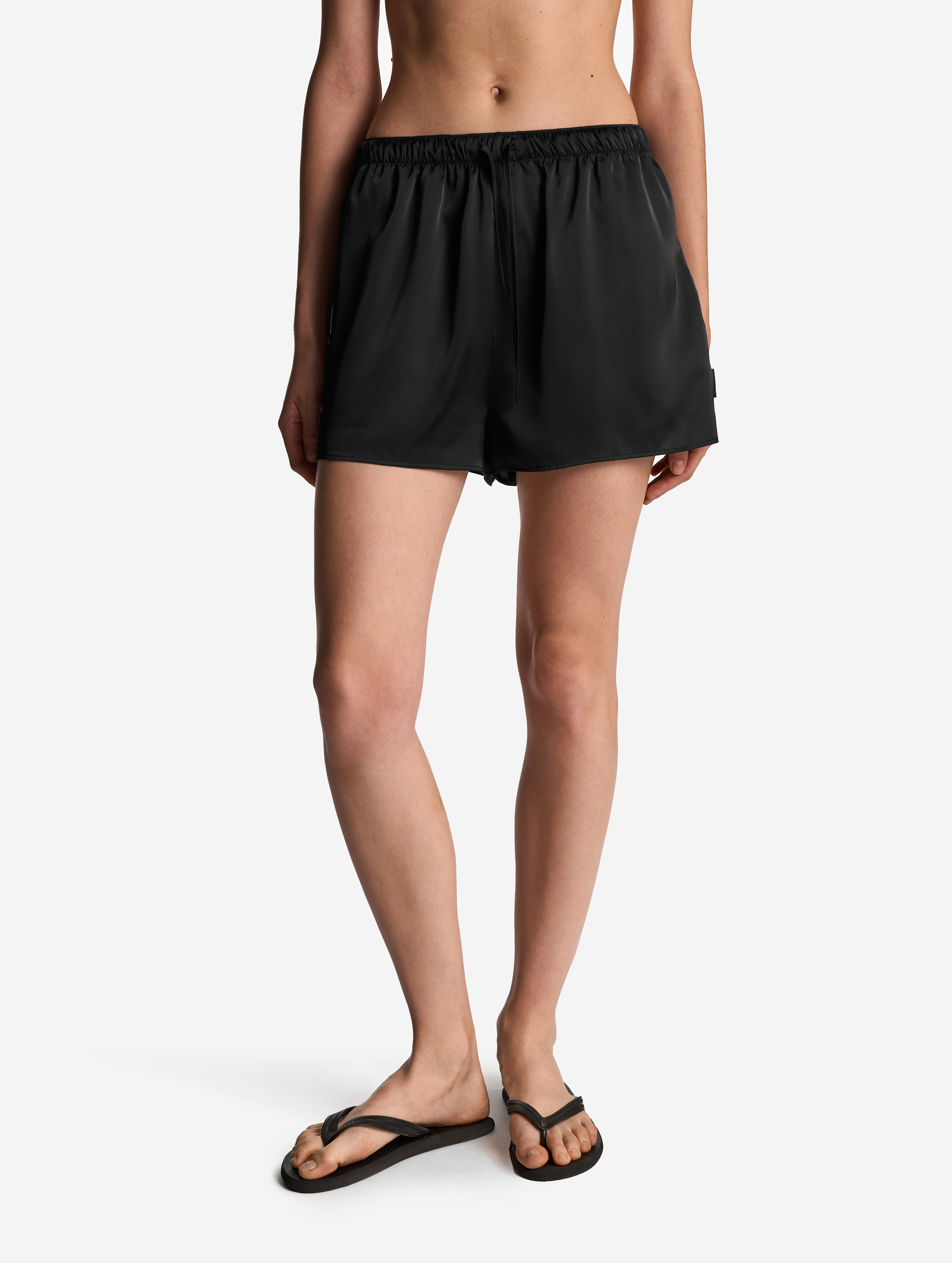 Свободные шорты выполнены из нежного, струящегося сатина. У изделия длина мини и универсальная посадка. Для дополнительной фиксации модели предусмотрен тканевый шнурок, протянутый с внешней стороны пояса. Есть два боковых кармана.