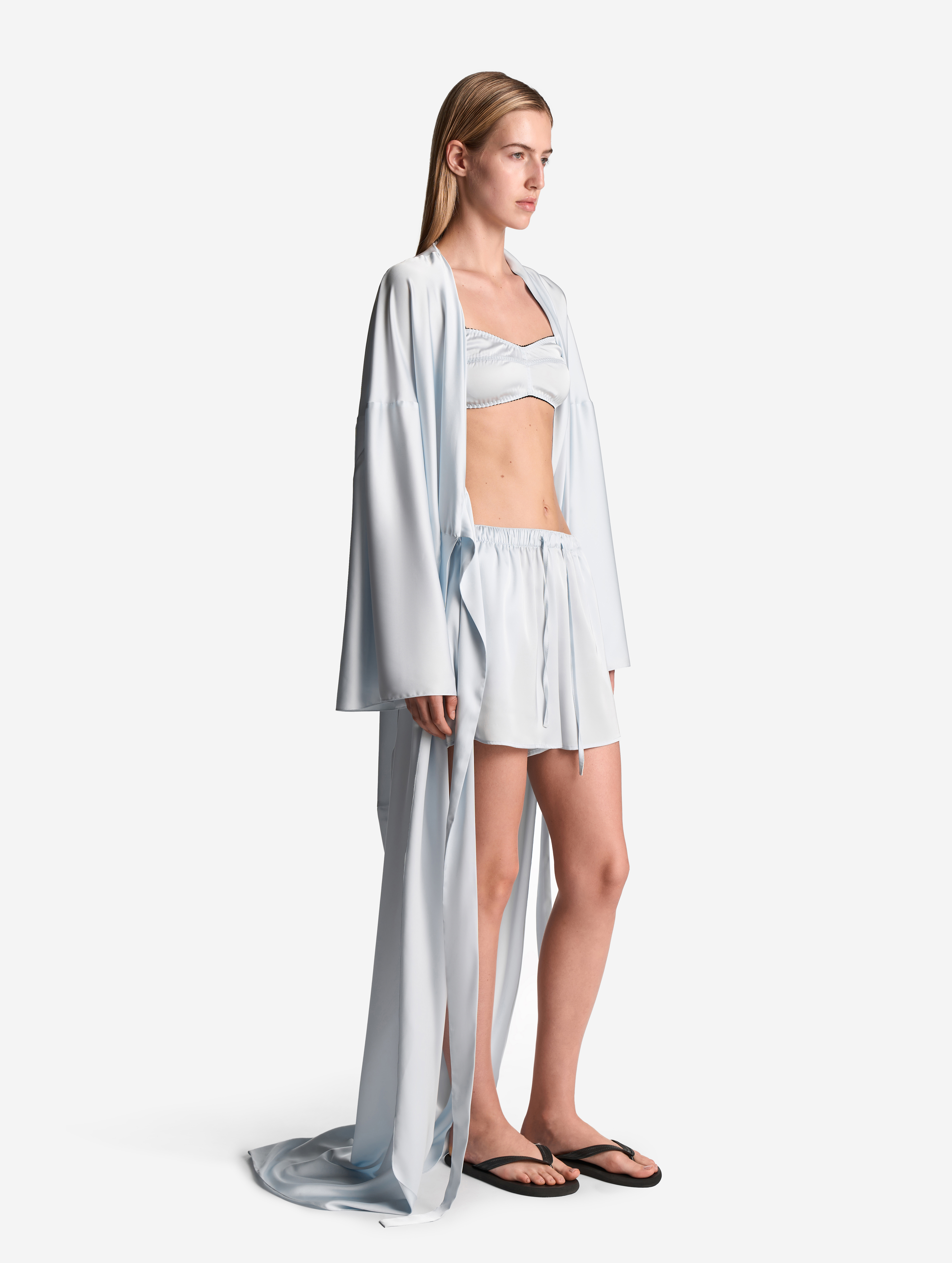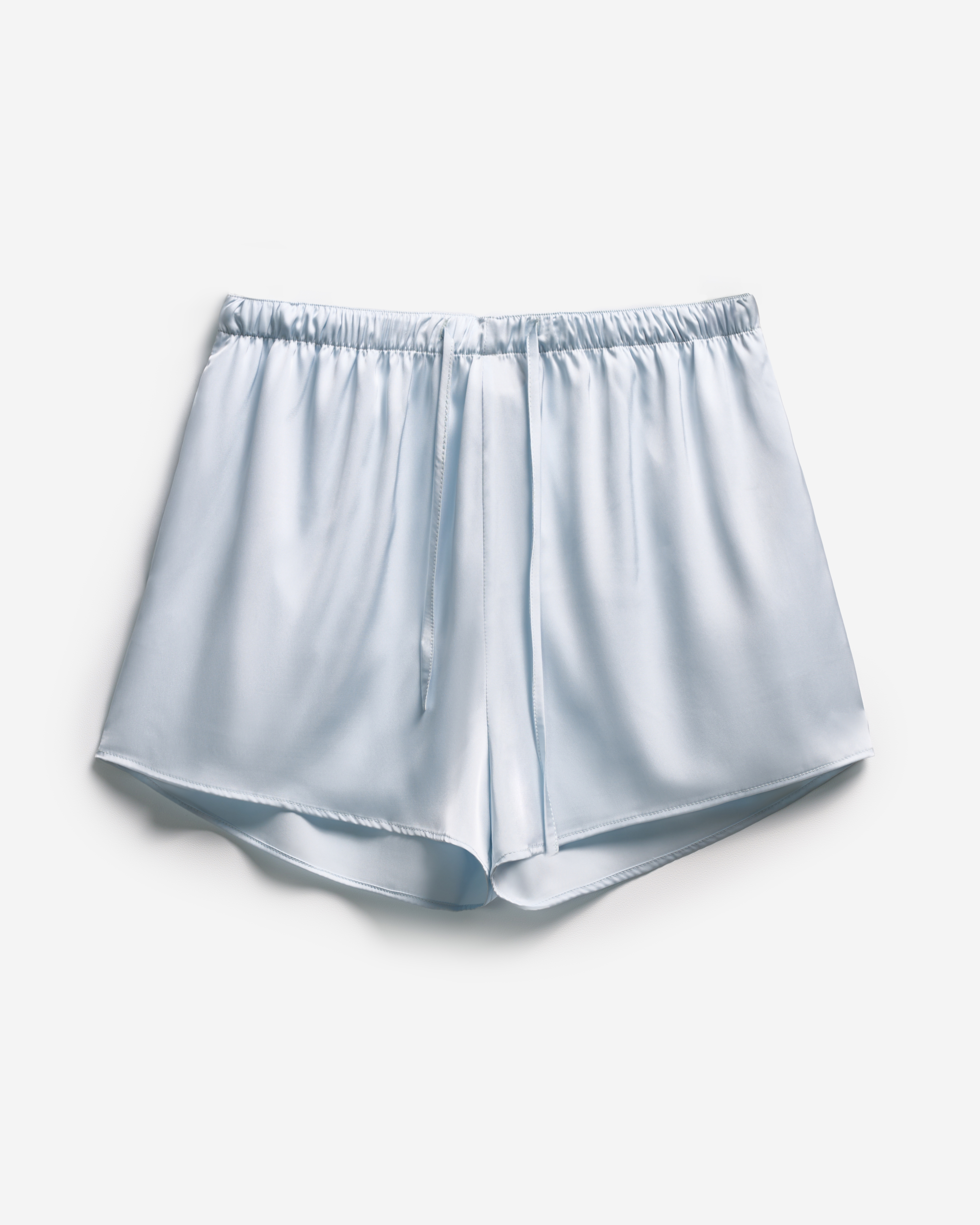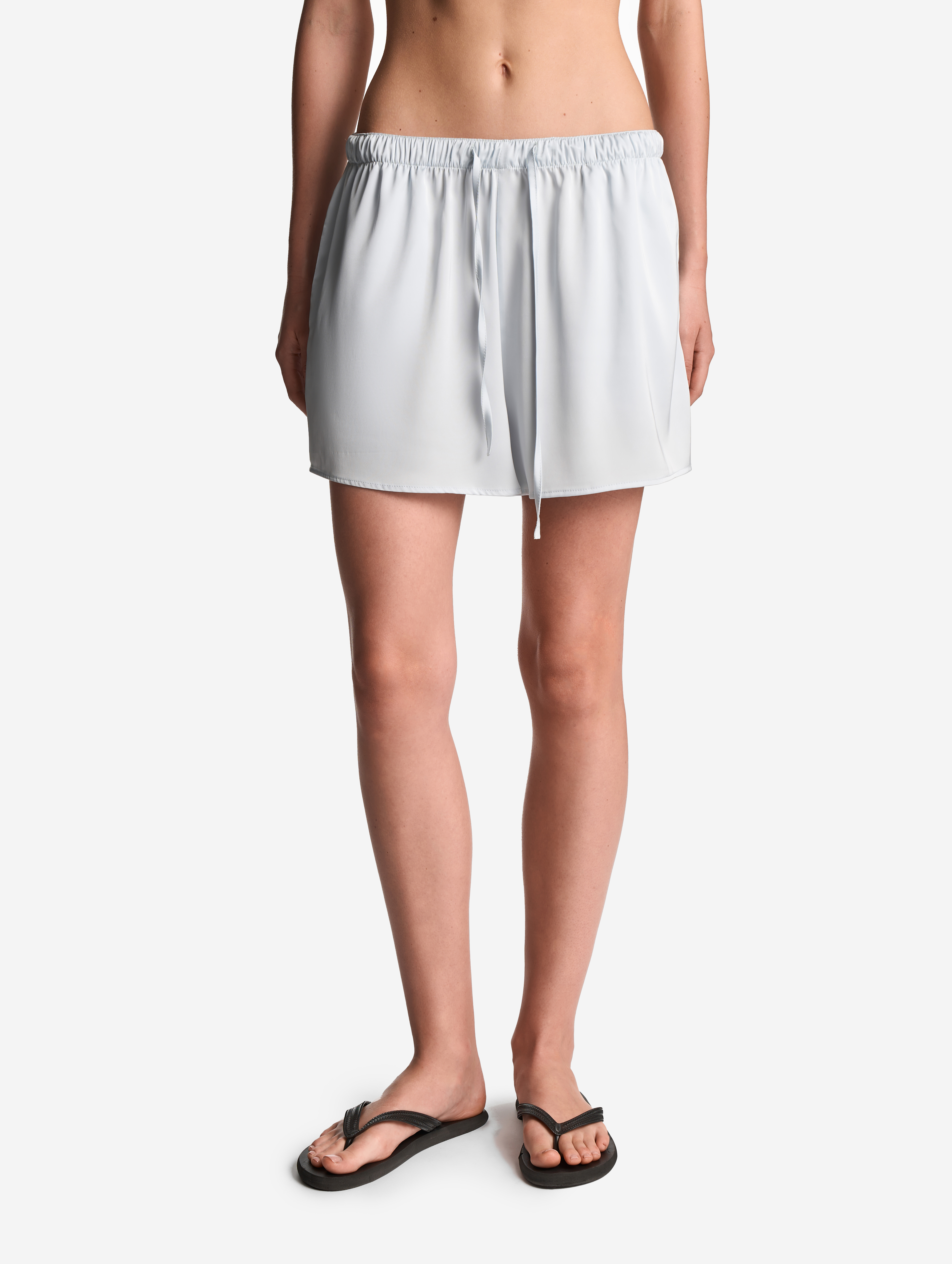 Свободные шорты выполнены из нежного, струящегося сатина. У изделия длина мини и универсальная посадка. Для дополнительной фиксации модели предусмотрен тканевый шнурок, протянутый с внешней стороны пояса. Есть два боковых кармана.