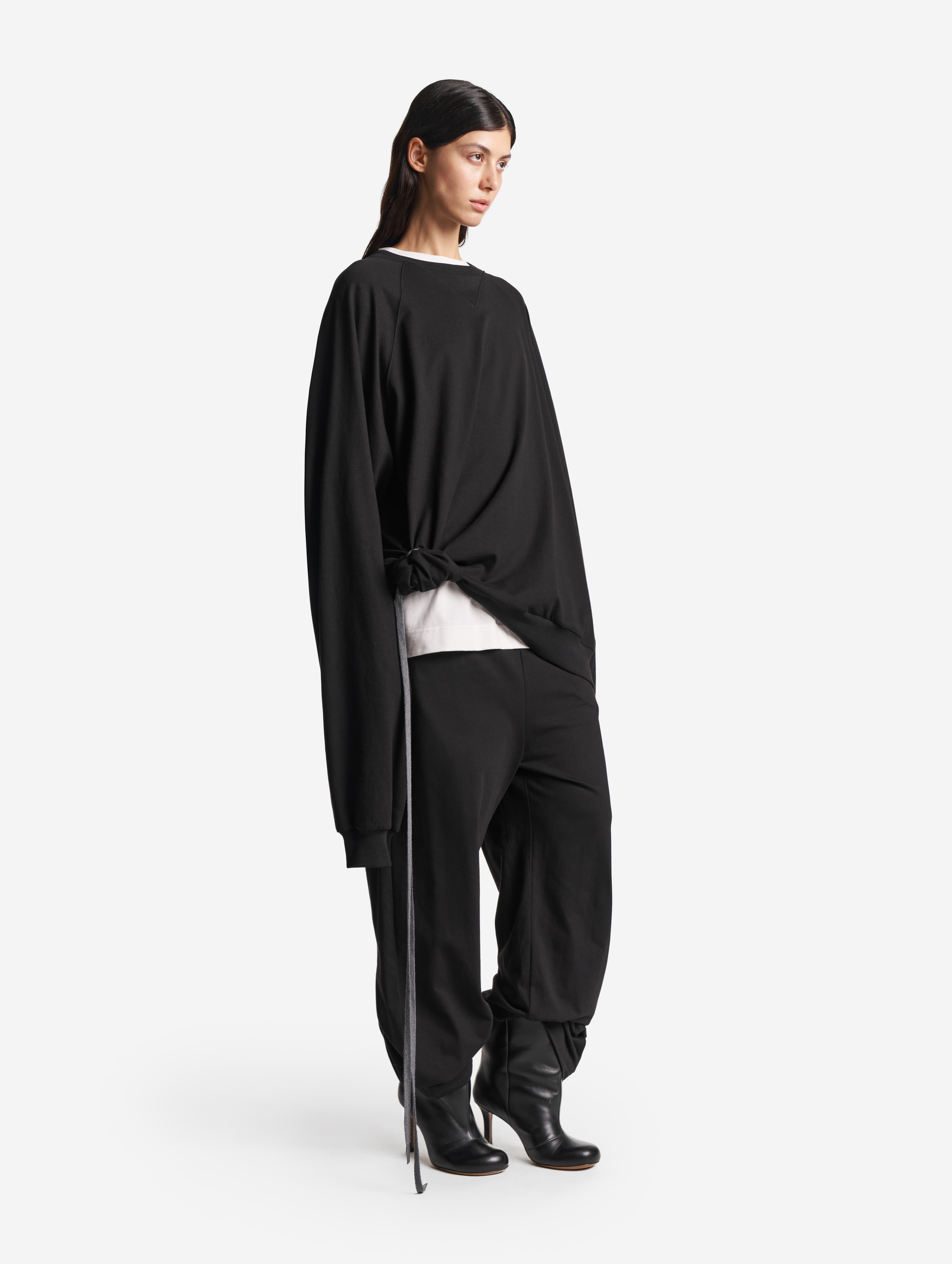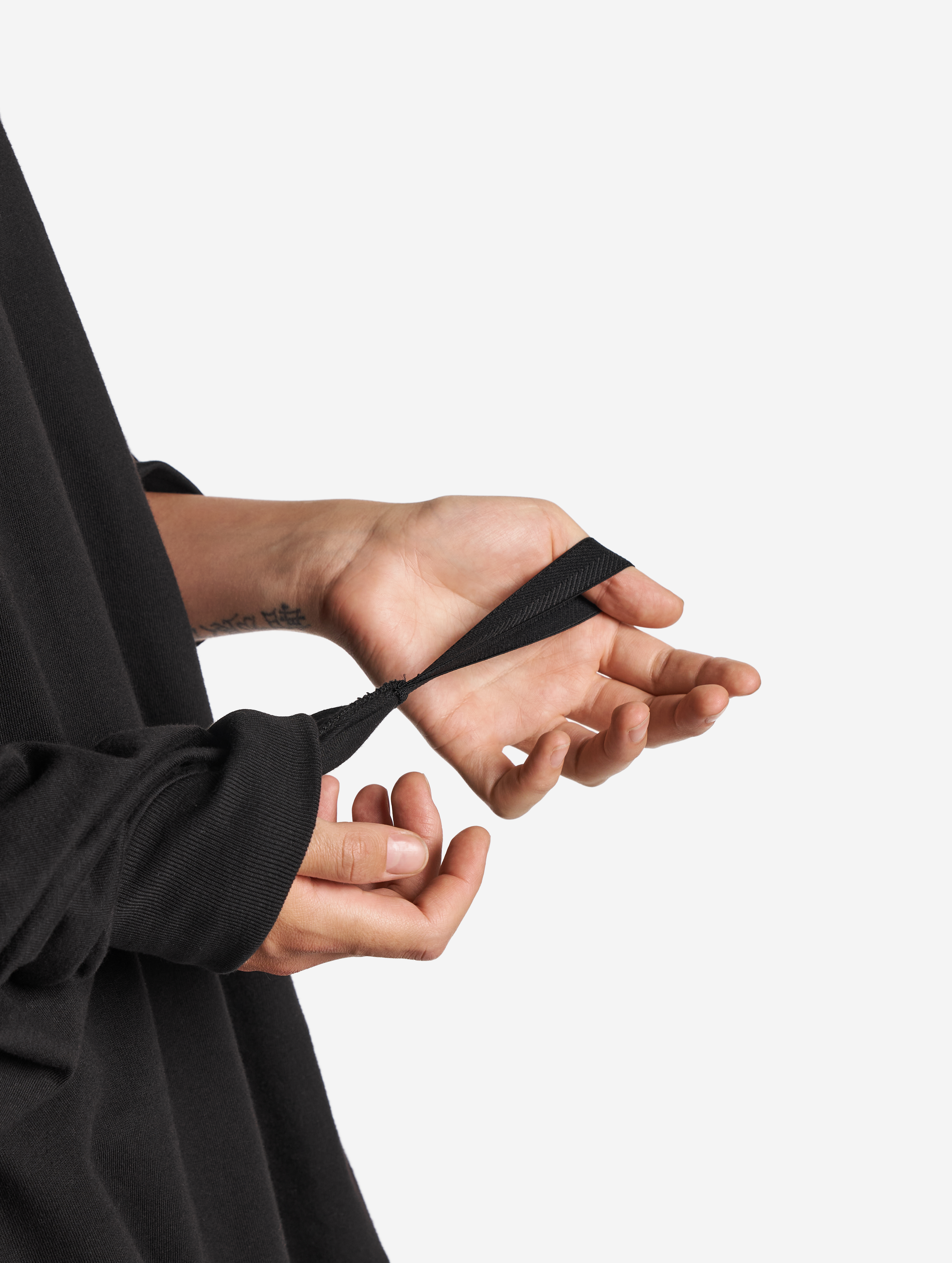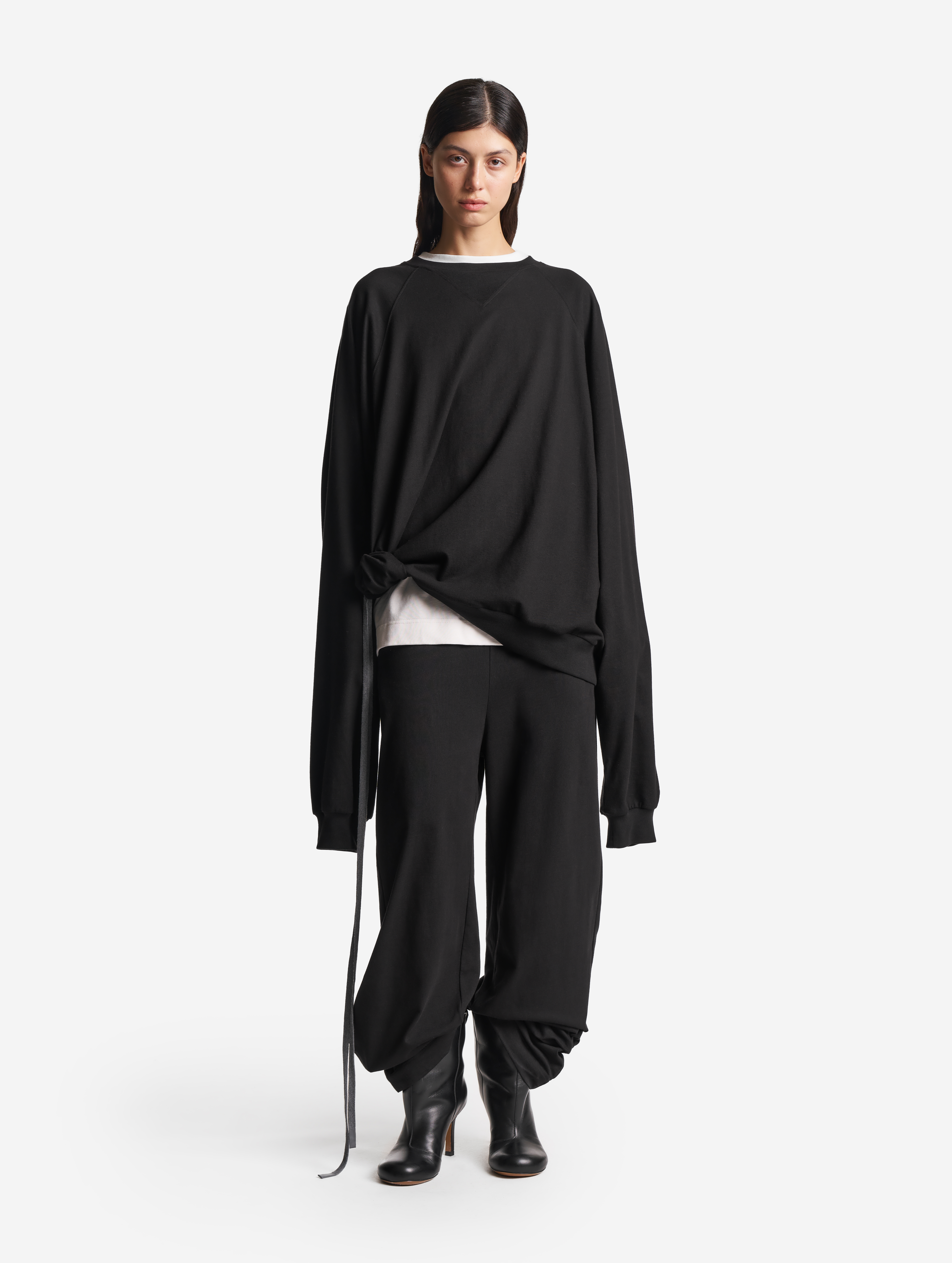 Свитшот оверсайз-силуэта. К внутреннему шву экстрадлинных рукавов пришиты тонкие резинки — если надеть их на руку, ткань соберется в мягкие складки, а рукава уменьшаться в длине. Горловина, манжеты и пояс обработаны рибаной в цвет ткани.