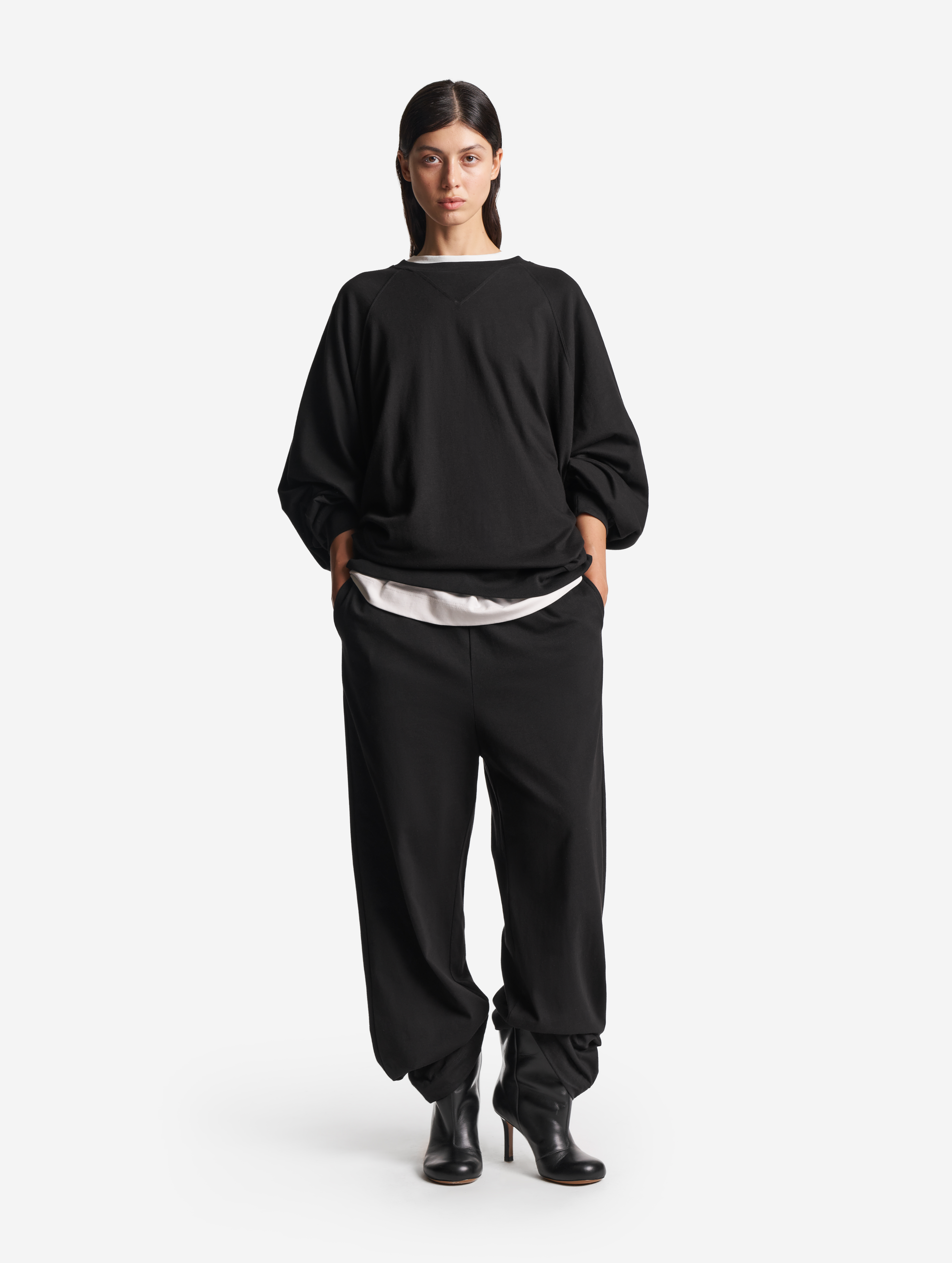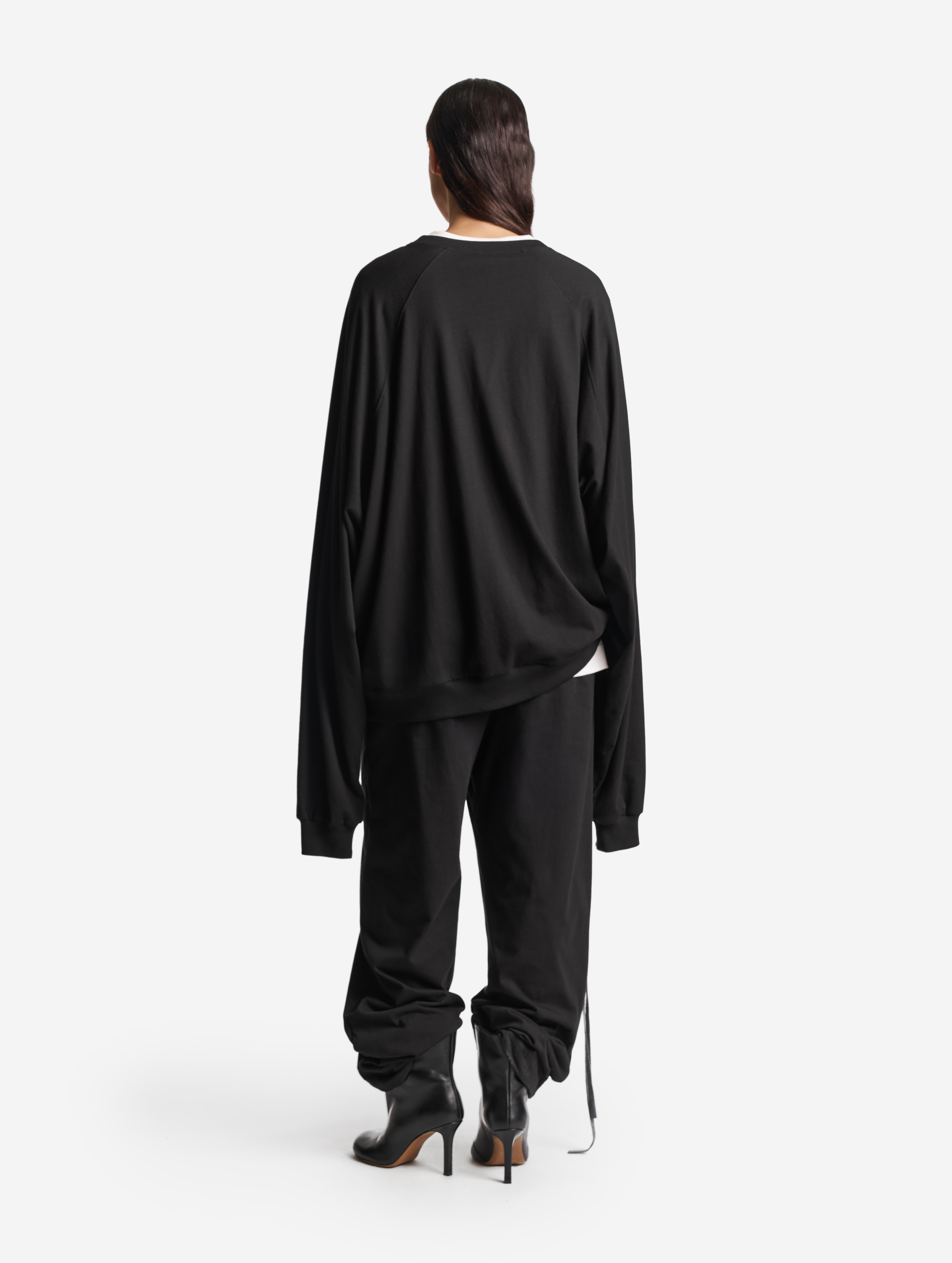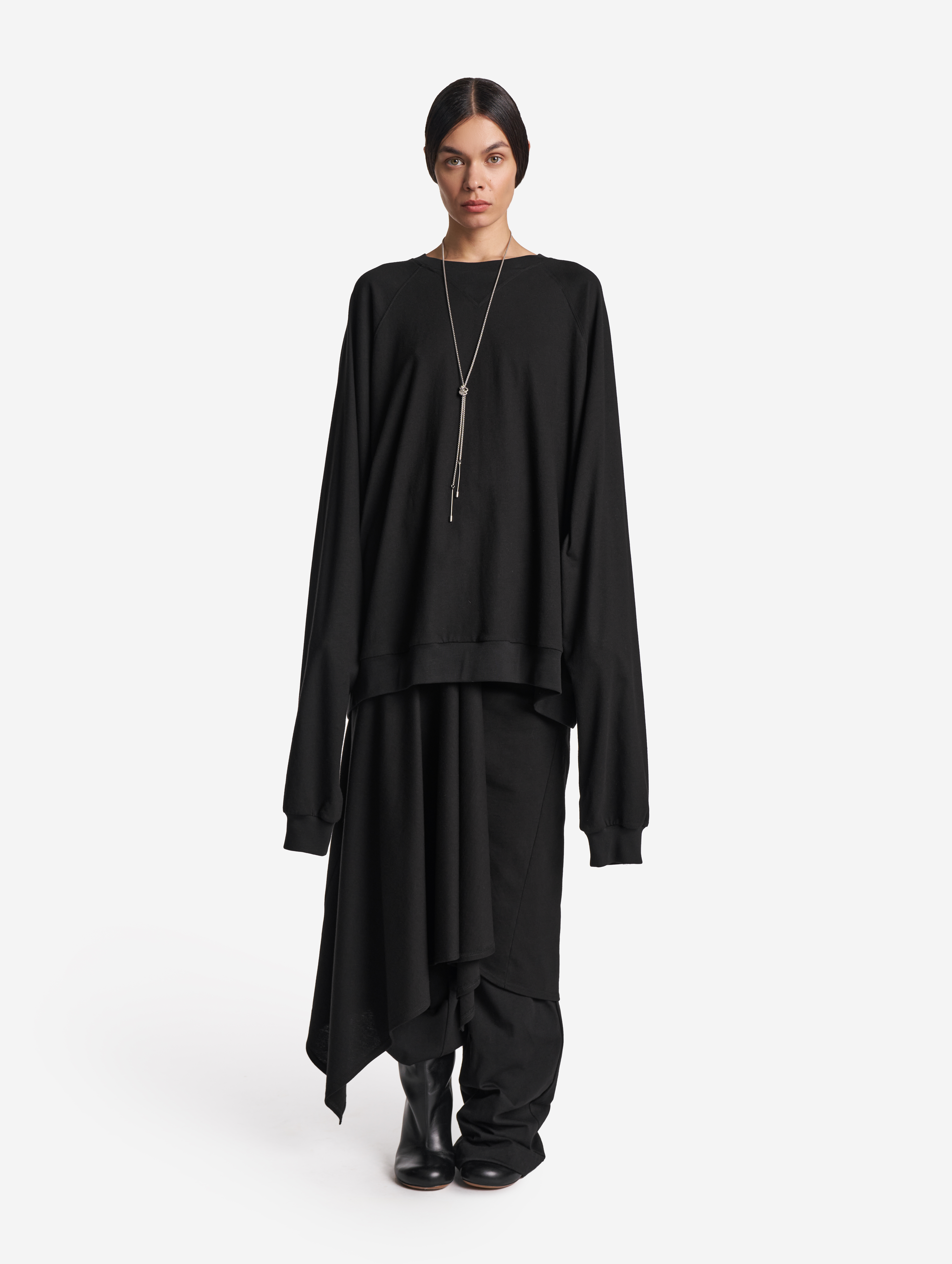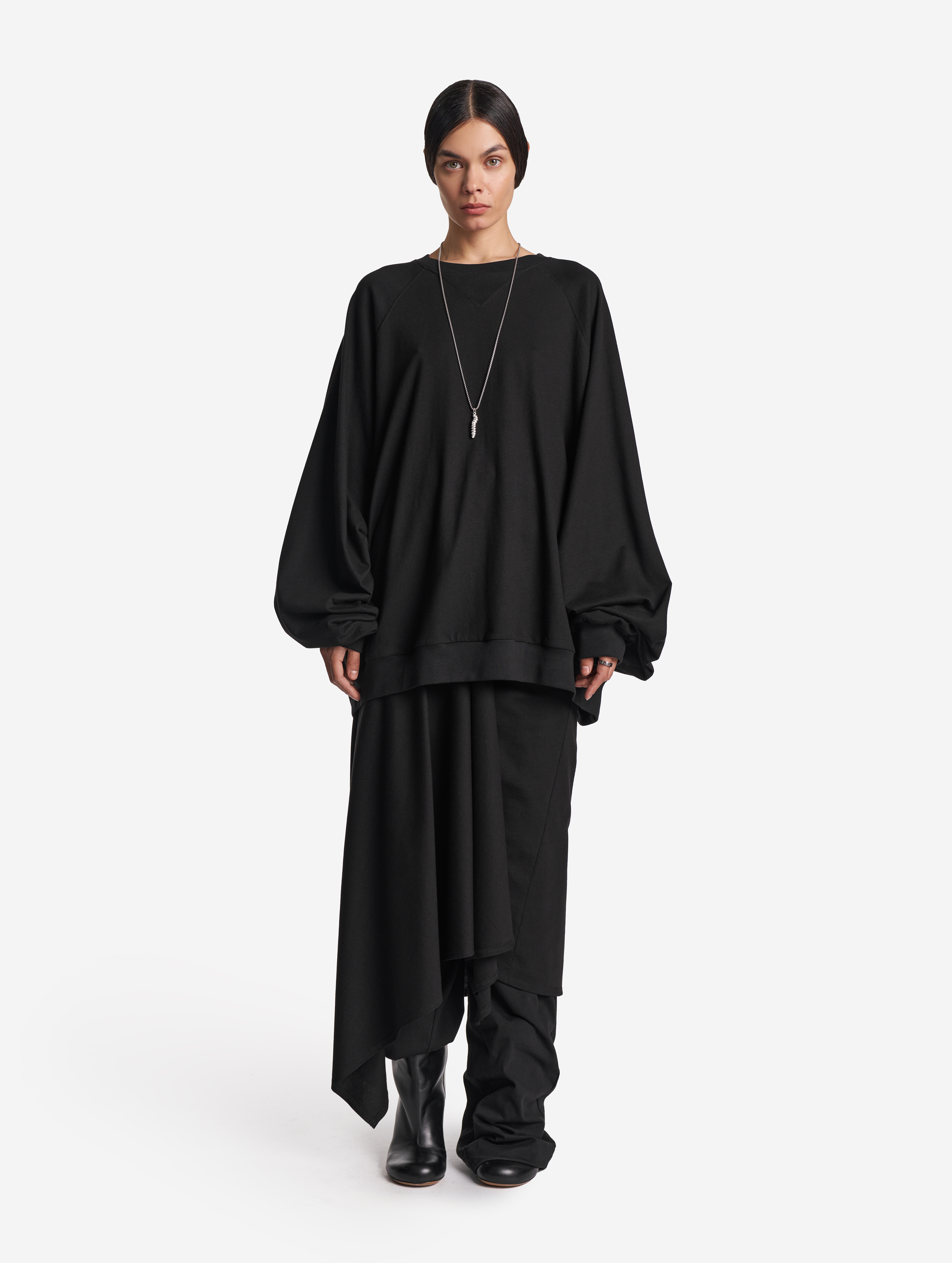 Свитшот оверсайз-силуэта. К внутреннему шву экстрадлинных рукавов пришиты тонкие резинки — если надеть их на руку, ткань соберется в мягкие складки, а рукава уменьшаться в длине. Горловина, манжеты и пояс обработаны рибаной в цвет ткани.