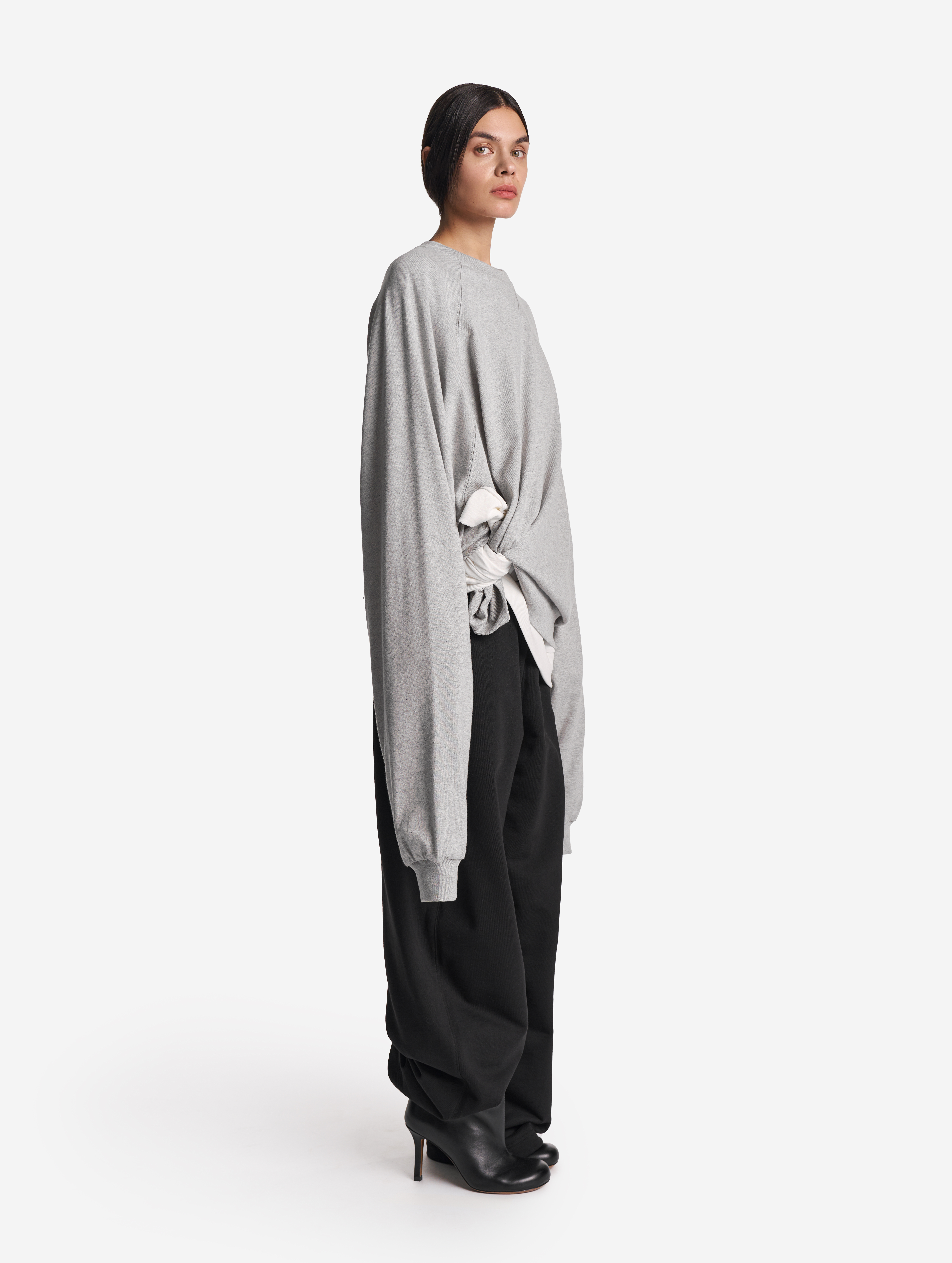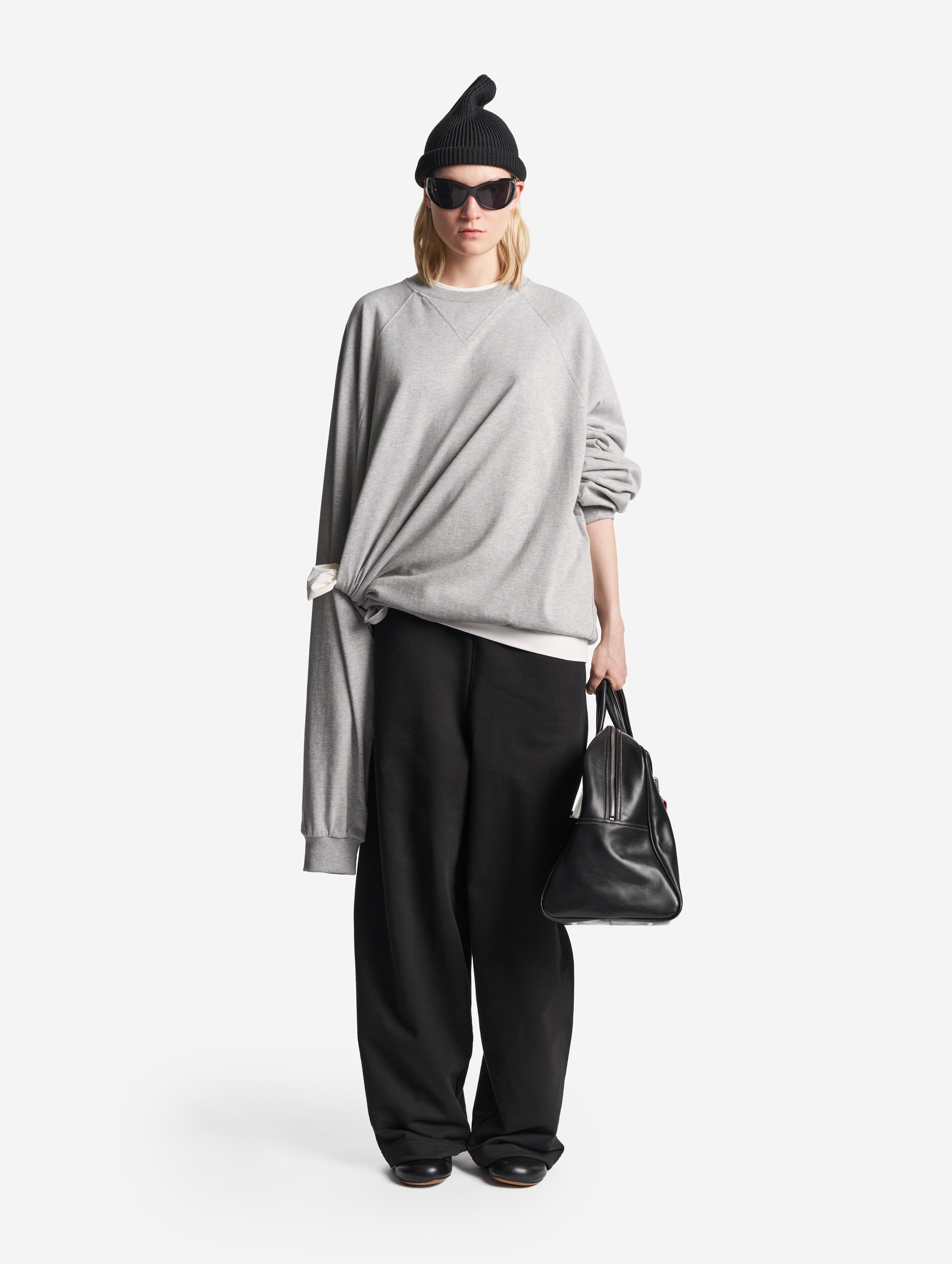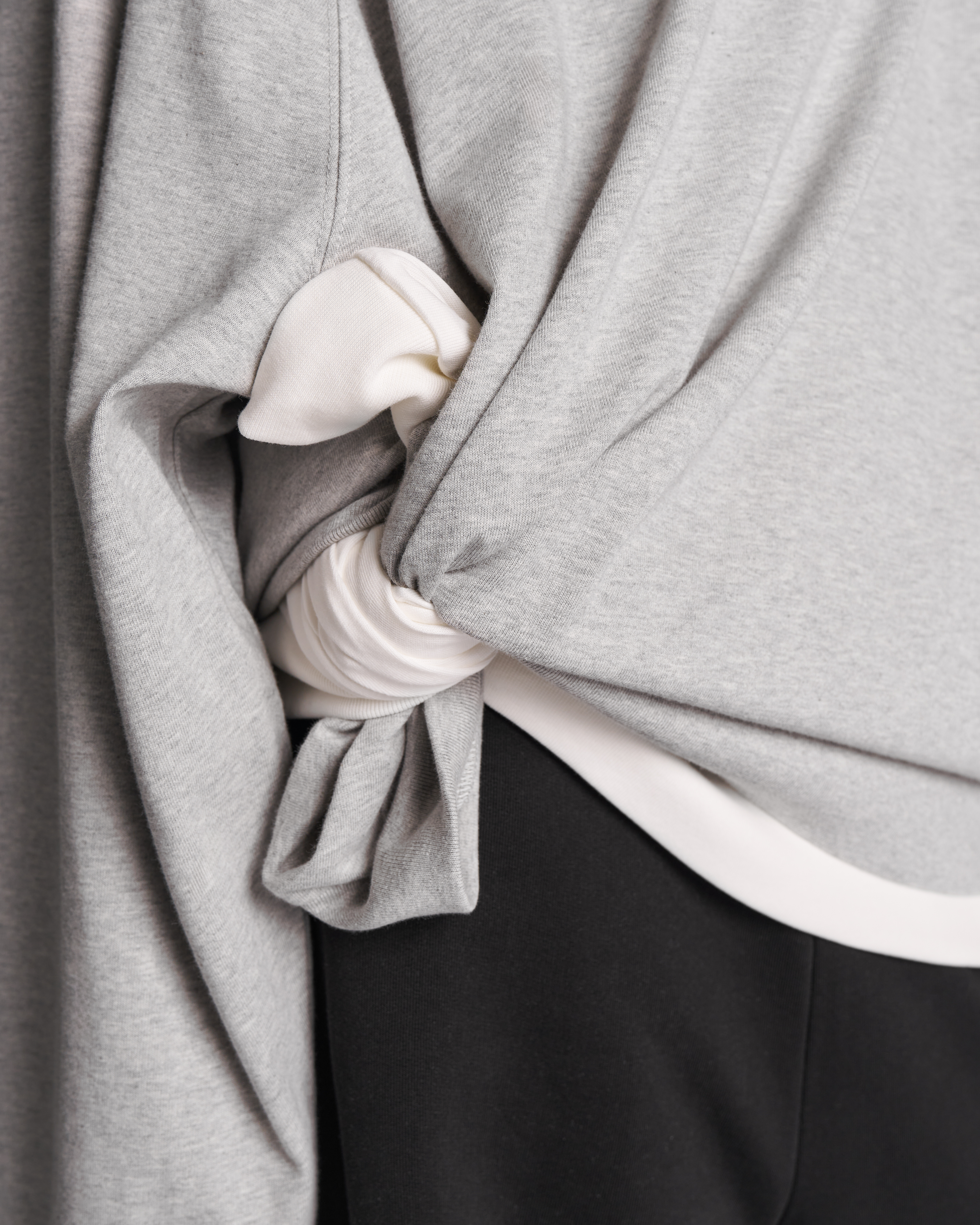 Свитшот оверсайз-силуэта. К внутреннему шву экстрадлинных рукавов пришиты тонкие резинки — если надеть их на руку, ткань соберется в мягкие складки, а рукава уменьшаться в длине. Горловина, манжеты и пояс обработаны рибаной в цвет ткани.