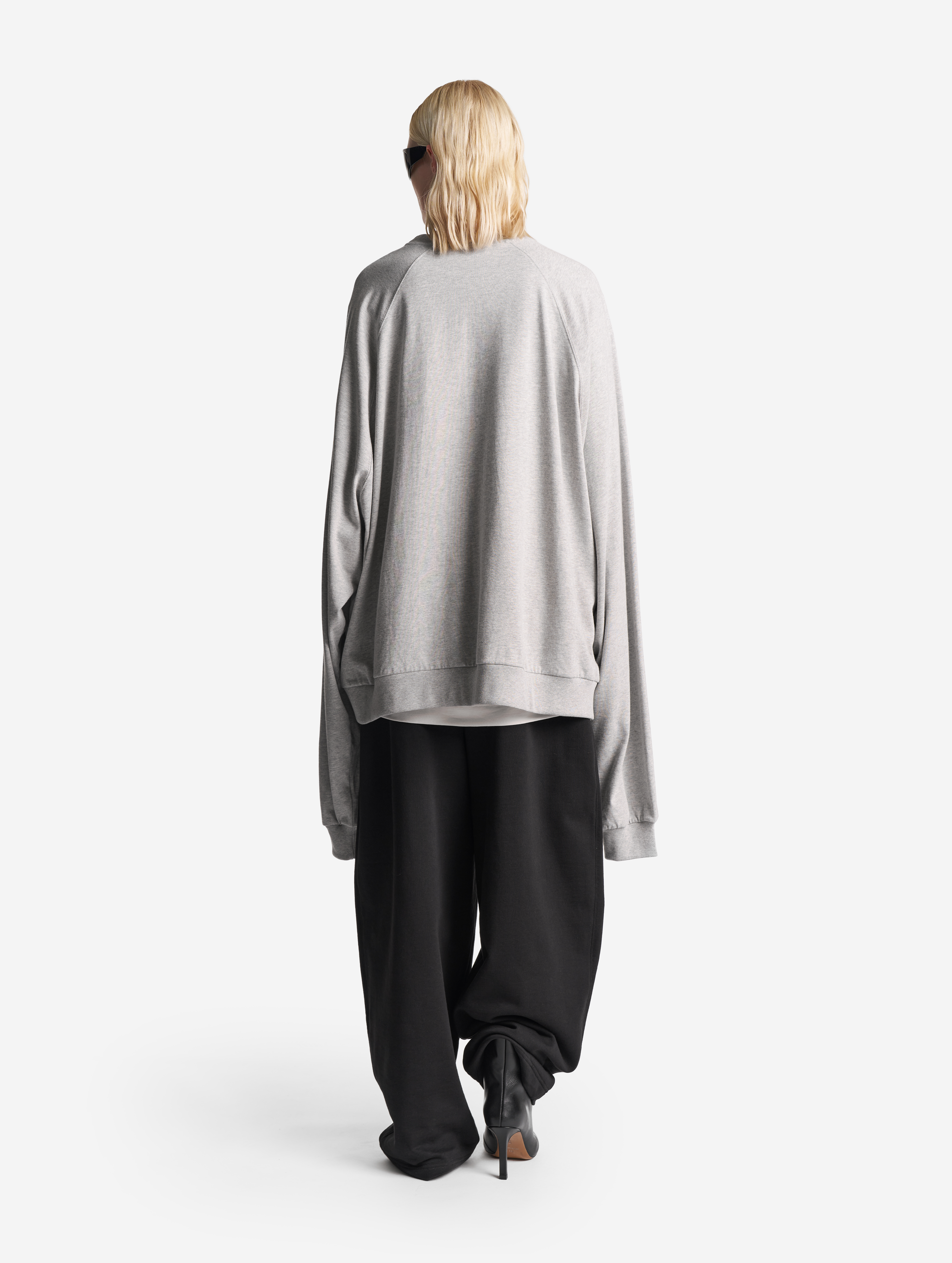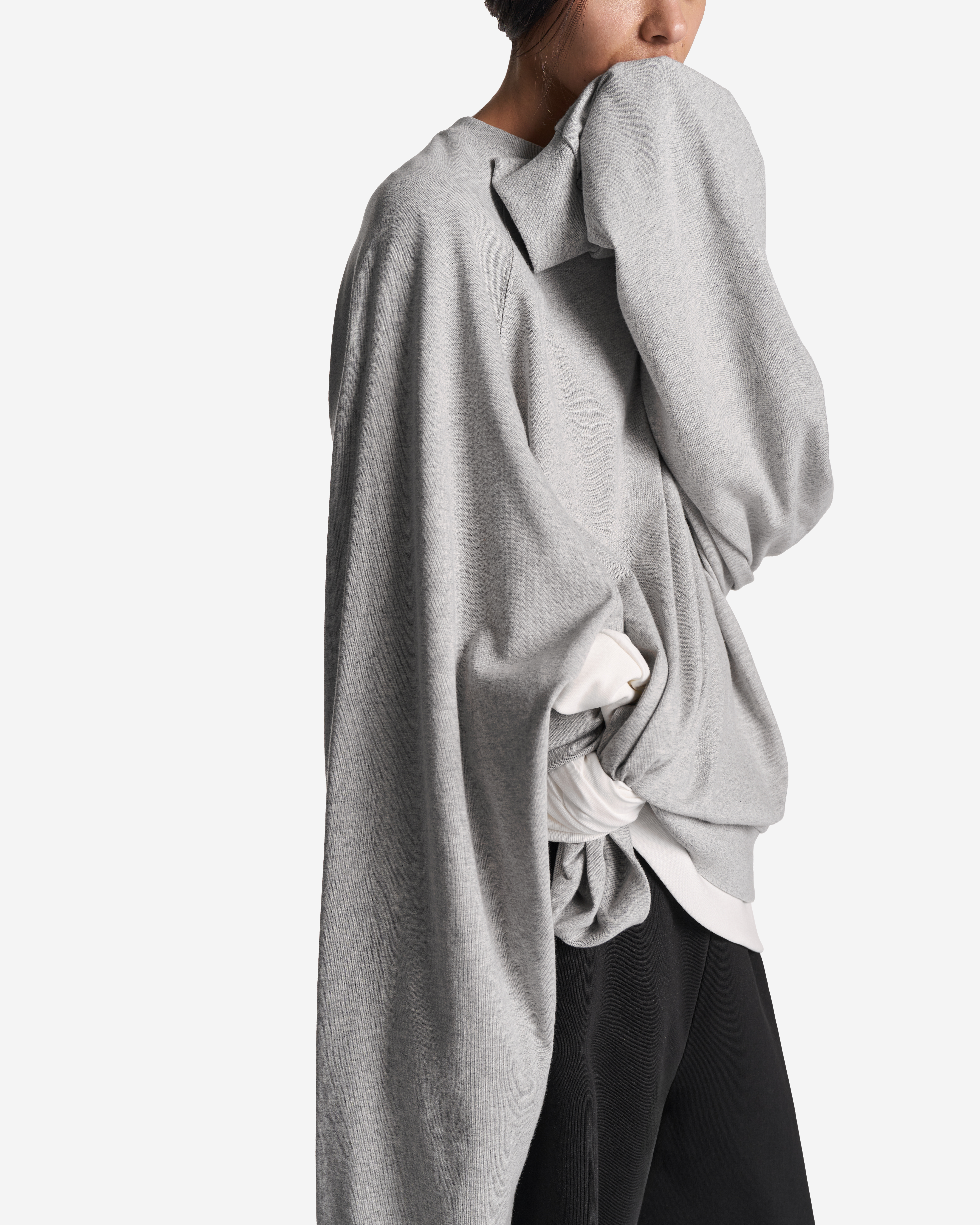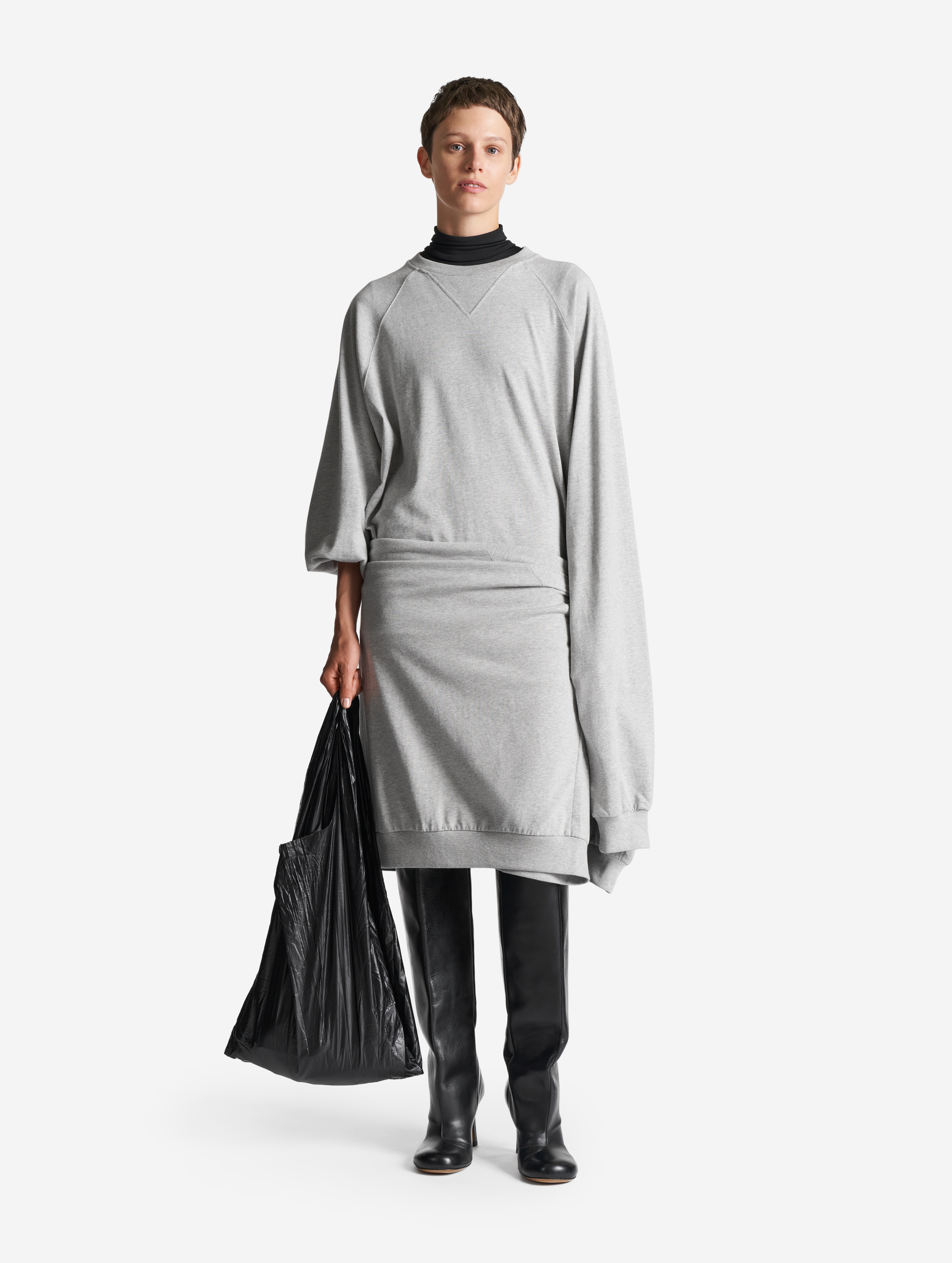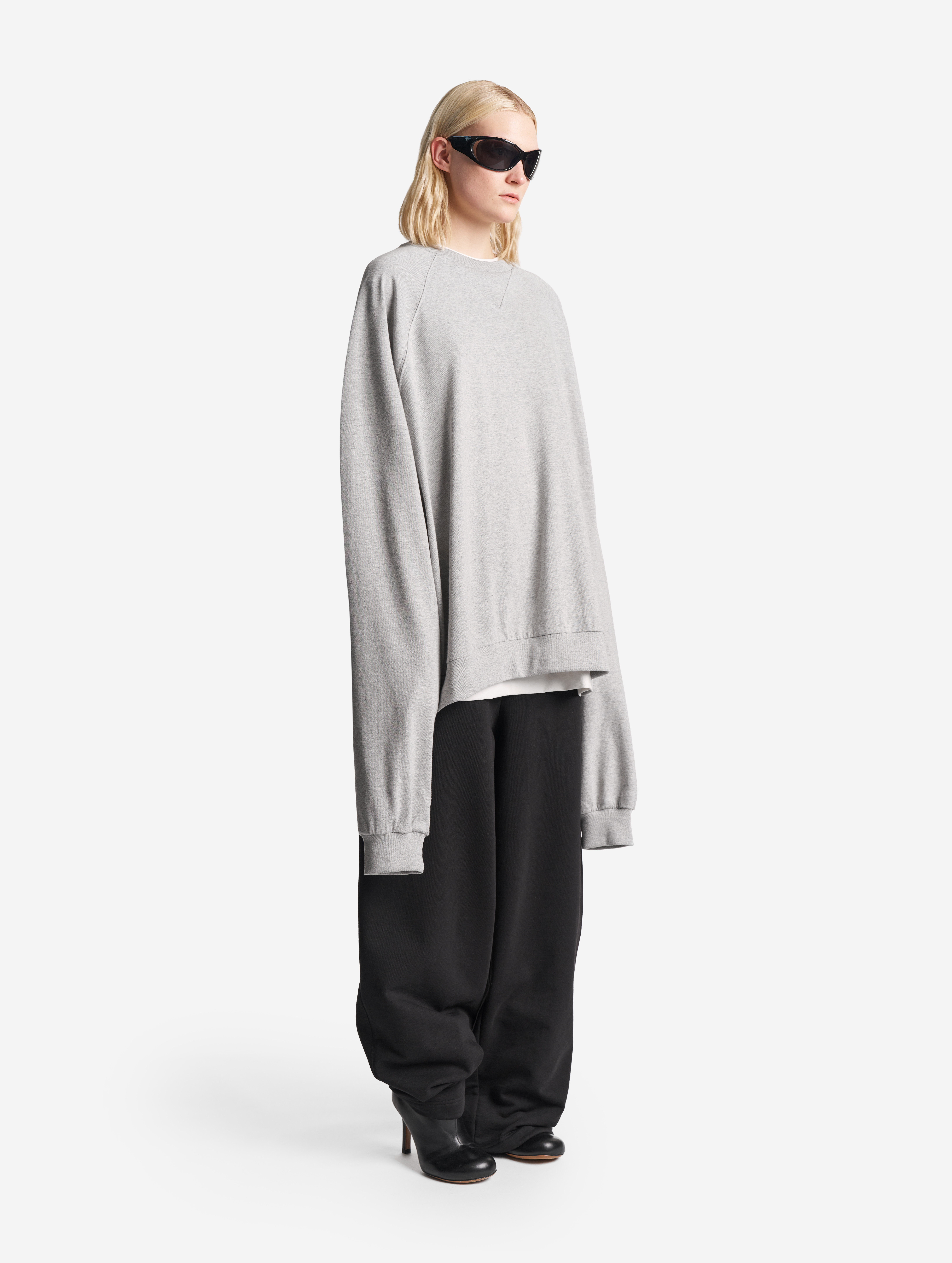 Свитшот оверсайз-силуэта. К внутреннему шву экстрадлинных рукавов пришиты тонкие резинки — если надеть их на руку, ткань соберется в мягкие складки, а рукава уменьшаться в длине. Горловина, манжеты и пояс обработаны рибаной в цвет ткани.