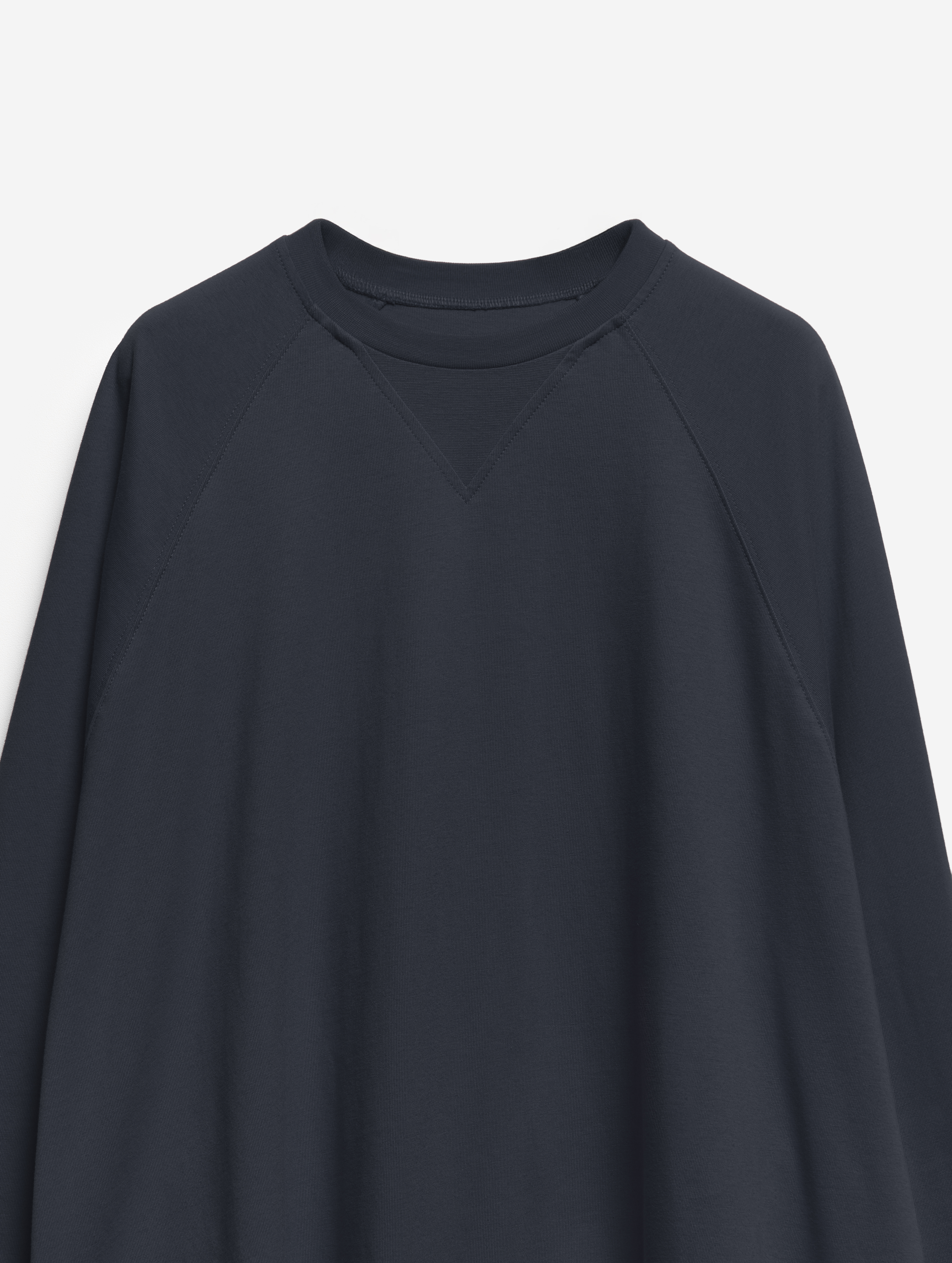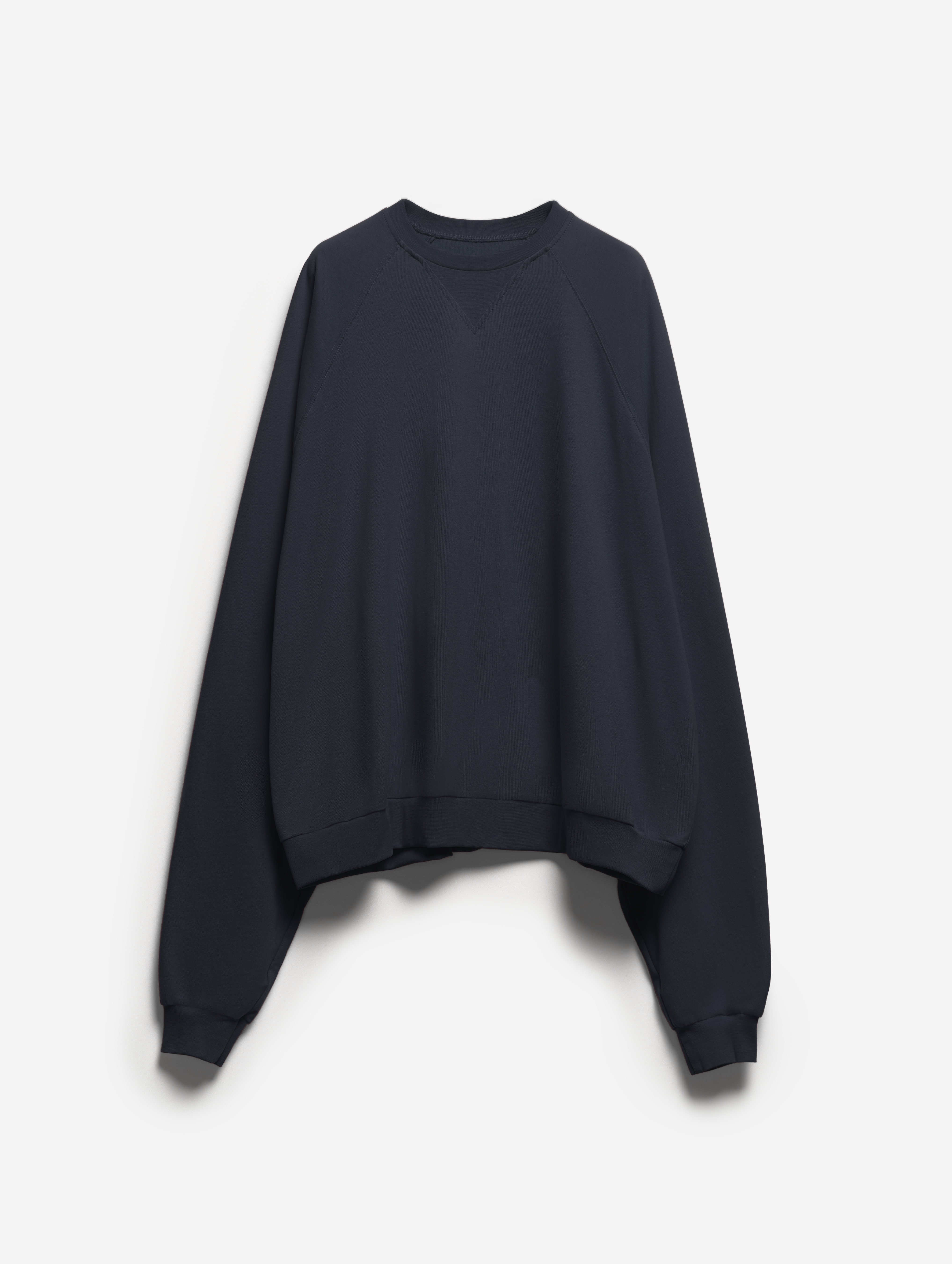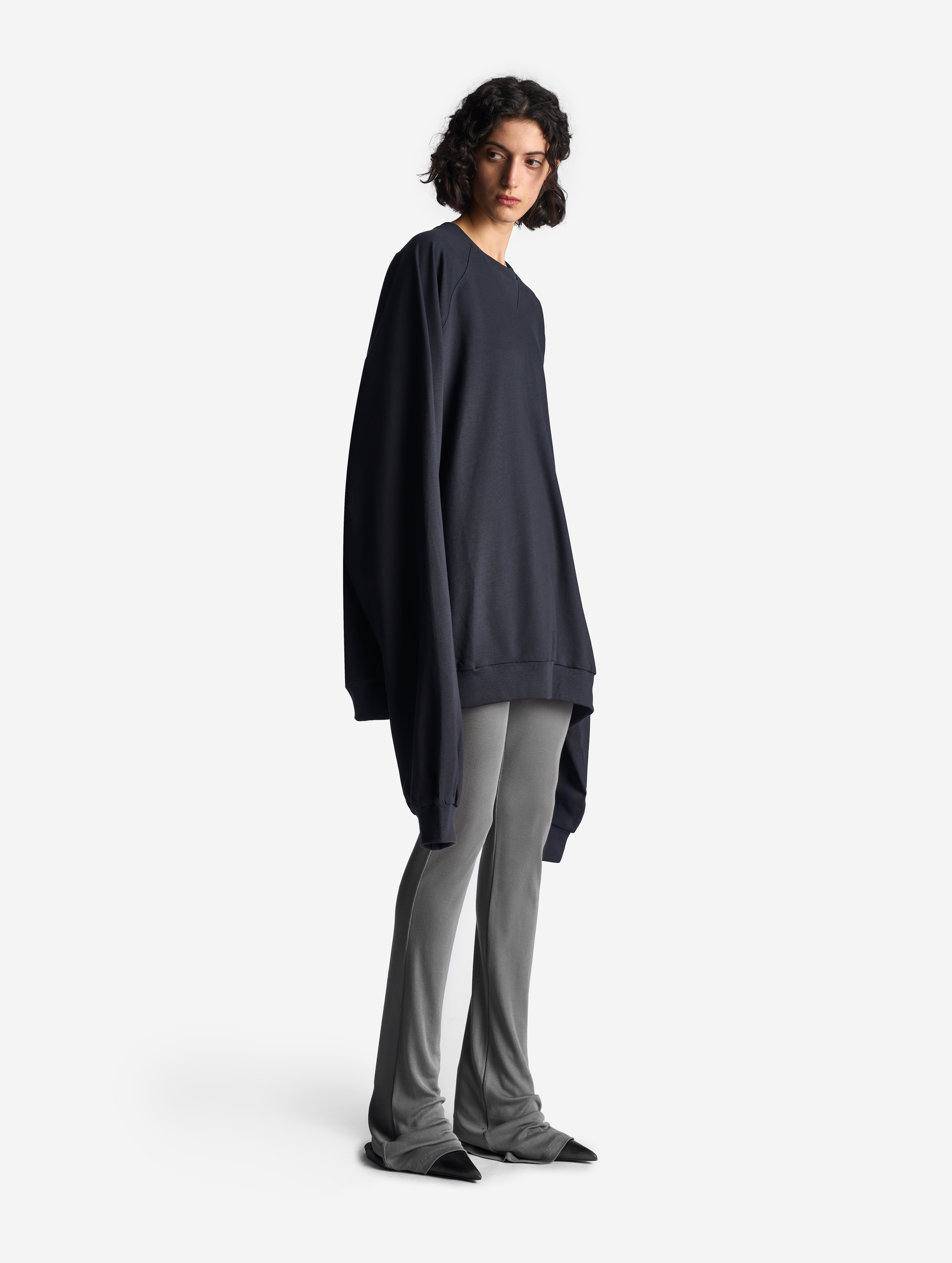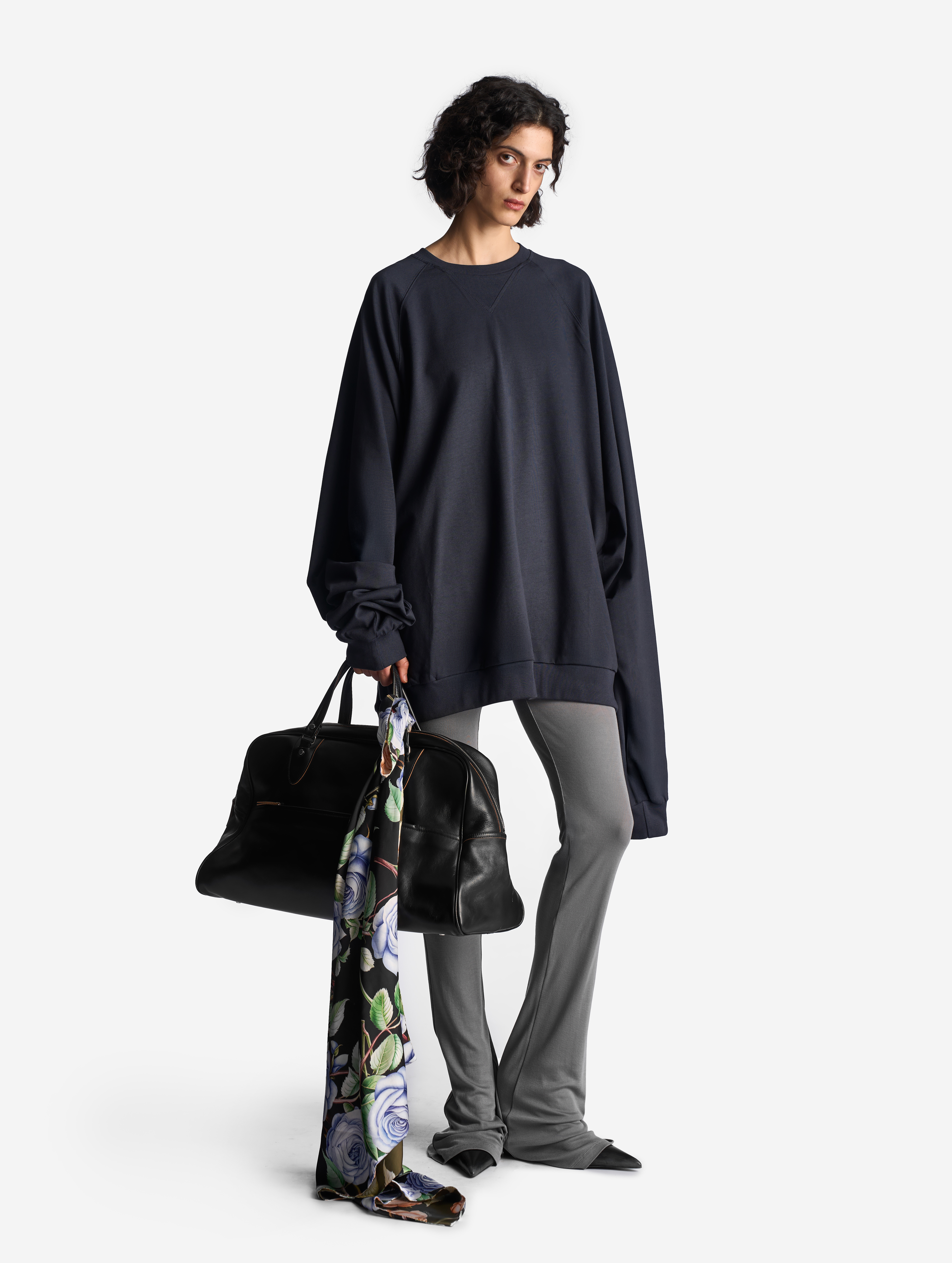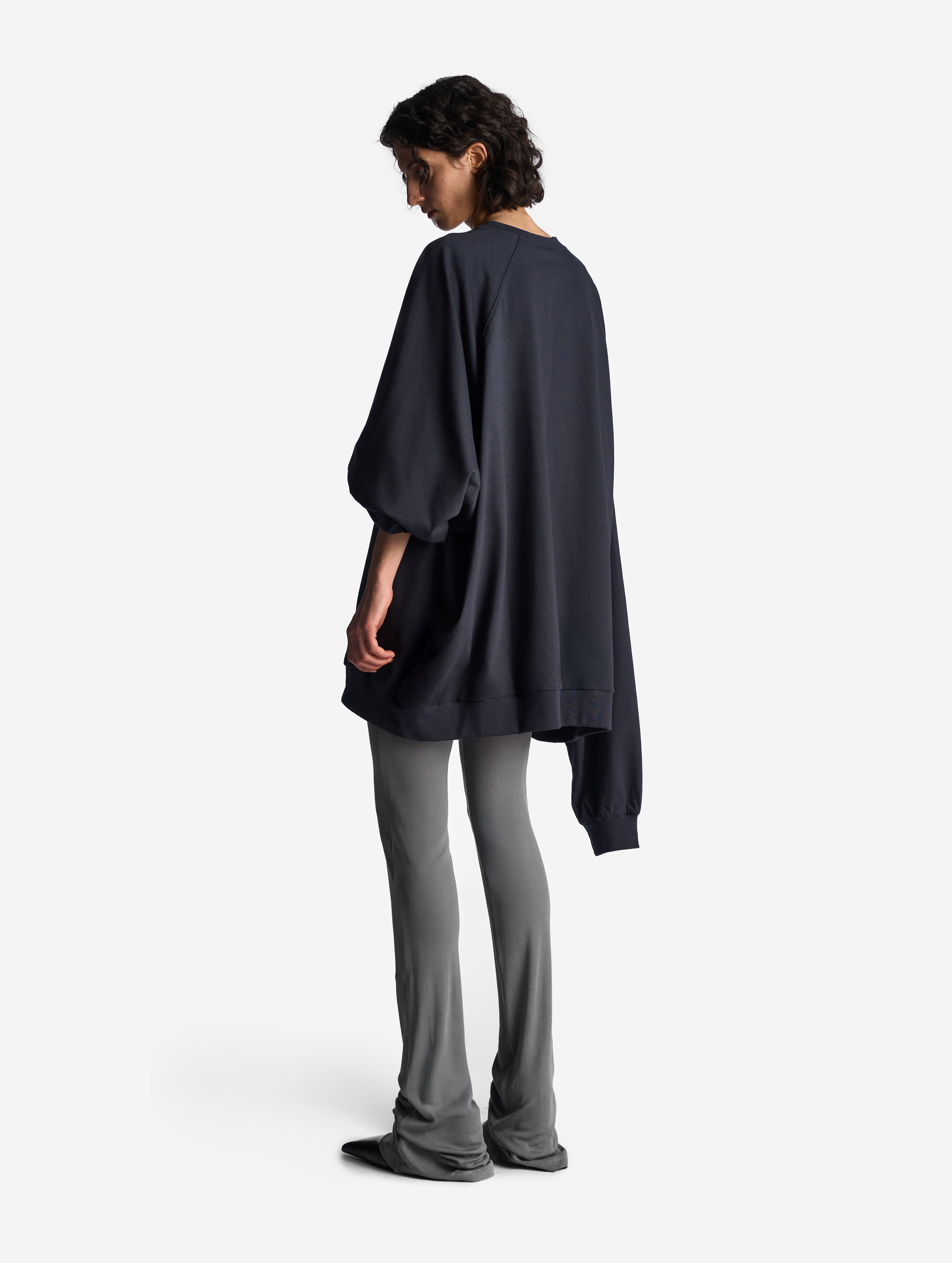 Свитшот оверсайз-силуэта. К внутреннему шву экстрадлинных рукавов пришиты тонкие резинки — если надеть их на руку, ткань соберется в мягкие складки, а рукава уменьшаться в длине. Горловина, манжеты и пояс обработаны рибаной в цвет ткани.