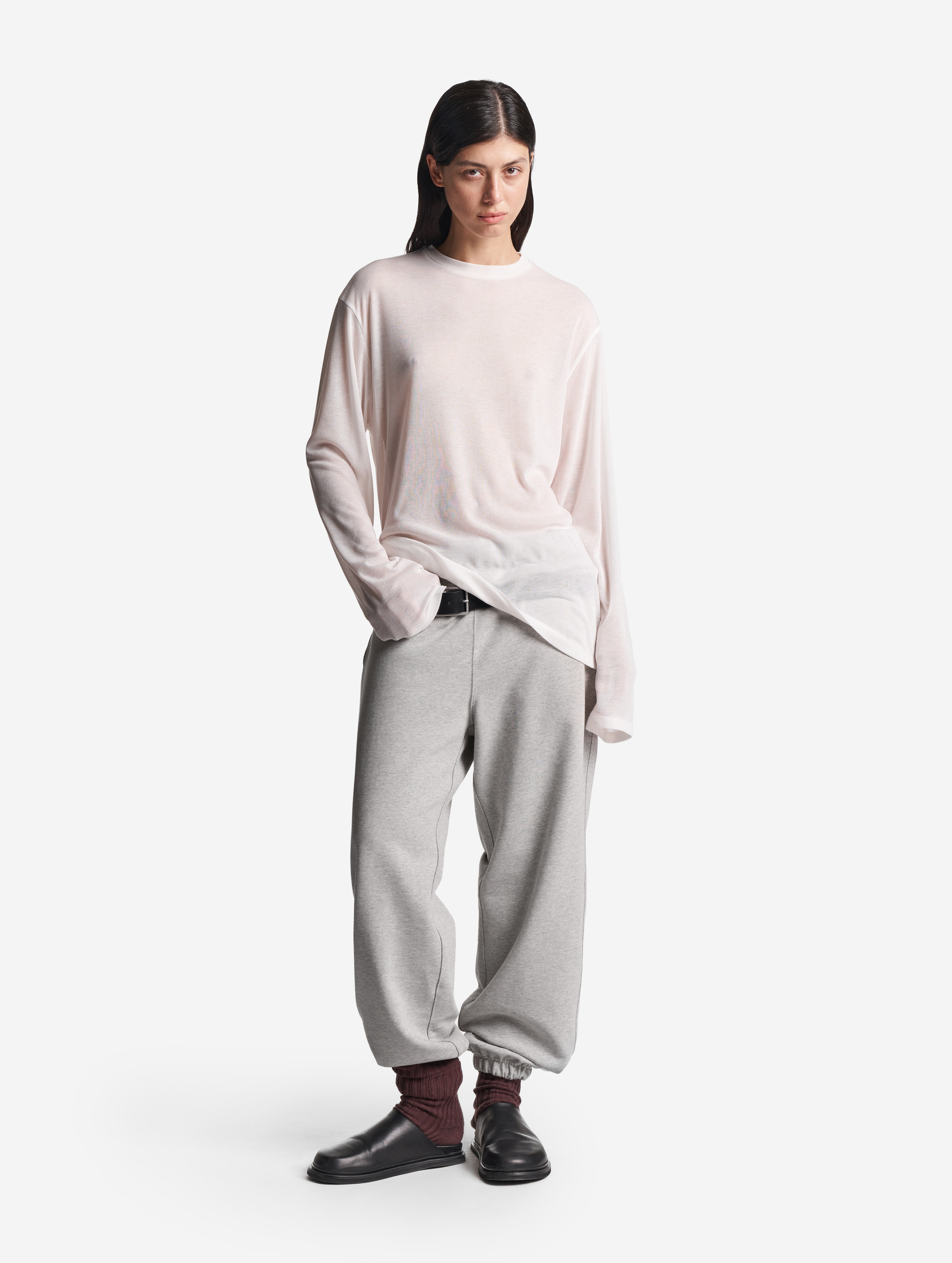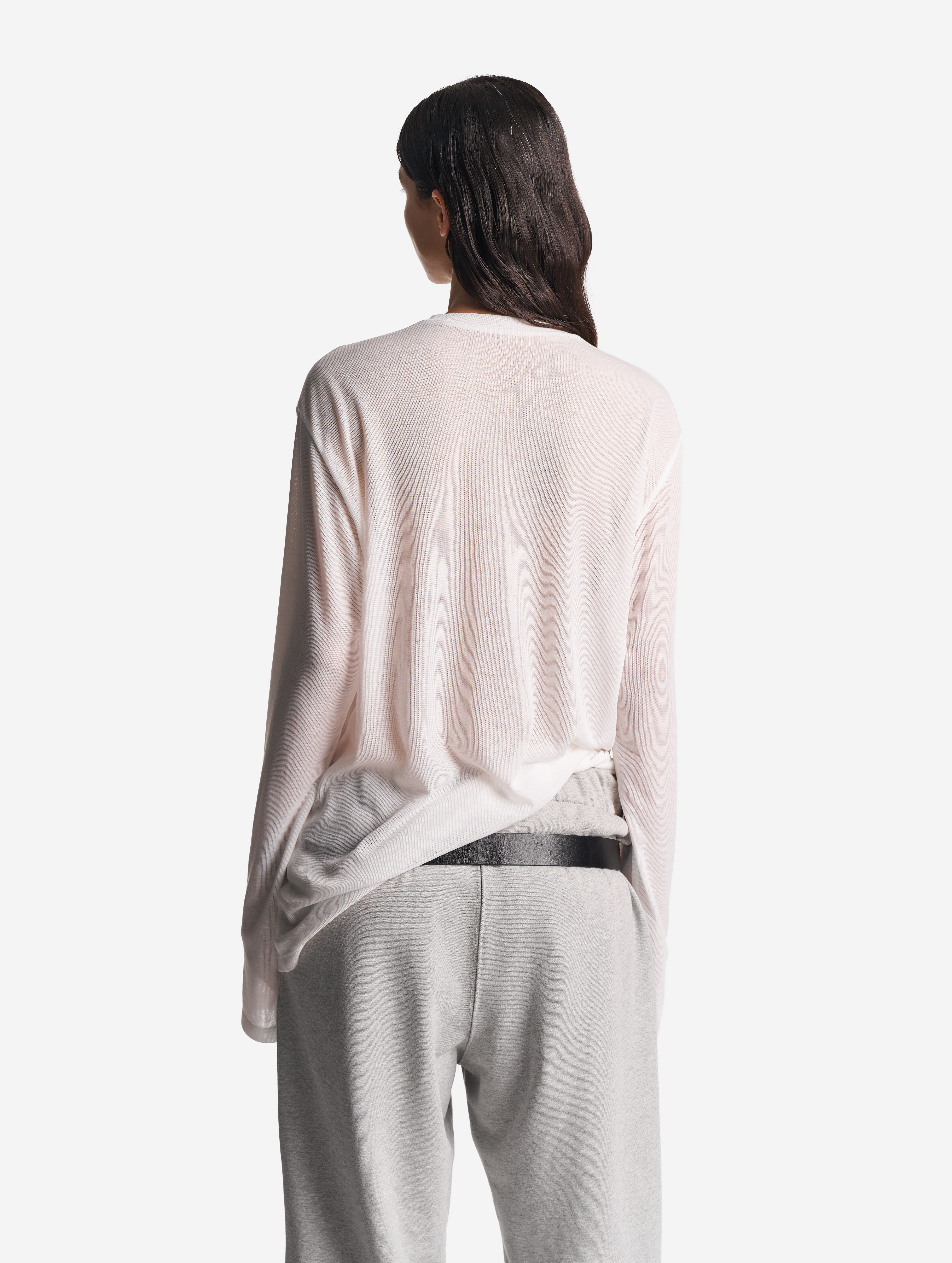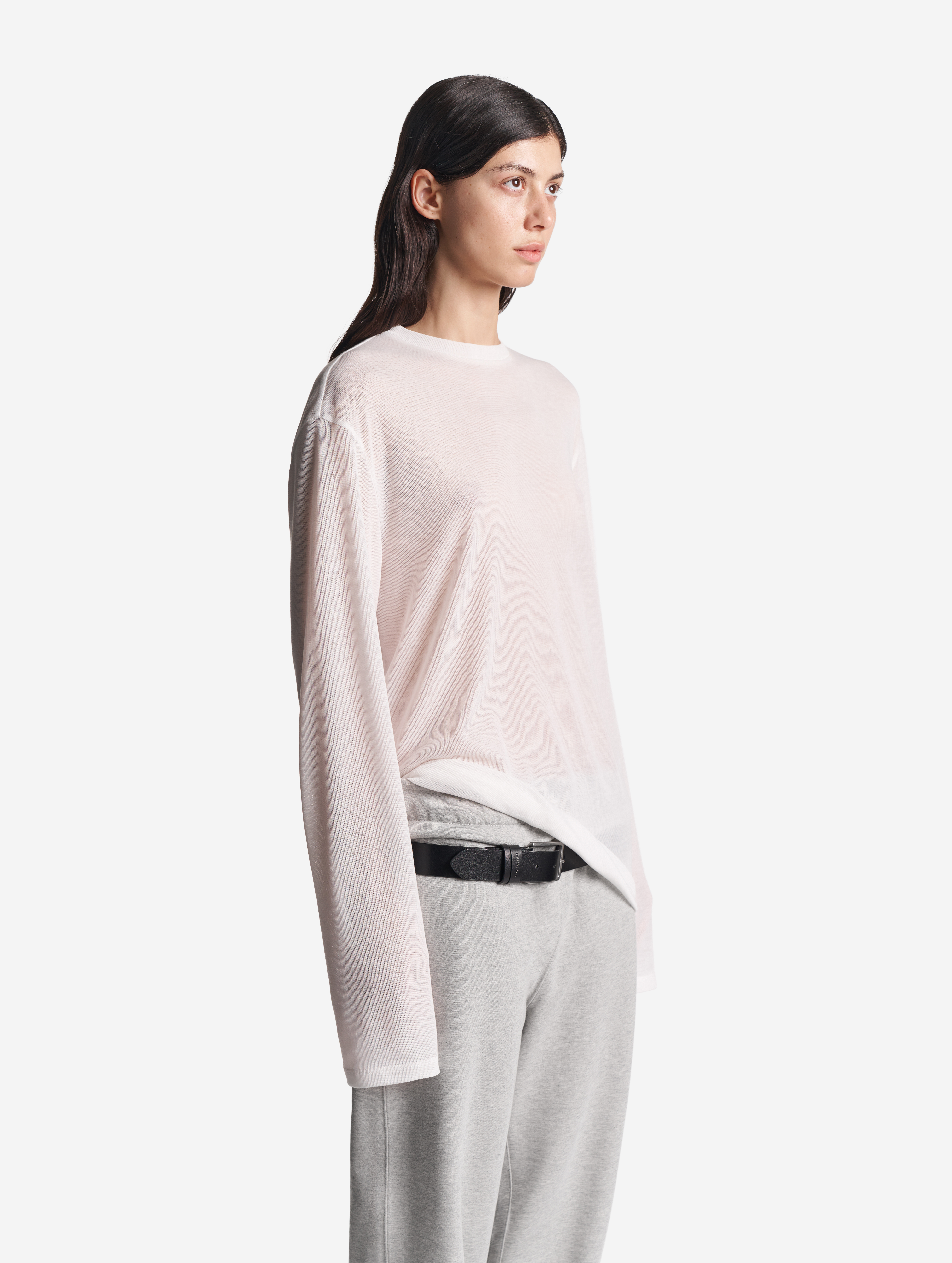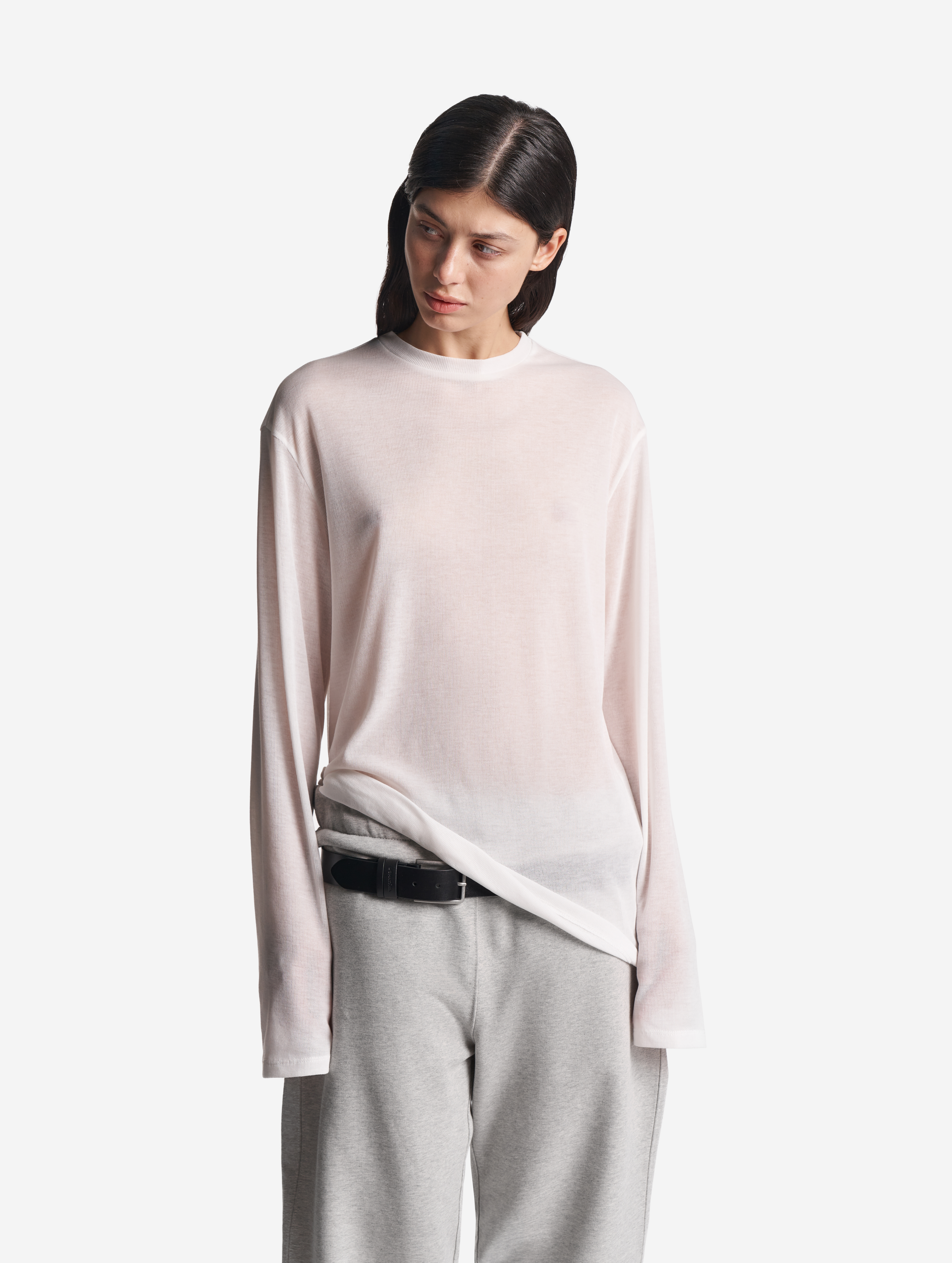 Лонгслив выполнен из тонкого полупрозрачного трикотажа. У него вытянутый свободный силуэт и универсальная посадка — такой лонгслив могут носить и мужчины.