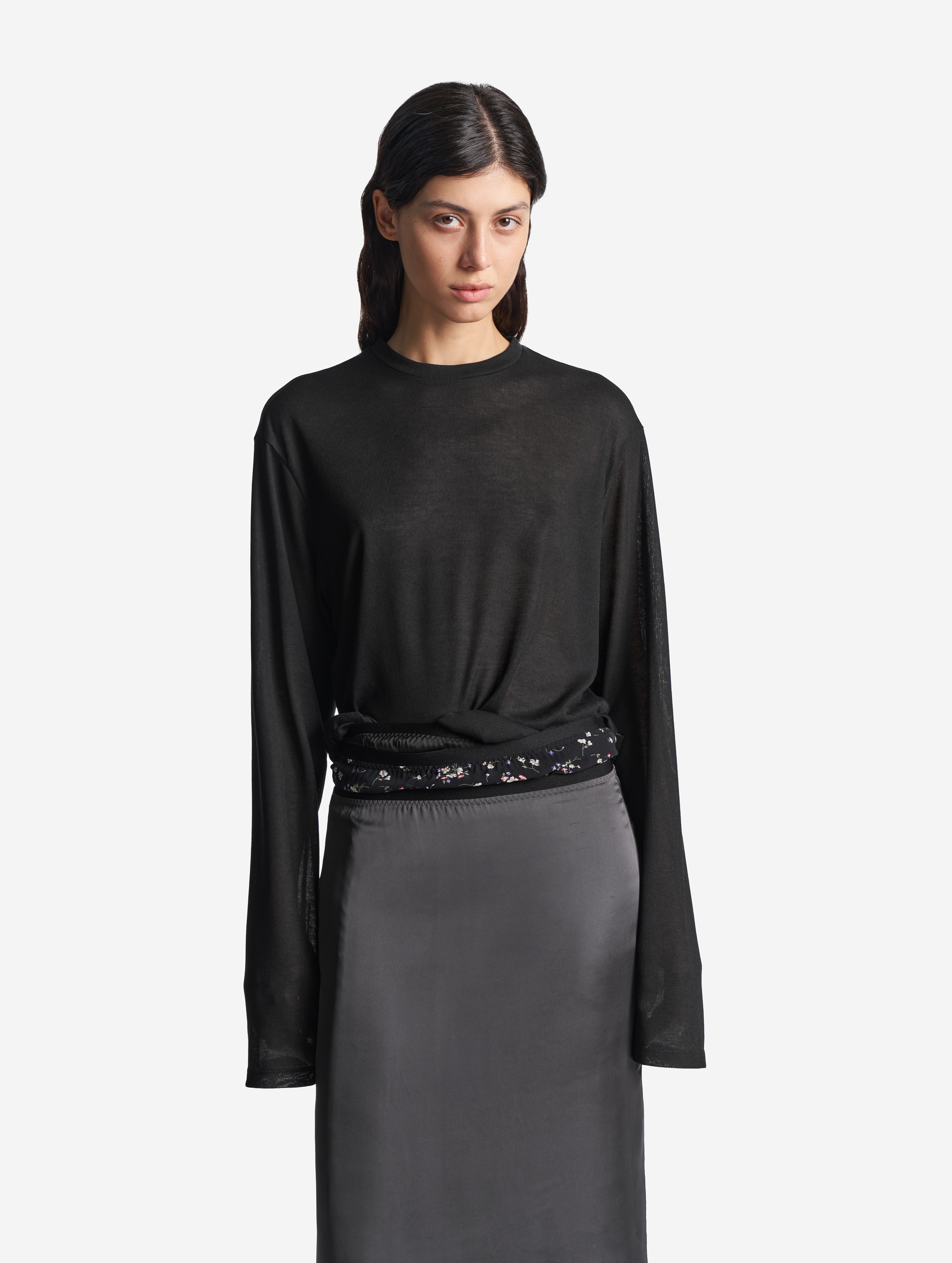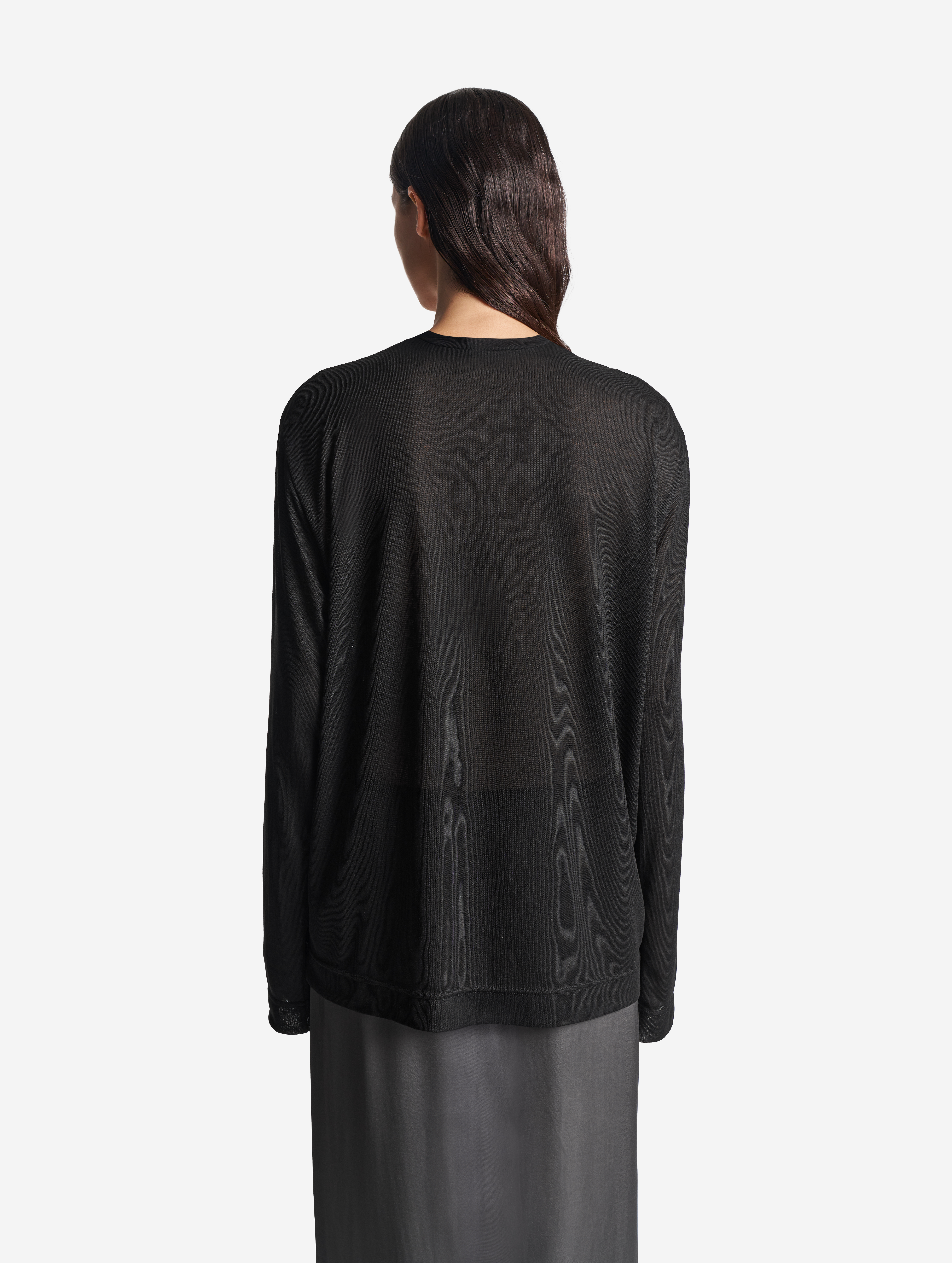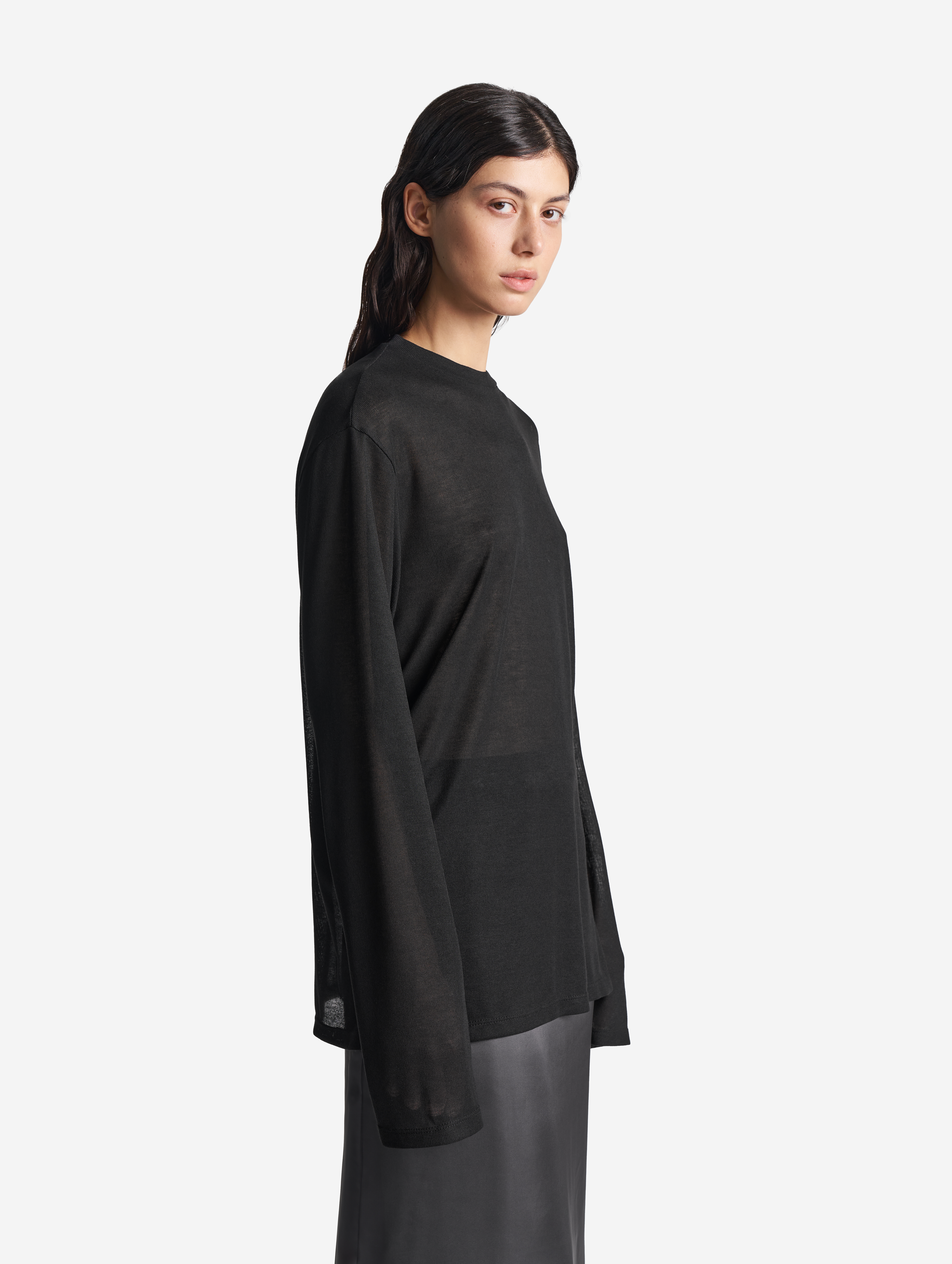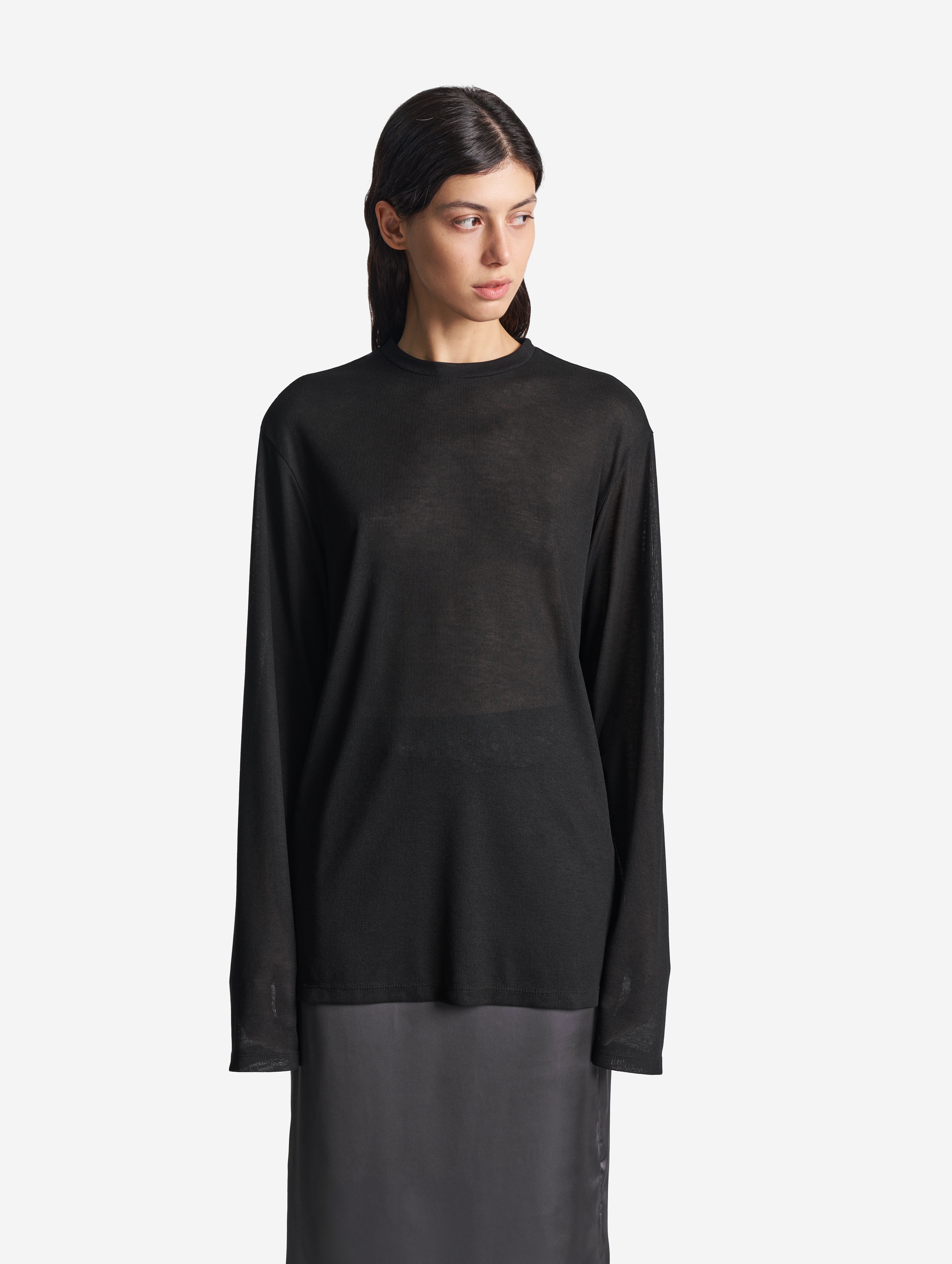 Лонгслив выполнен из тонкого полупрозрачного трикотажа. У него вытянутый свободный силуэт и универсальная посадка — такой лонгслив могут носить и мужчины.