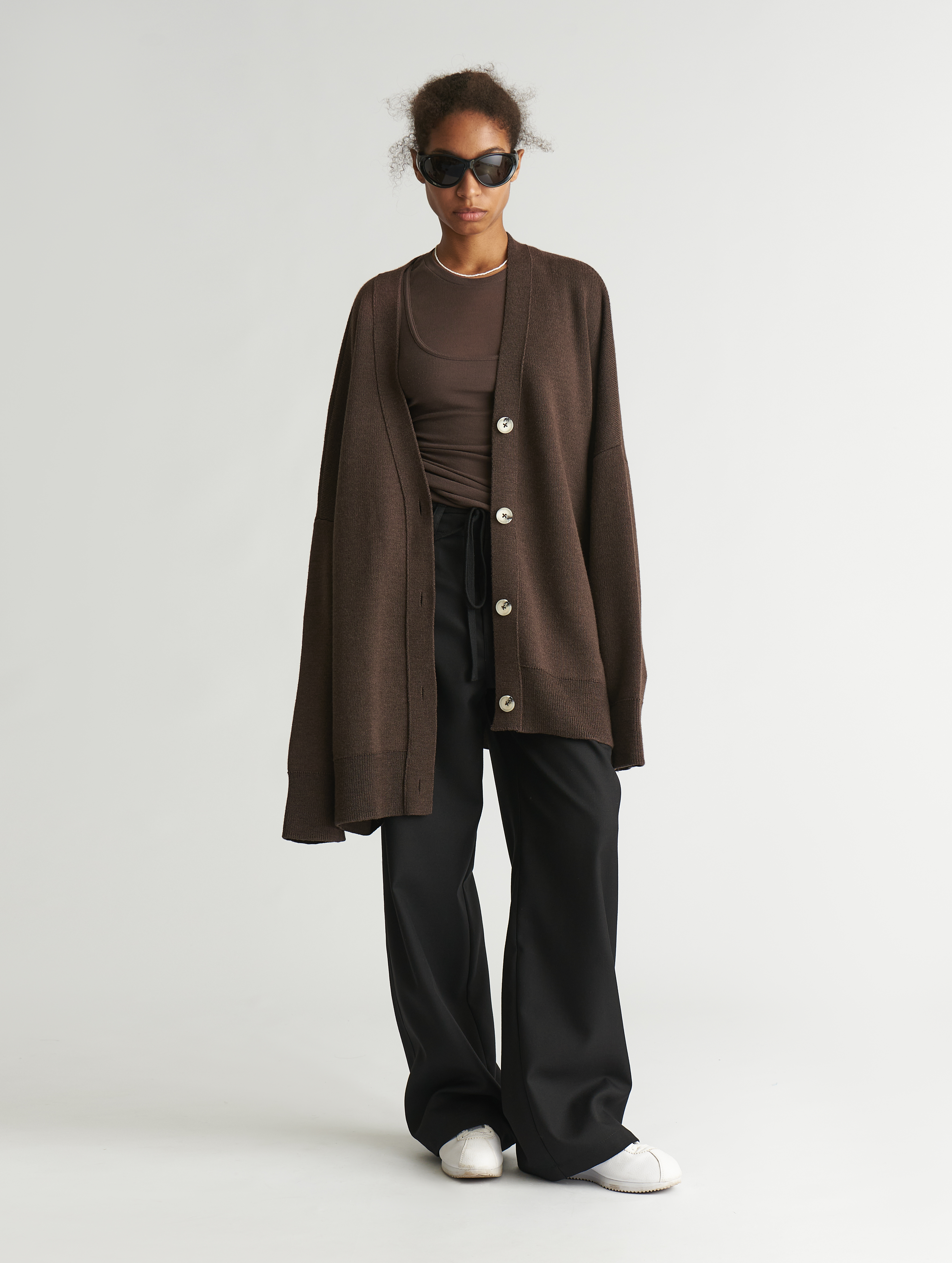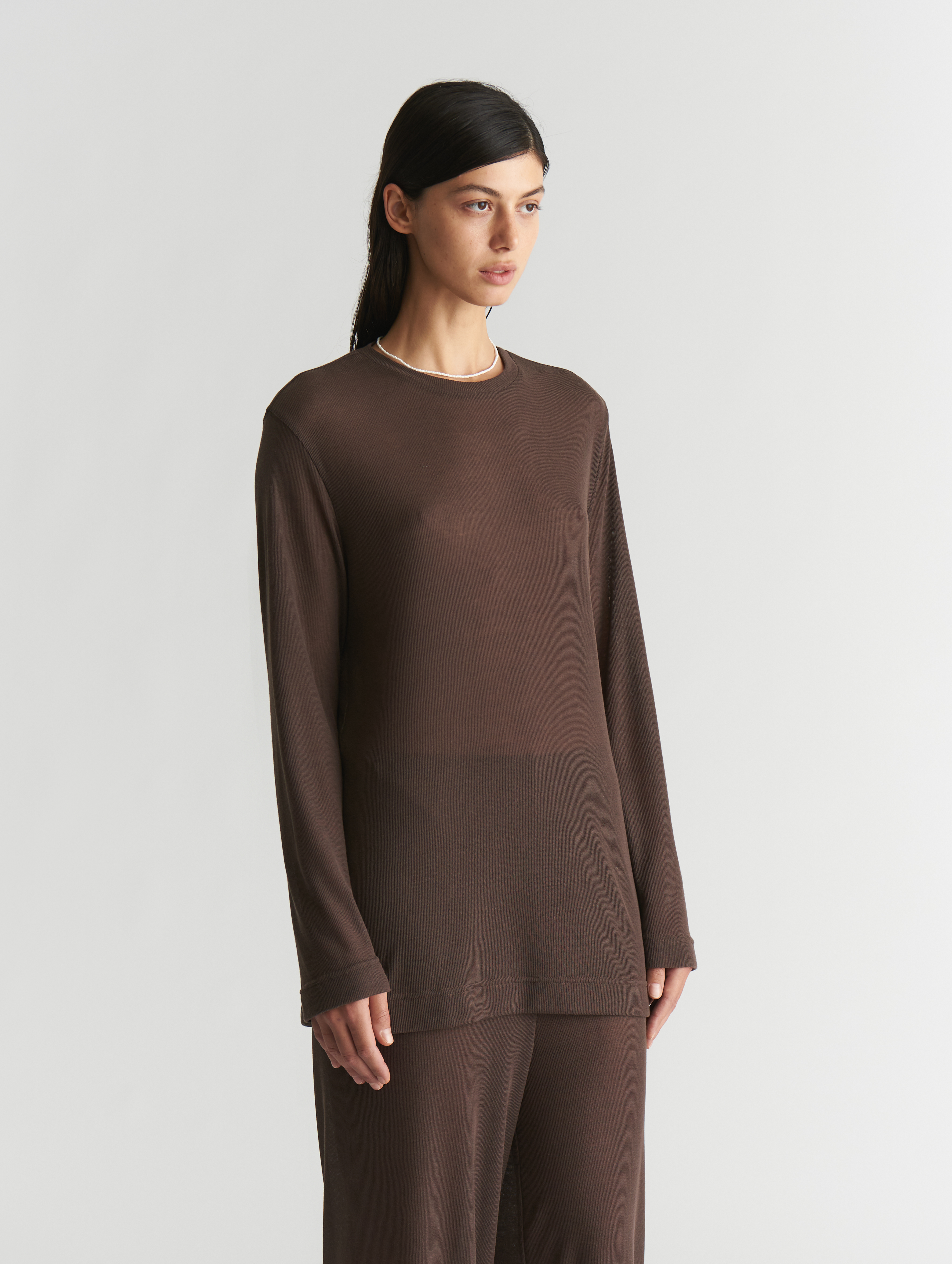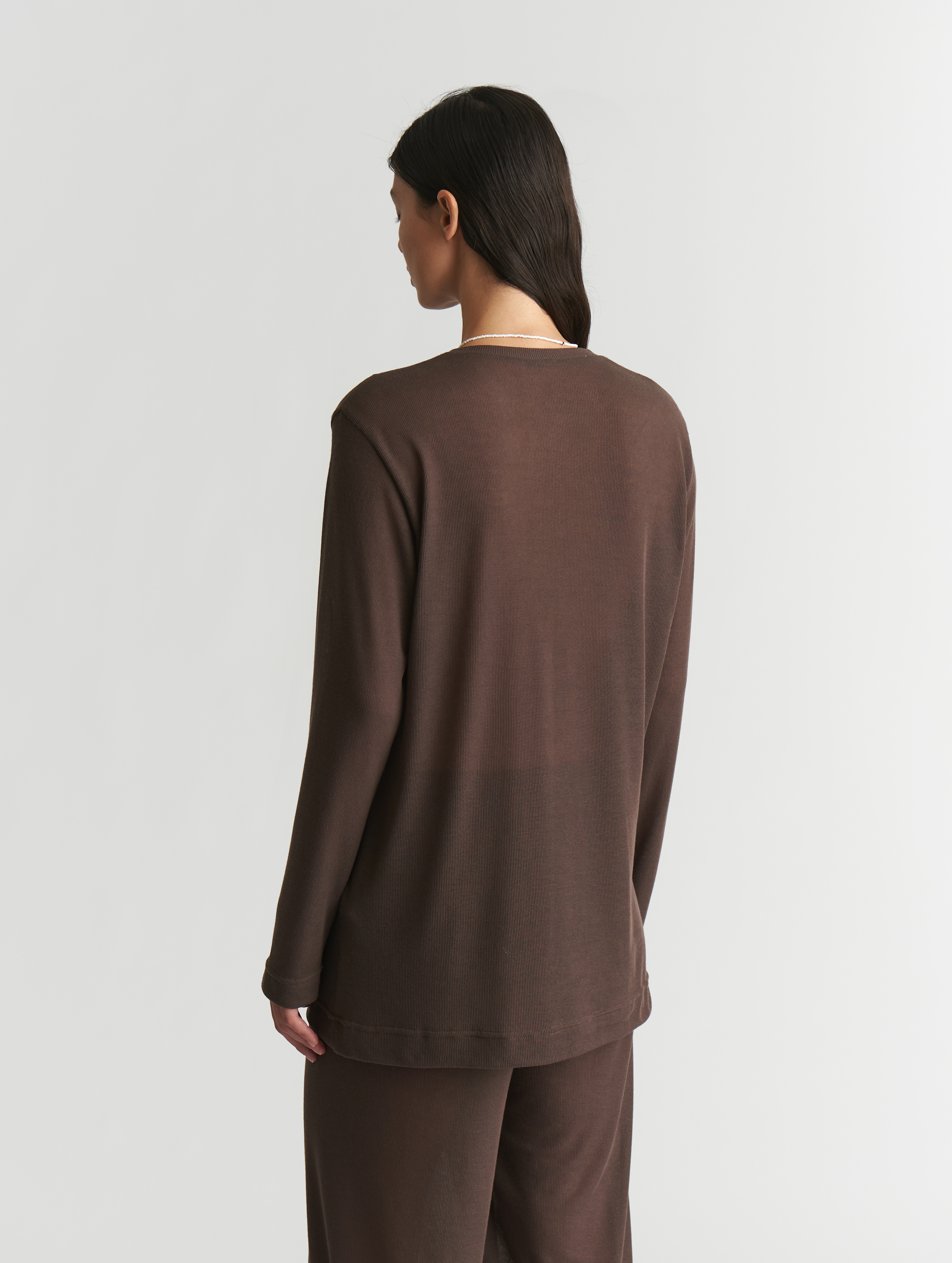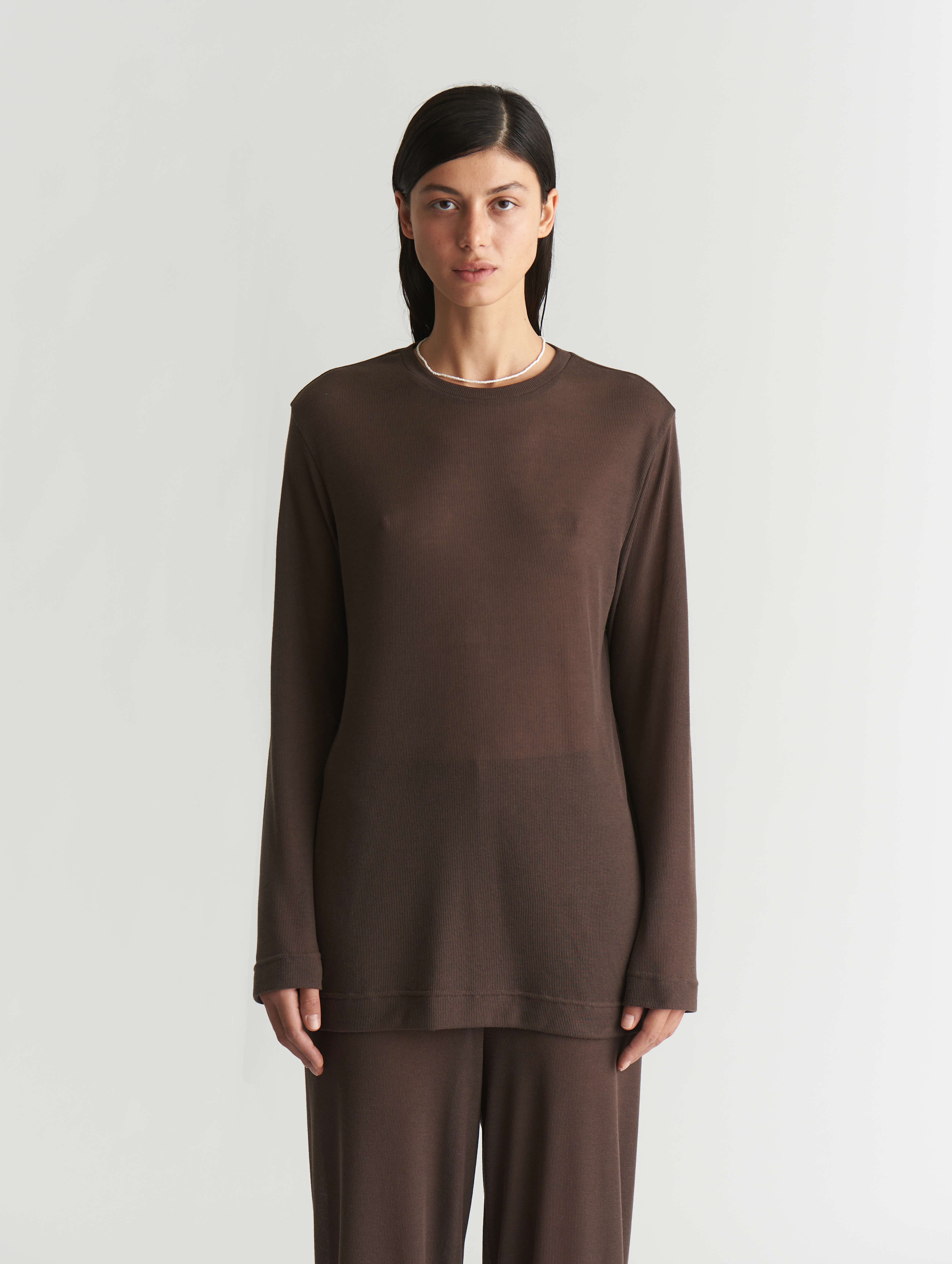 Лонгслив выполнен из тонкого полупрозрачного трикотажа. У него вытянутый свободный силуэт и универсальная посадка — такой лонгслив могут носить и мужчины.