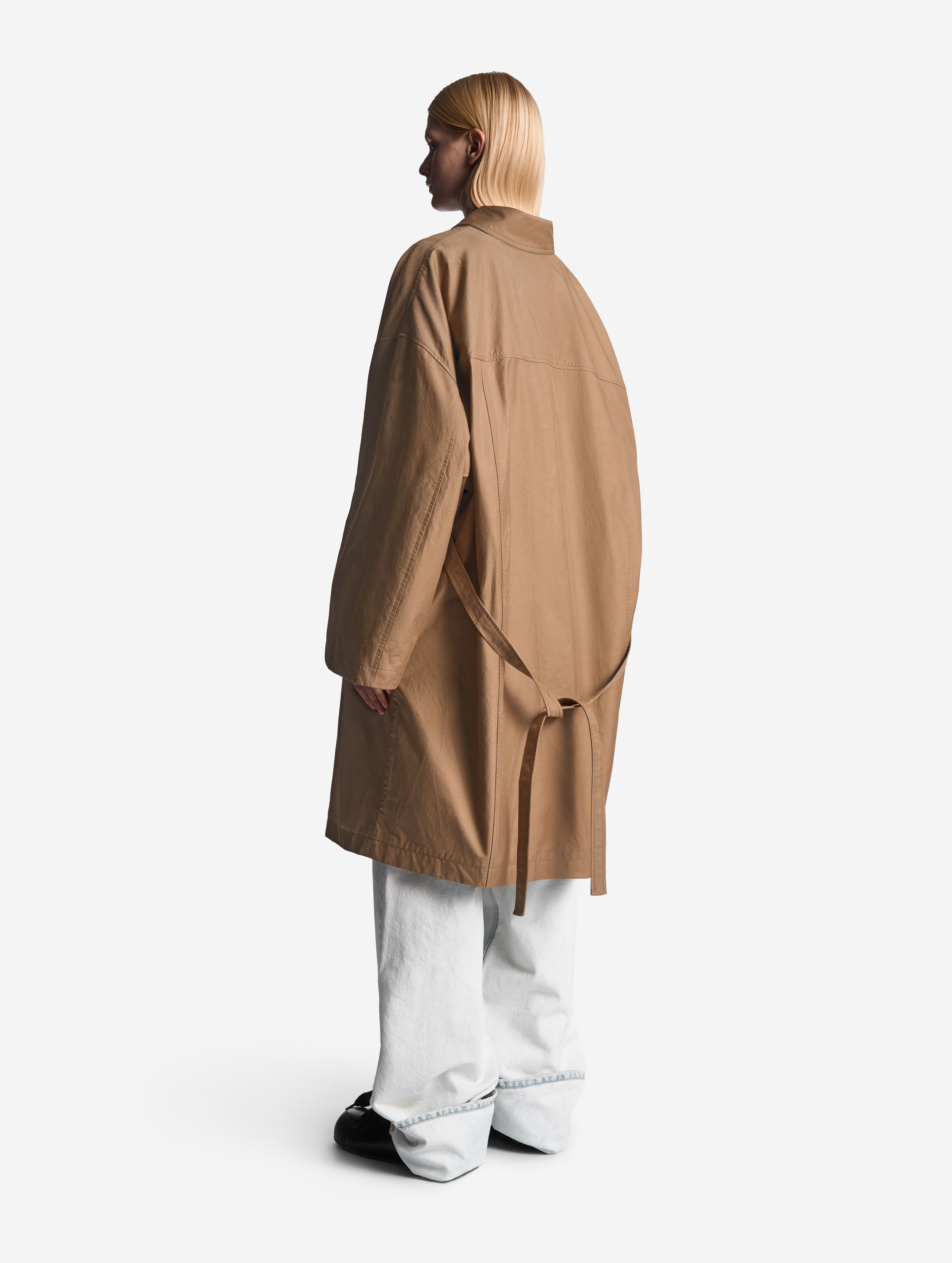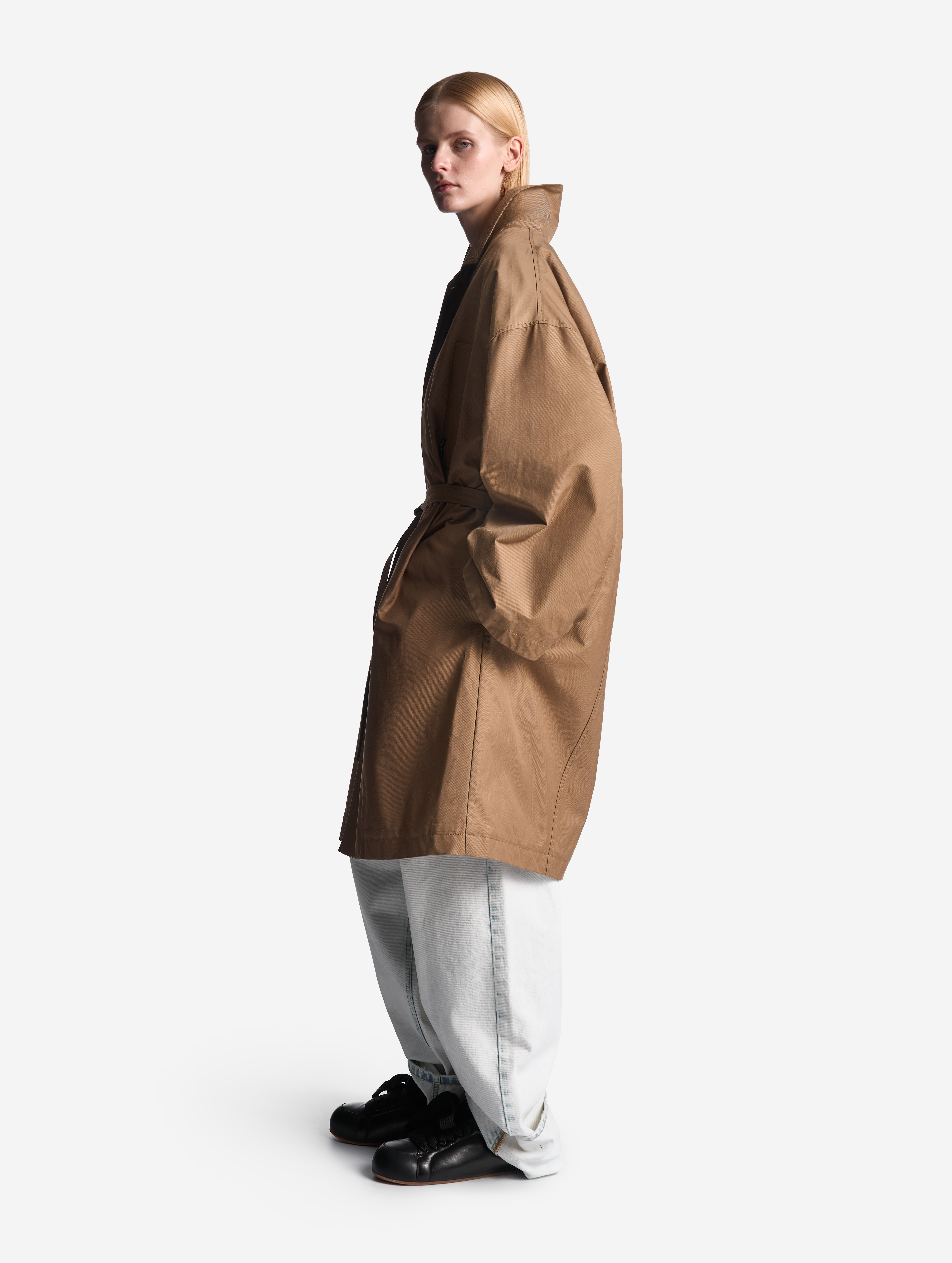 Модель застегивается на пуговицы — все они, кроме одной, спрятаны за планкой. Также в комплекте с тренчем идет длинный пояс, который можно зафиксировать в боковых петлях. Особенно нам нравится протягивать пояс по внутренней стороне тренча, чтобы скругленность спинки приобретала большую выразительность. У изделия две пары функциональных карманов: вертикальные на уровне груди и глубокие в области бедер.