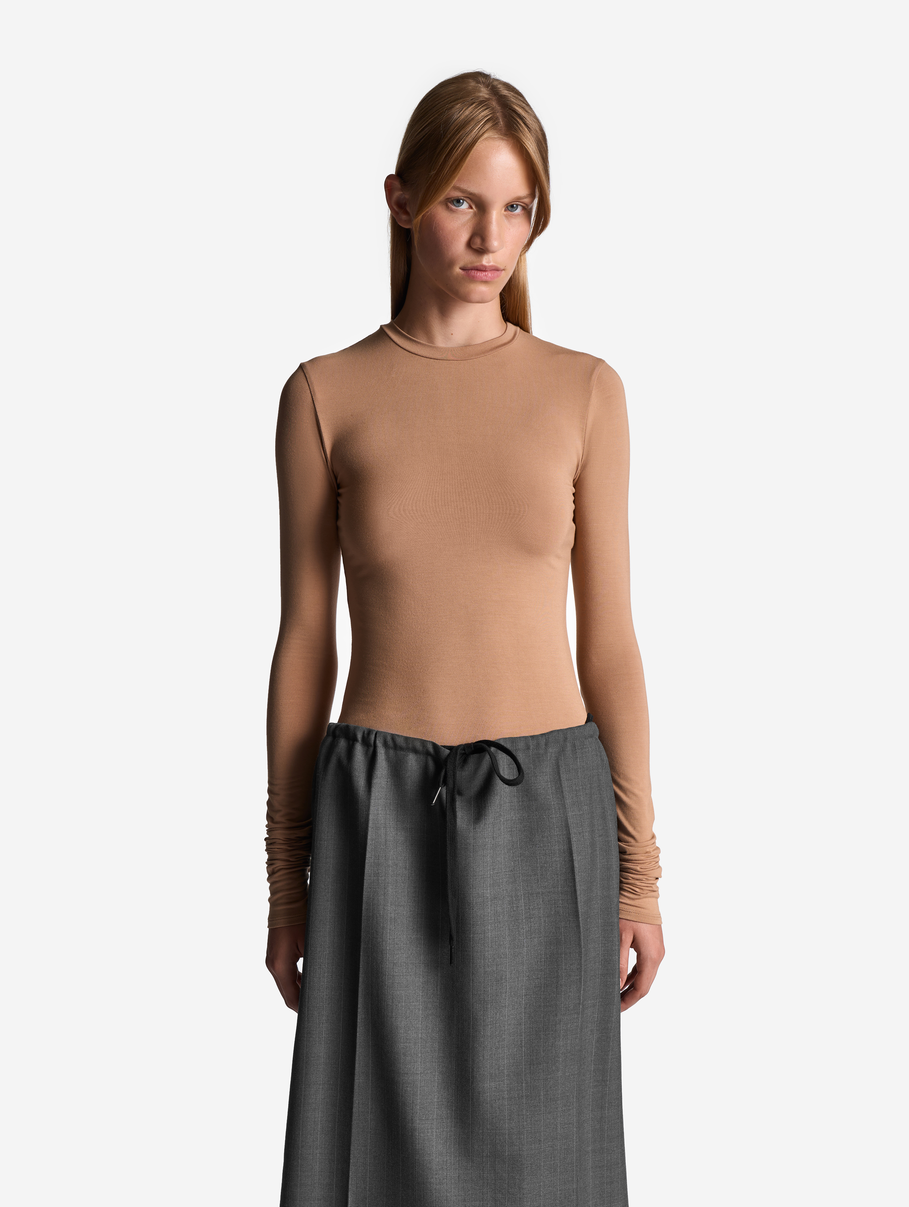 В словаре внутреннего пользования дизайн-команды Ushatava есть термин Sleek Fit. В переводе c английского слово sleek означает «гладкий», «изящный», что хорошо описывает силуэт этого лонгслива. Изделие тактично подстраивается под изгибы тела. У модели узкая горловина и удлиненные рукава, которые собираются в складки на запястьях. Лонгслив выполнен из вискозного трикотажа: он мягкий, гладкий, приятен для тела, хорошо тянется и не мнется.