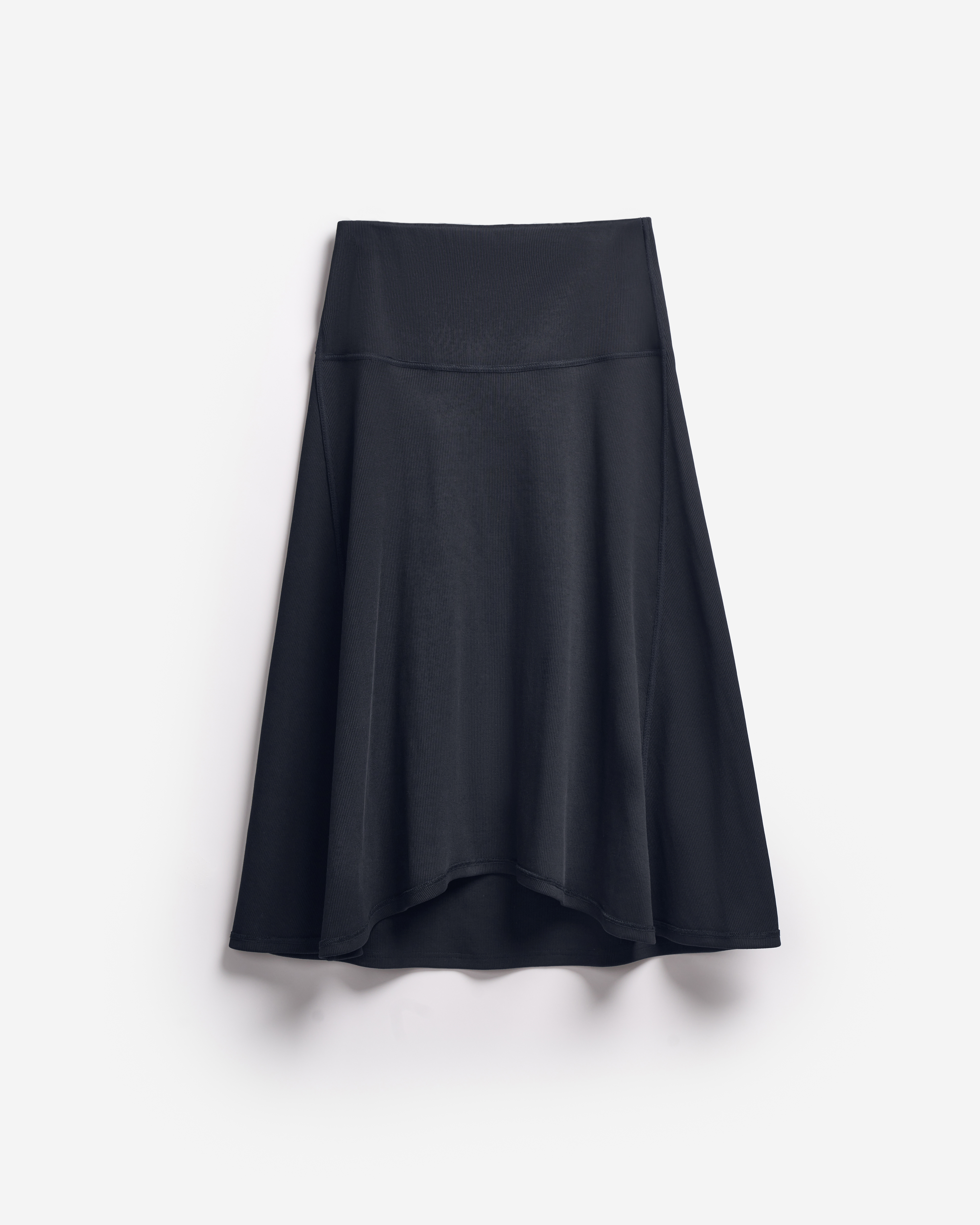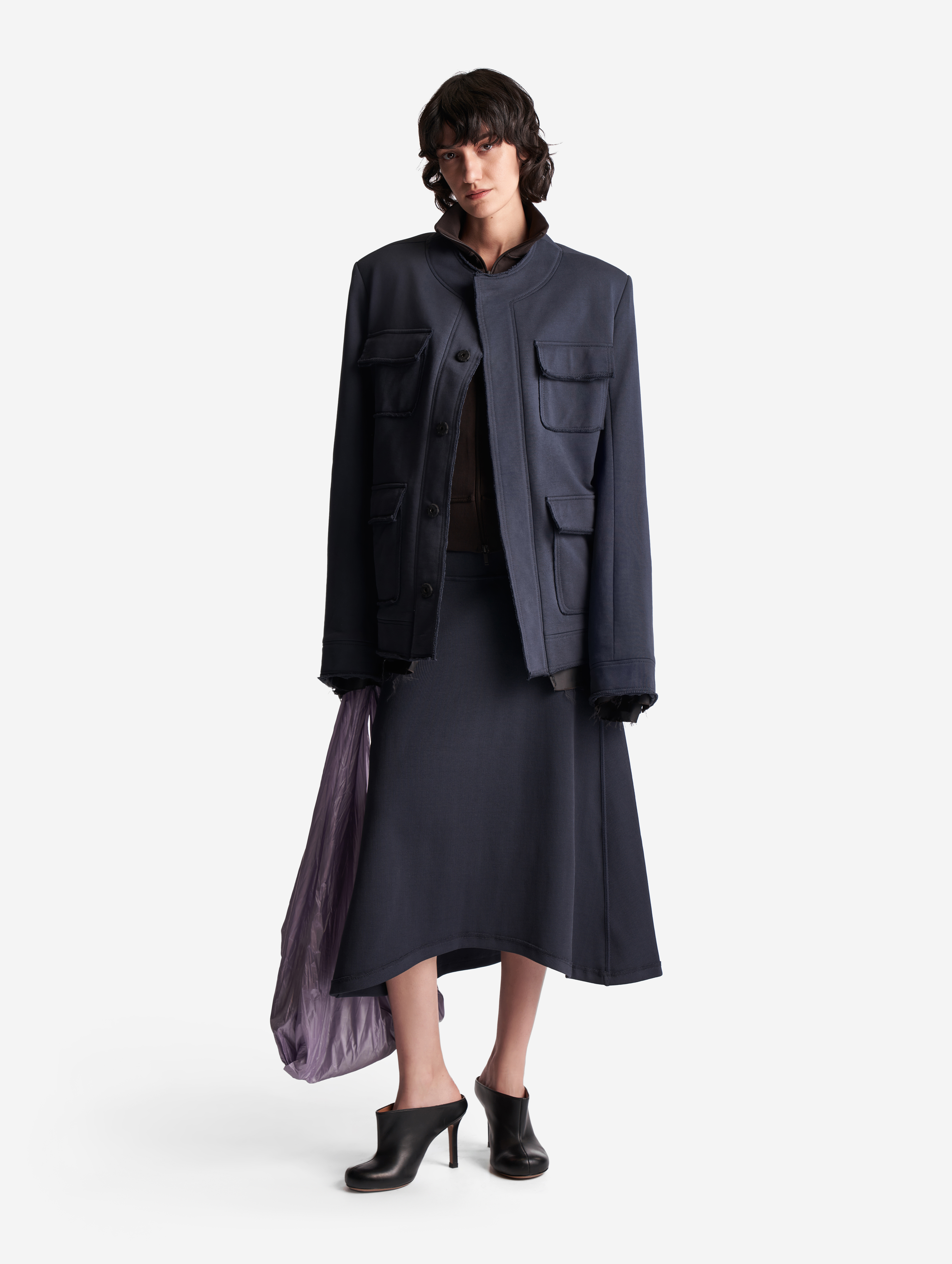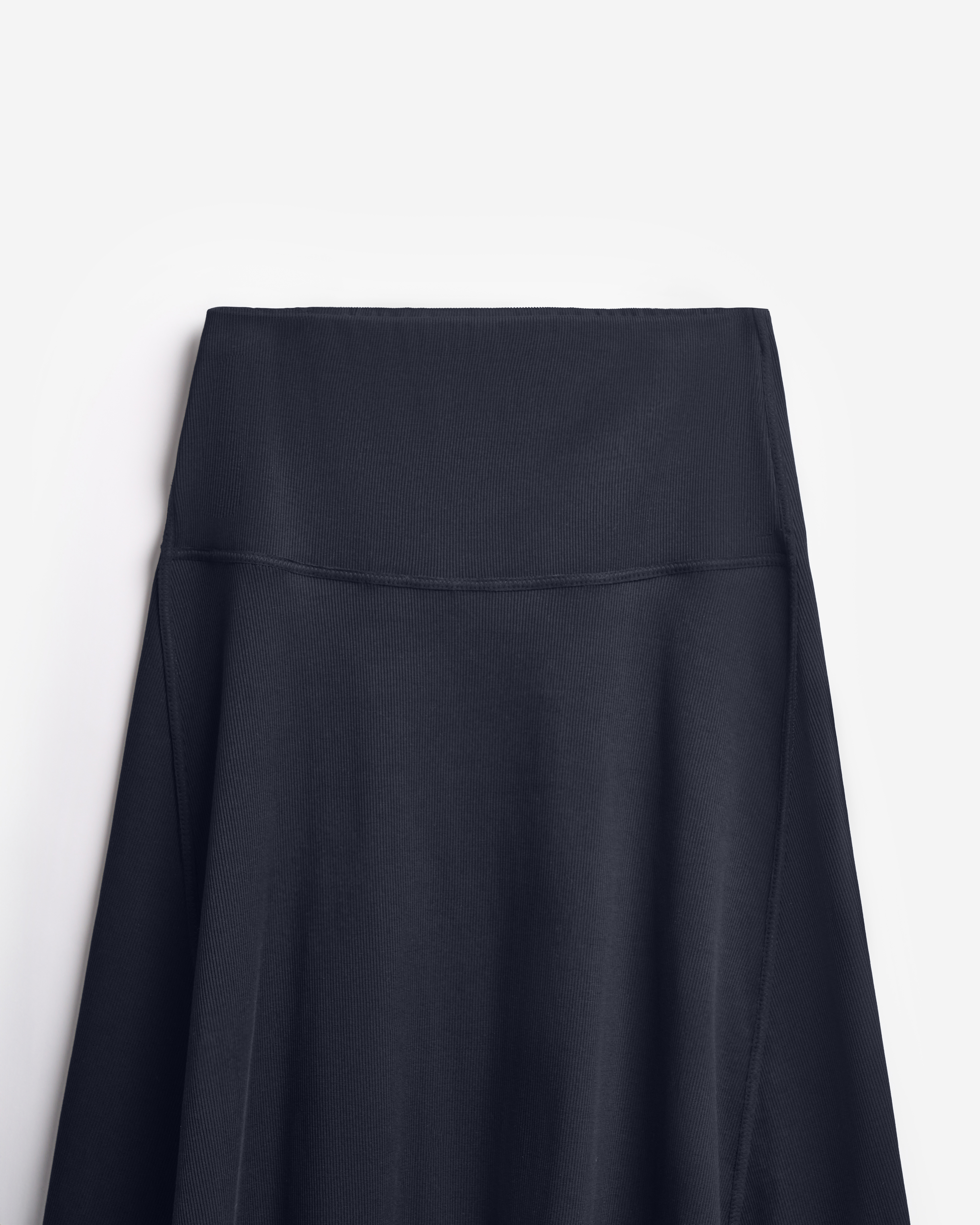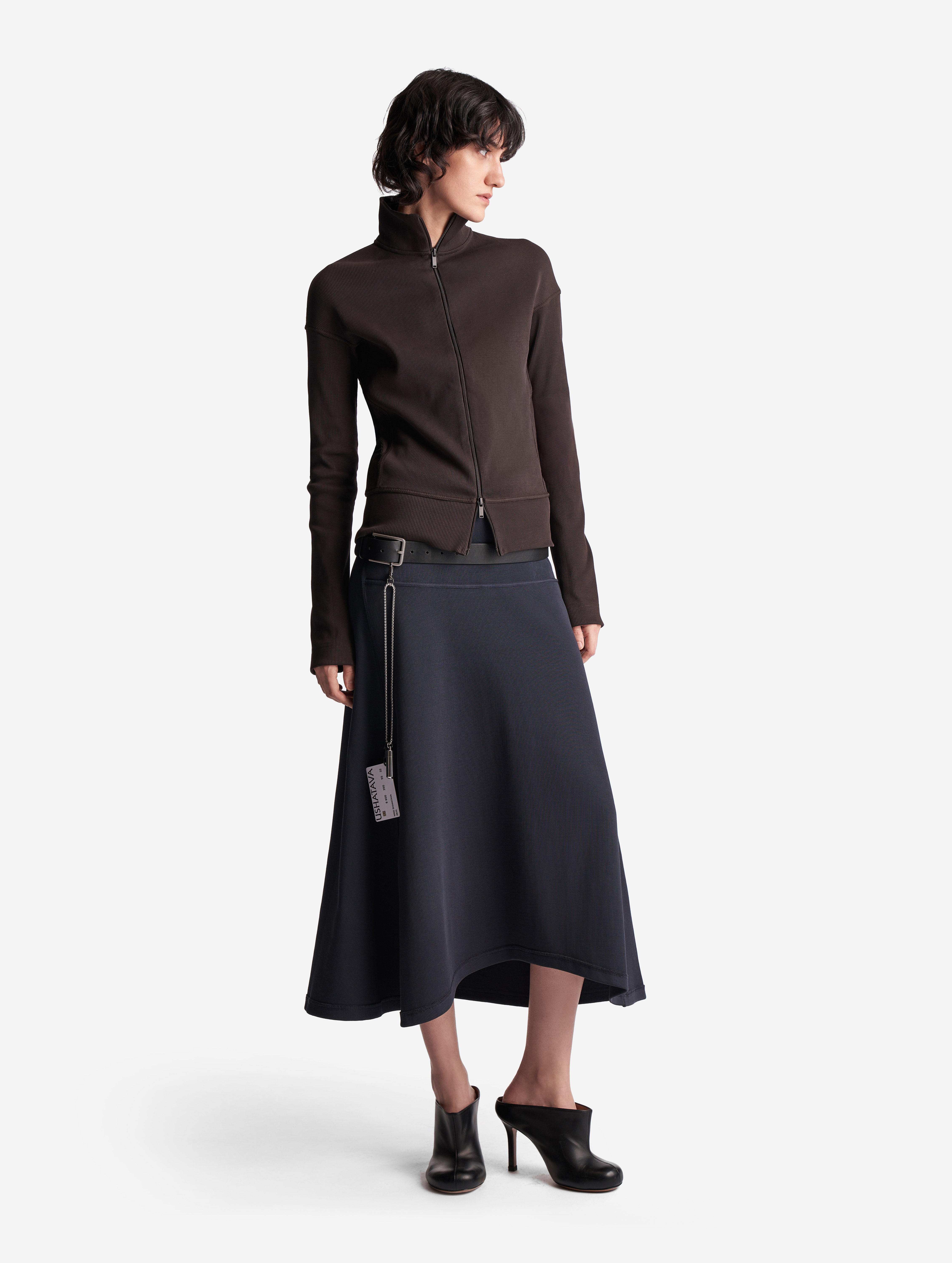 Неклассическая юбка годе из кашкорсе. Вставка из ткани в виде полусолнца формирует клинья, идущие от бедра. Юбку можно перекручивать, чтобы клинья формировались сзади или сбоку, — в любом положении она будет сидеть по фигуре. Все детали обработаны бретелечной резинкой для создания эффекта вывернутой наизнанку вещи — это один из ключевых дизайн-приемов Ushatava. Изделие застегивается на потайную молнию. Юбка украшена флажком с именем модного Дома.