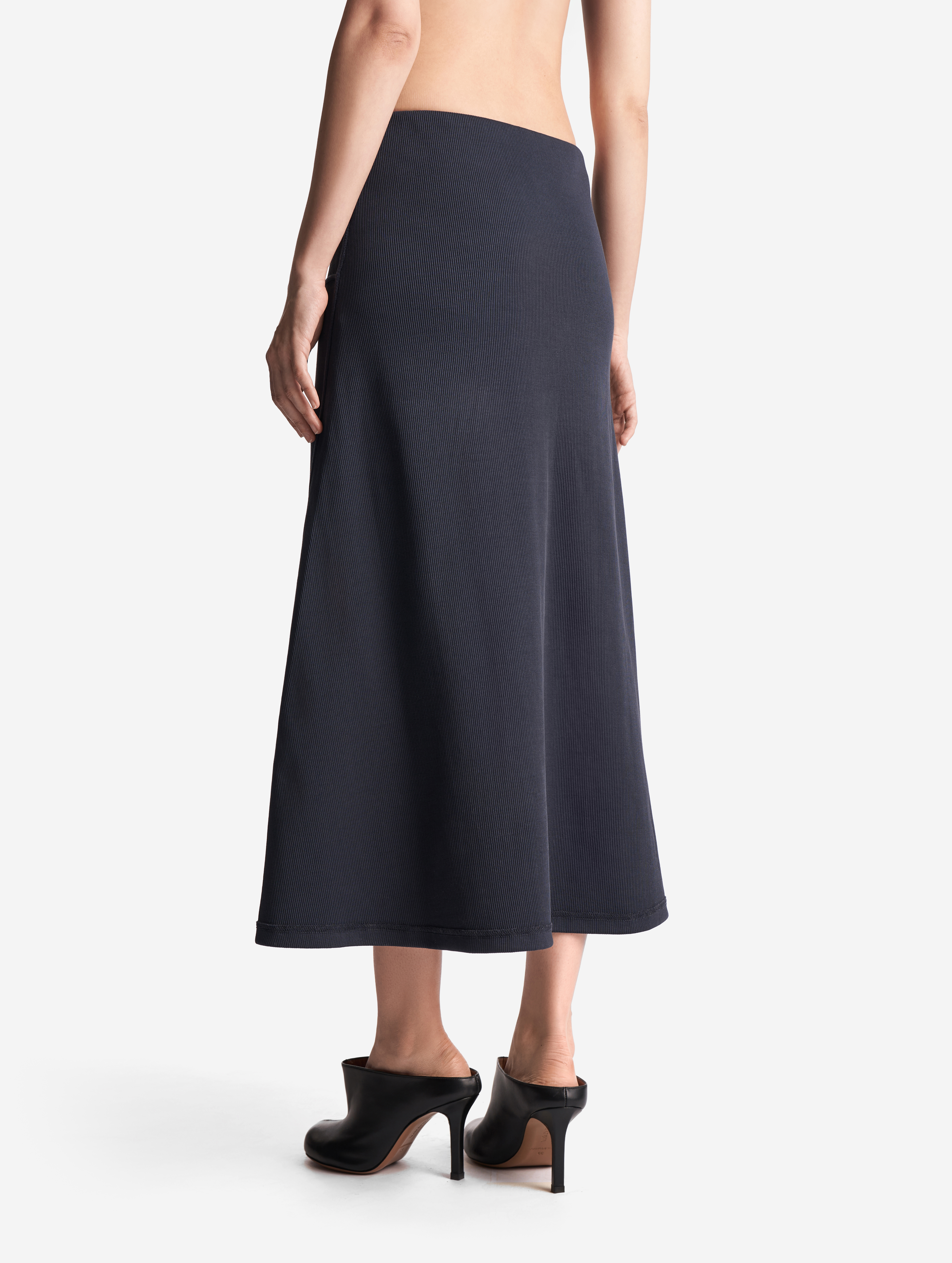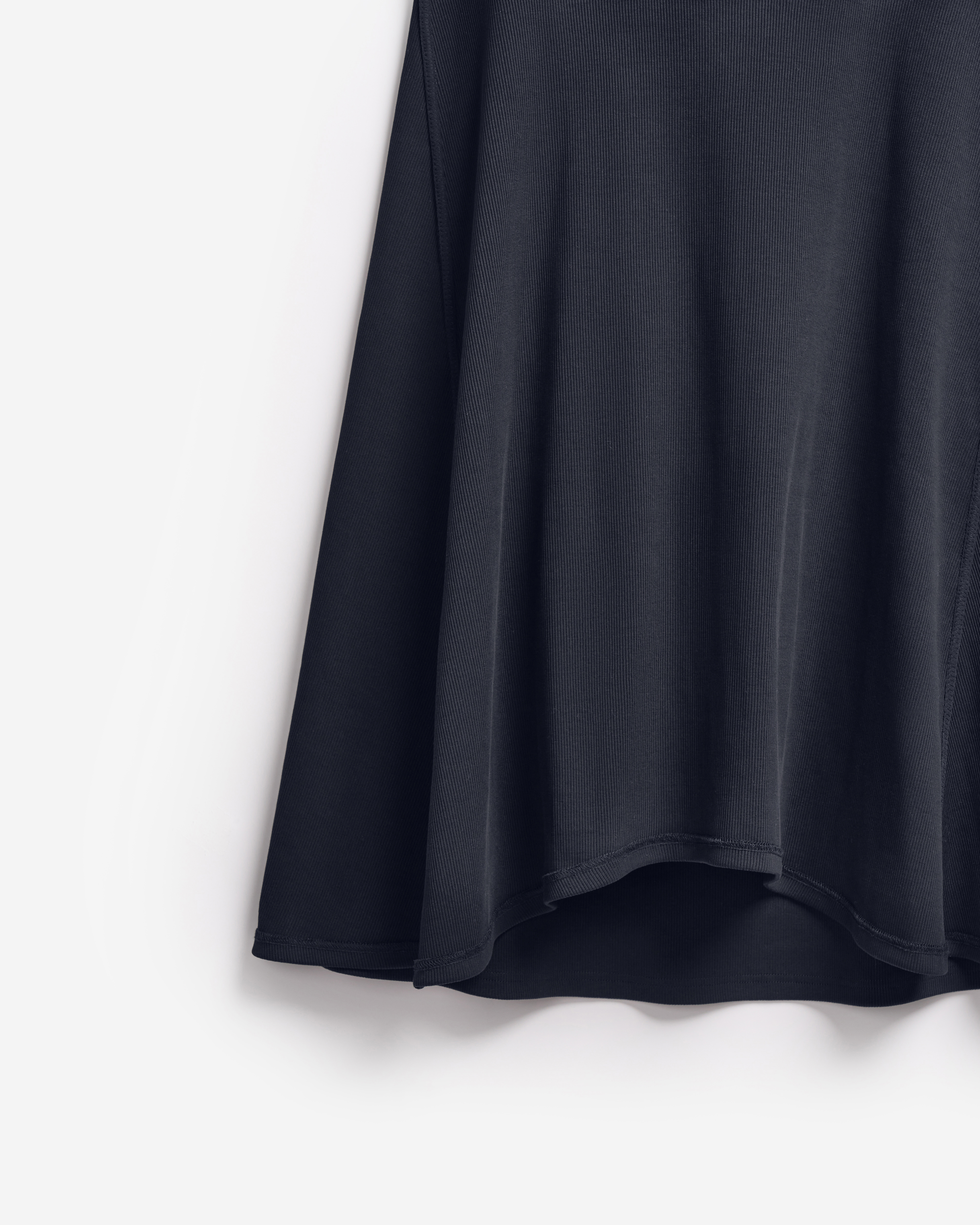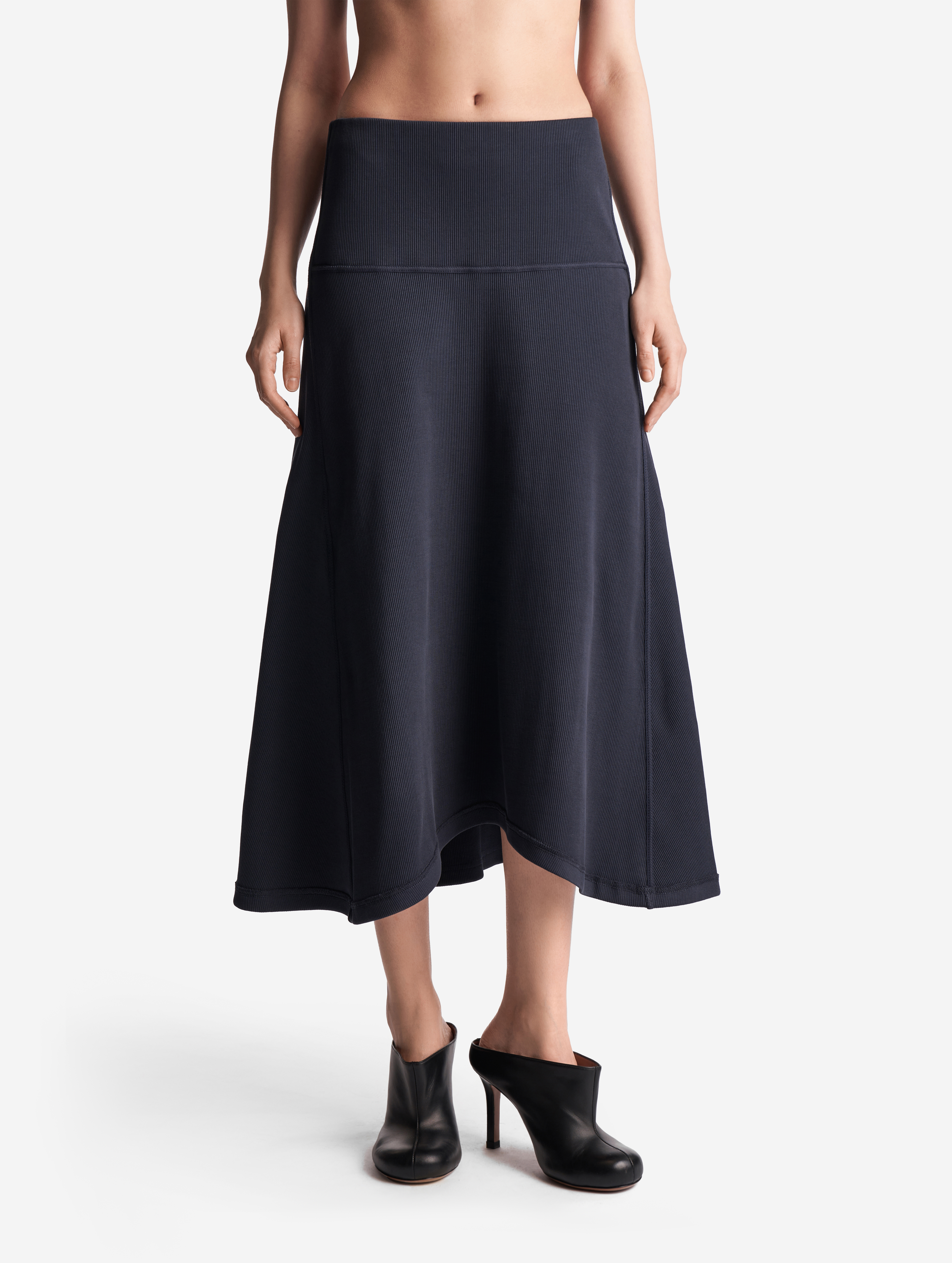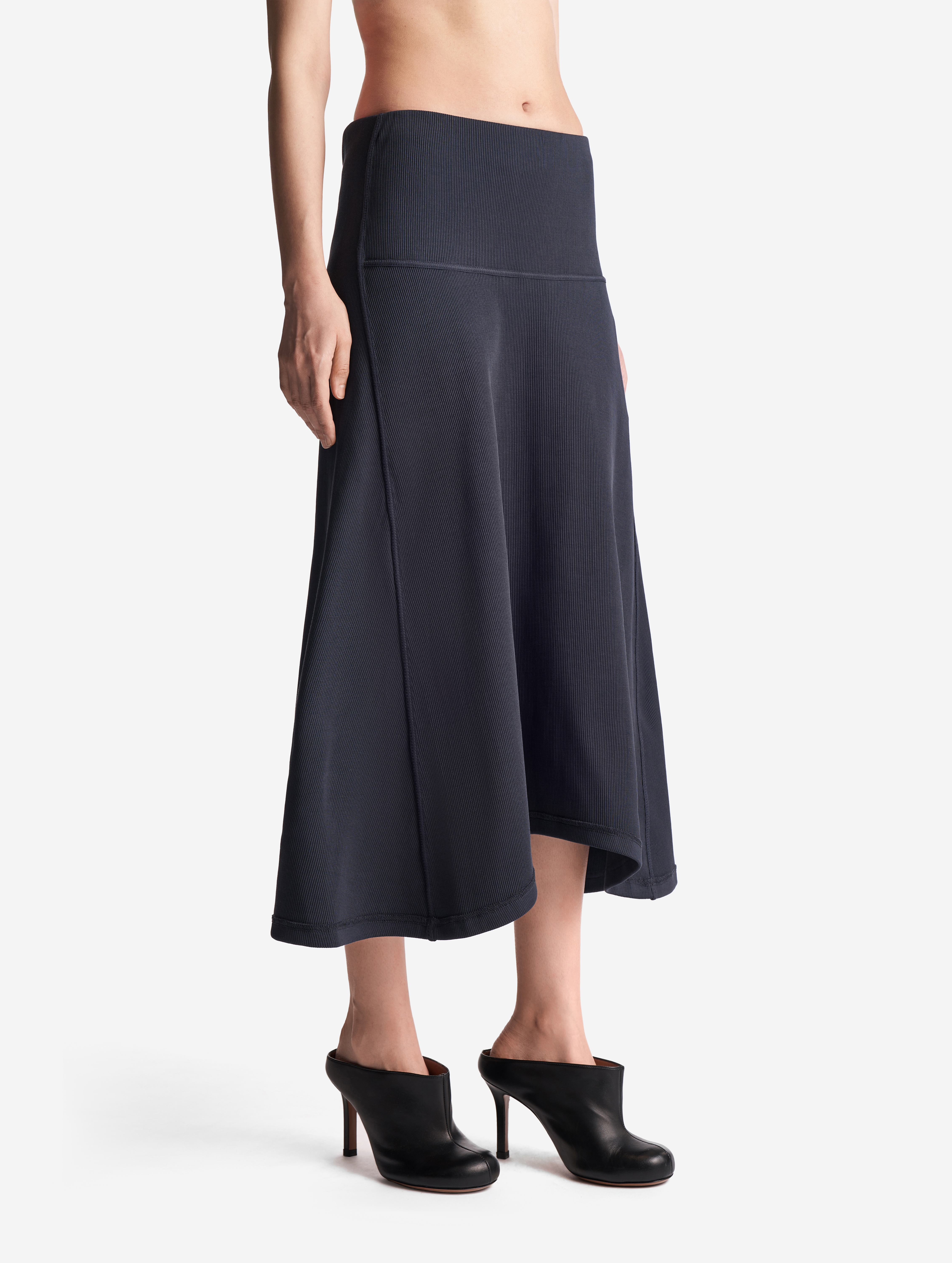 Неклассическая юбка годе из кашкорсе. Вставка из ткани в виде полусолнца формирует клинья, идущие от бедра. Юбку можно перекручивать, чтобы клинья формировались сзади или сбоку, — в любом положении она будет сидеть по фигуре. Все детали обработаны бретелечной резинкой для создания эффекта вывернутой наизнанку вещи — это один из ключевых дизайн-приемов Ushatava. Изделие застегивается на потайную молнию. Юбка украшена флажком с именем модного Дома.