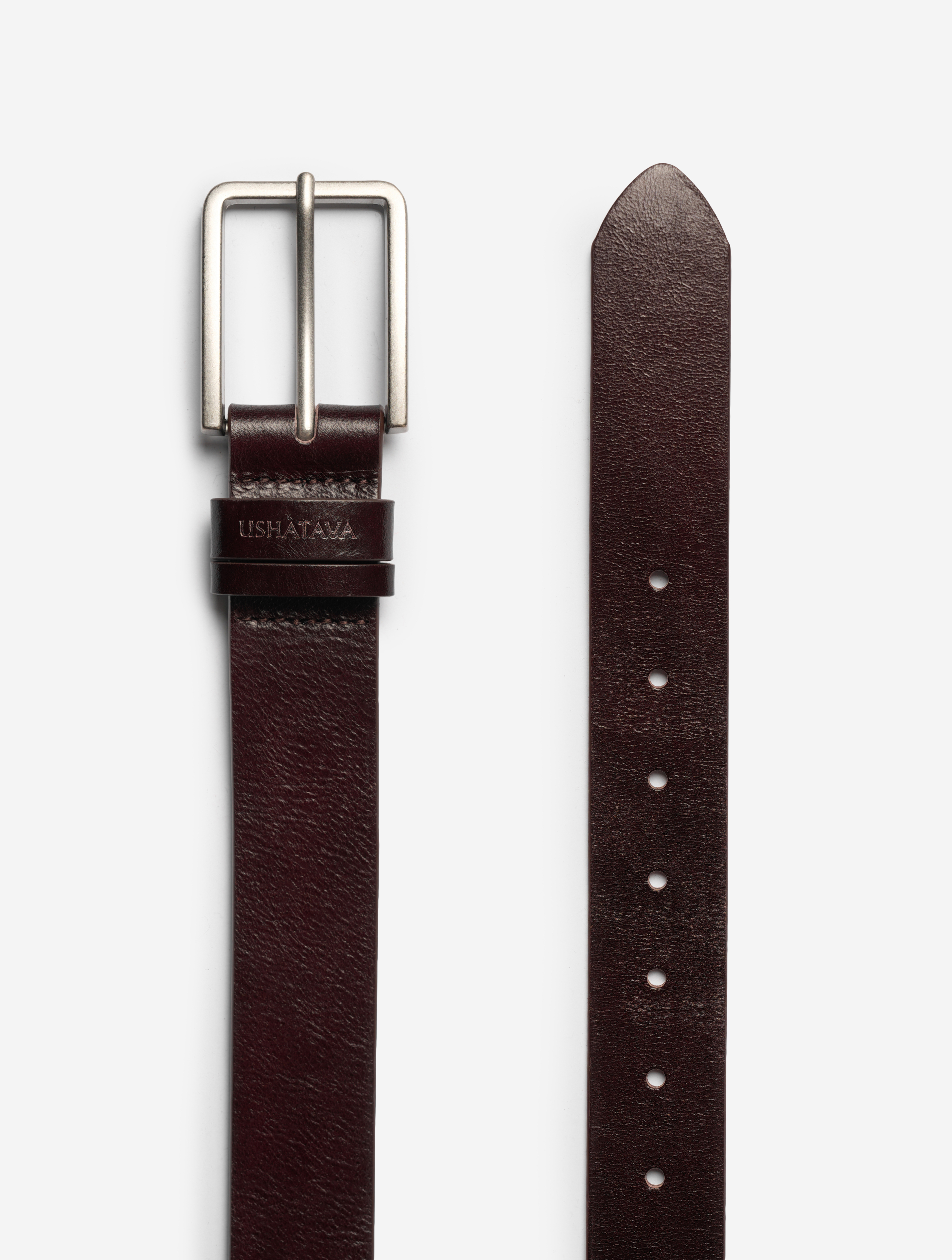 Ремень Ushatava выполнен из натуральной гладкой кожи. Застегивается на металлическую пряжку — минималистичную, со стальным отблеском. Для ремня также была разработана упаковка, в которой его можно презентовать как подарок.