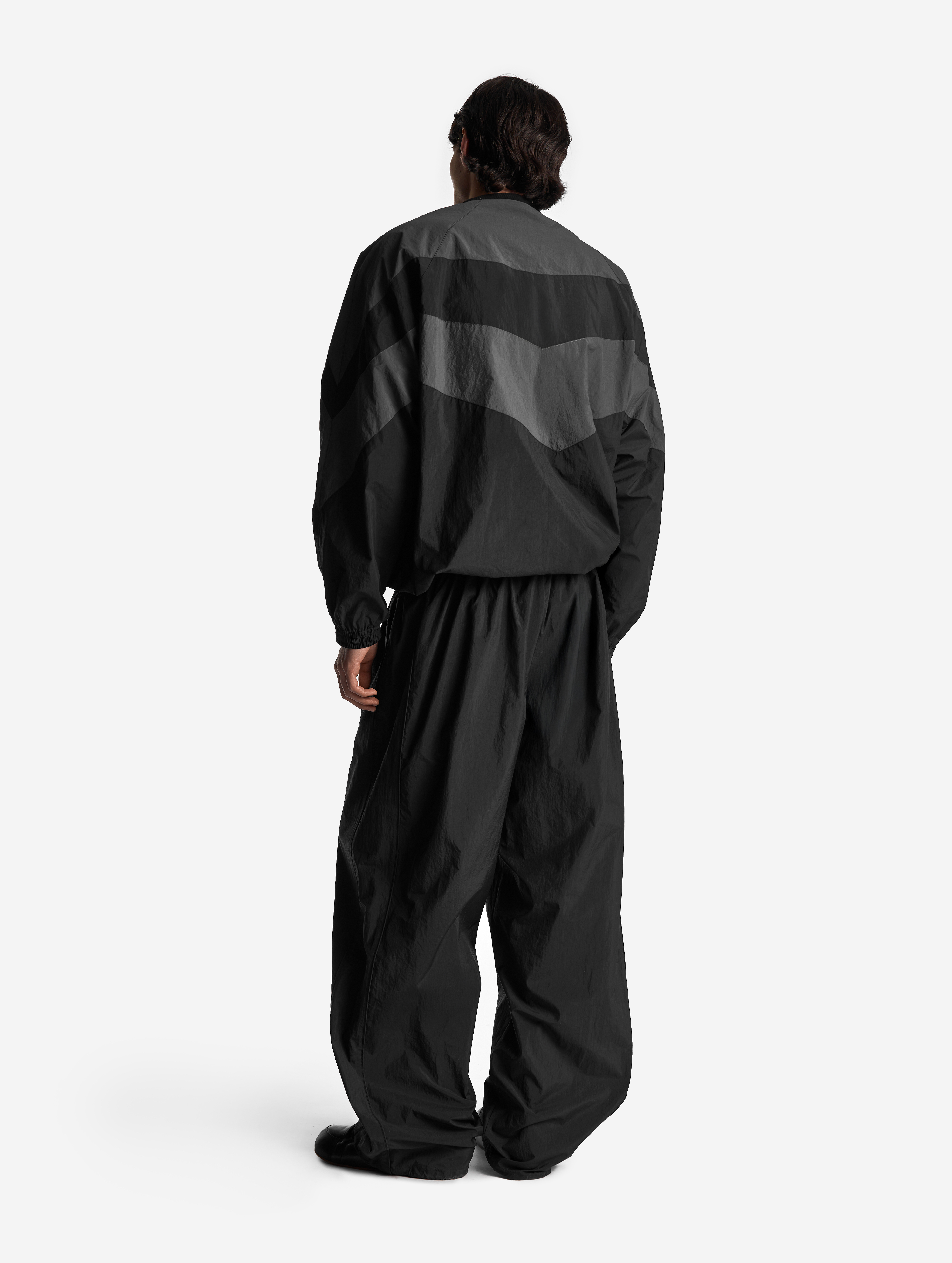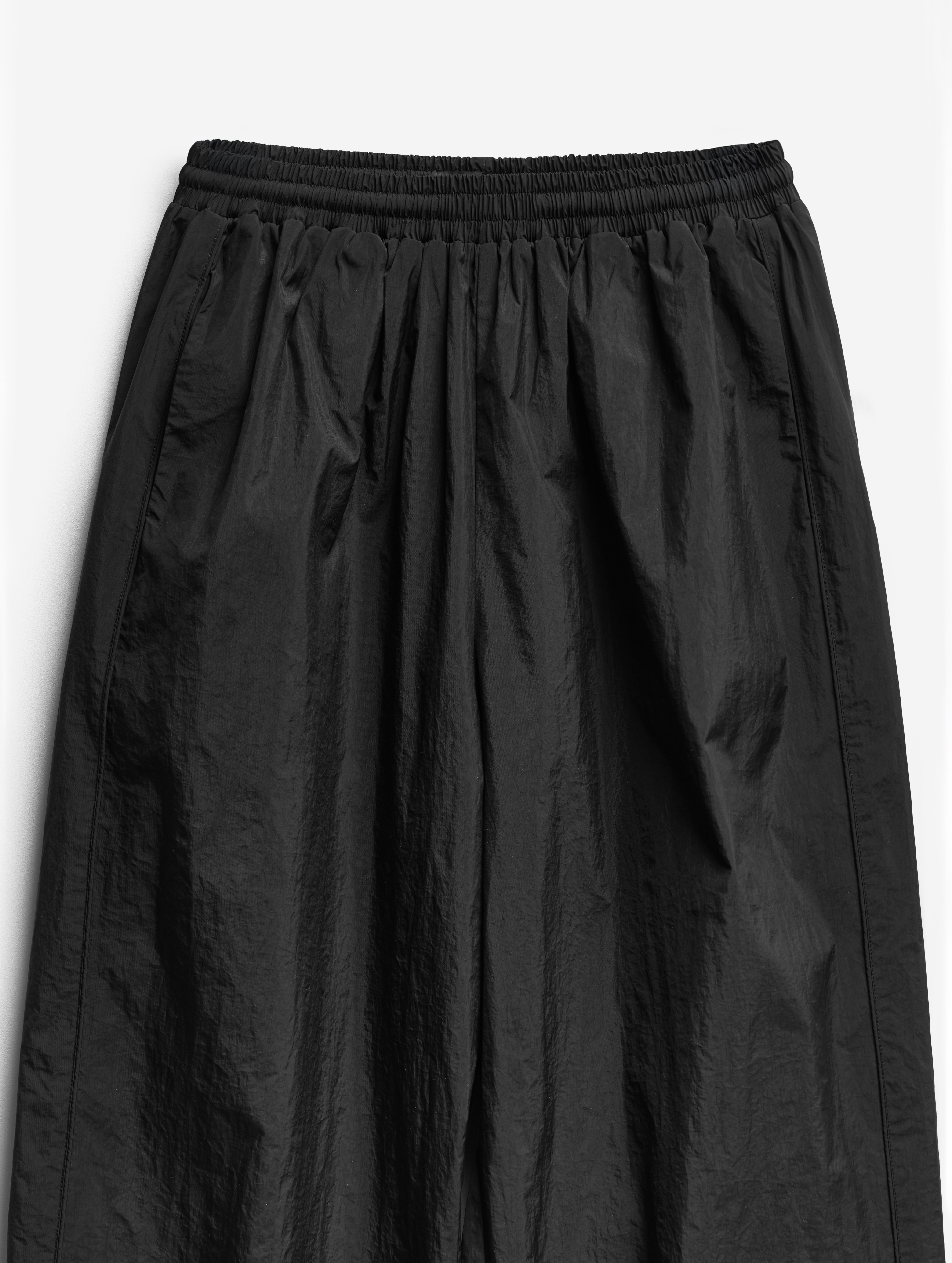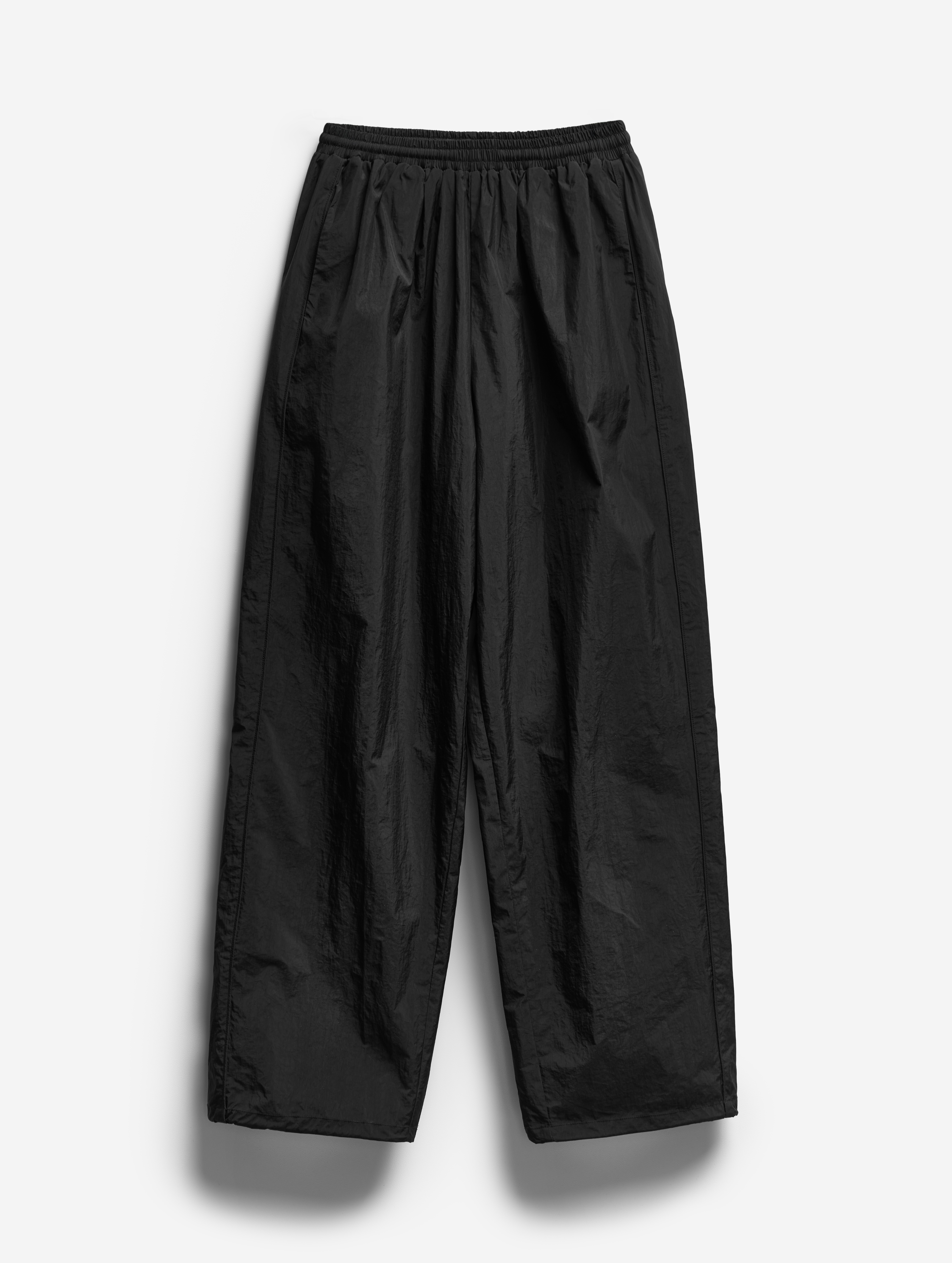Широкие брюки из тонкого плащевого нейлона с шероховатой фактурой — нового материала в линии Garderobe. Эта модель в том числе подходит для занятий спортом: у брюк удобный мягкий пояс на резинке с внутренним шнурком, есть частичный подклад из спортивной сетки, низ брючин обработан кулиской со шляпной резинкой на держателях, присутствуют два кармана. Как и в классических спортивных брюках, в этом изделии боковые швы украшают канты.