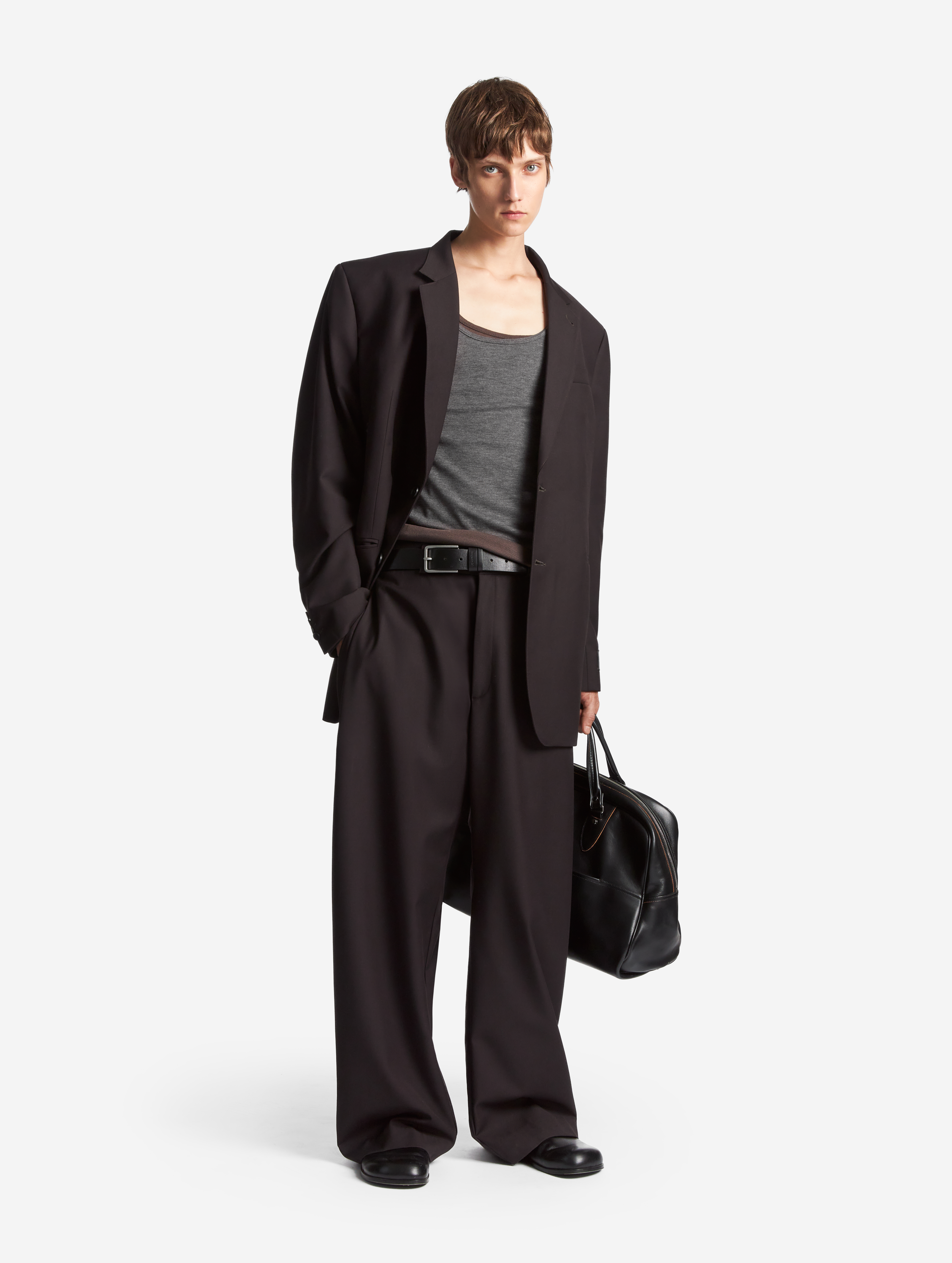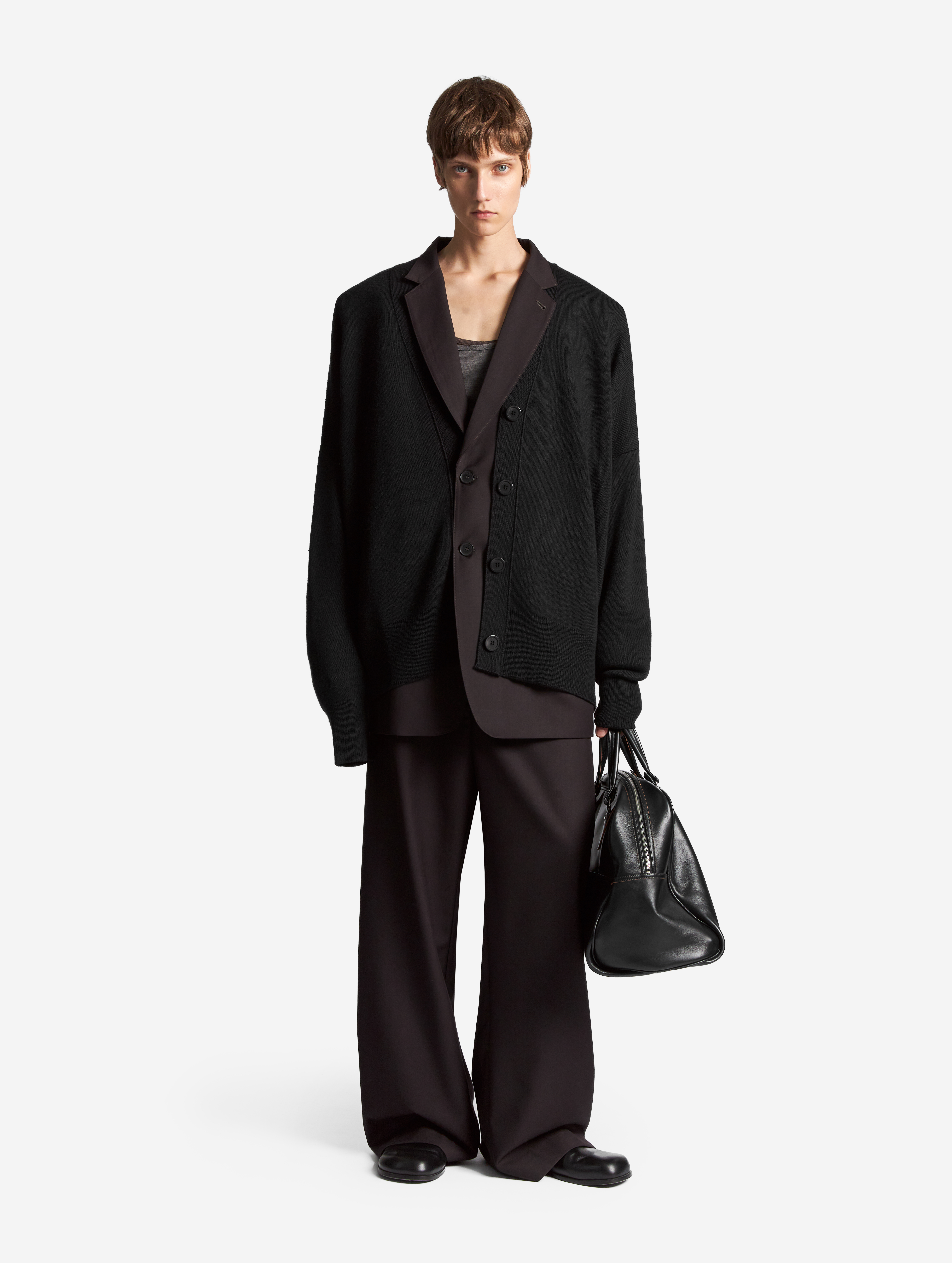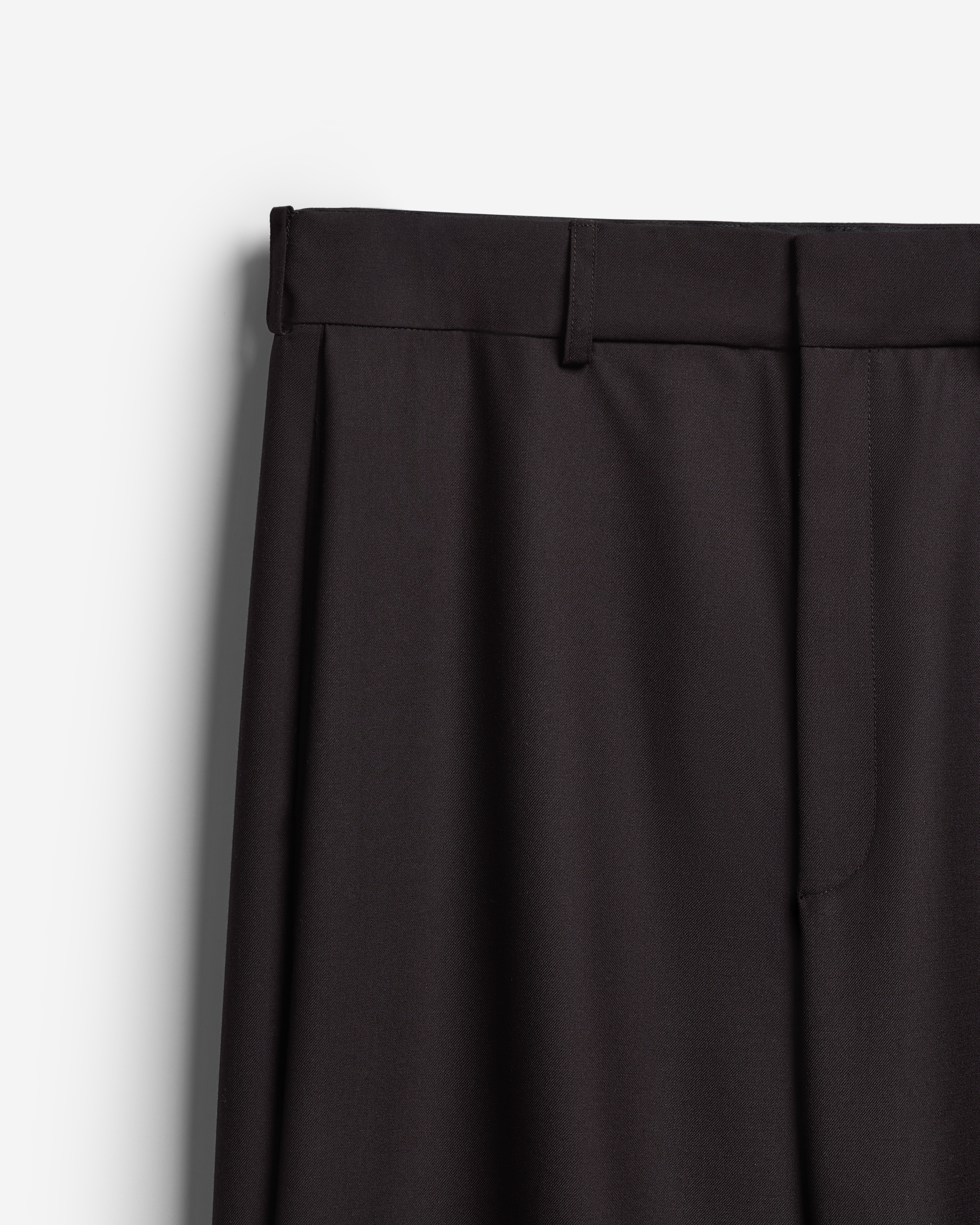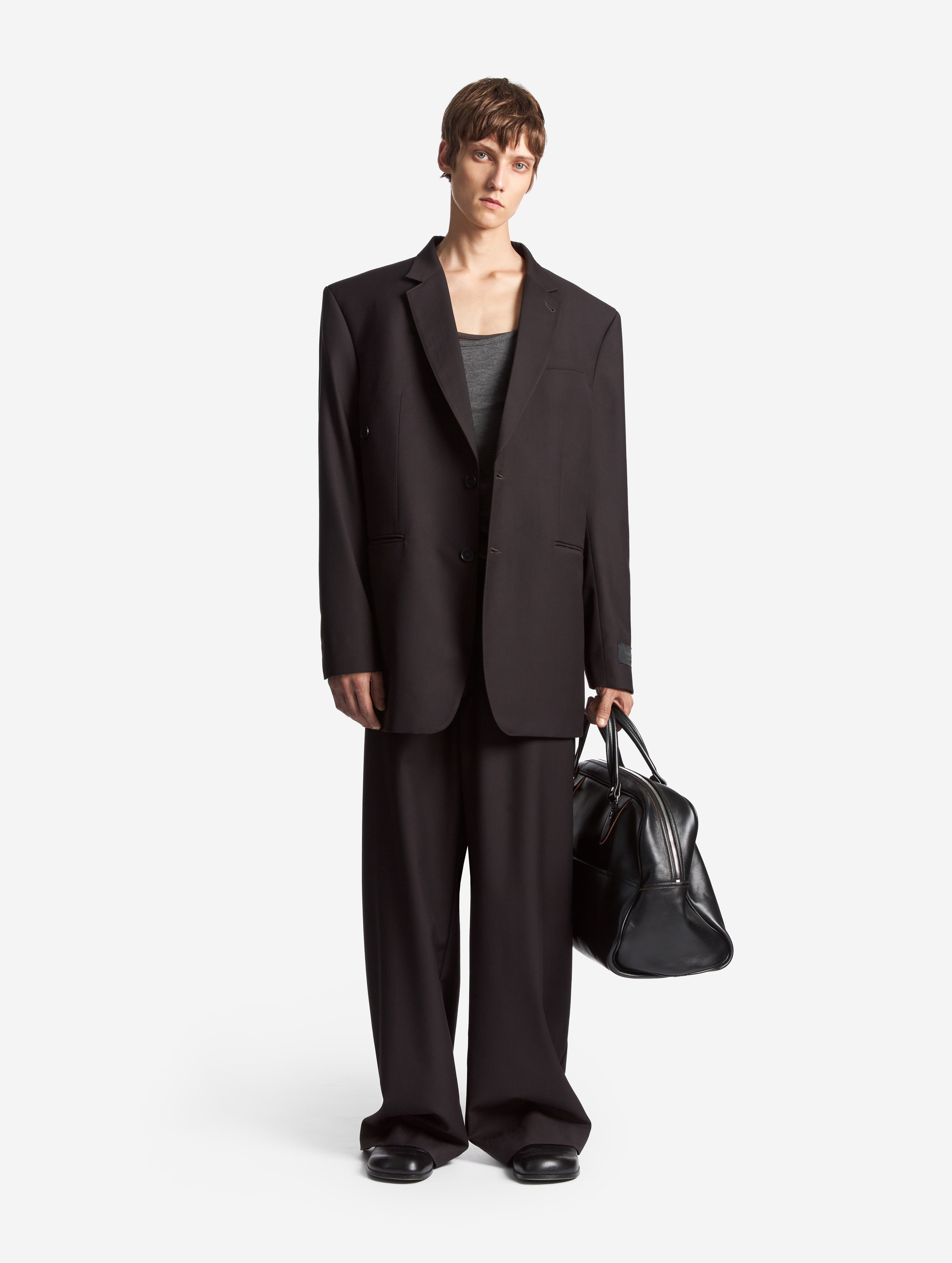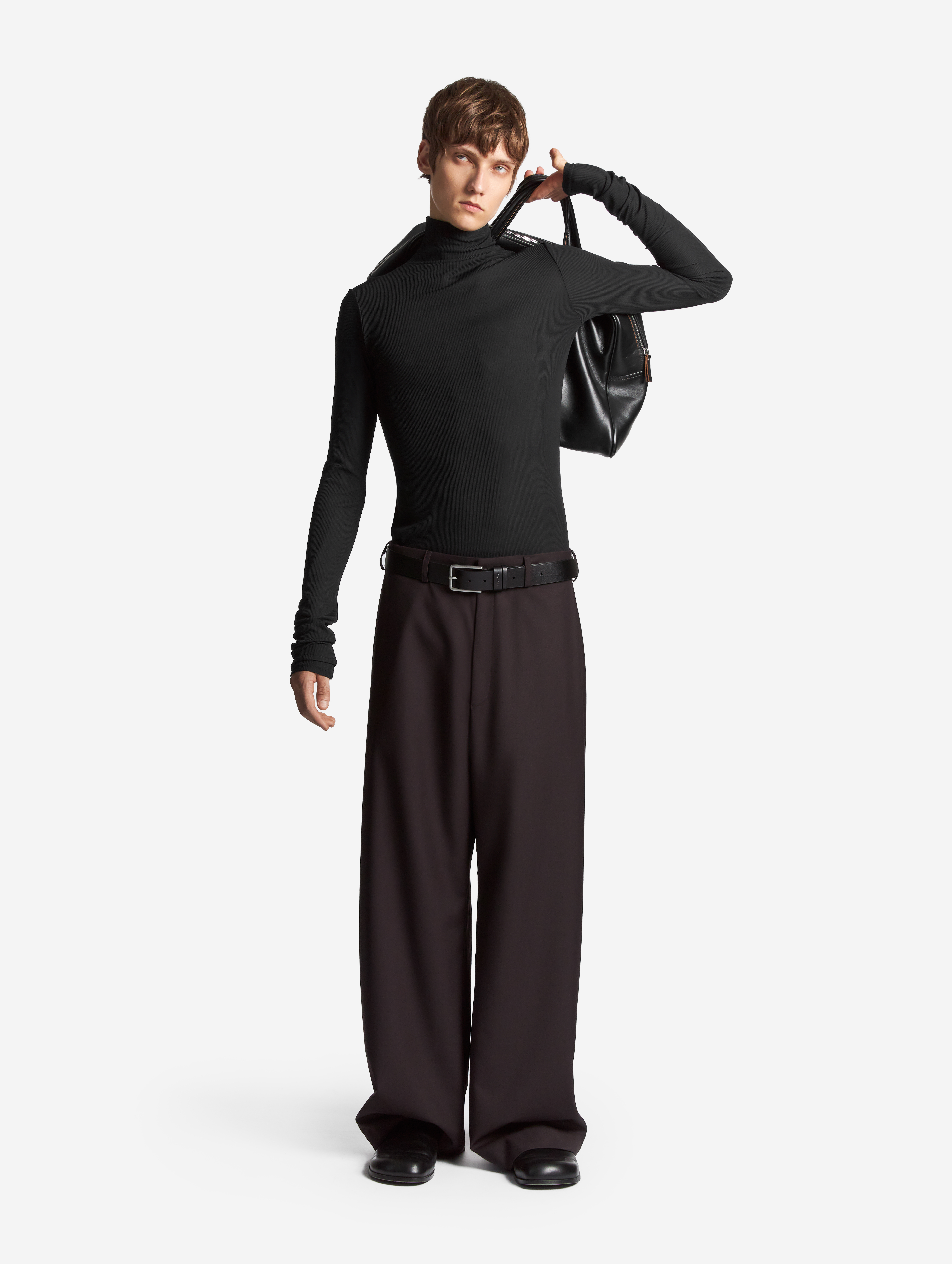 Новая версия широких брюк-бананов, давно ставших классикой модного Дома. Брюки сохранили характерный силуэт: они заужены книзу, но стали более объемными. У изделия есть два кармана, спрятанных в объеме боковых складок. Брюки застегиваются на молнию и брючный крючок.