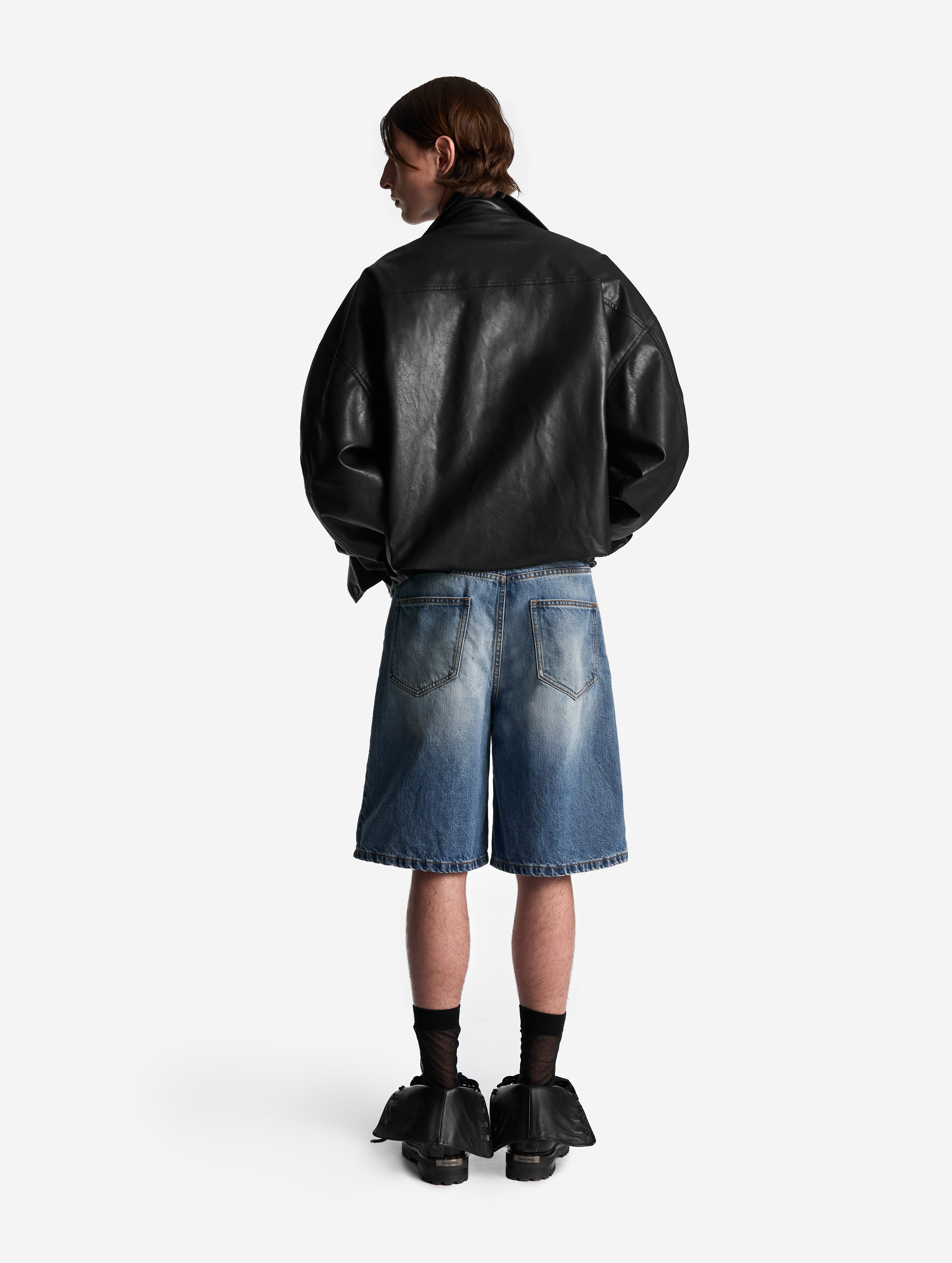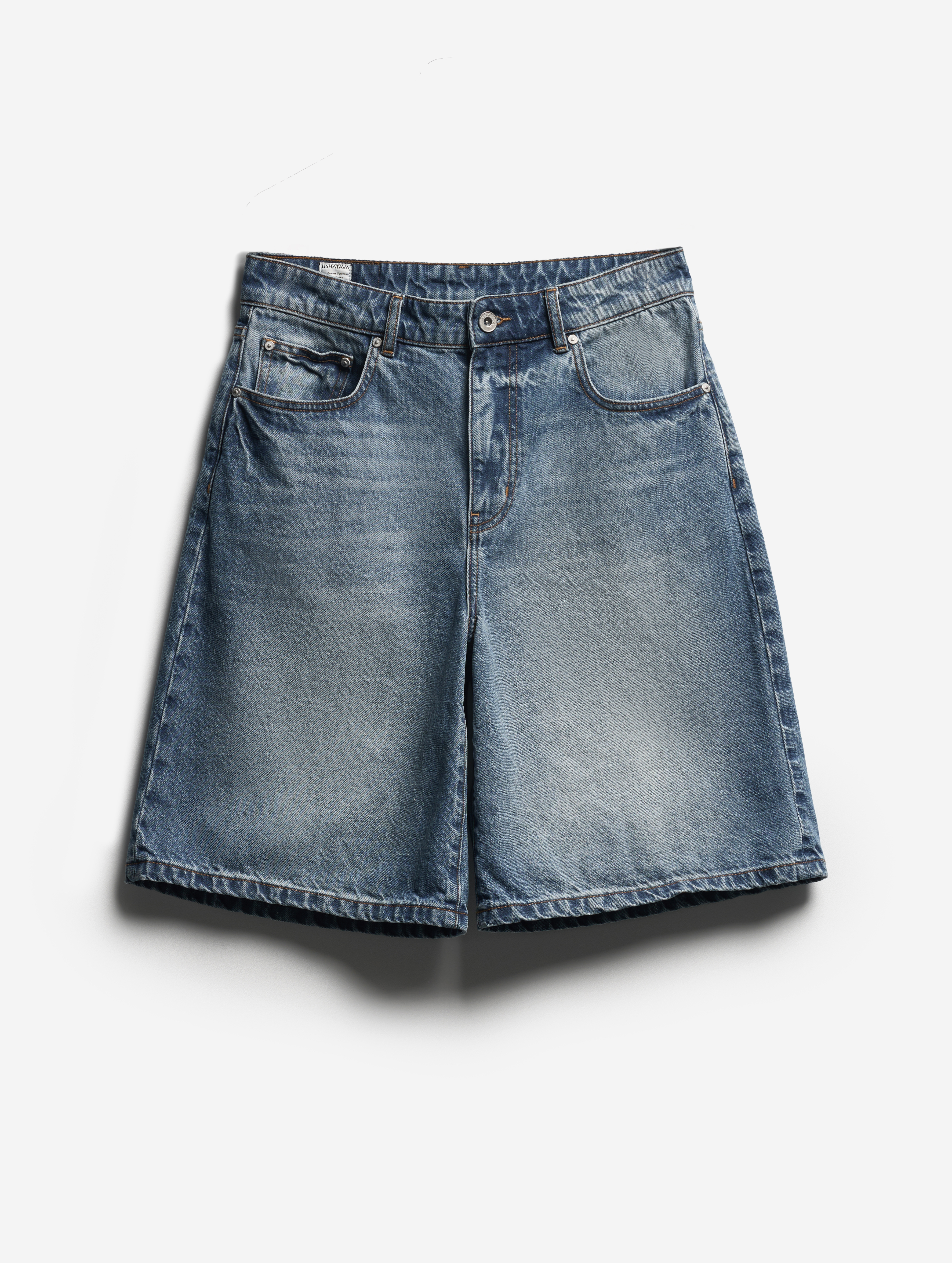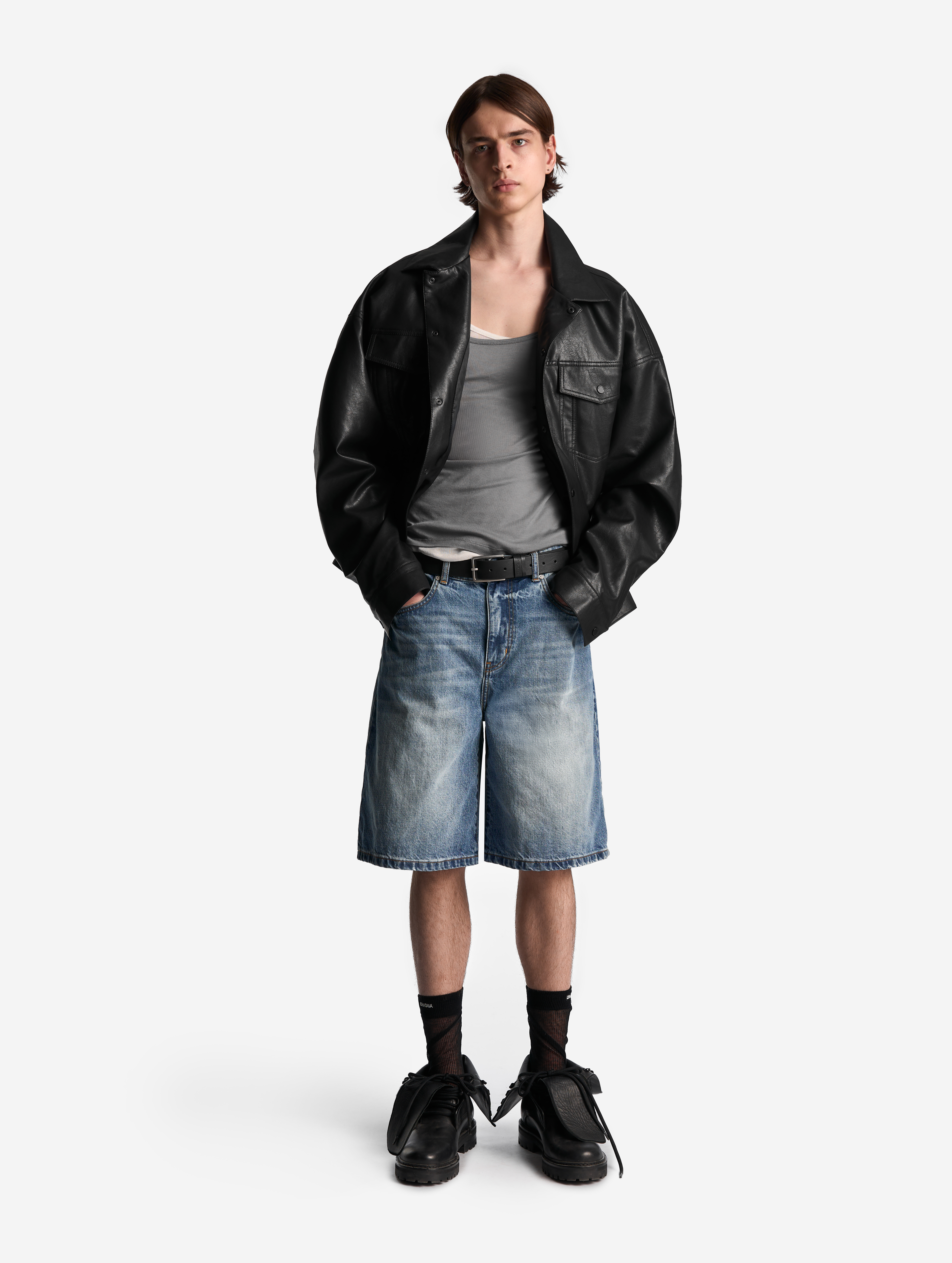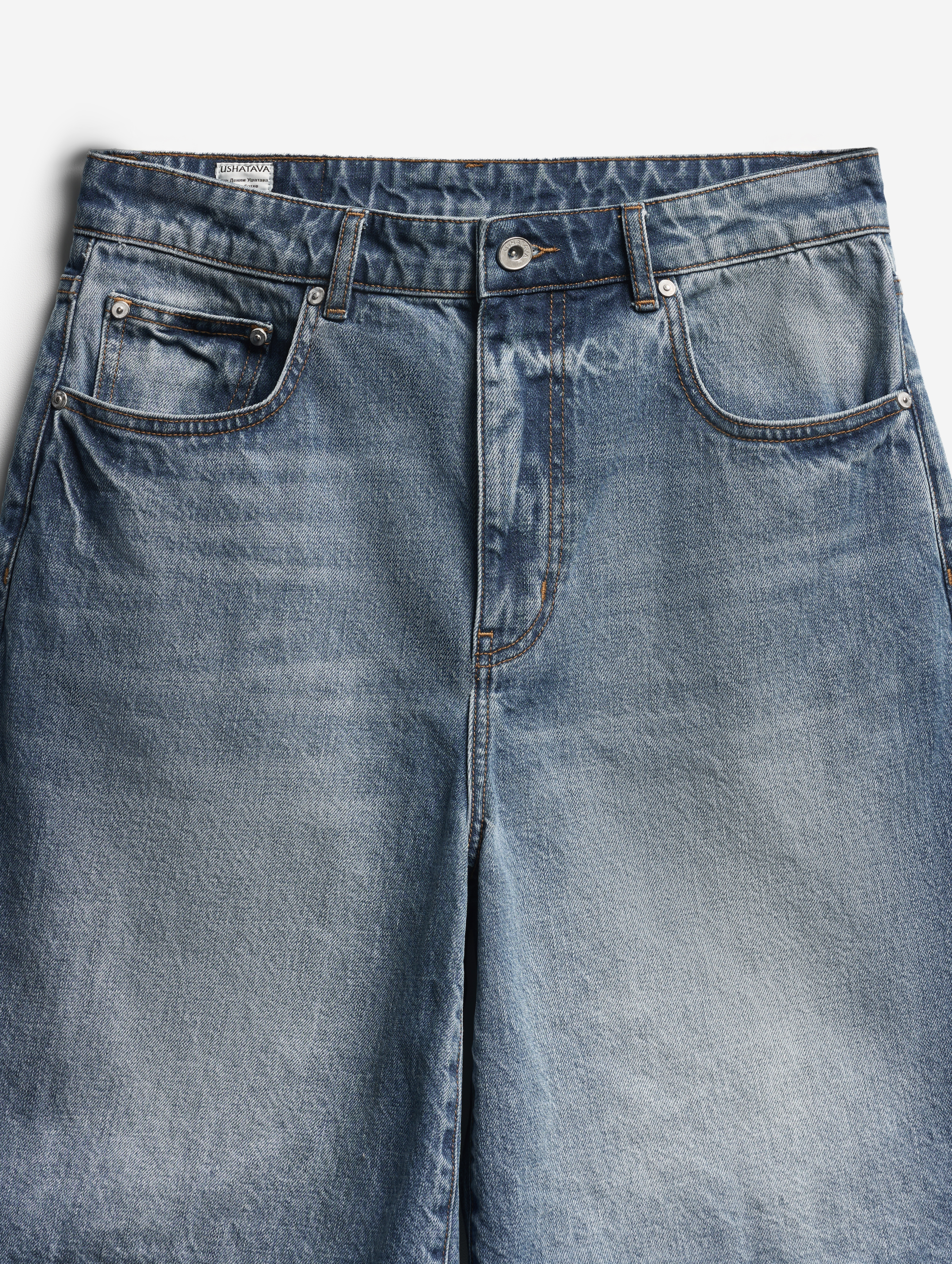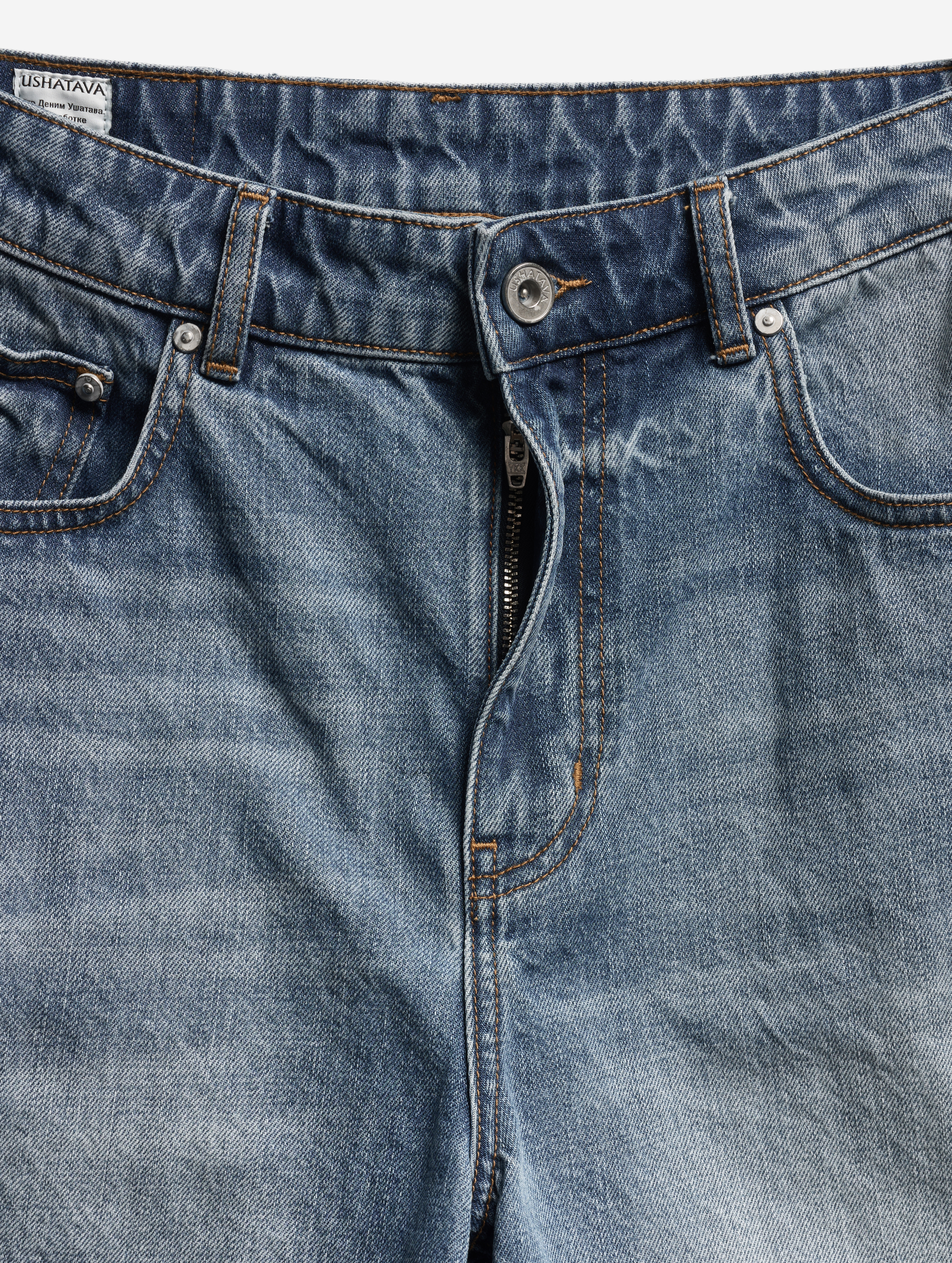 У этой модели прямой крой и расслабленная средняя посадка. Поверхность шорт покрыта потертостями, расположенными согласно анатомии владельца вещи. Есть два кармана и один маленький для зажигалки спереди, а также два кармана сзади. Все изделия из линейки денима Ushatava маркируются только буквенной размерной сеткой и позиционируются нами как унисекс. Модель застегивается на молнию и металлическую джинсовую пуговицу. Есть шлевки для ремня.