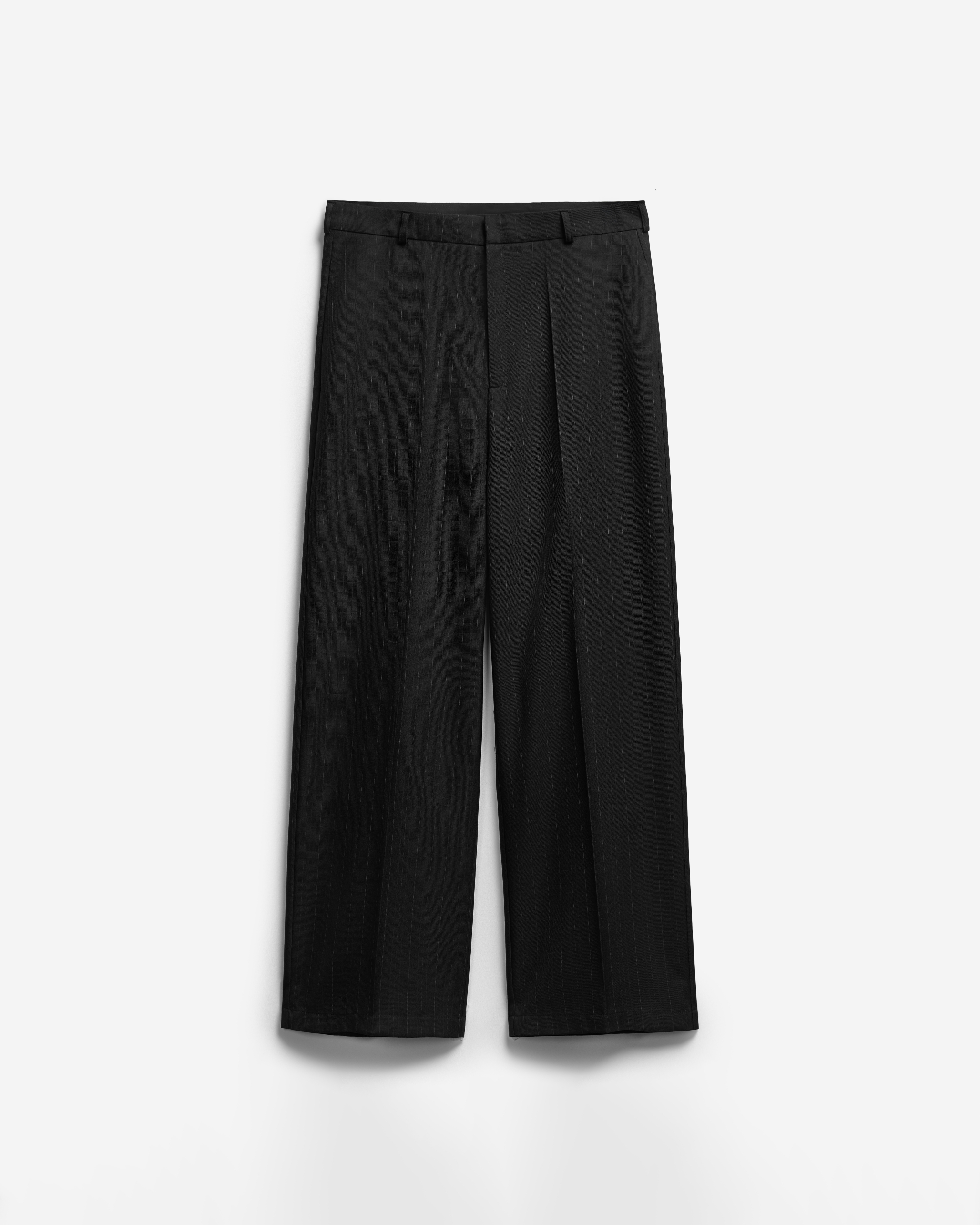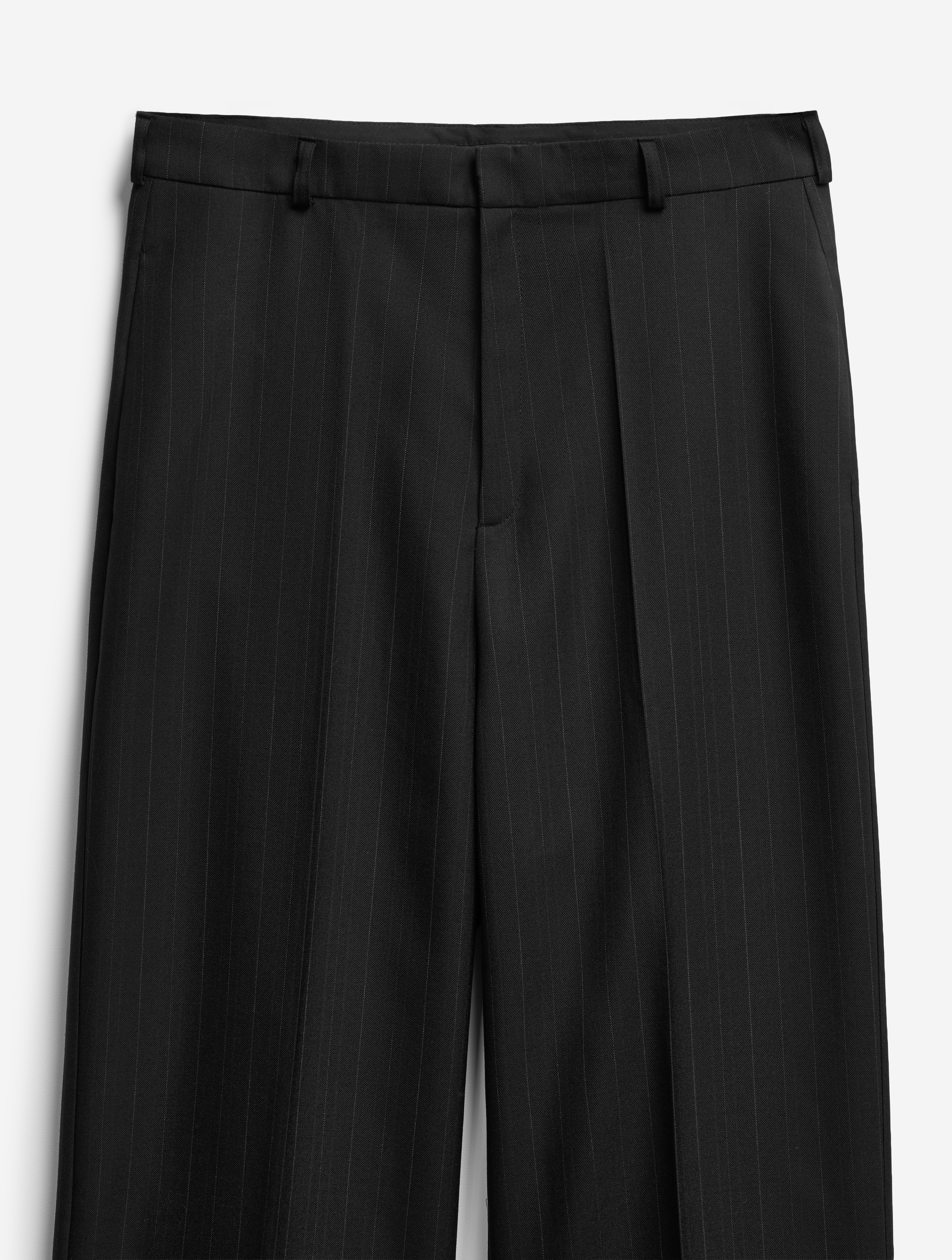 Строгие костюмные брюки в интерпретации Ushatava. У них универсальная посадка, прямой крой, пояс со шлевками, обработанный корсажной лентой, неразглаживаемые стрелки, застежка на молнию и крючок, два функциональных кармана спереди и один сзади. Брюки выполнены из костюмной полушерсти в тонкую полоску.