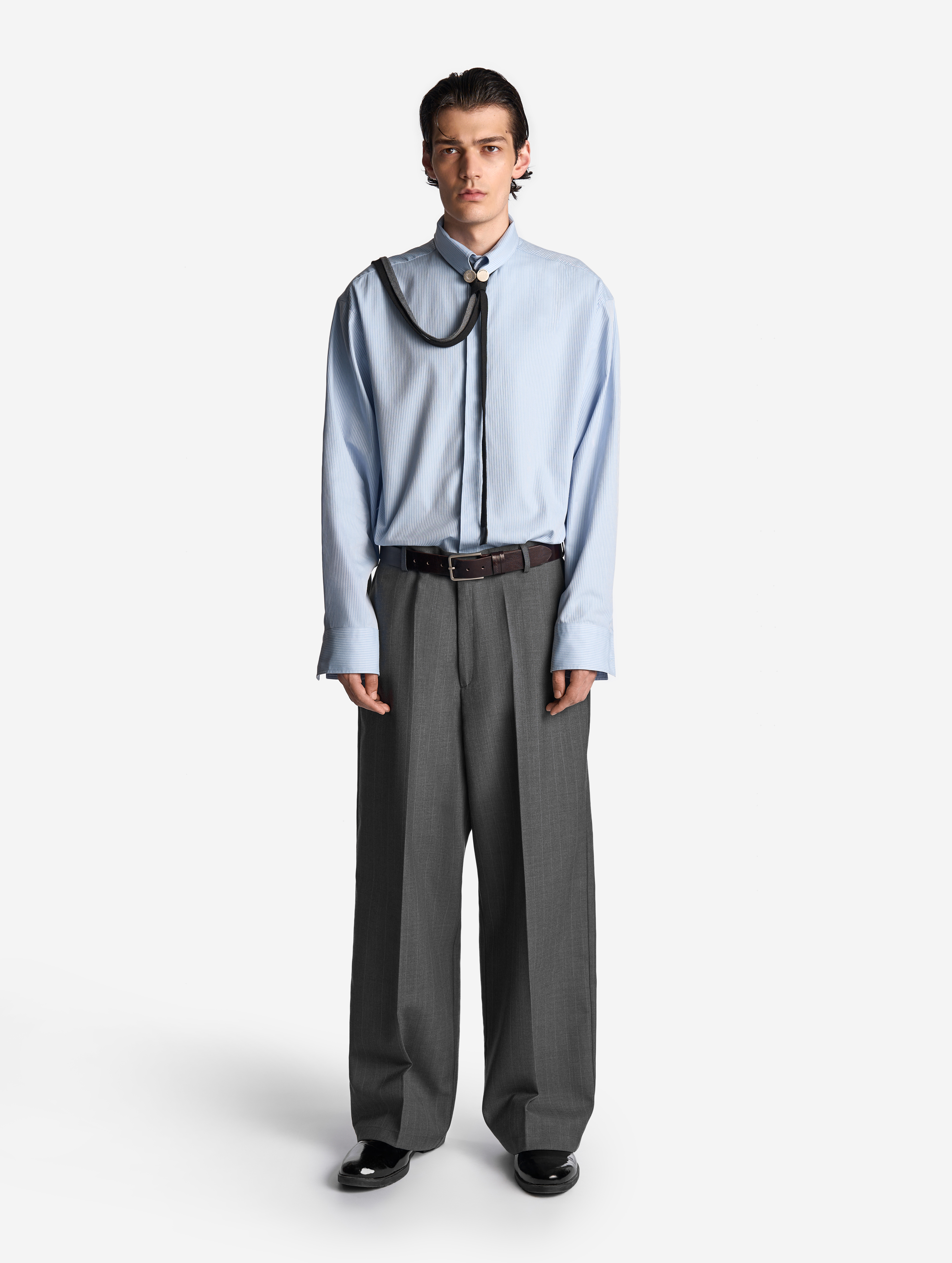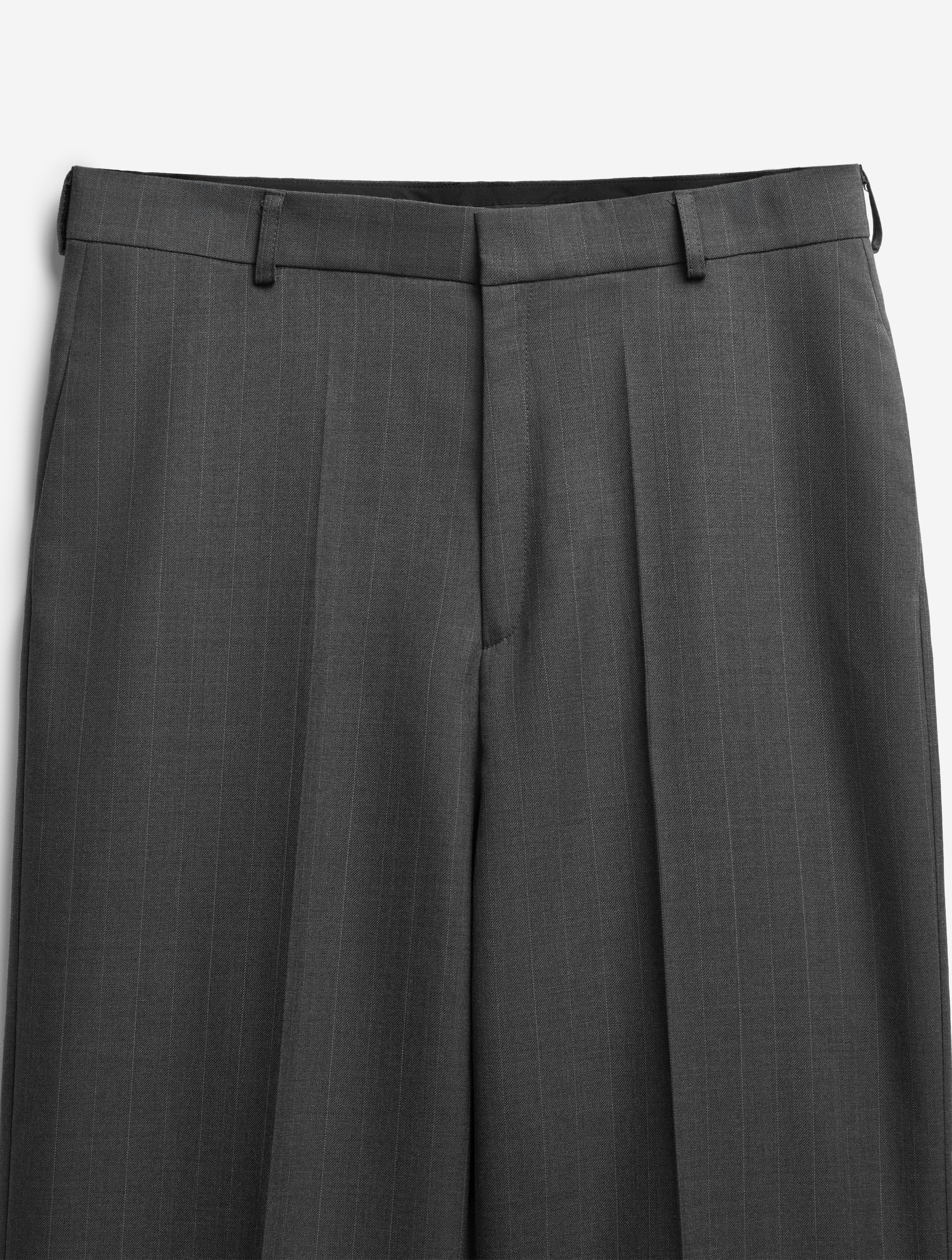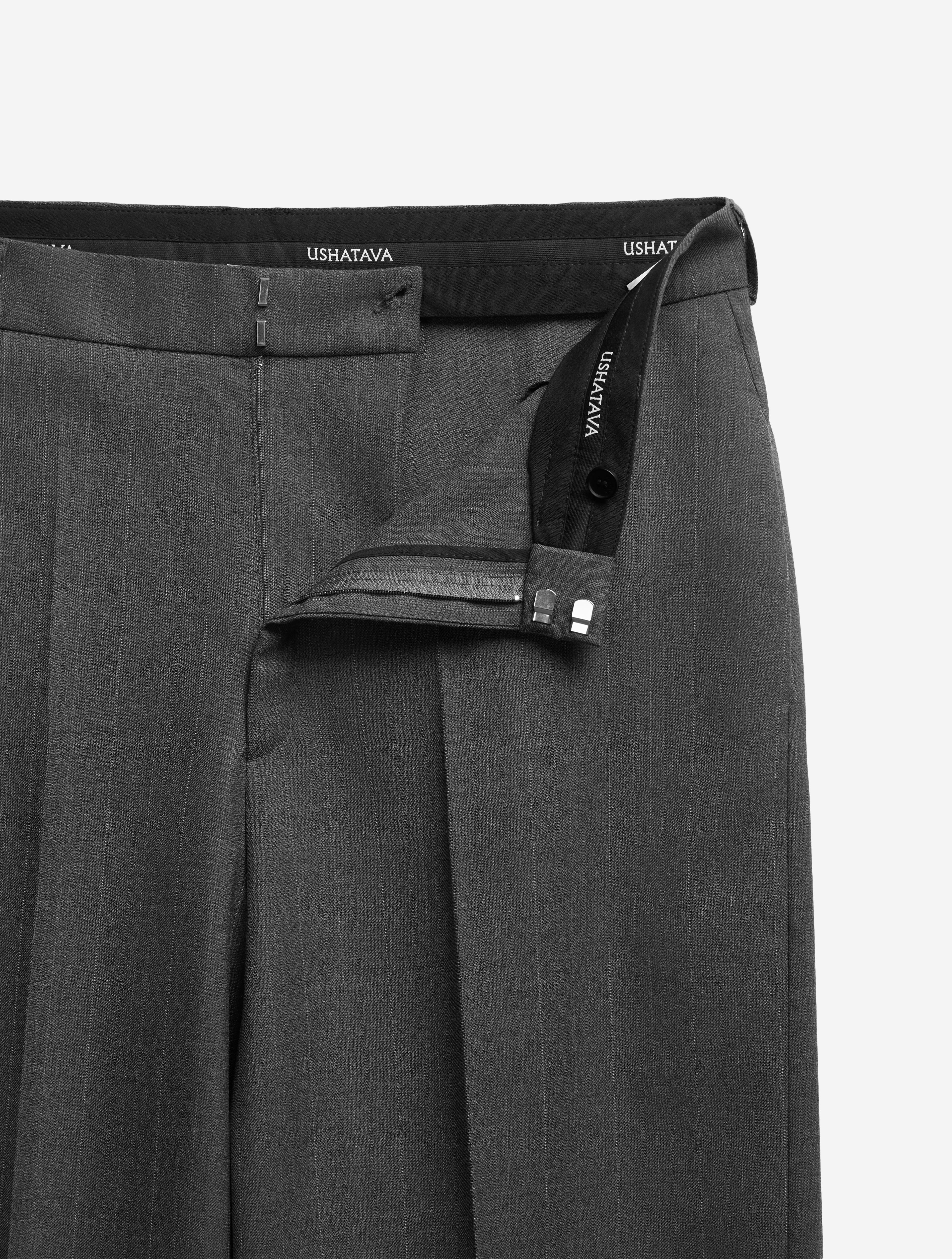 Строгие костюмные брюки в интерпретации Ushatava. У них универсальная посадка, прямой крой, пояс со шлевками, обработанный корсажной лентой, неразглаживаемые стрелки, застежка на молнию и крючок, два функциональных кармана спереди и один сзади. Брюки выполнены из костюмной полушерсти в тонкую полоску.