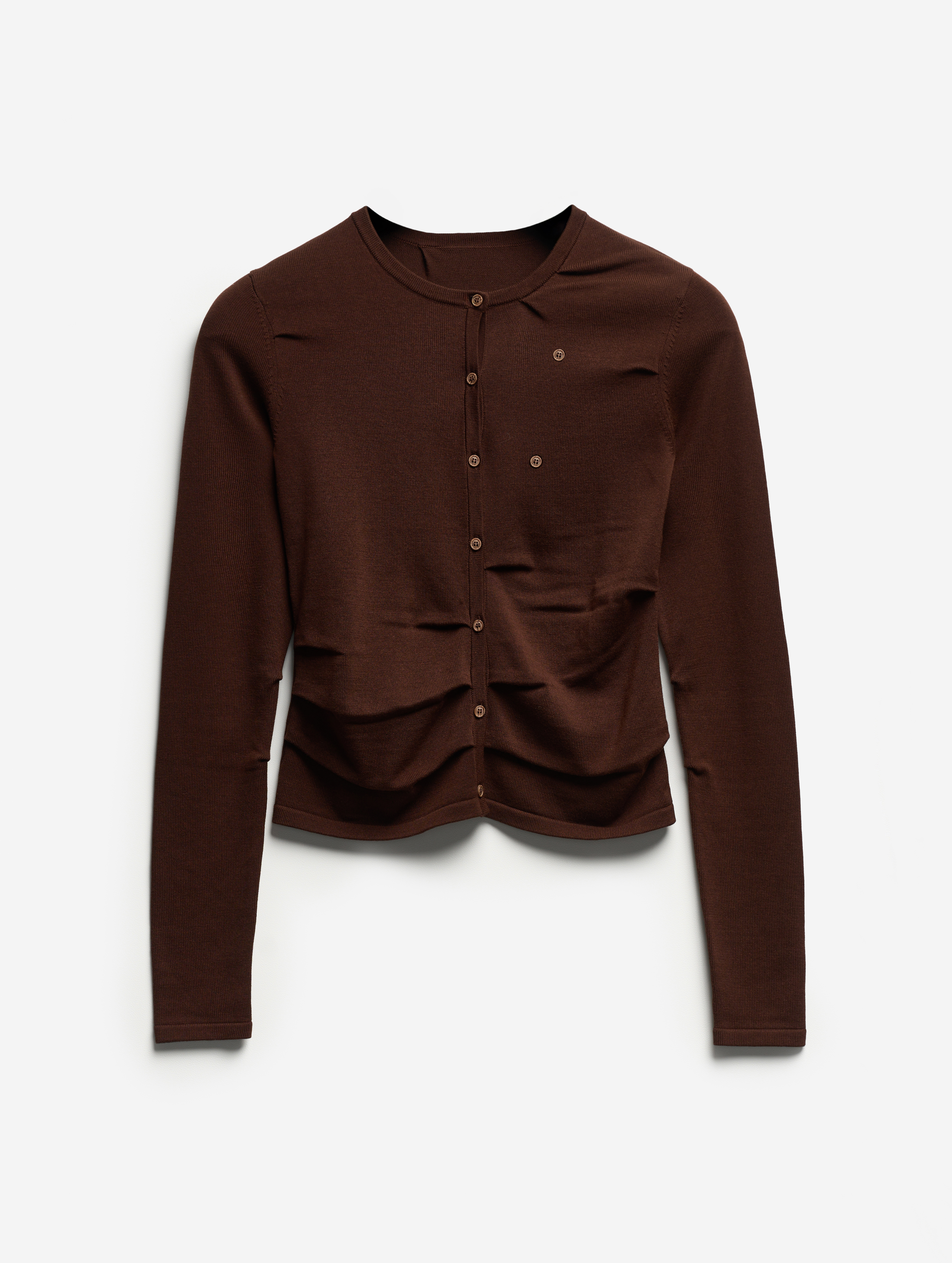 Мы любим вещи-трансформеры, потому что их можно носить по-разному. У этого кардигана тонкой вязки прилегающий прямой силуэт, который можно менять при помощи нескольких деталей — дополнительных пуговиц, смещенных от основного ряда. Если перестегнуть петли, изделие превратится в асимметричное. Еще один элемент деконструкции здесь — это защипы разного объема, сделанные по контуру плеч, круглому вырезу и боковым швам вещи.