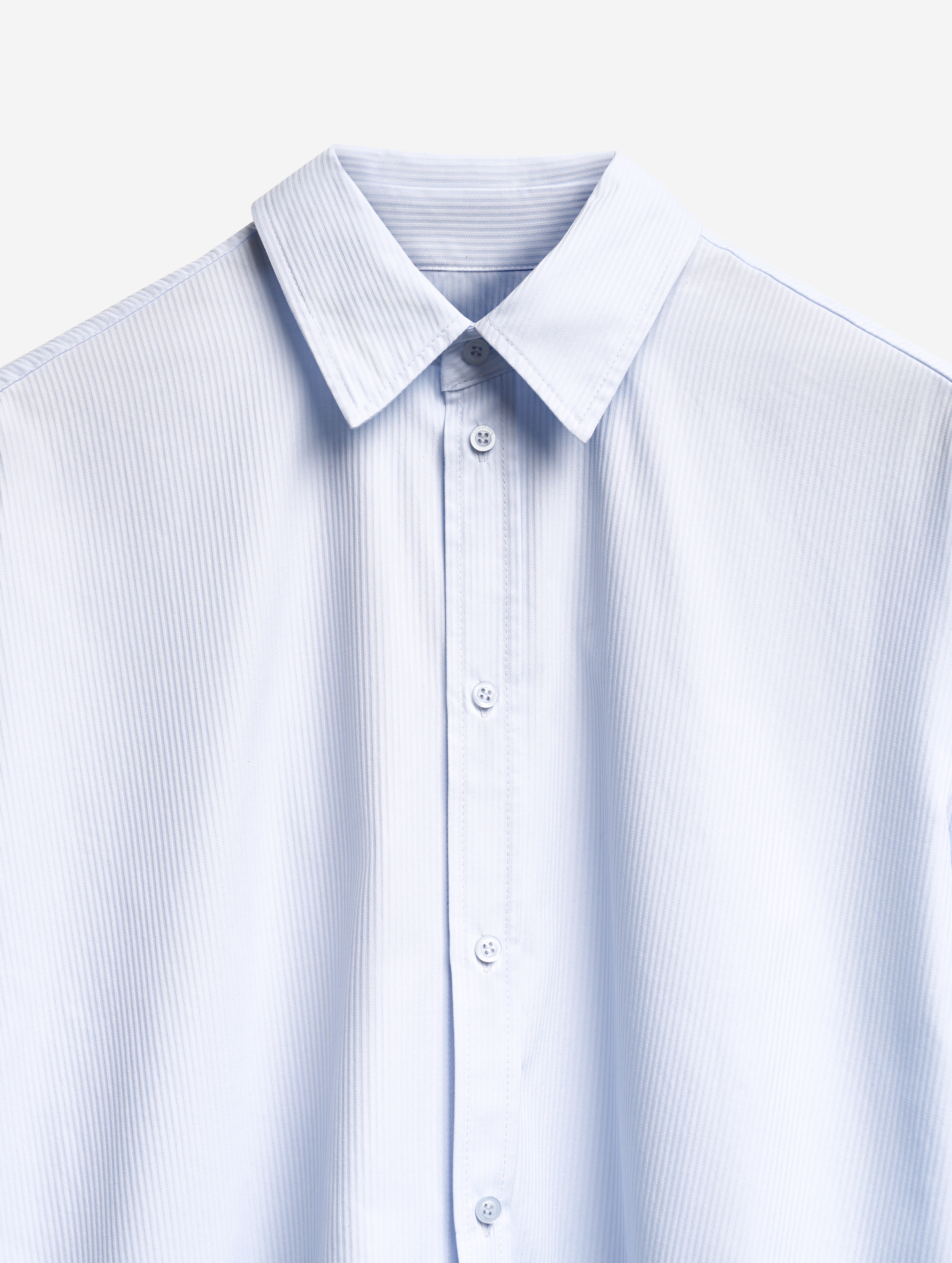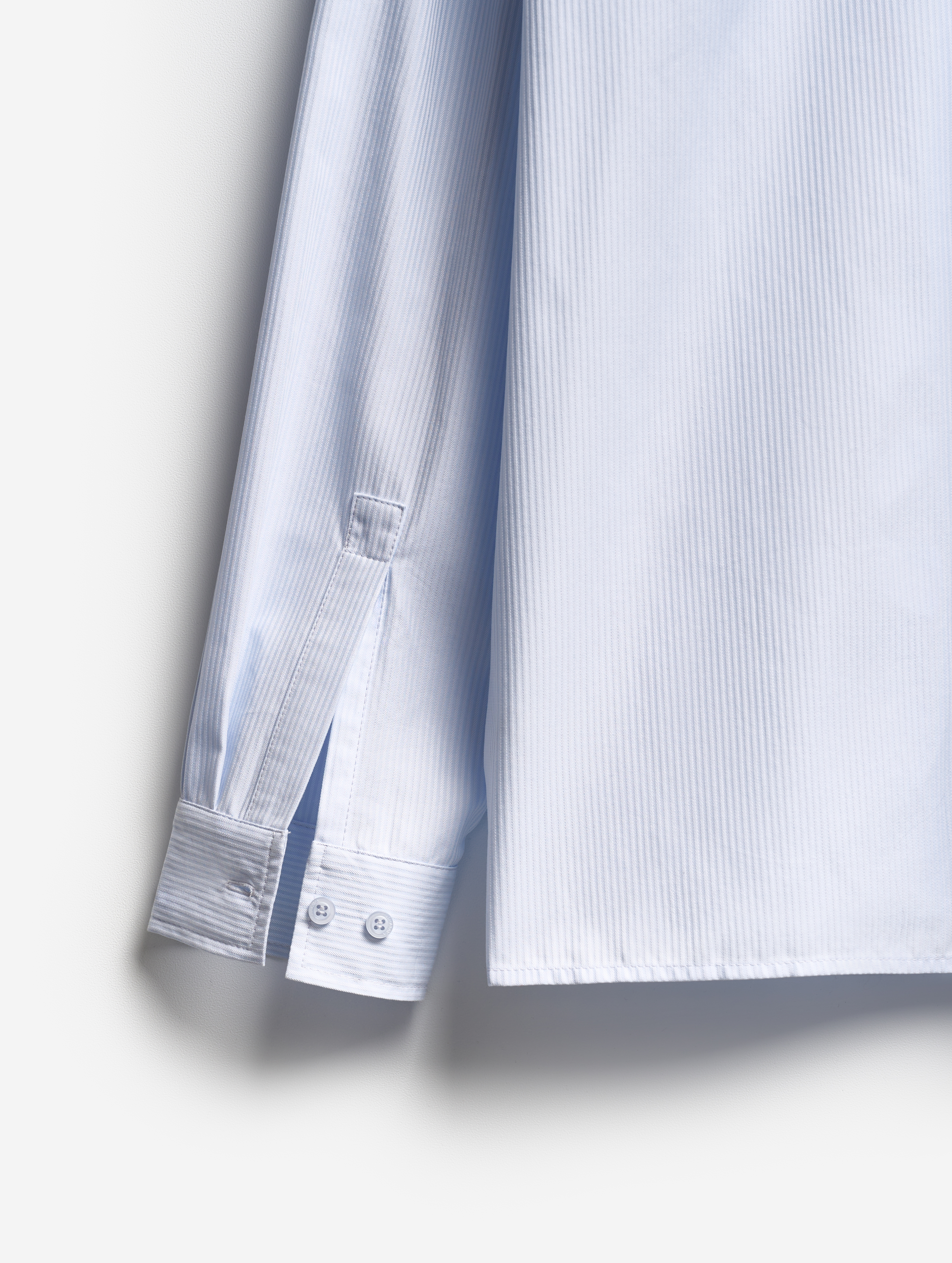 Ткань, из которой выполнена сорочка, называется поликоттоном — она создана из хлопковой пряжи с добавлением небольшого количества полиэстера. За счет вплетенных синтетических волокон она меньше мнется и долго сохраняет насыщенность цвета. Натуральные и искусственные волокна переплетаются, образуя полоски, — крошечные рубчики, отдаленно напоминающие вельвет. Эта фактура приятна наощупь, и ее можно увидеть только вблизи.