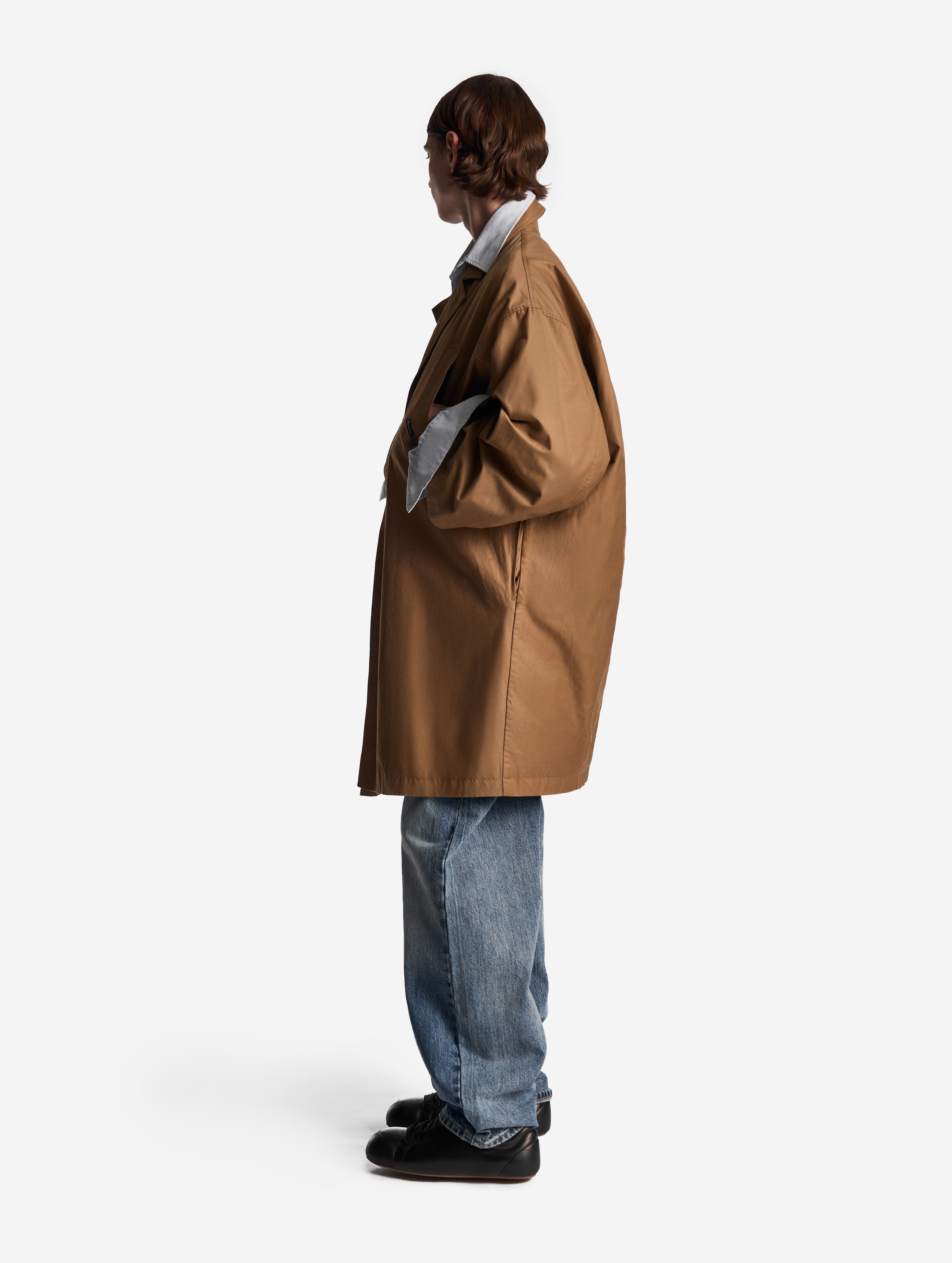 У новой модели классической рубашки умеренный оверсайз-силуэт, спущенная линия плеча и универсальная посадка — такую вещь могут носить и мужчины. Выразительности ей добавляют скульптурные складки, расходящиеся вверх по рукавам от узких манжетов. Сзади воротник украшен брендированным флажком. Рубашка застегивается на пуговицы.