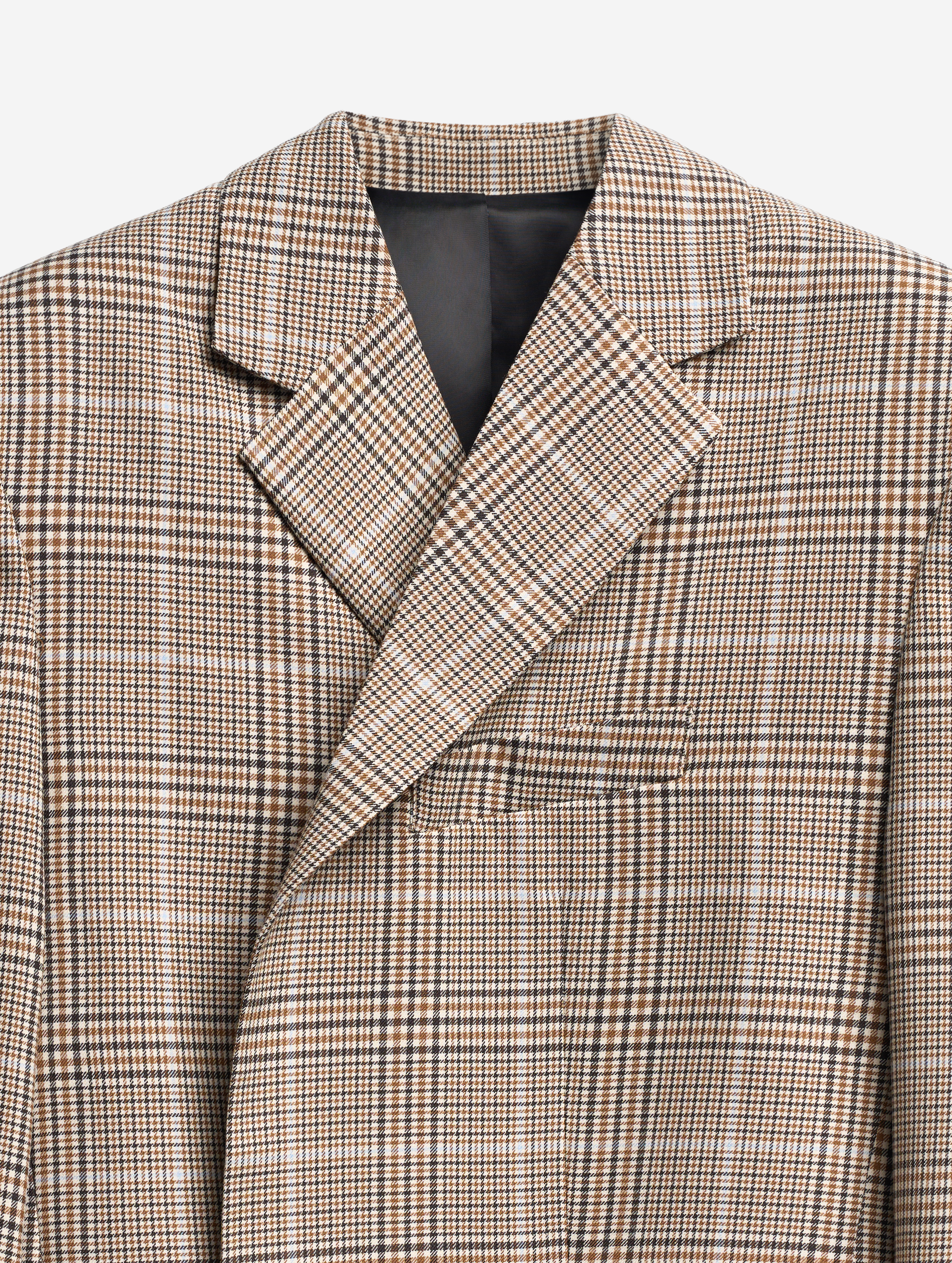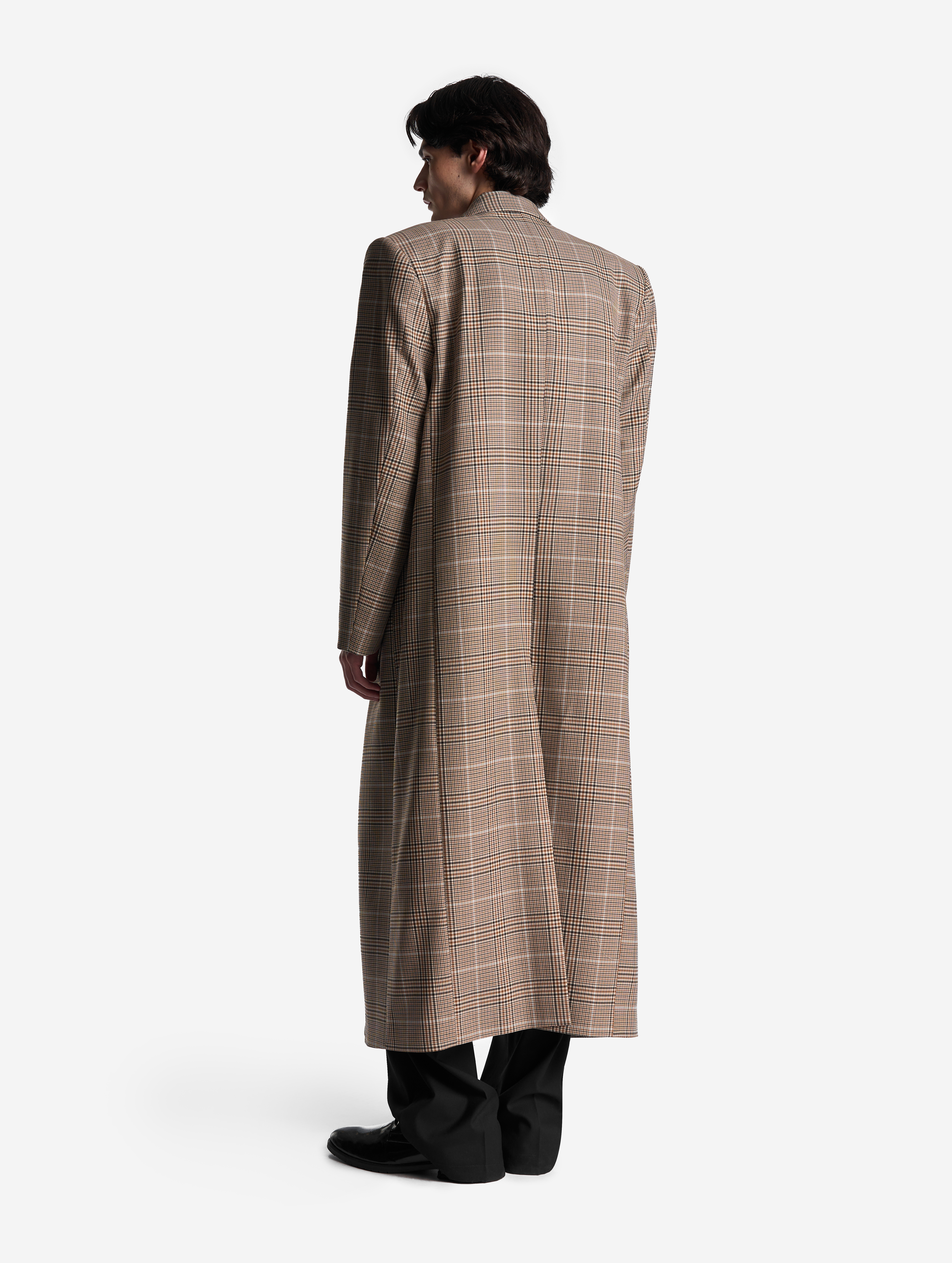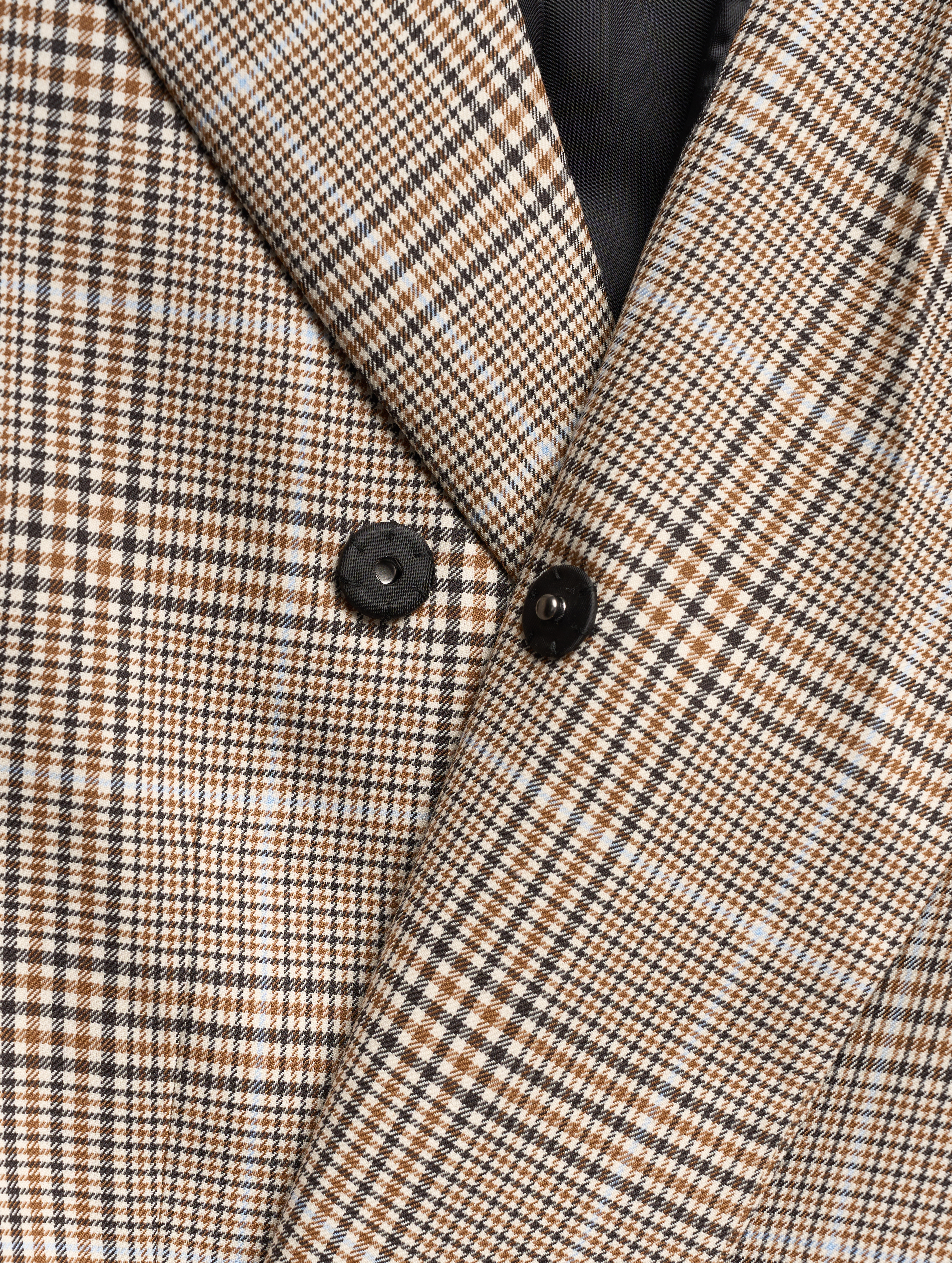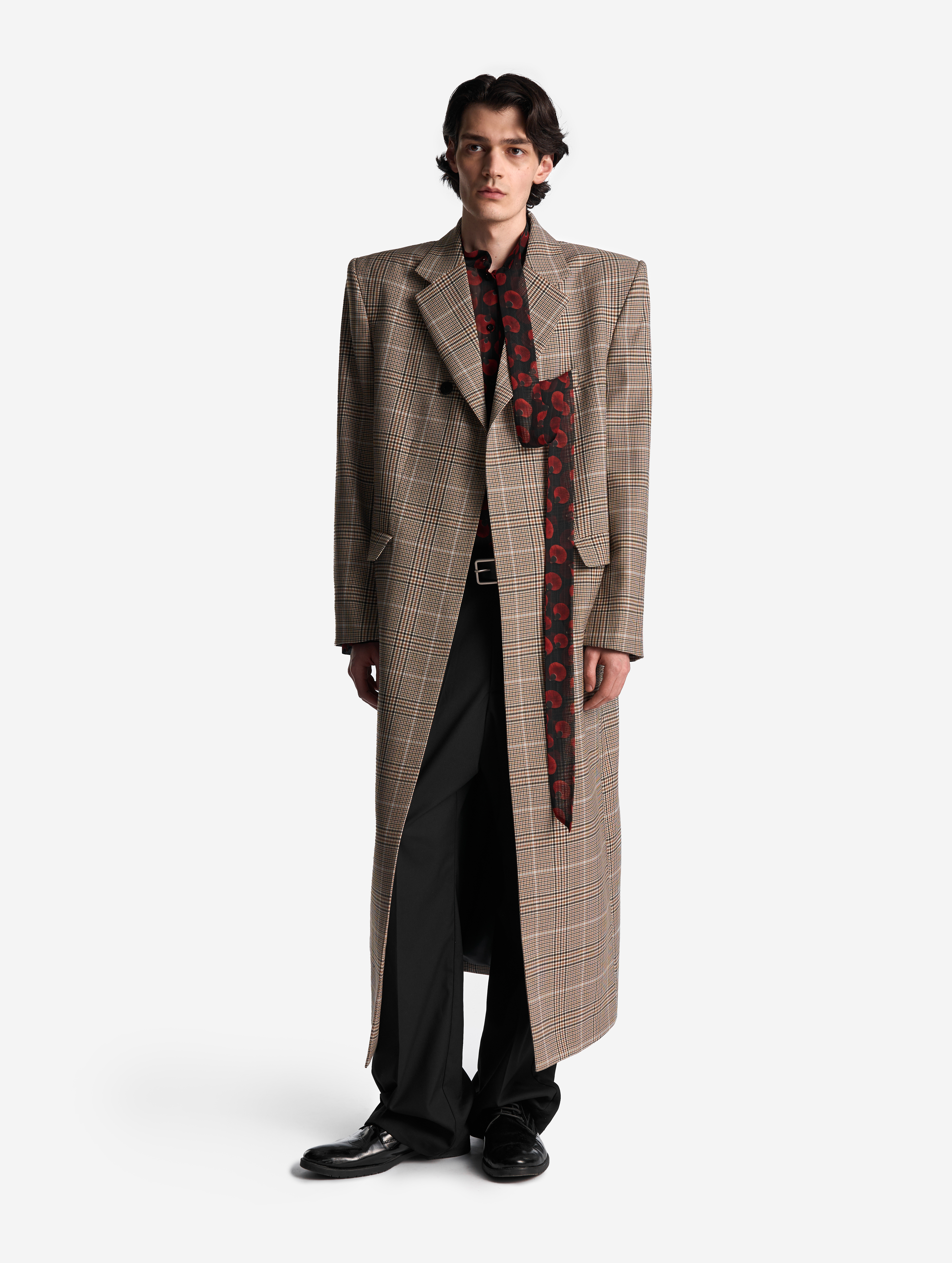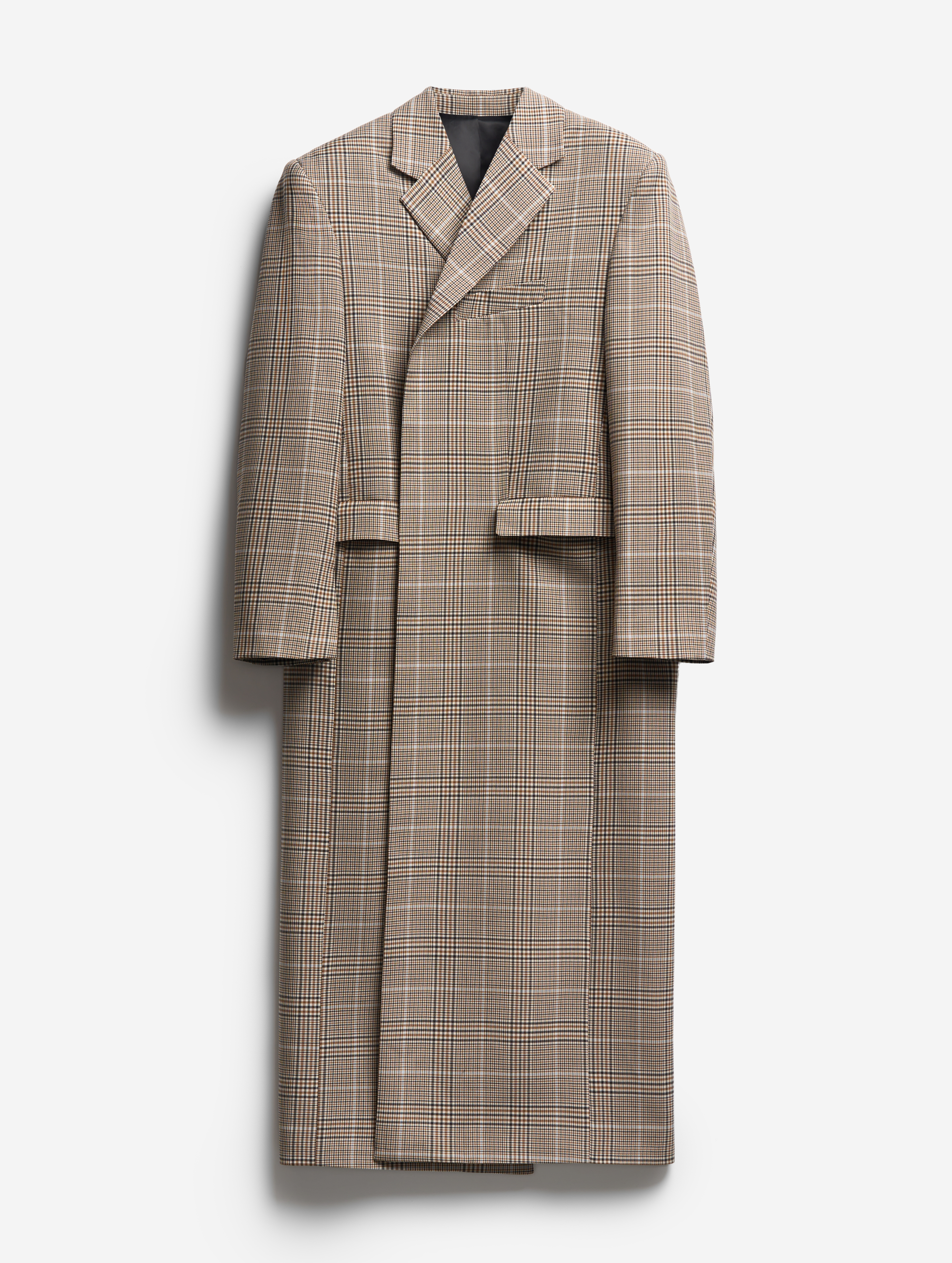У пальто объемные, выдающиеся плечи. В области груди изделие продублировано несколькими типами прокладок на основе конского волоса, поэтому изделие будет долгие годы сохранять свою форму. У модели два боковых кармана и один нагрудный. Внутри тоже есть карман — на петле и пуговице. Модель застегивается на обтянутую сатином кнопку, которая намерено смещена от центра для создания эффекта запаха. Пальто выполнено из гладкой костюмной ткани, в составе которой присутствует шерсть. Этот материал хорошо держит форму и не мнется.