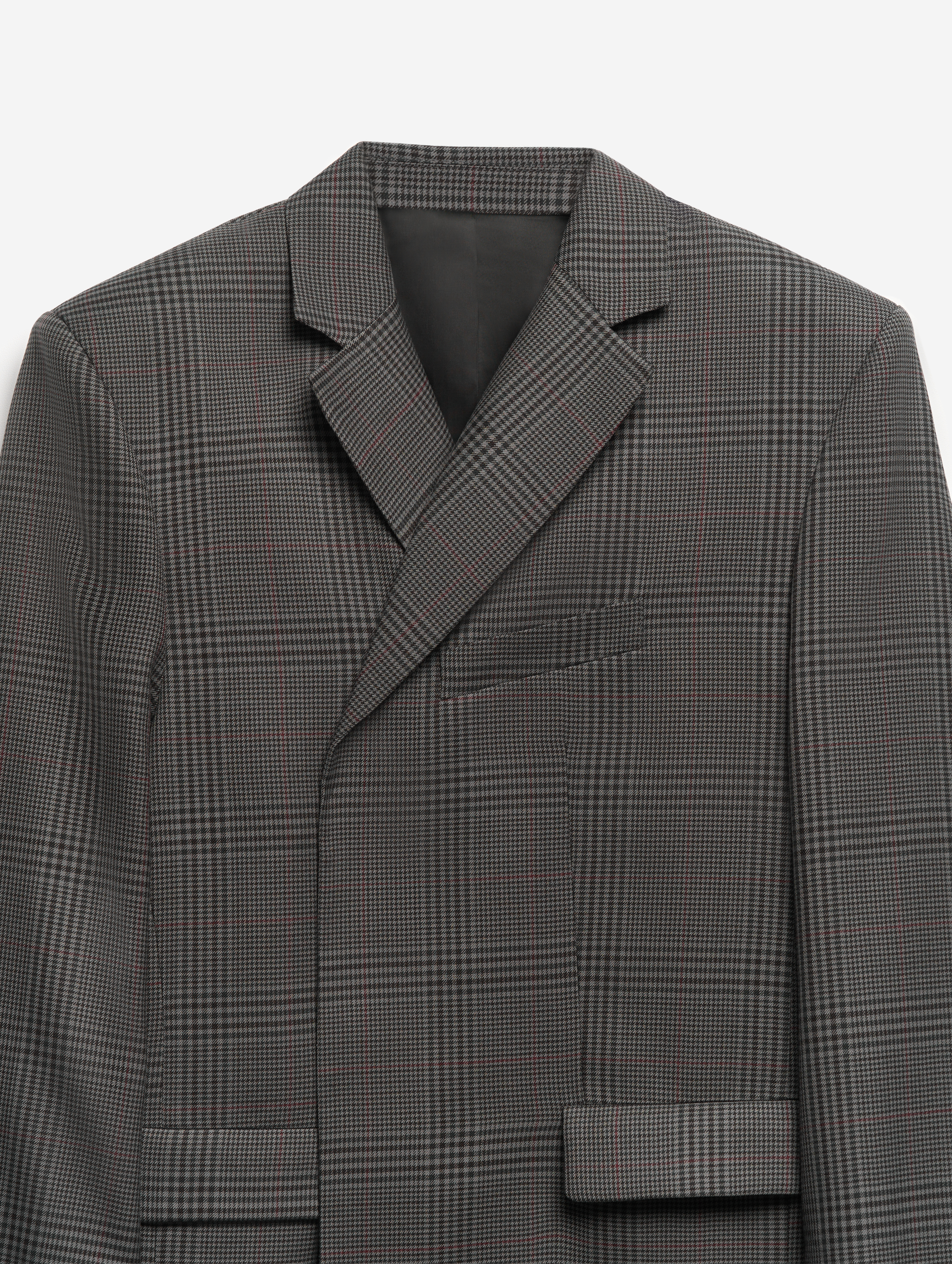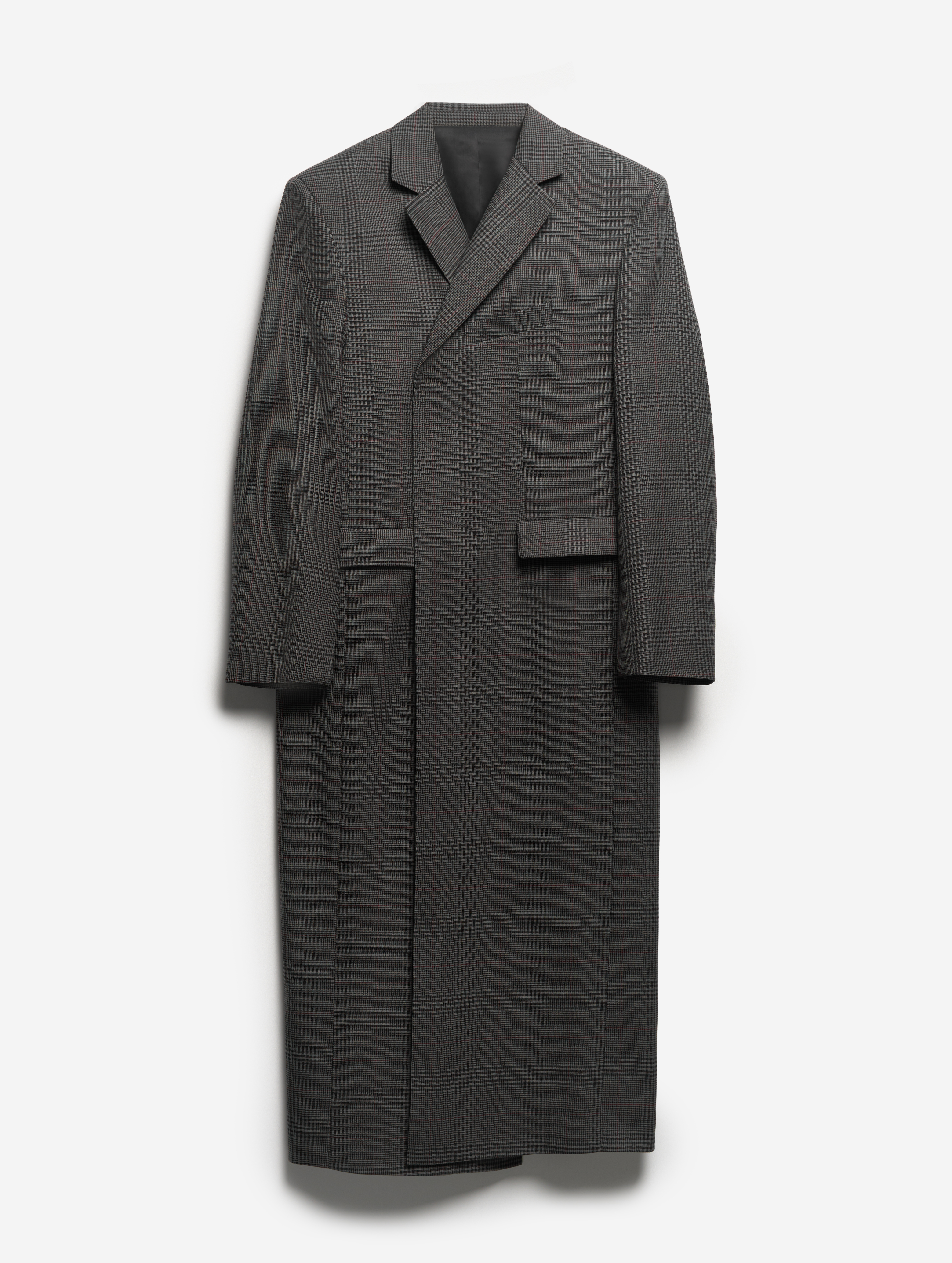 У пальто объемные, выдающиеся плечи. В области груди изделие продублировано несколькими типами прокладок на основе конского волоса, поэтому изделие будет долгие годы сохранять свою форму. У модели два боковых кармана и один нагрудный. Внутри тоже есть карман — на петле и пуговице. Модель застегивается на обтянутую сатином кнопку, которая намерено смещена от центра для создания эффекта запаха. Пальто выполнено из гладкой костюмной ткани, в составе которой присутствует шерсть. Этот материал хорошо держит форму и не мнется.