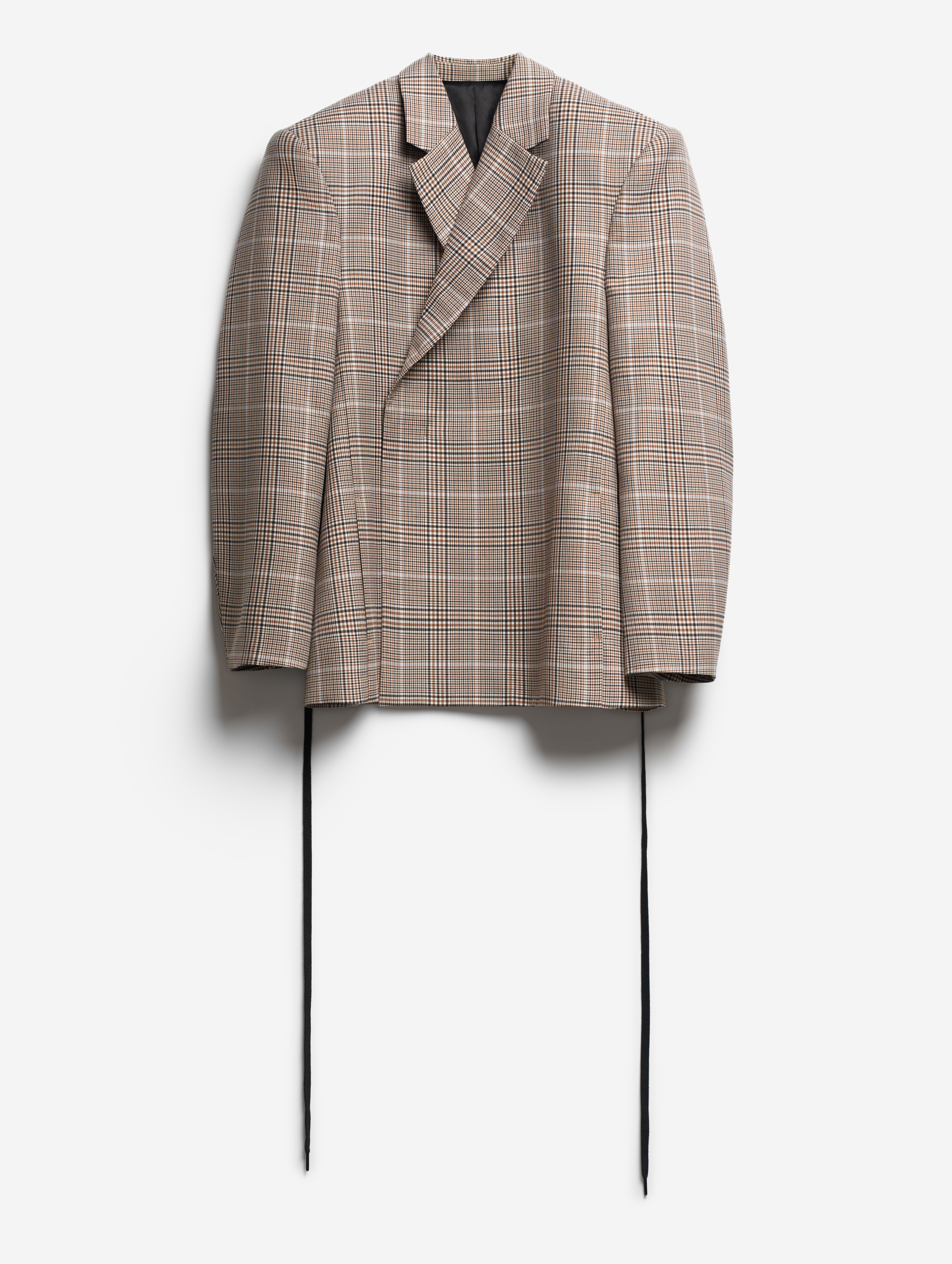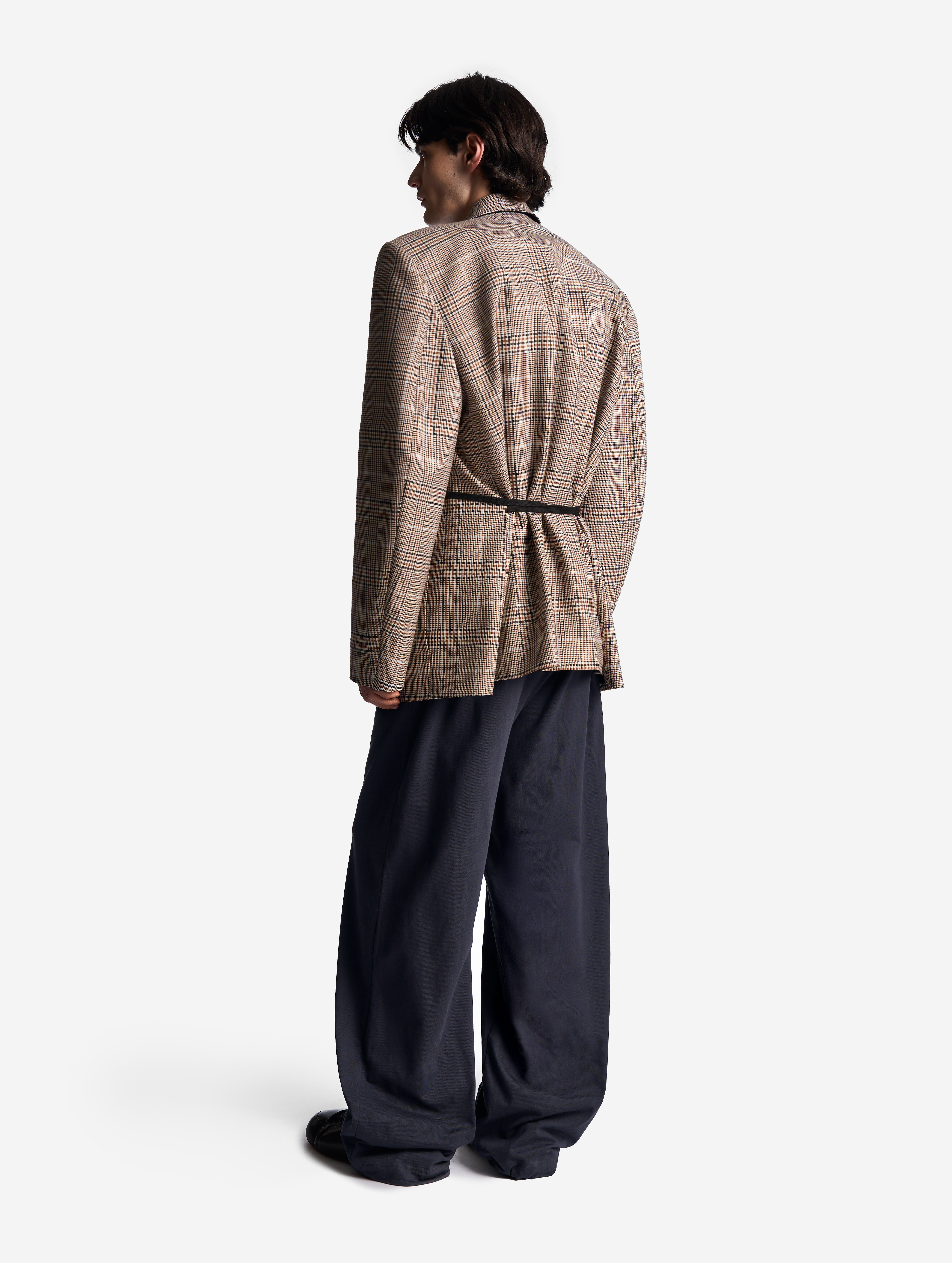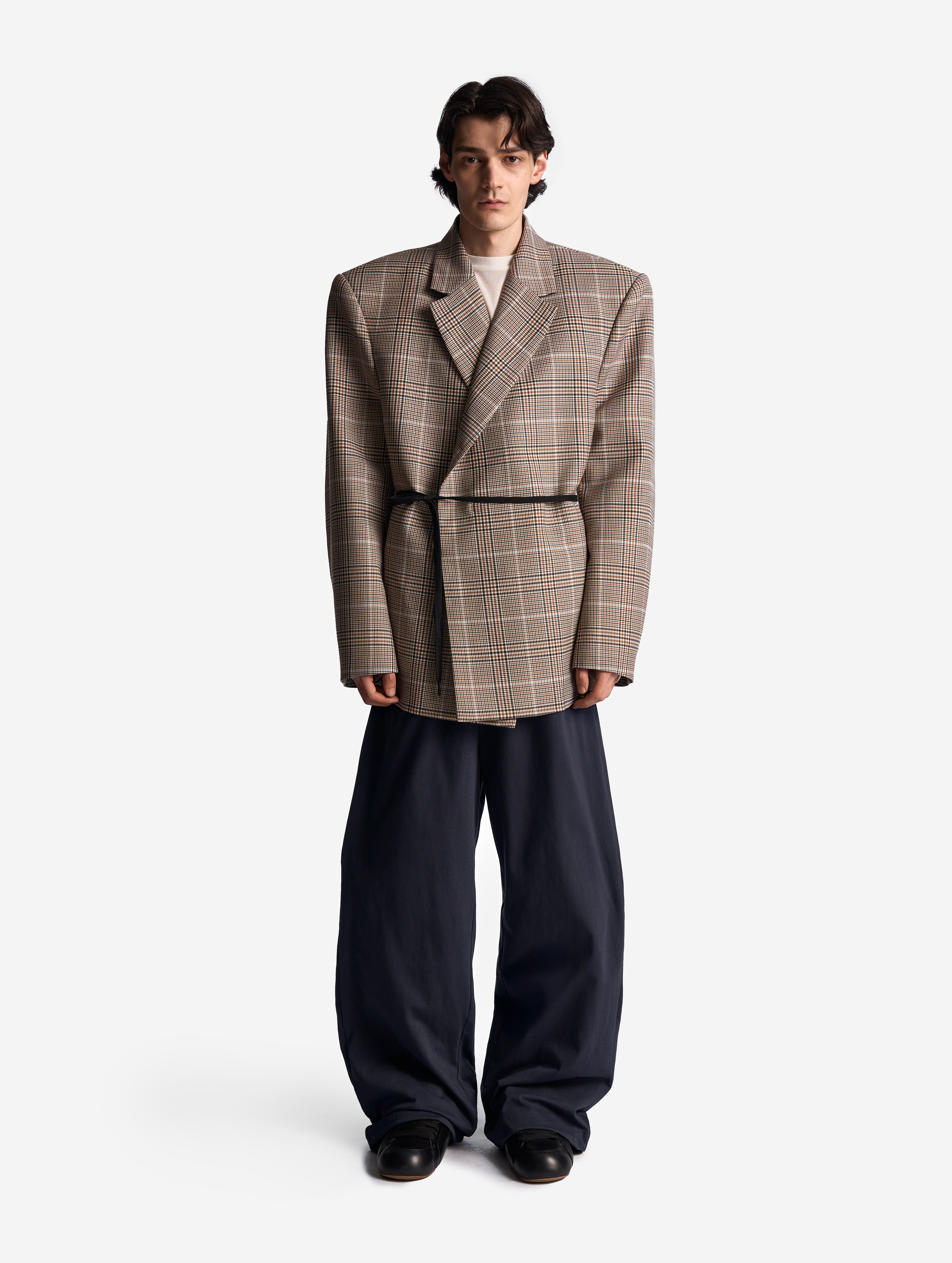Если посмотреть на пиджак в анфас, он напомнит бумажную одежду для кукол. Мы назвали такой эффект плоским кроем: он достигается посредством оверсайз-посадки, скрывающей изгибы тела, и прямого угла широкого плеча. По бокам изделия вшиты шнурки, которые можно затягивать, чтобы пиджак обрел объем, а силуэт перешел в разряд приталенных. Модель выполнена из гладкой костюмной ткани, в составе которой присутствует шерсть. Этот материал хорошо держит форму и не мнется.
