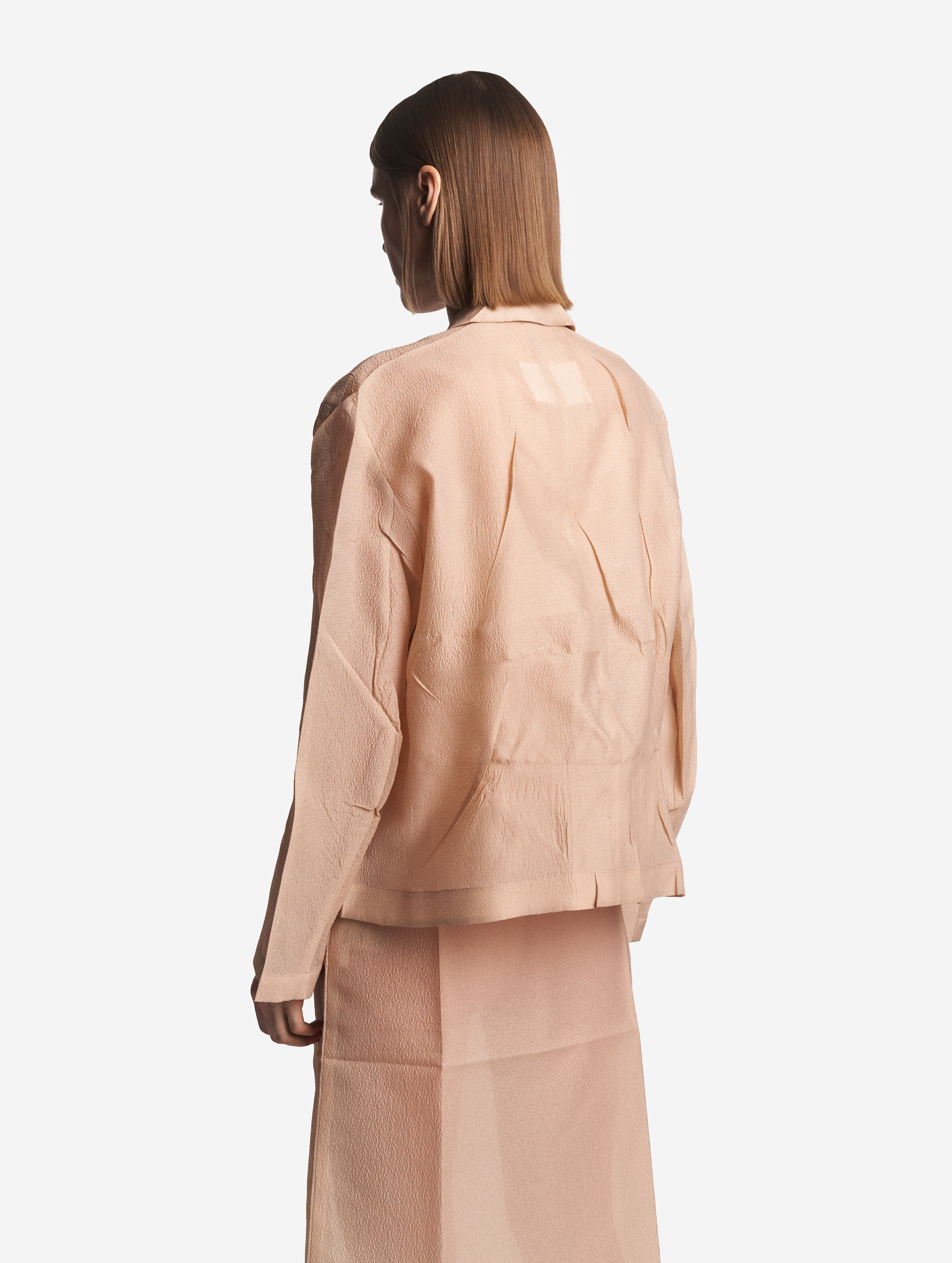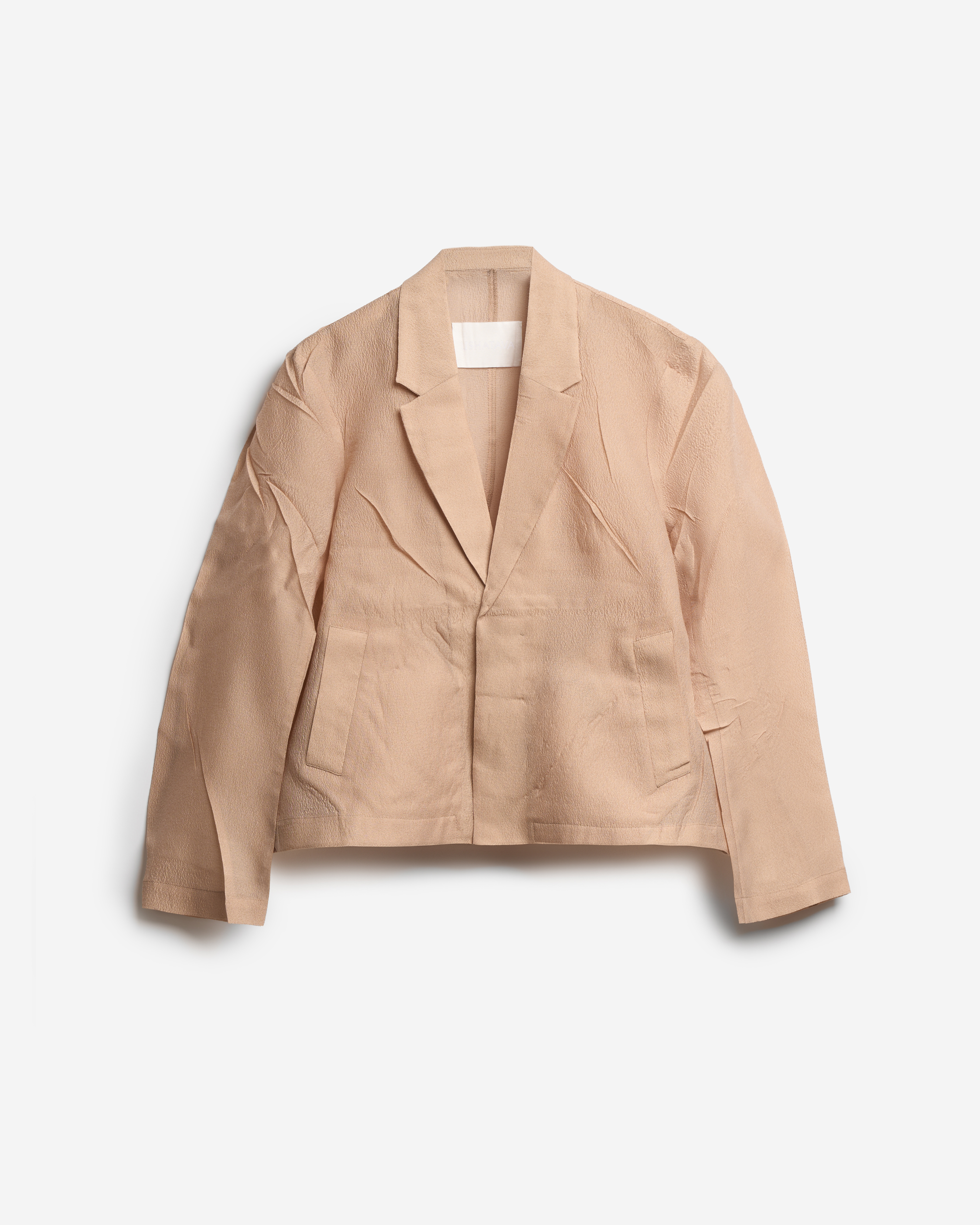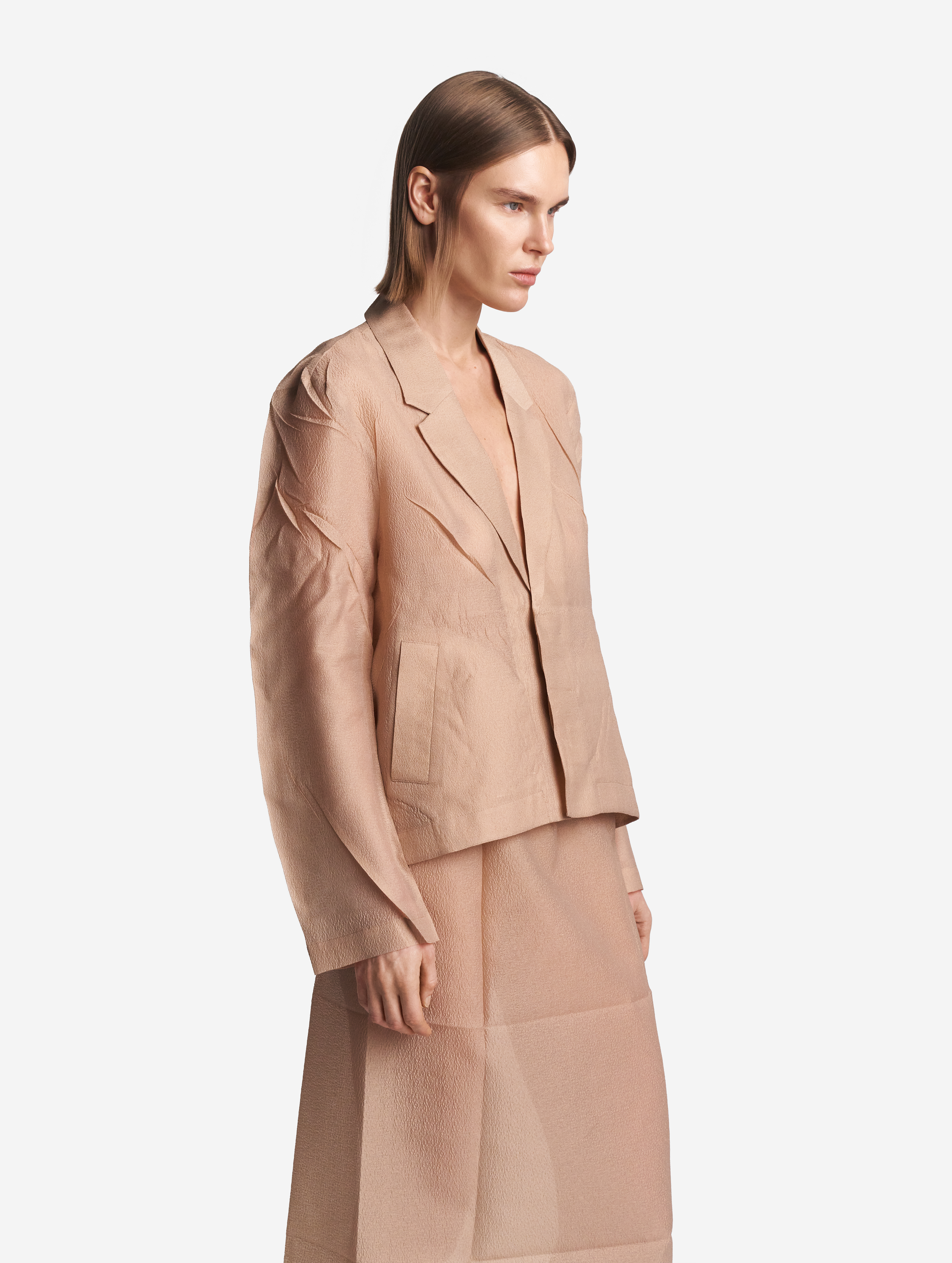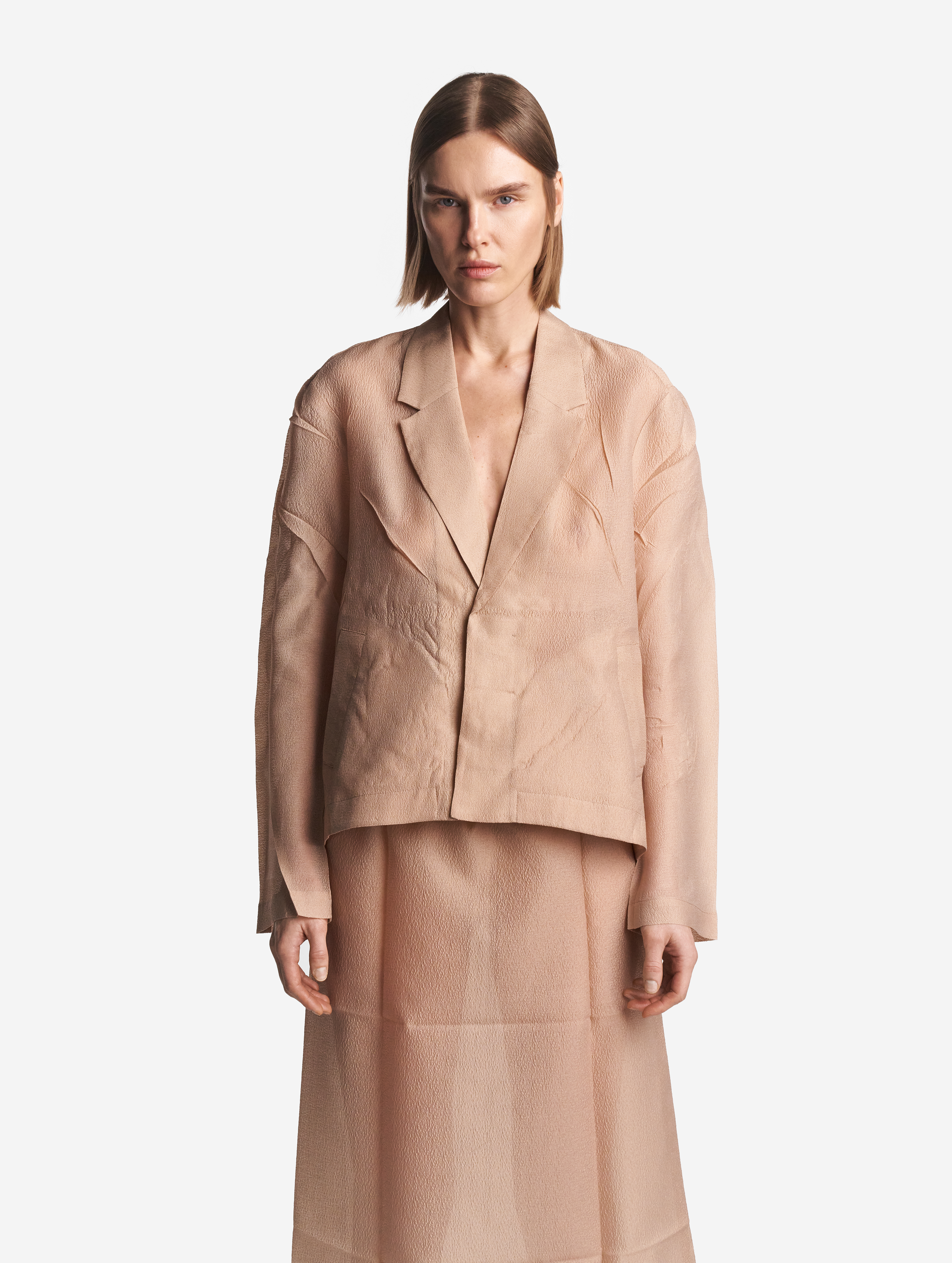Пиджак выполнен из плотной полупрозрачной органзы. Хаотичные складки, заложенные вручную, напоминают следы времени, которые приобретает праздничная вещь, дожидаясь своего выхода. Изделие застегивается на две пуговицы, обтянутые тканью. У пиджака есть два боковых кармана.