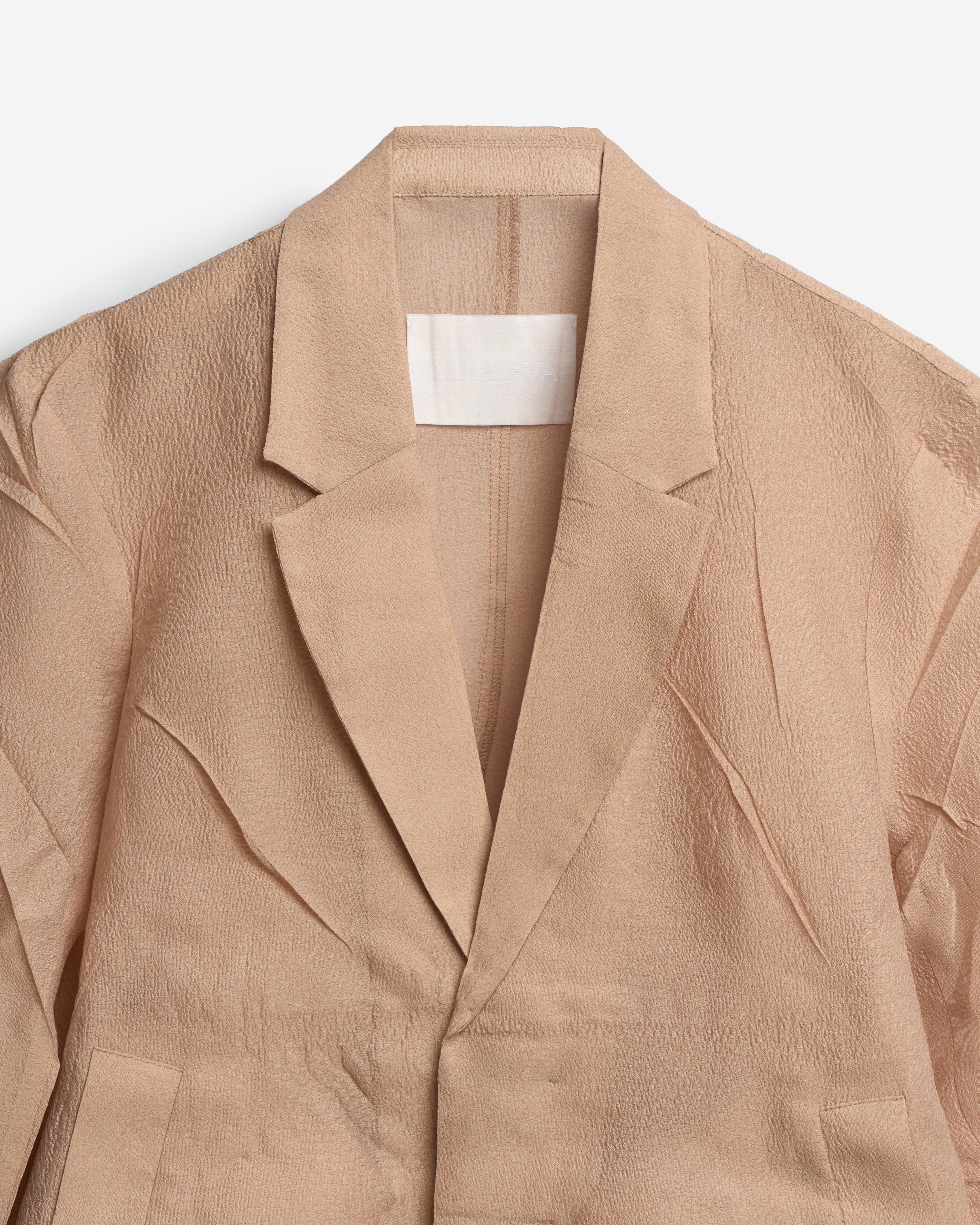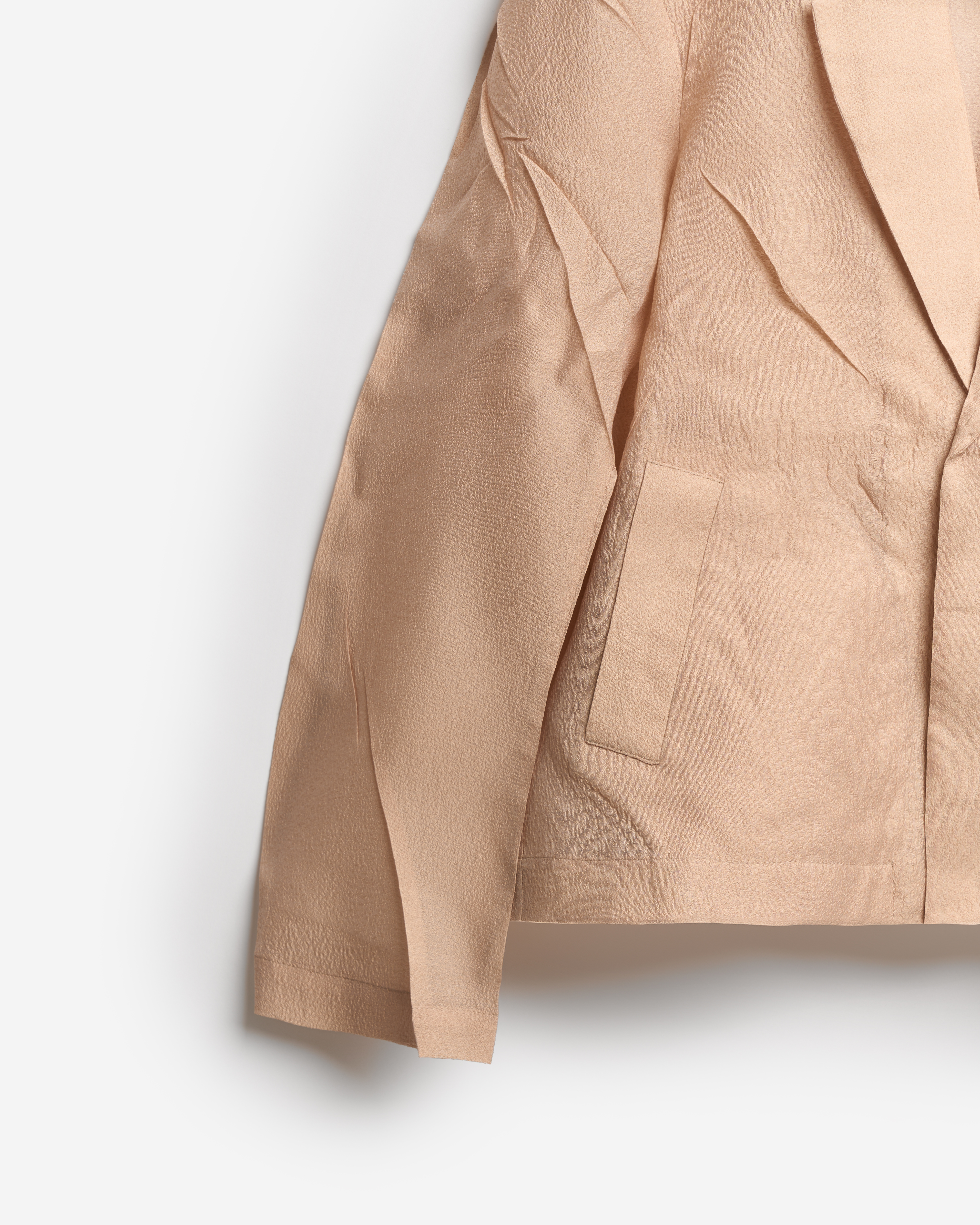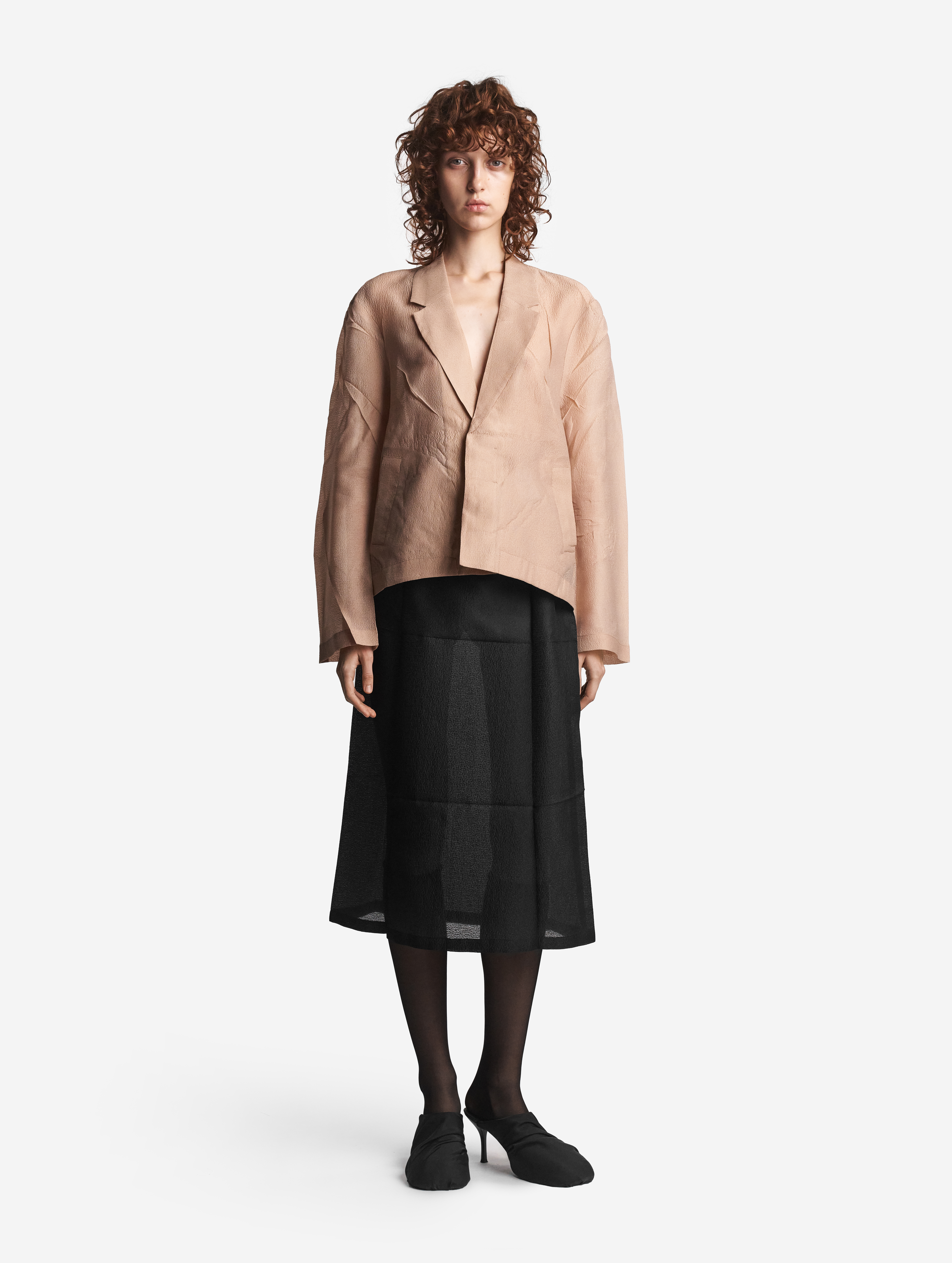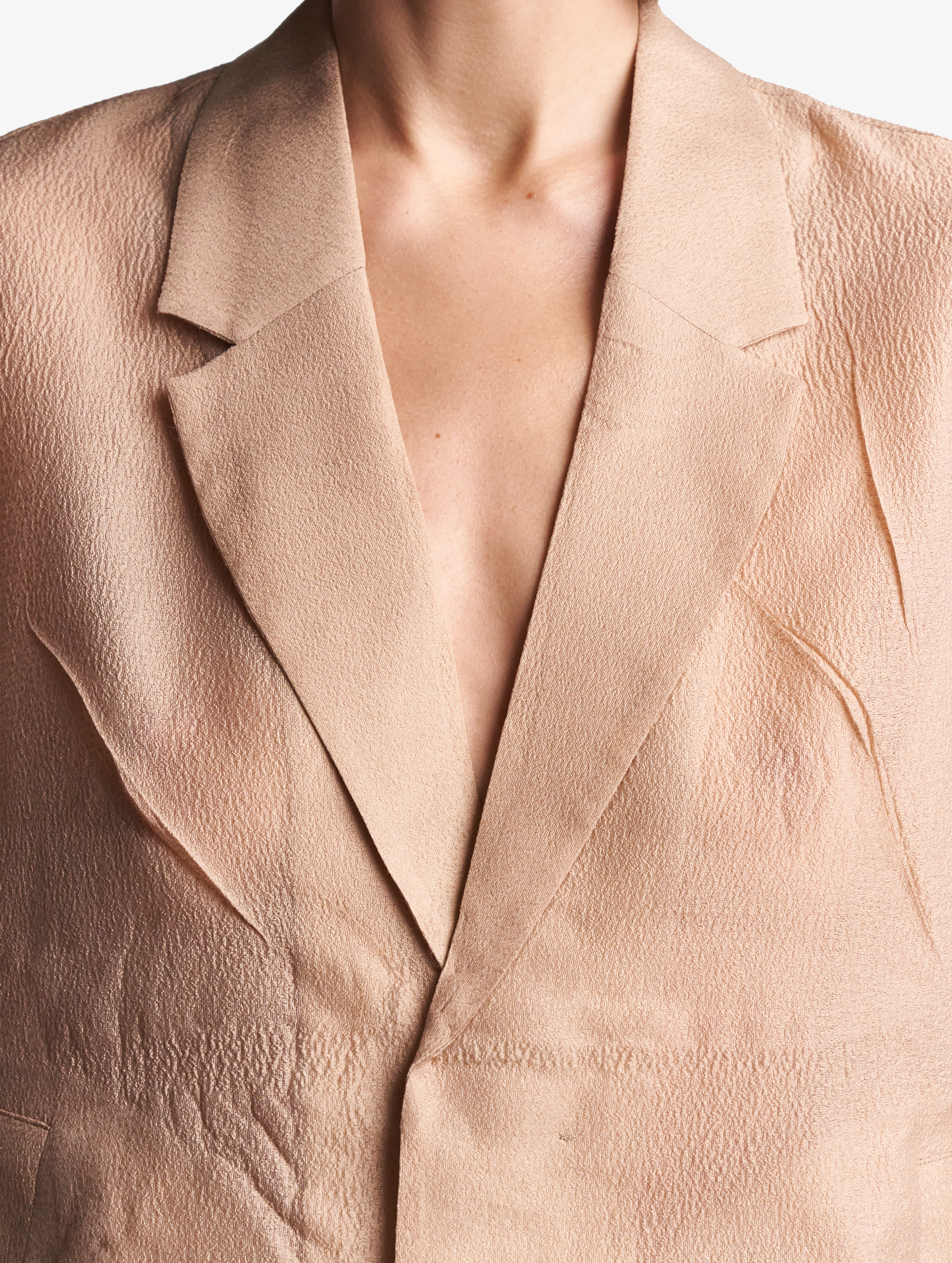 Пиджак выполнен из плотной полупрозрачной органзы. Хаотичные складки, заложенные вручную, напоминают следы времени, которые приобретает праздничная вещь, дожидаясь своего выхода. Изделие застегивается на две пуговицы, обтянутые тканью. У пиджака есть два боковых кармана.