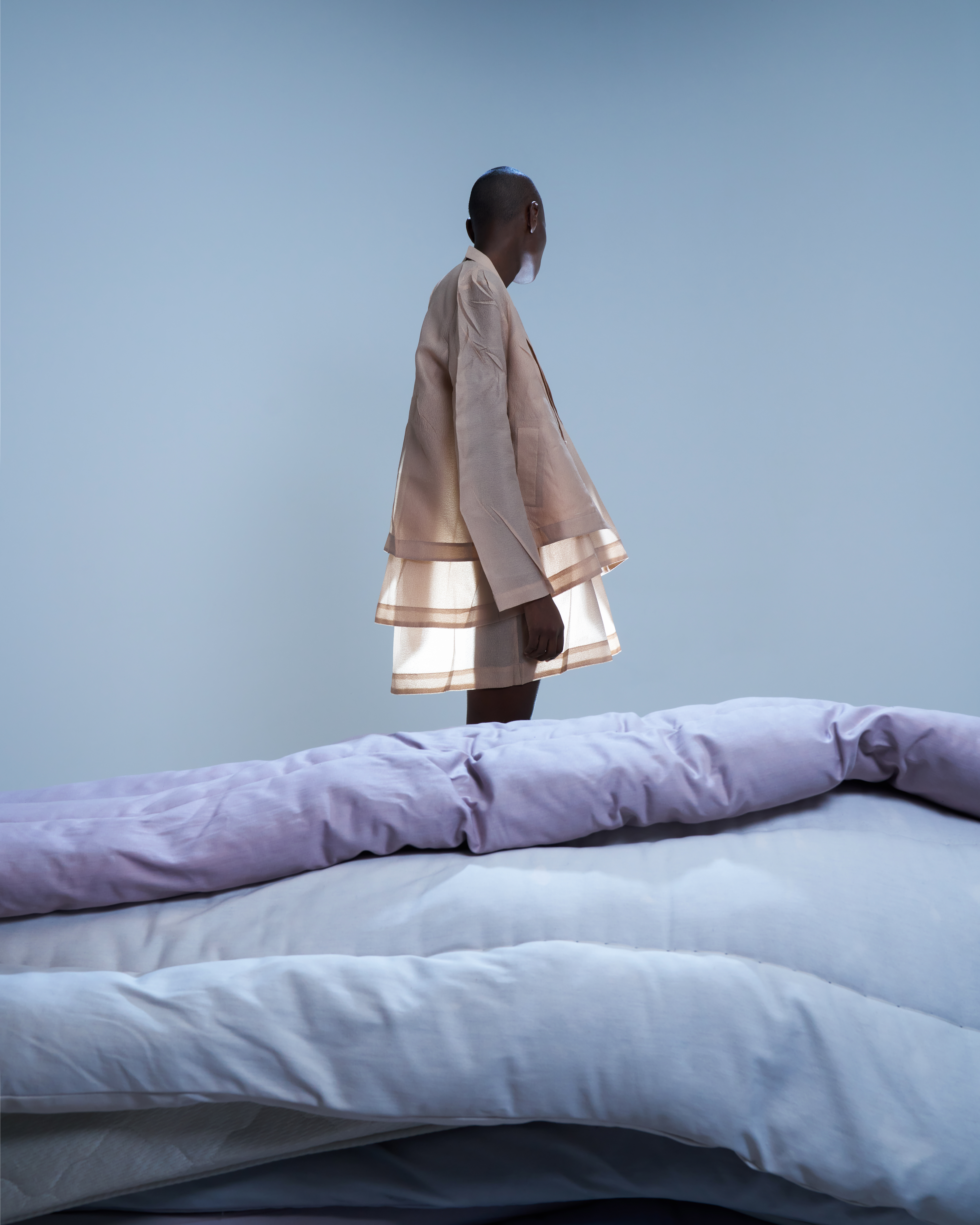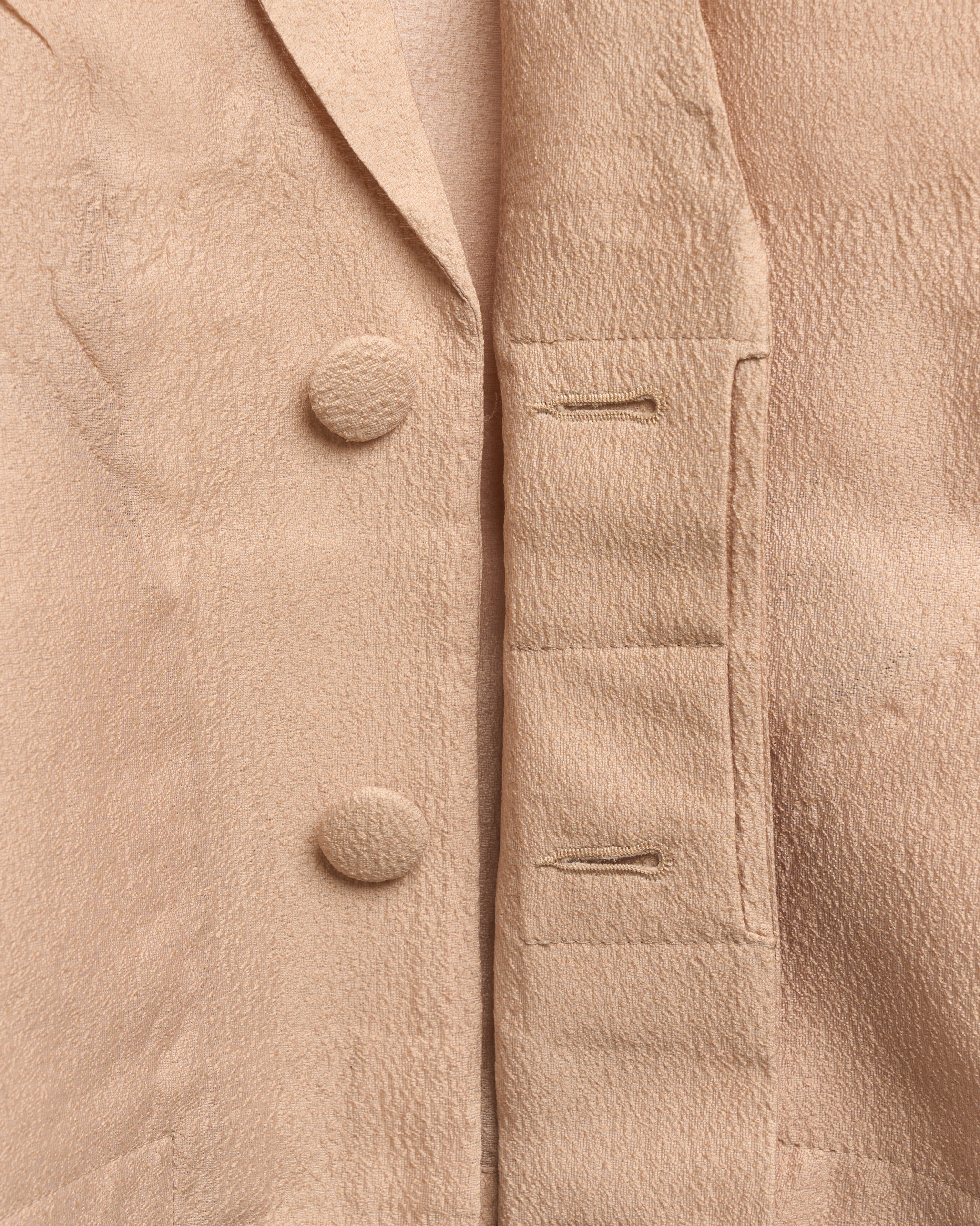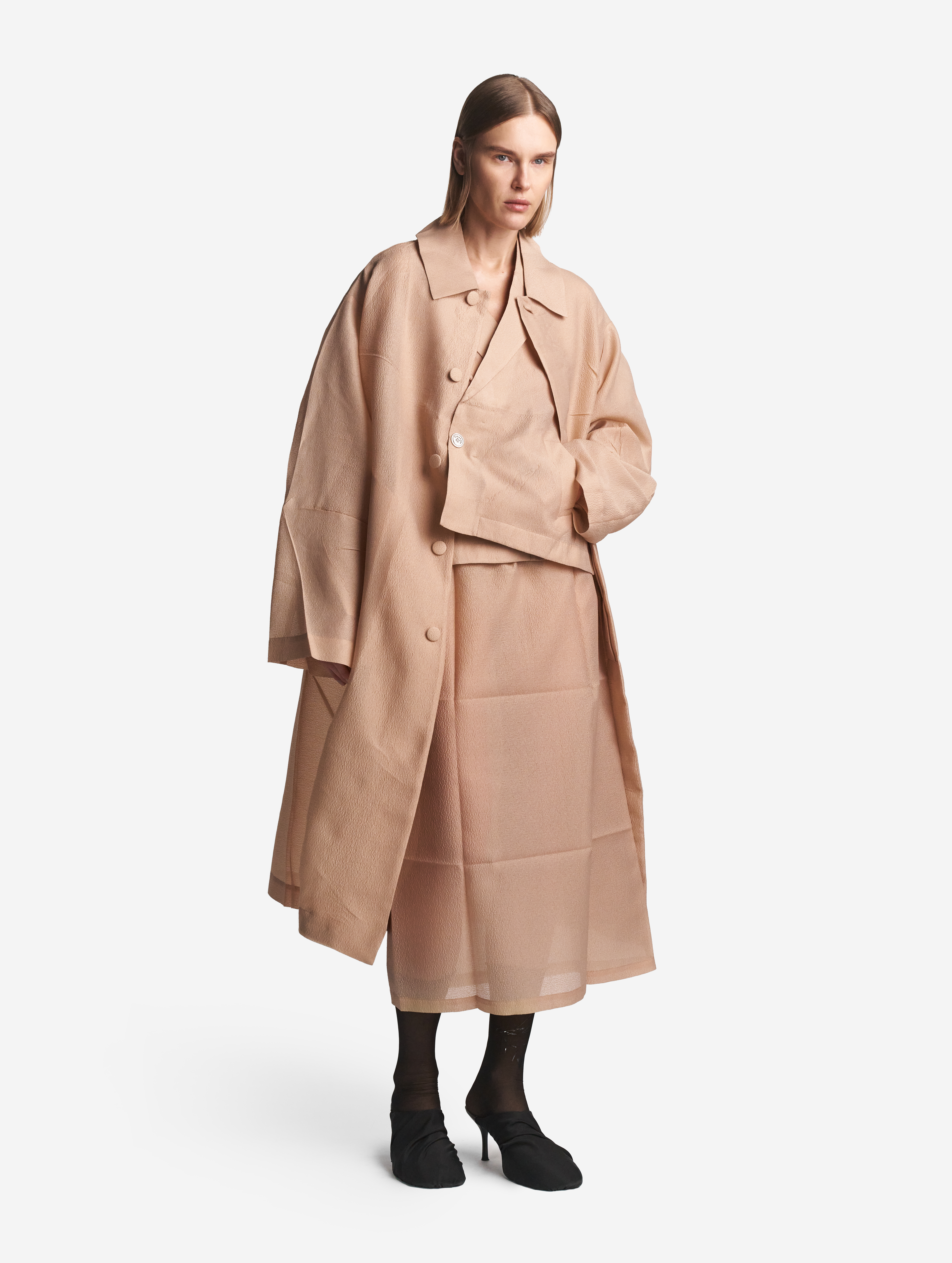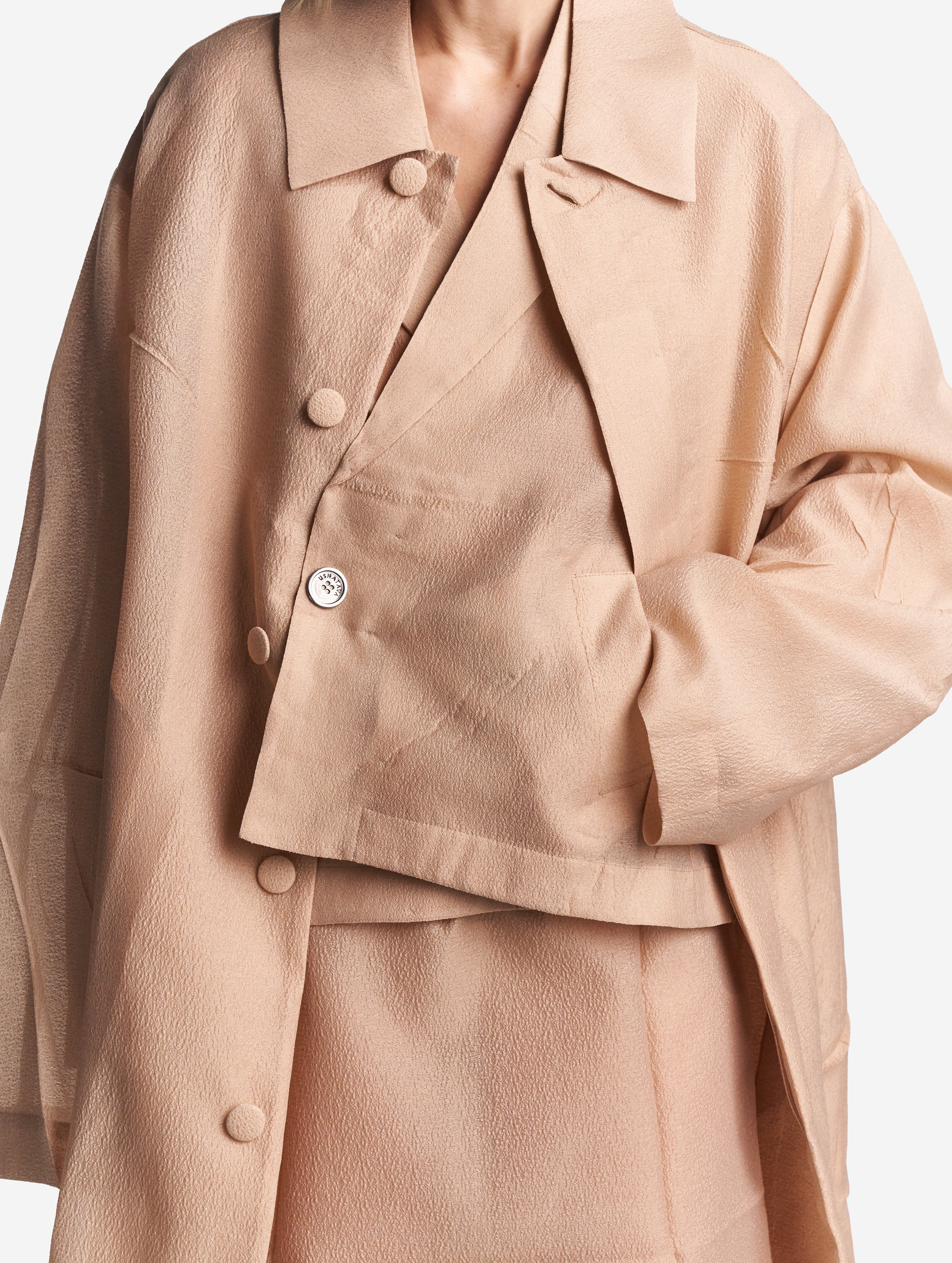 Пиджак выполнен из плотной полупрозрачной органзы. Хаотичные складки, заложенные вручную, напоминают следы времени, которые приобретает праздничная вещь, дожидаясь своего выхода. Изделие застегивается на две пуговицы, обтянутые тканью. У пиджака есть два боковых кармана.