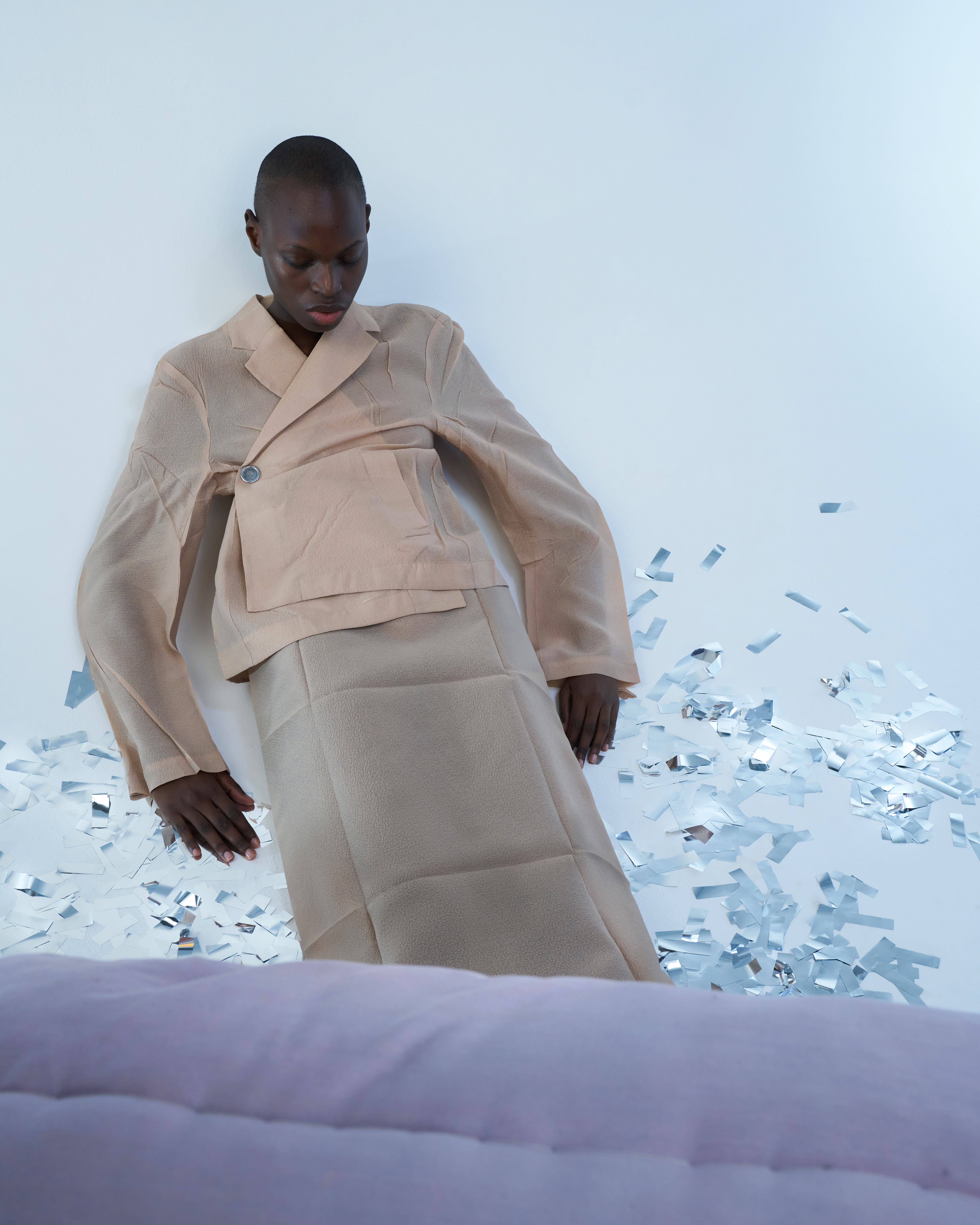 Трапециевидный силуэт этого пиджака вдохновлен жаккардовым топом свободного кроя — первым изделием, которое креативный директор Ushatava Нино Шаматава создала для марки в 2015 году.