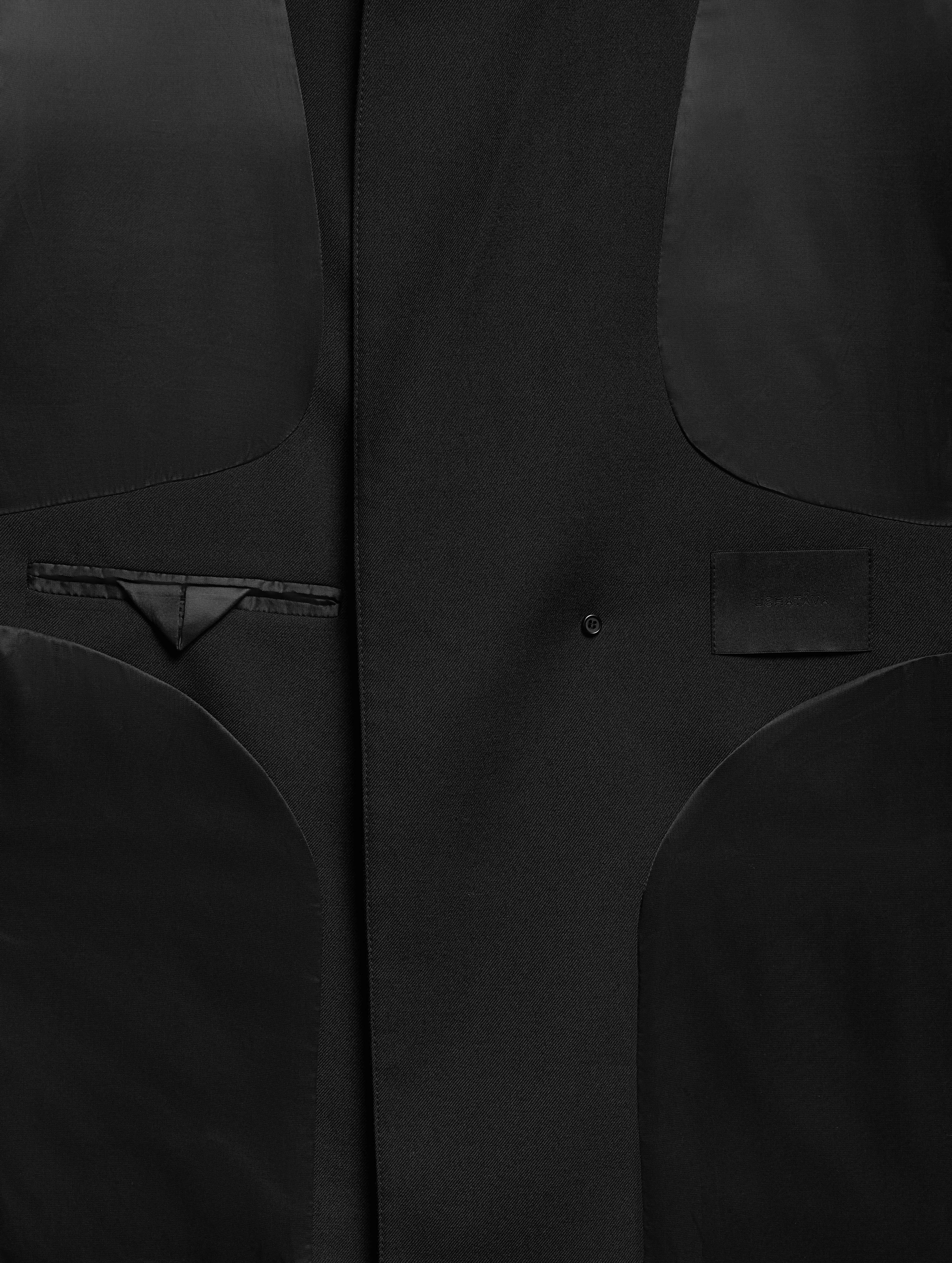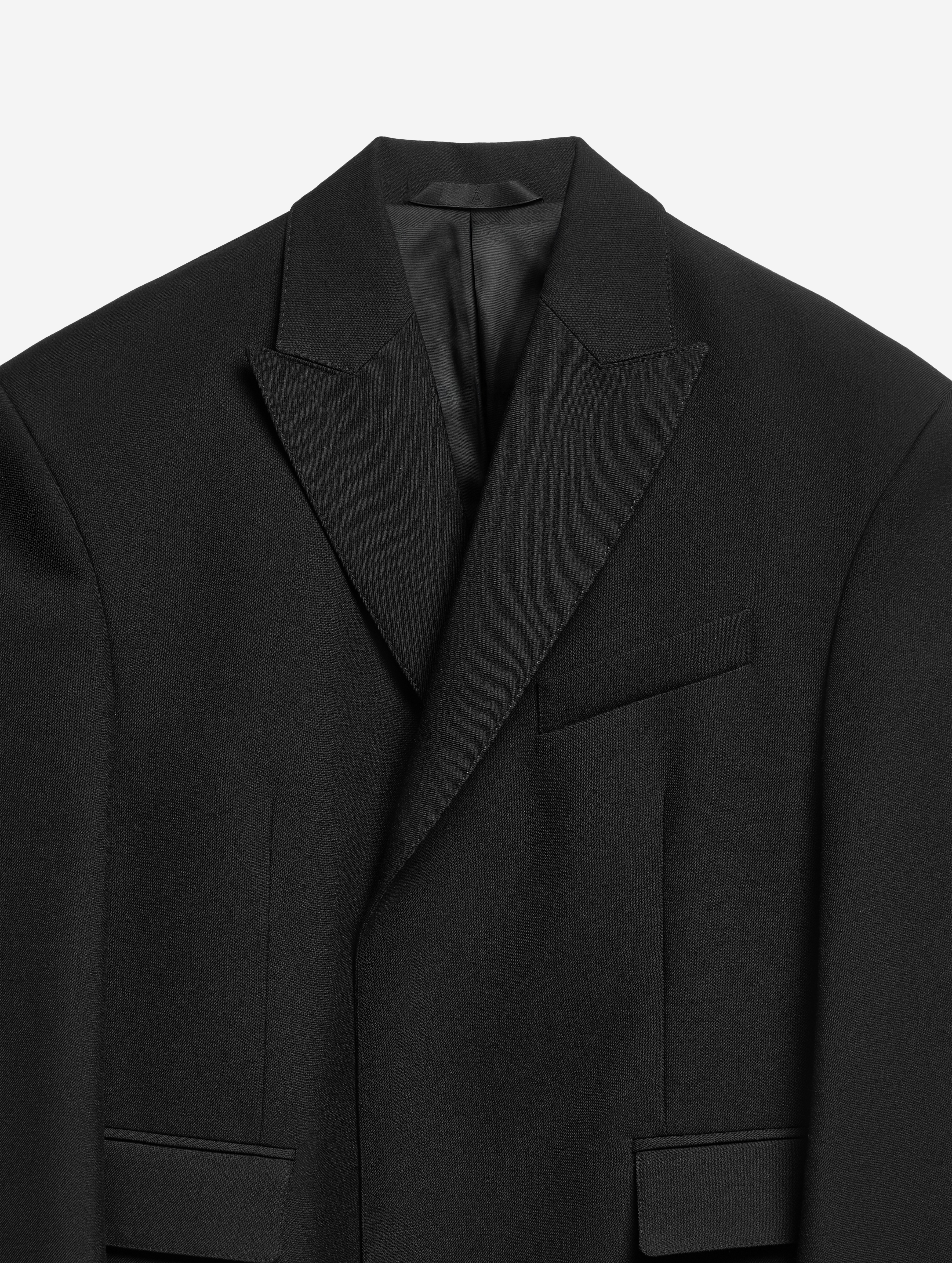 У пиджака объемные, выдающиеся плечи. В области груди изделие продублировано несколькими типами прокладок на основе конского волоса, поэтому пиджак будет долгие годы сохранять свою форму. У модели два боковых кармана и один нагрудный. Внутри тоже есть карман — на петле и пуговице. Пиджак застегивается на обтянутую сатином кнопку, которая намерено смещена от центра для создания эффекта запаха.
