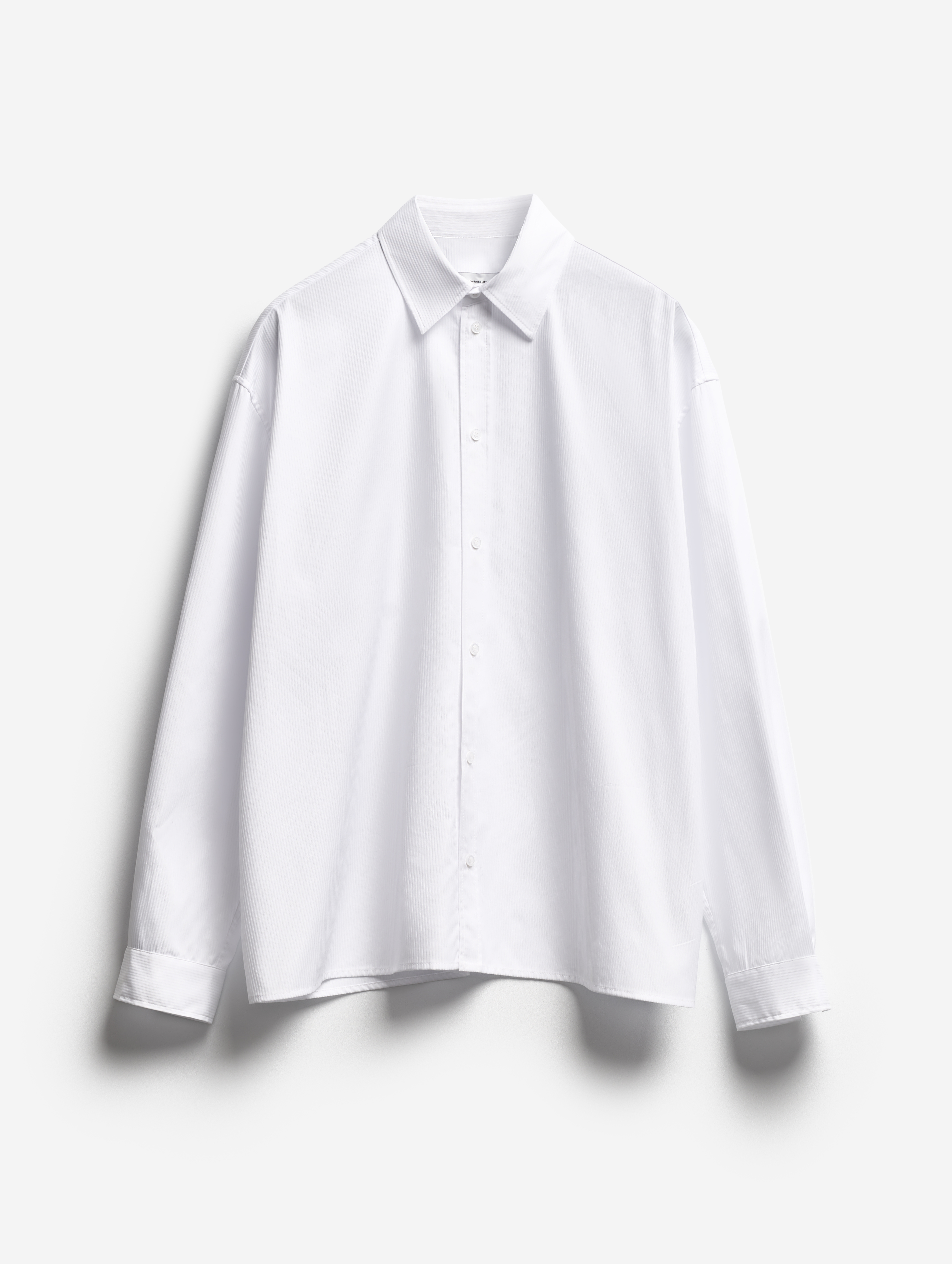 У новой модели классической рубашки умеренный оверсайз-силуэт, спущенная линия плеча и универсальная посадка — такую вещь могут носить и мужчины. Выразительности ей добавляют скульптурные складки, расходящиеся вверх по рукавам от узких манжетов. Сзади воротник украшен брендированным флажком. Рубашка застегивается на пуговицы.