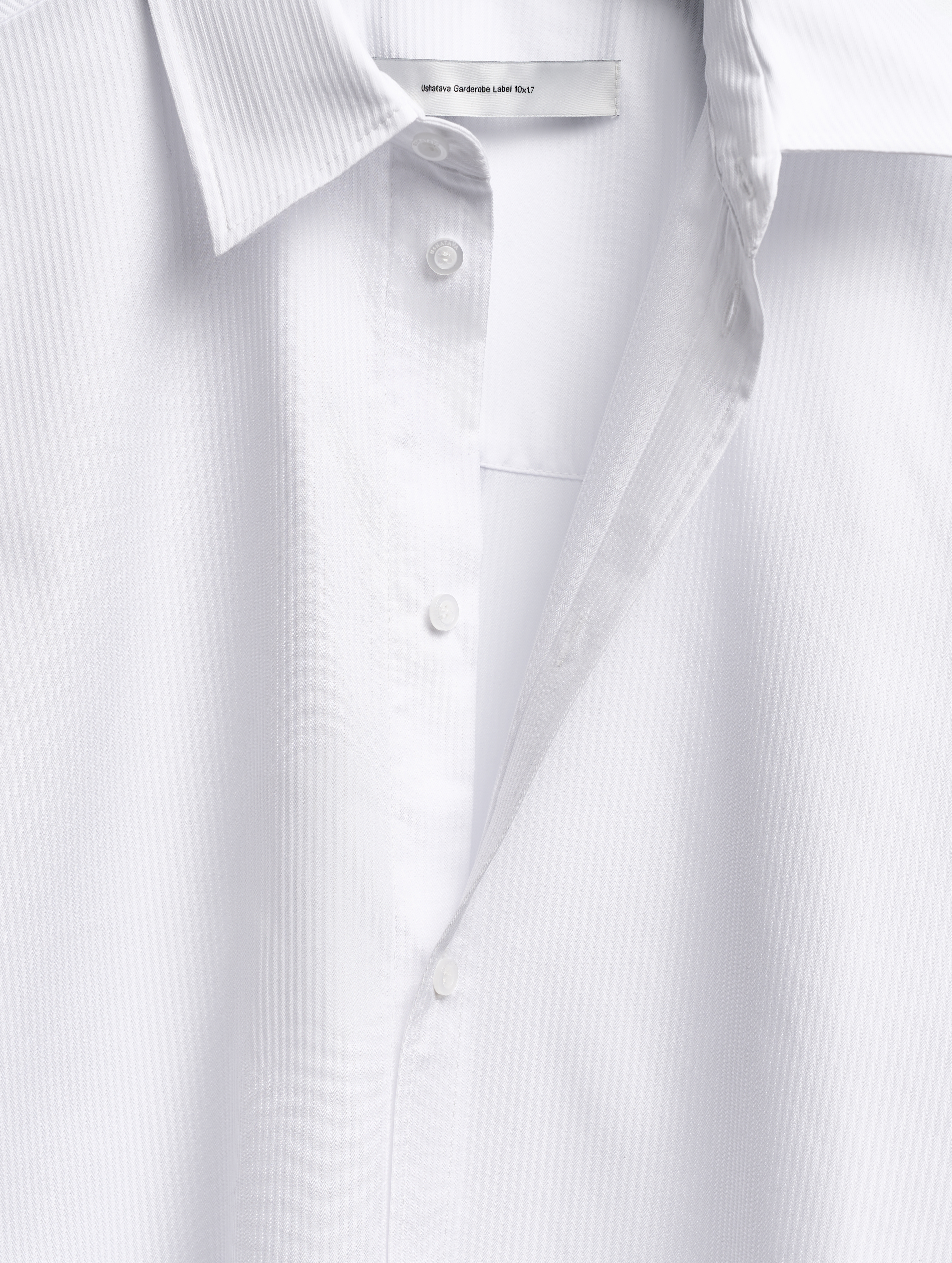 Ткань, из которой выполнена сорочка, называется поликоттоном — она создана из хлопковой пряжи с добавлением небольшого количества полиэстера. За счет вплетенных синтетических волокон она меньше мнется и долго сохраняет насыщенность цвета. Натуральные и искусственные волокна переплетаются, образуя полоски, — крошечные рубчики, отдаленно напоминающие вельвет. Эта фактура приятна наощупь, и ее можно увидеть только вблизи.