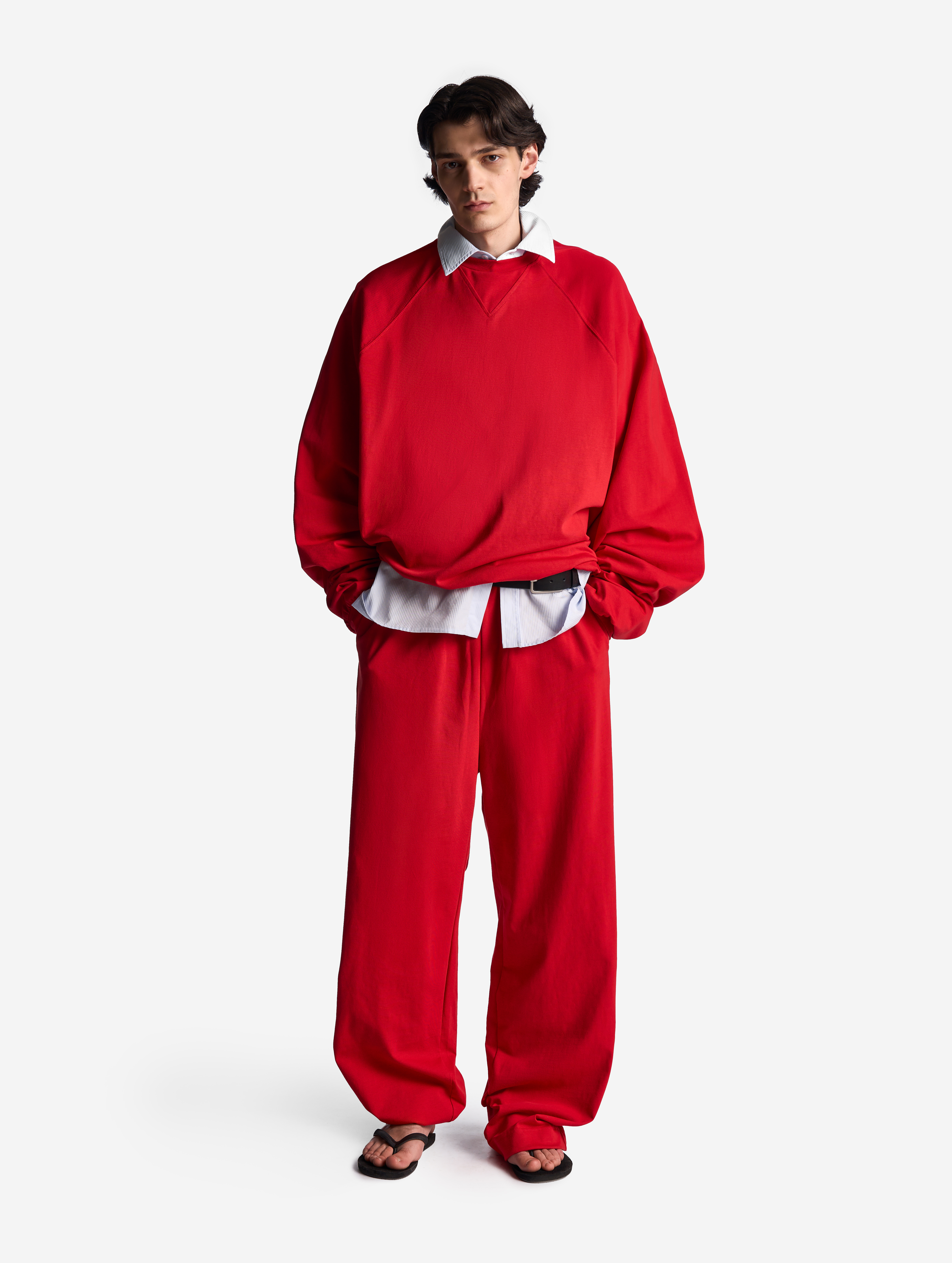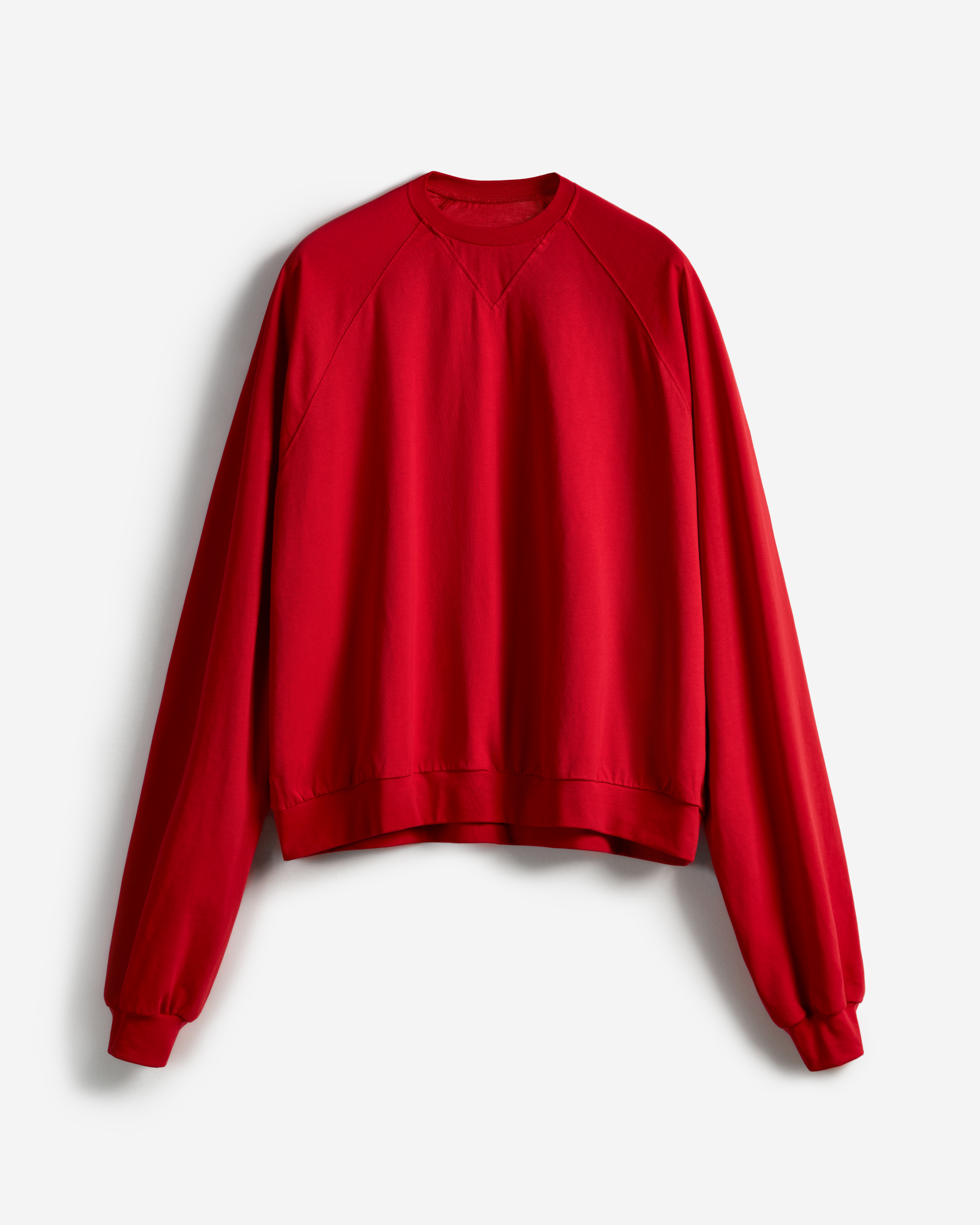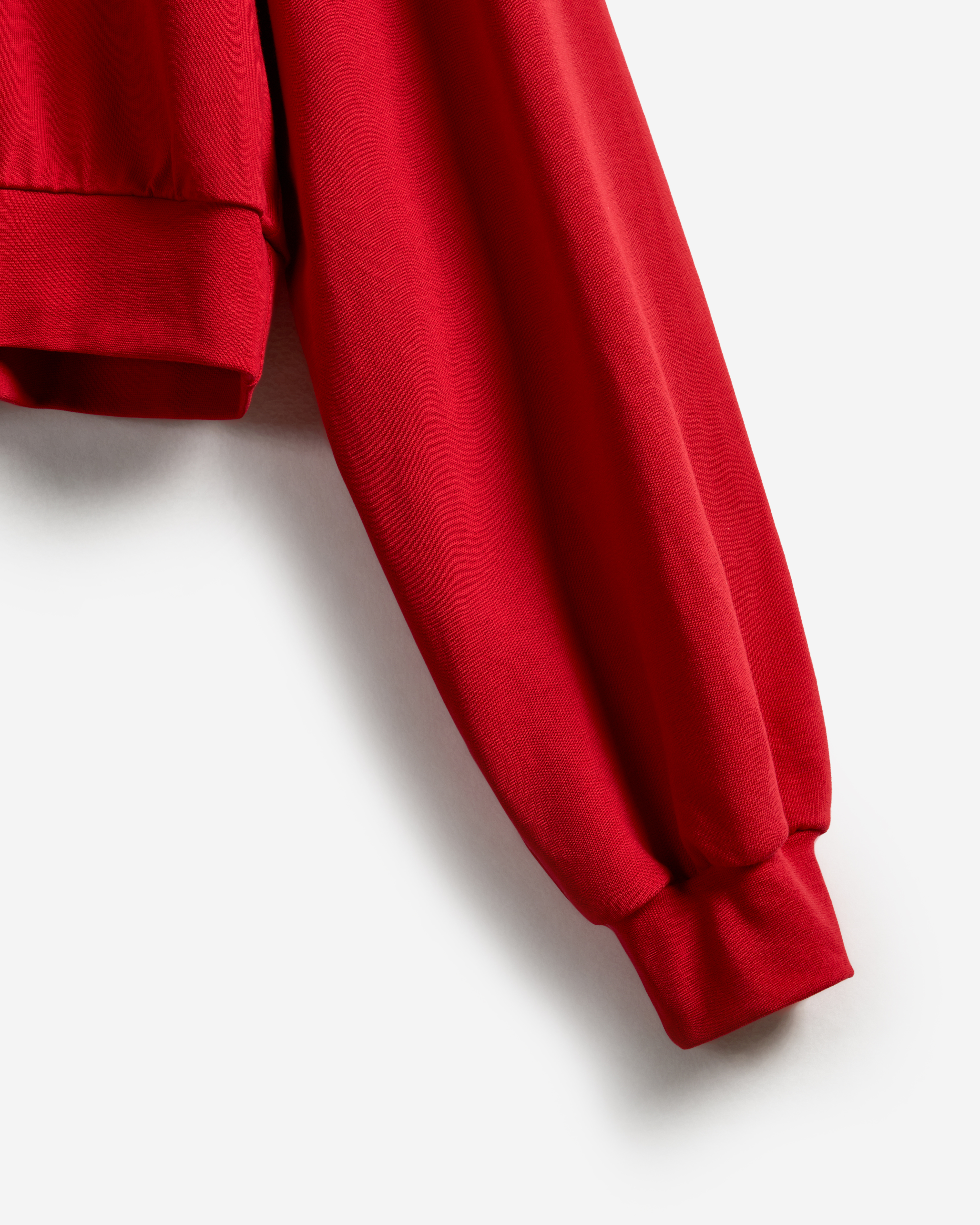 Свитшот оверсайз-силуэта. К внутреннему шву экстрадлинных рукавов пришиты тонкие резинки — если надеть их на руку, ткань соберется в мягкие складки, а рукава уменьшаться в длине. Горловина, манжеты и пояс обработаны рибаной в цвет ткани.