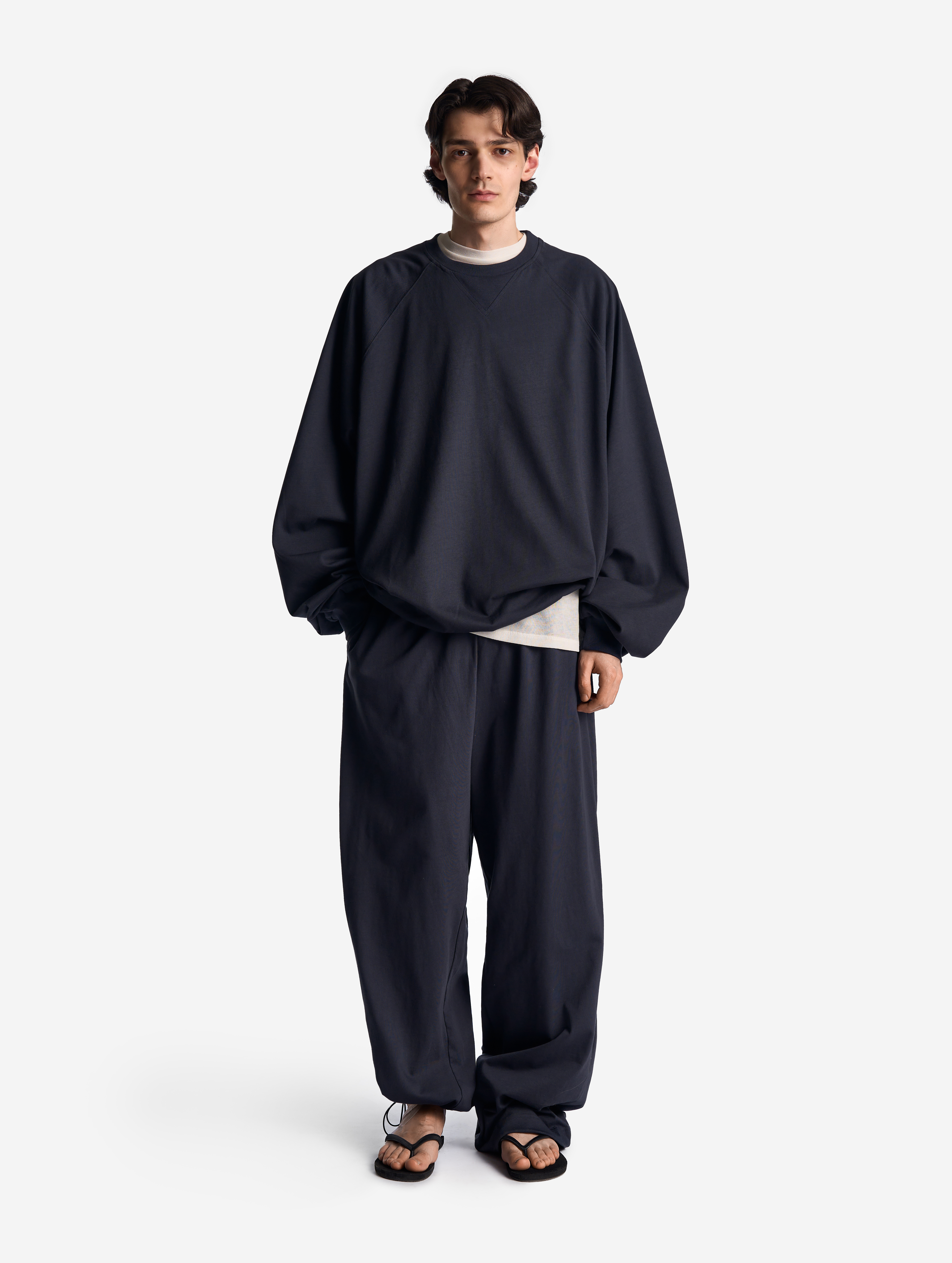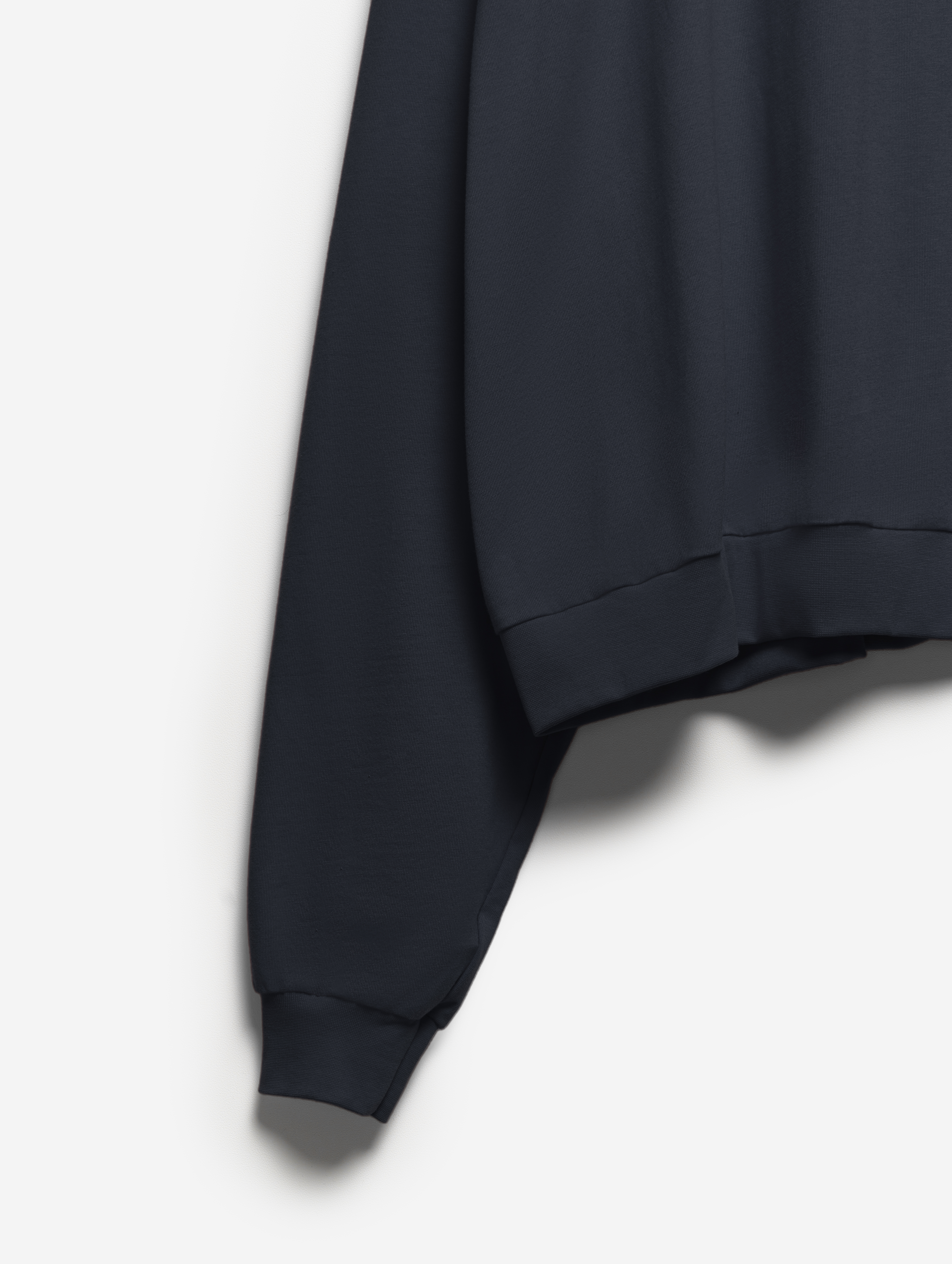 Свитшот оверсайз-силуэта. К внутреннему шву экстрадлинных рукавов пришиты тонкие резинки — если надеть их на руку, ткань соберется в мягкие складки, а рукава уменьшаться в длине. Горловина, манжеты и пояс обработаны рибаной в цвет ткани.