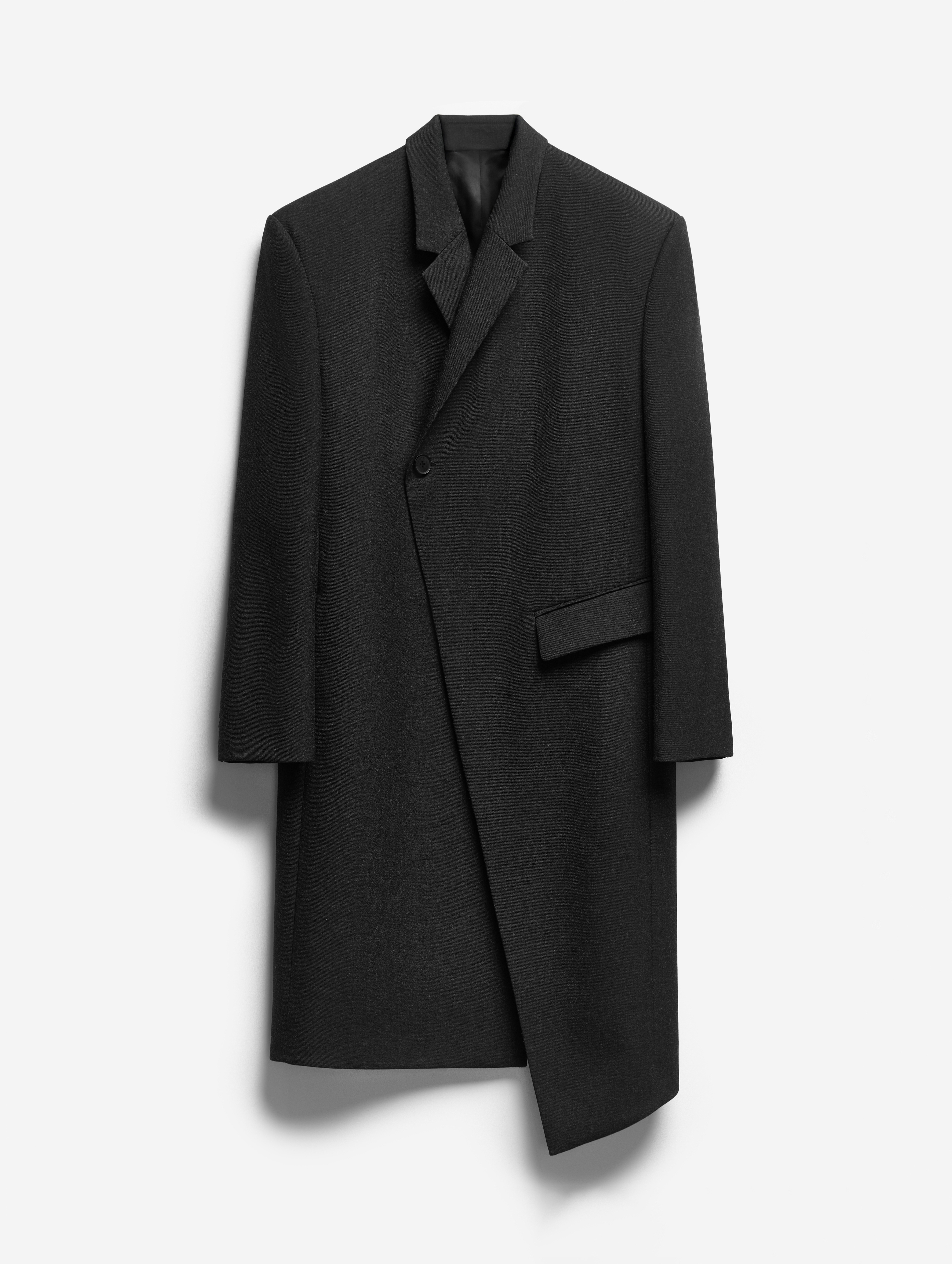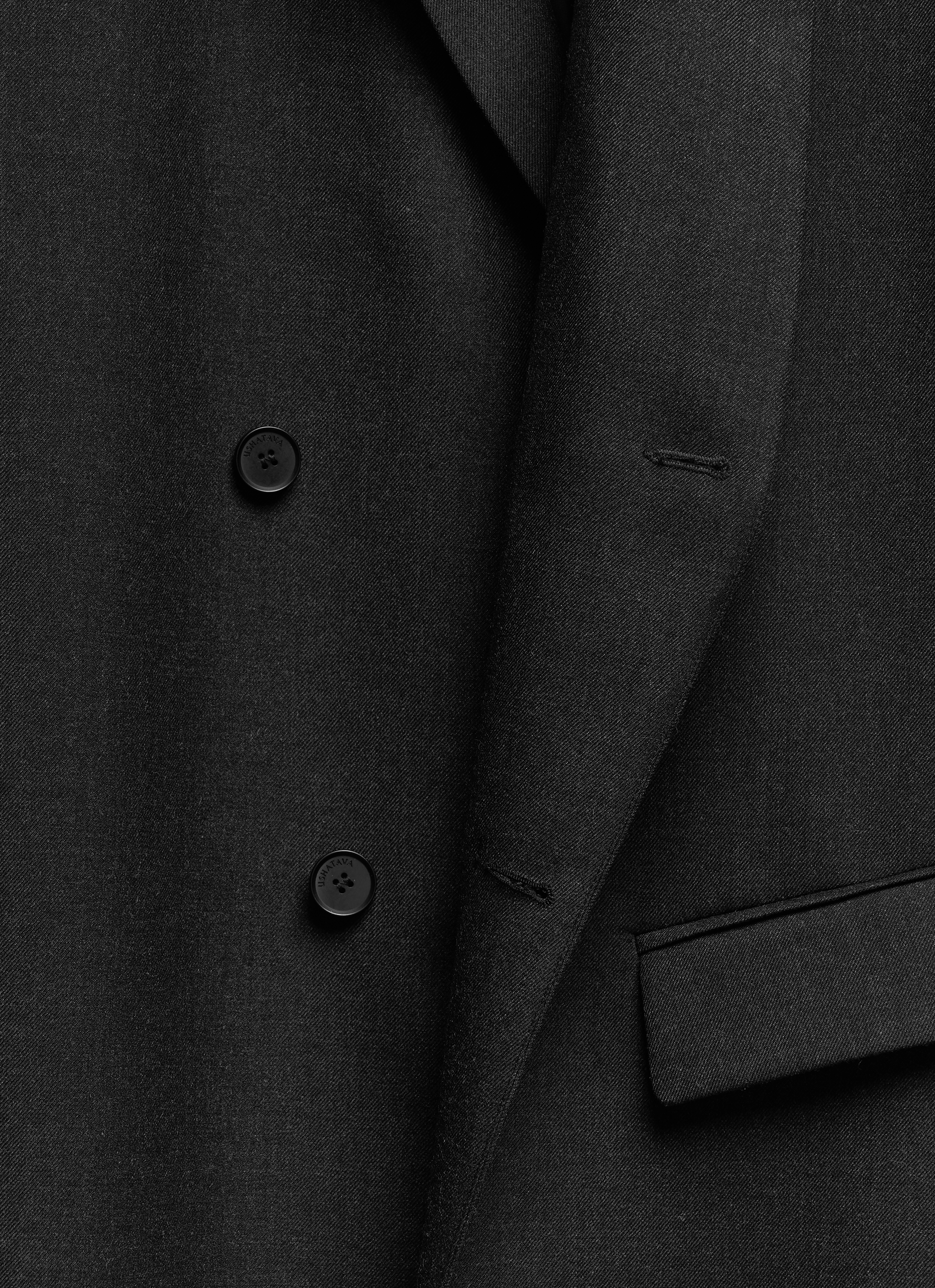 «Мне нравится присутствие асимметрии в одежде: благодаря ей классические силуэты обретают характер и остроту», — говорит Нино Шаматава, креативный директор Ushatava. Этот прием становится центральным в дизайне пальто: ломаный борт создает разноуровневую линию низа. Деконструкция выражается в том числе в деталях: один карман прорезной, с клапаном, второй расположен в боковом шве. Внутри также есть карман и дополнительная застежка — фиксатор борта. Пальто застегивается на пуговицы — все они, кроме верхней, незаметны глазу.