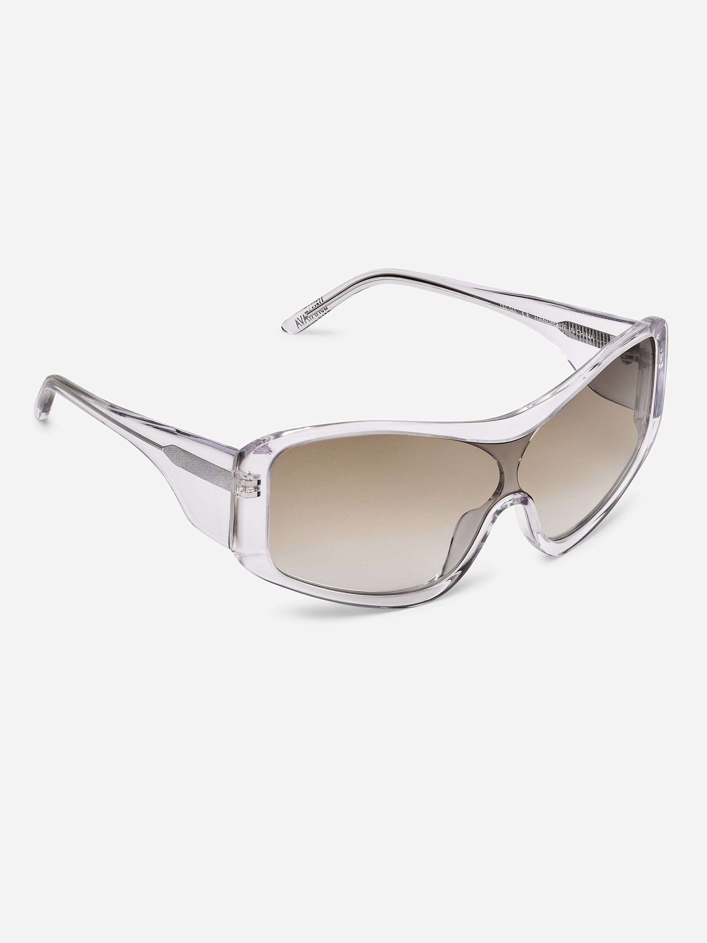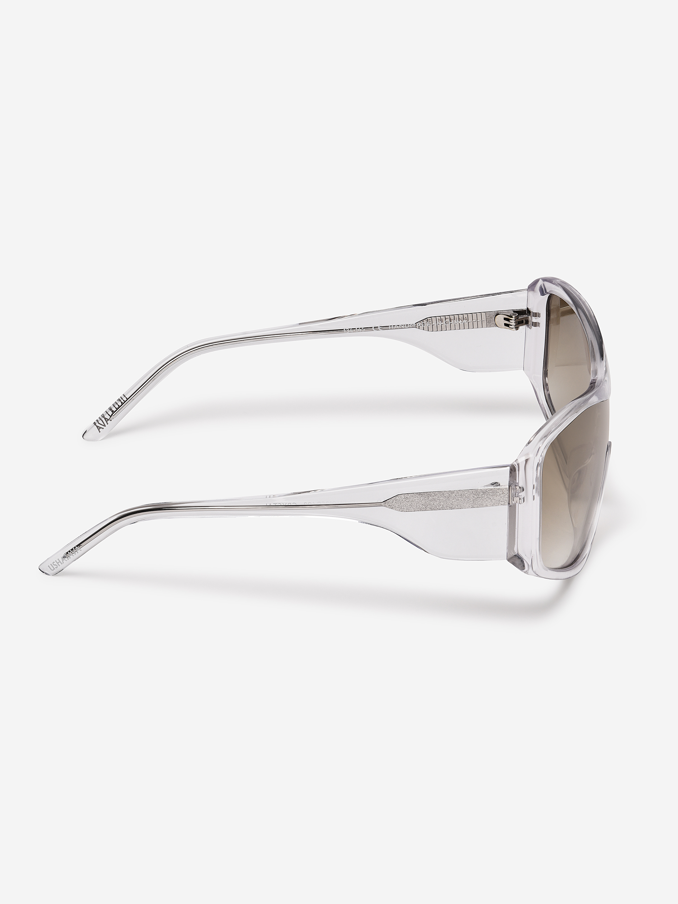 Креативный директор Ushatava Нино Шаматава называет эти очки «маской». Их форма действительно напоминает защитную экипировку или горнолыжное снаряжение. Такой тип конструкции называется «монолинза» — в ней отсутствует мостик на переносице, а крупная оправа расширяет область взгляда. На внутреннюю сторону дужек нанесена гравировка с логотипом модного Дома.